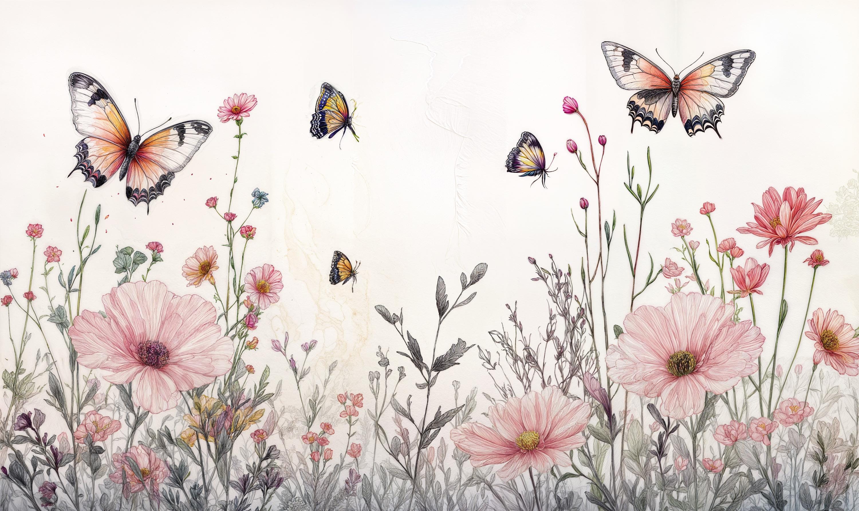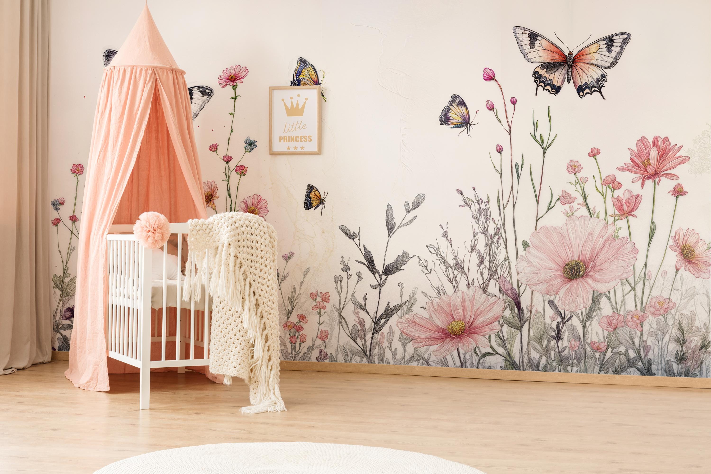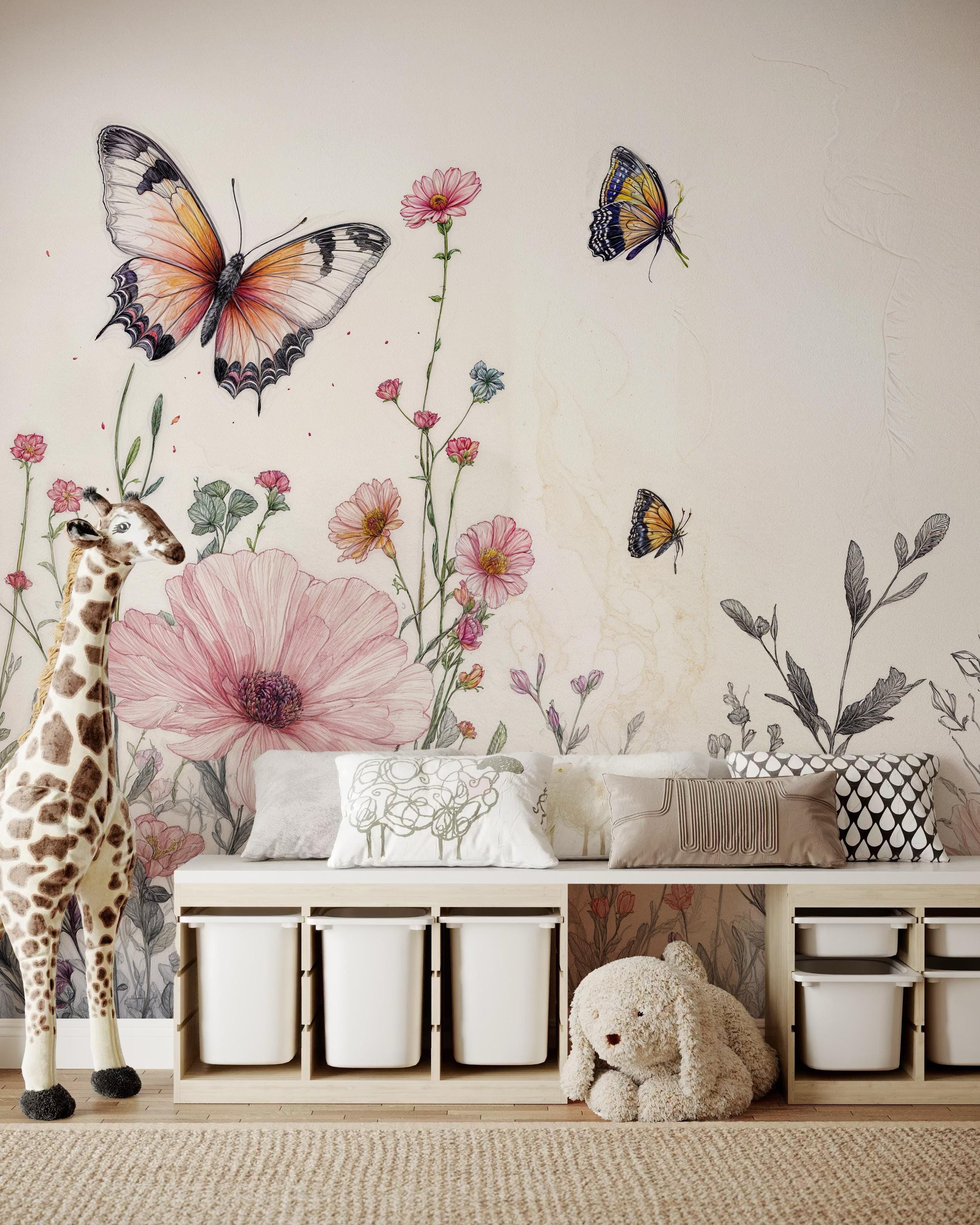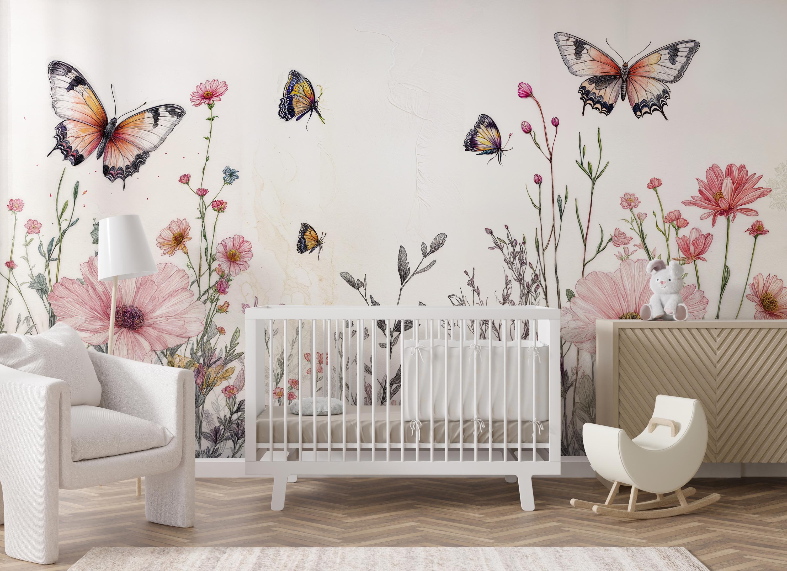 Butterfly Floral Nursery Mural: Soft Pastel Botanical Wallpaper (Peel and Stick)
