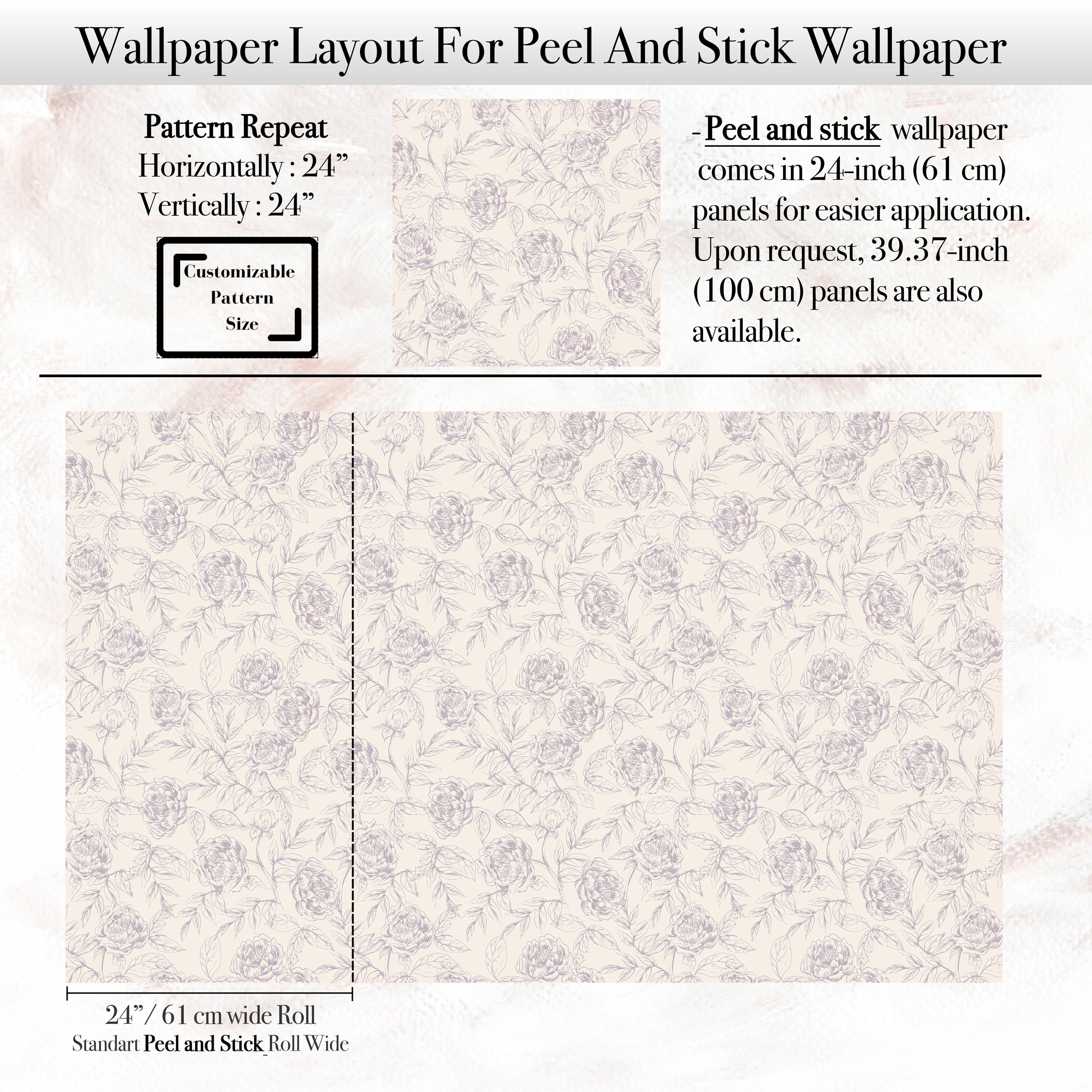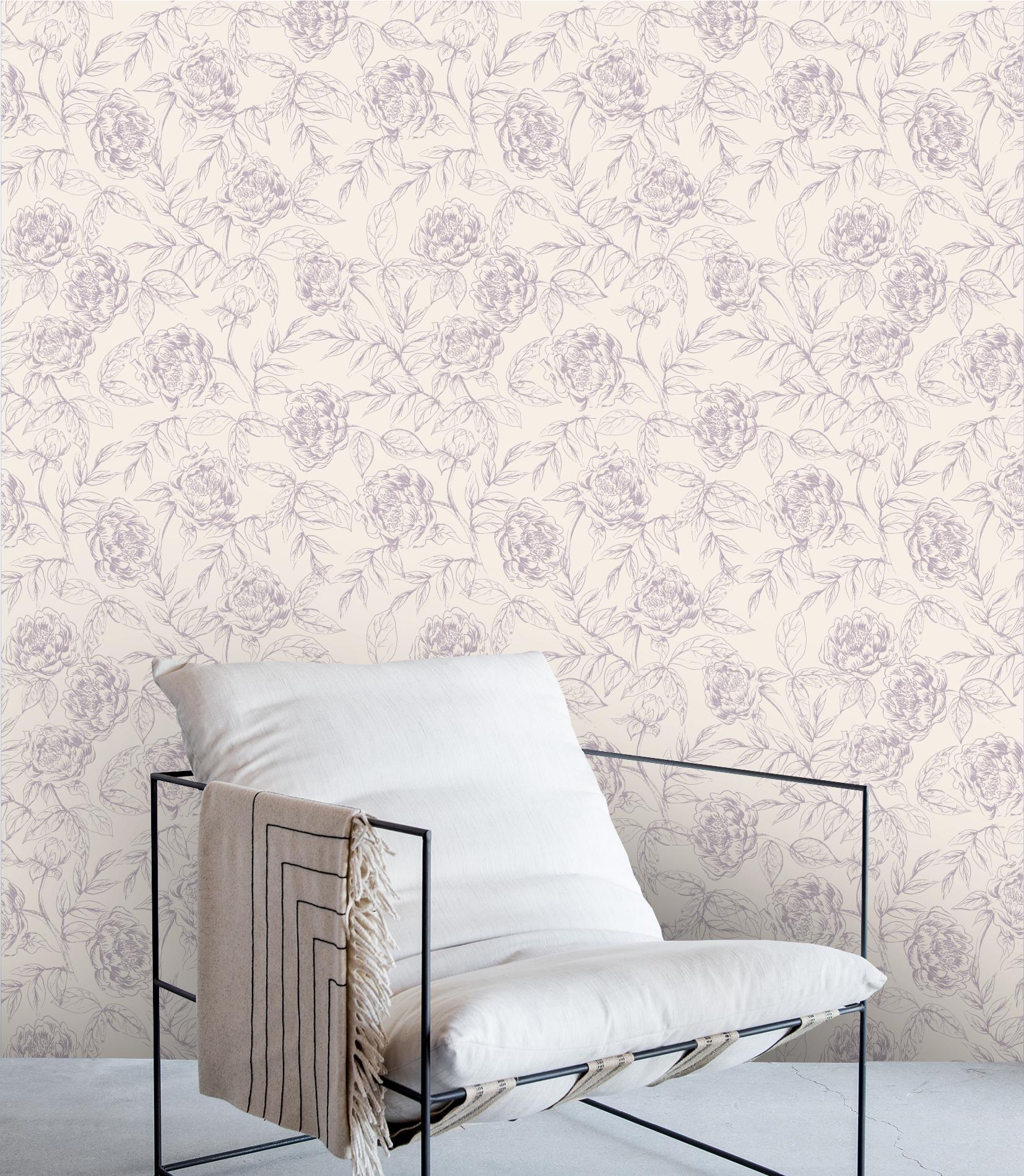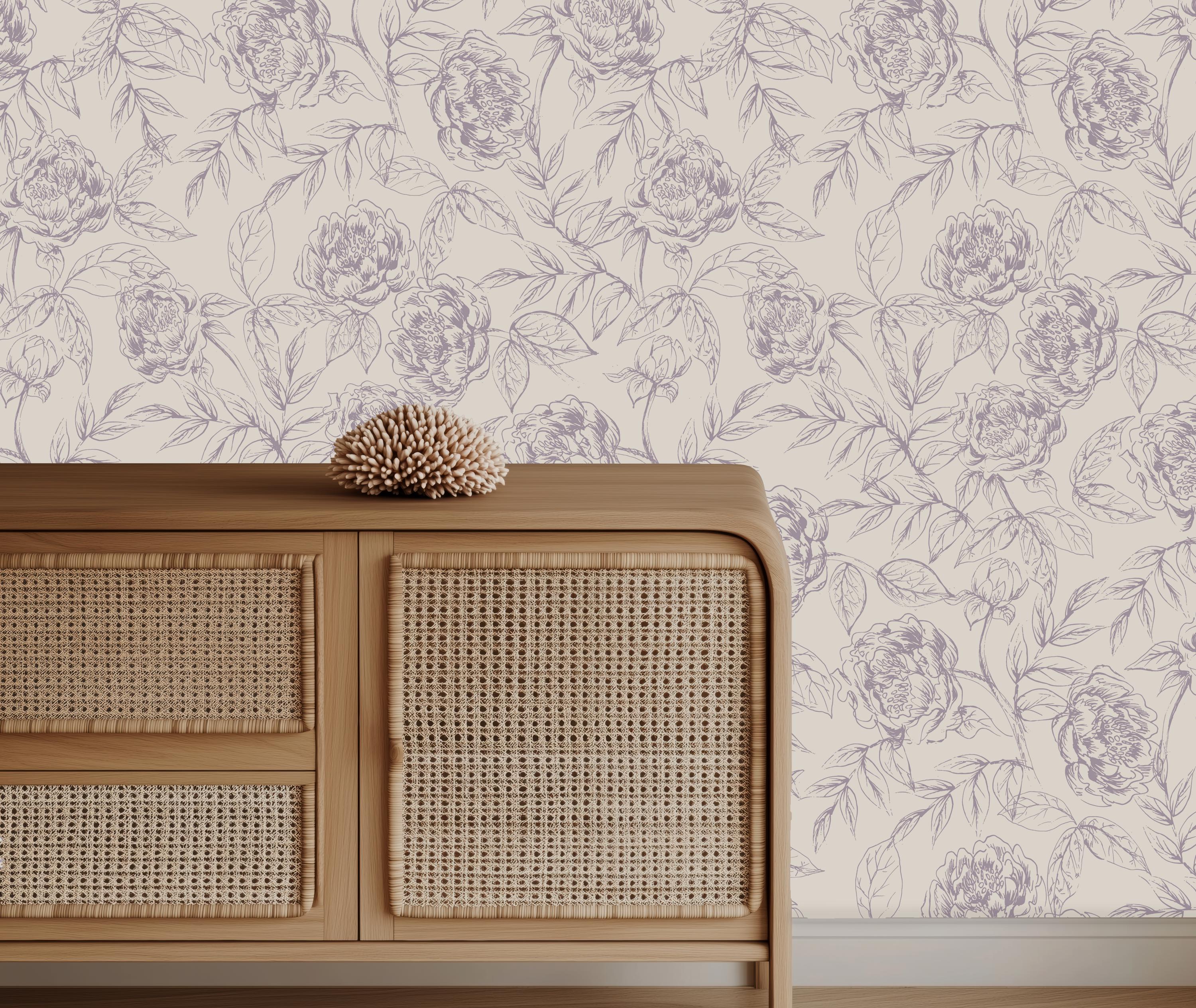 Beige Sketched Peony Removable Wallpaper - Vintage Floral Mural, French Country Shabby Chic Peel and Stick Self Adhesive Botanical Wallpaper