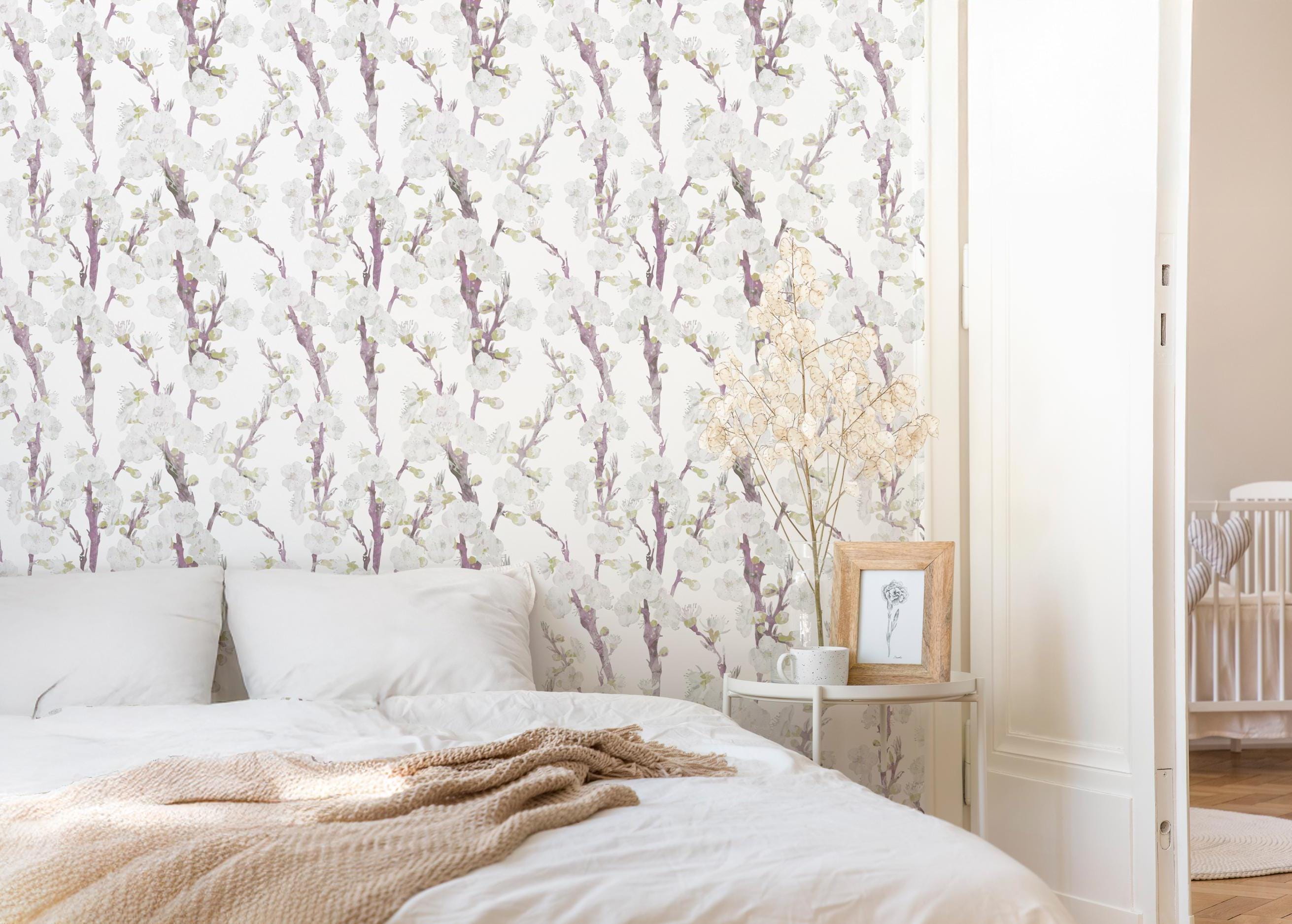 White Cherry Blossom Floral Wallpaper – Soft Sakura Flower Peel and Stick Wall Mural , Botanical Wall Decor for Bedroom, Bathroom, Nursery