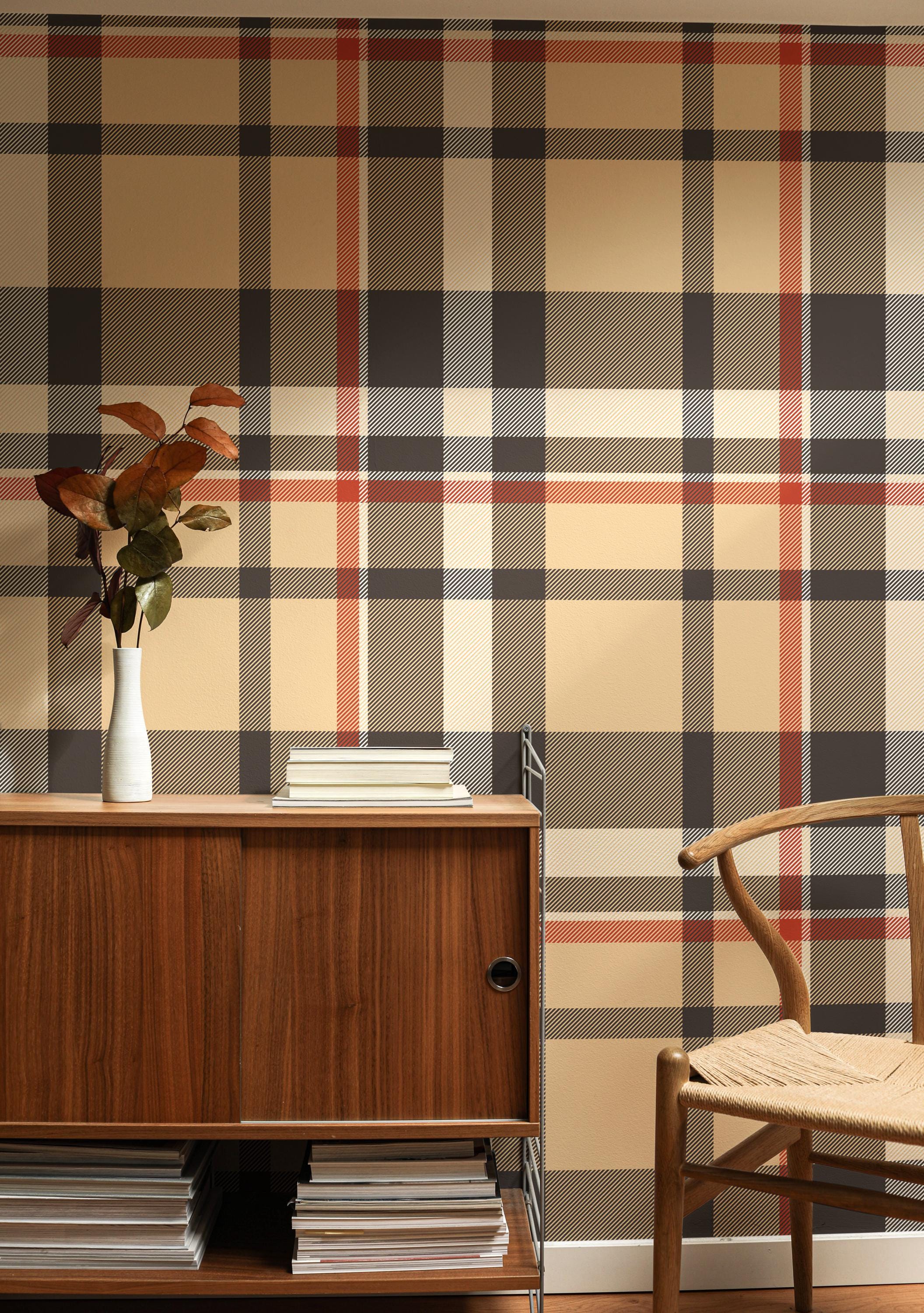Brown Autumn Plaid Wallpaper – Vintage Tartan Wall Mural – Rustic Farmhouse Peel and Stick or Traditional Wallpaper – Cozy Retro Wall Décor