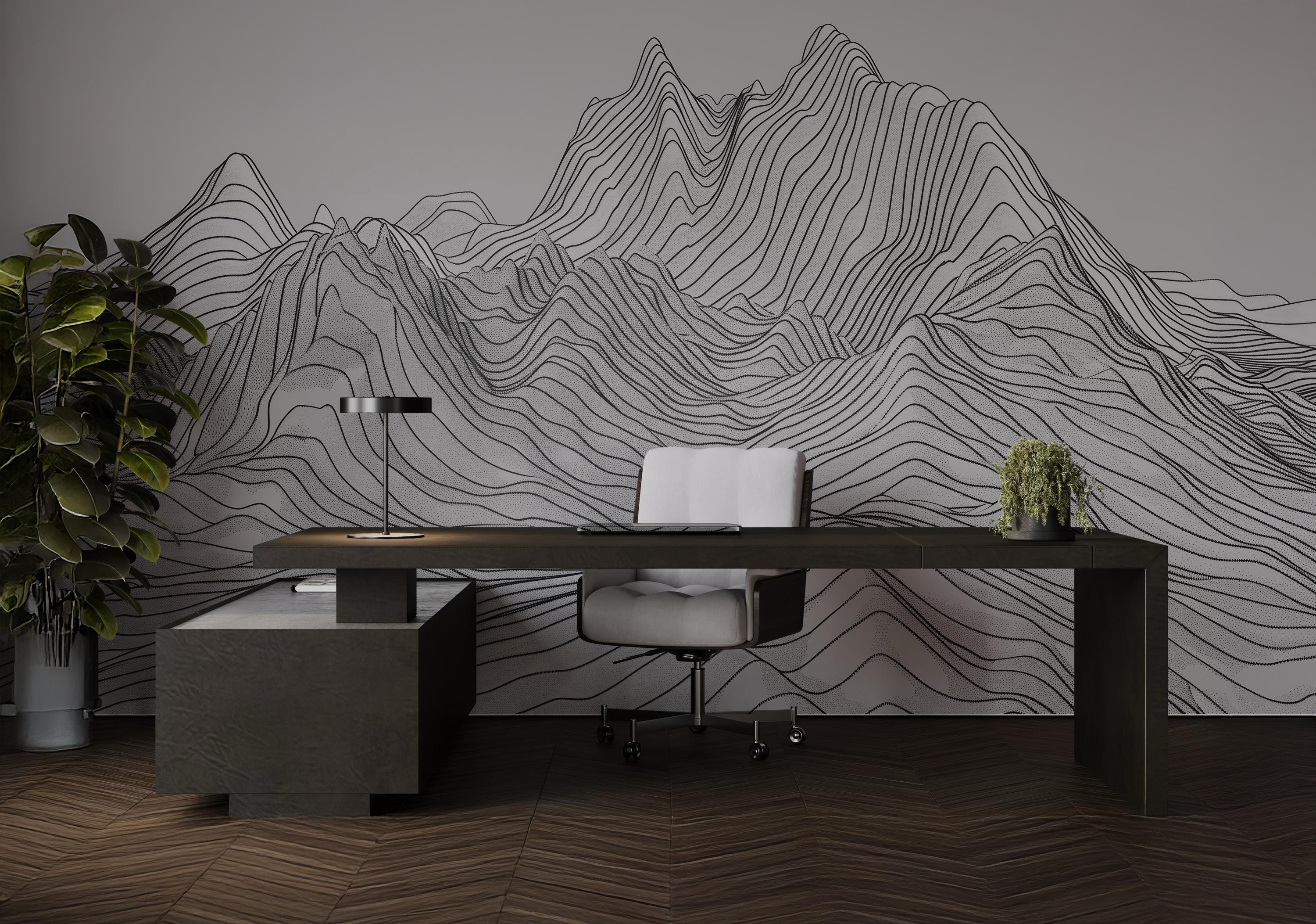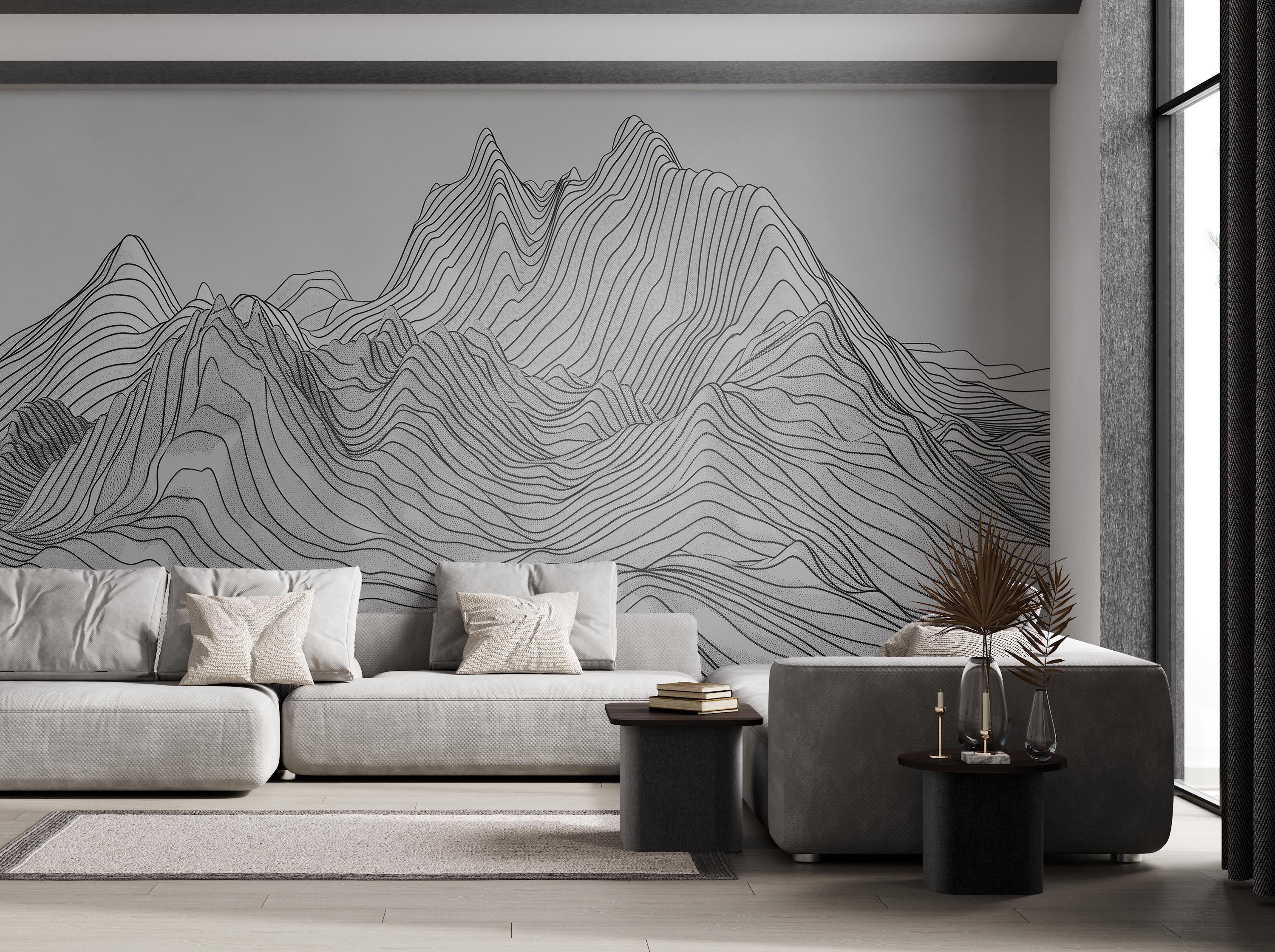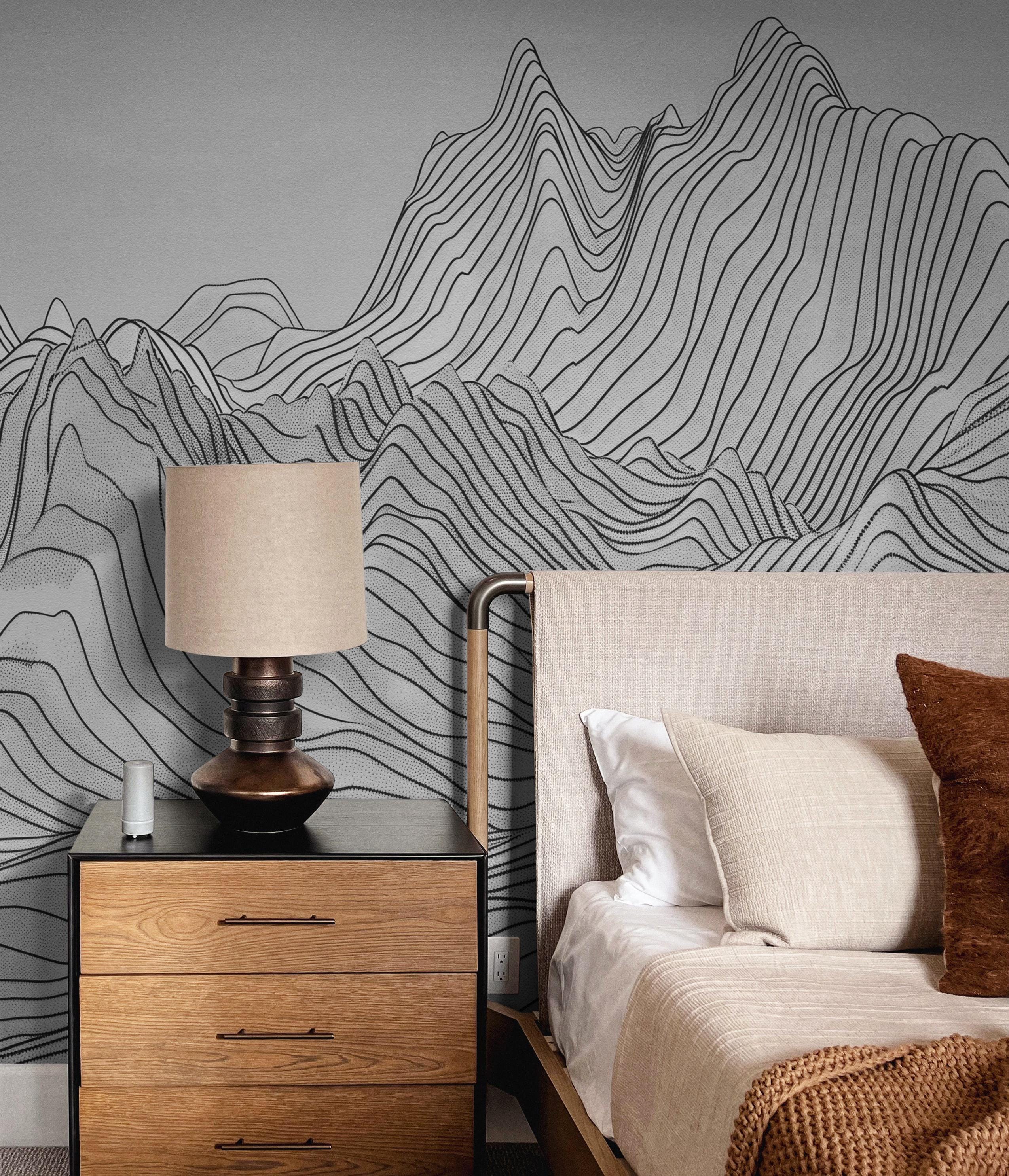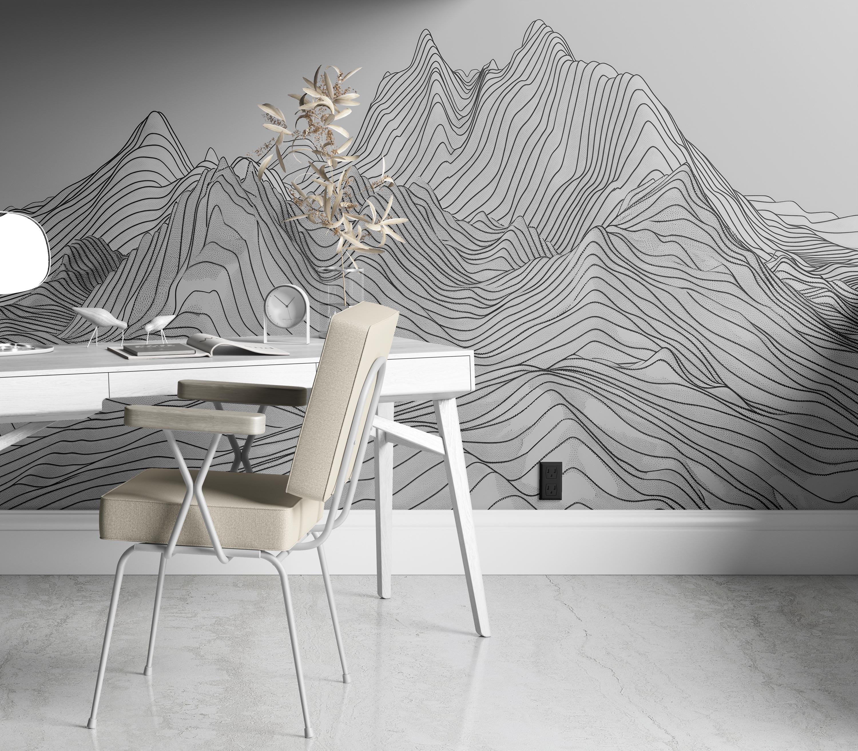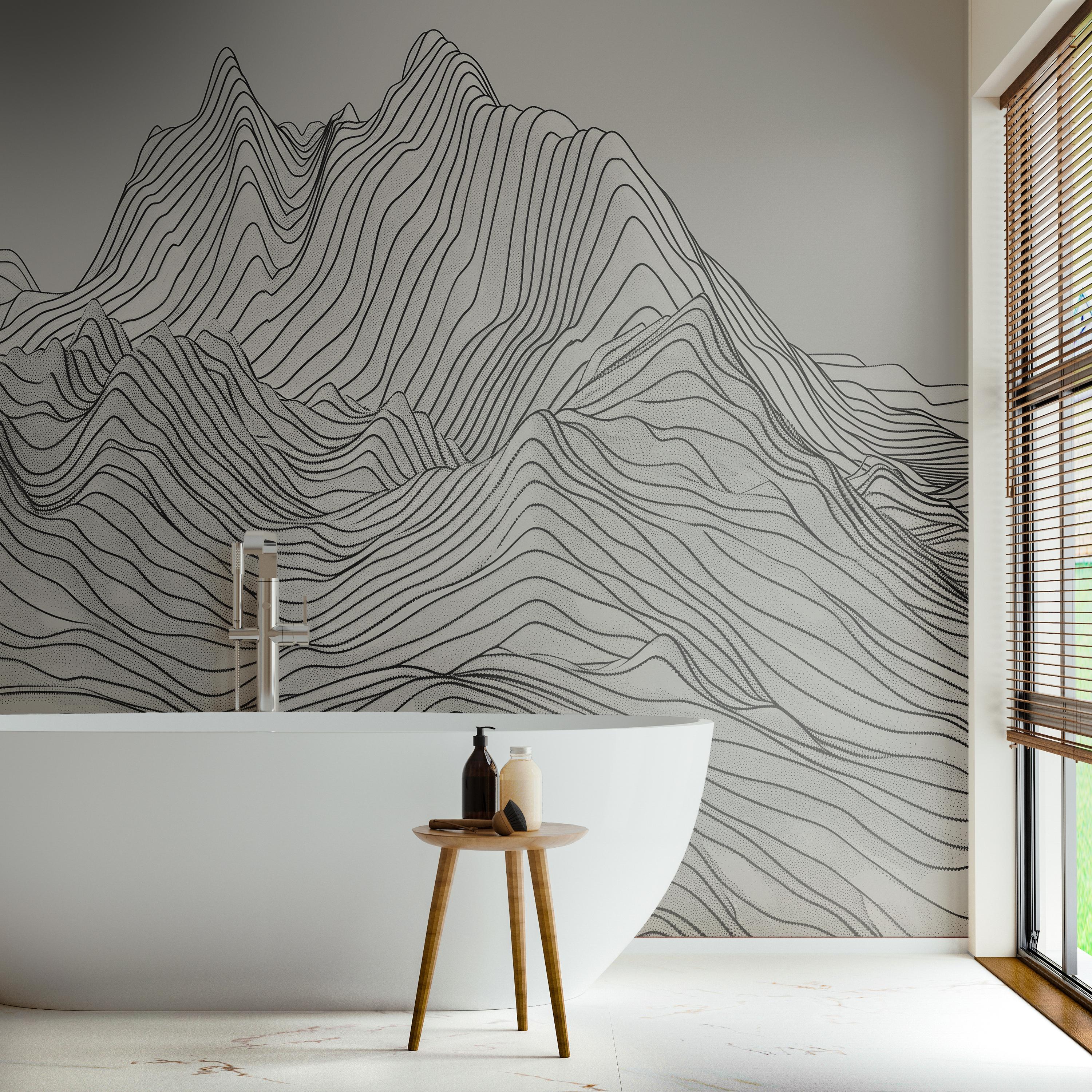 Black & Gray Mountain Line Art Peel and Stick Wallpaper: Modern Topographic Mural