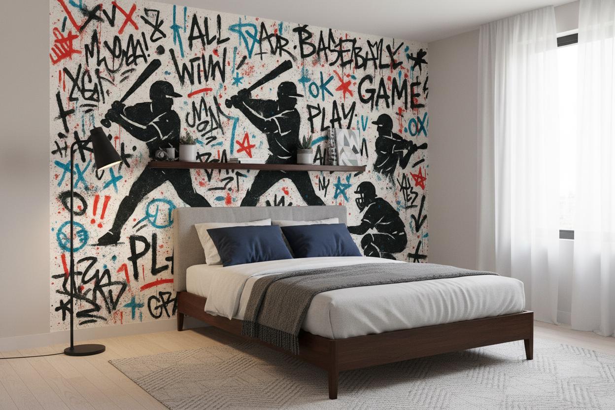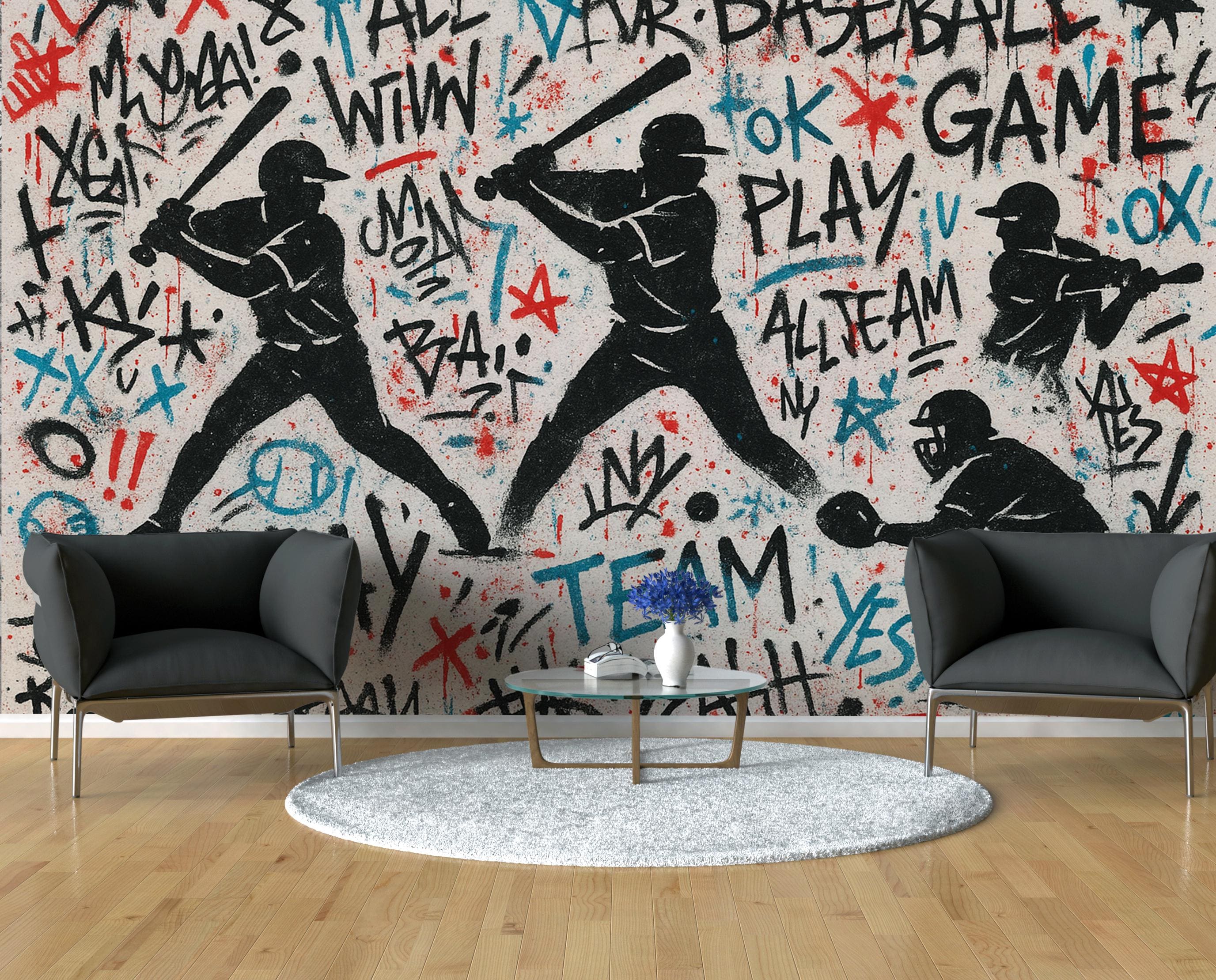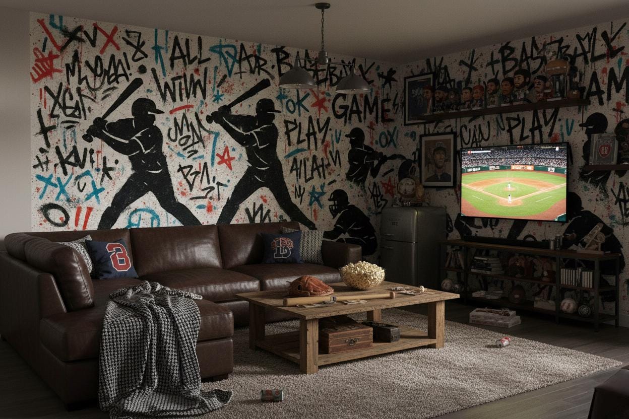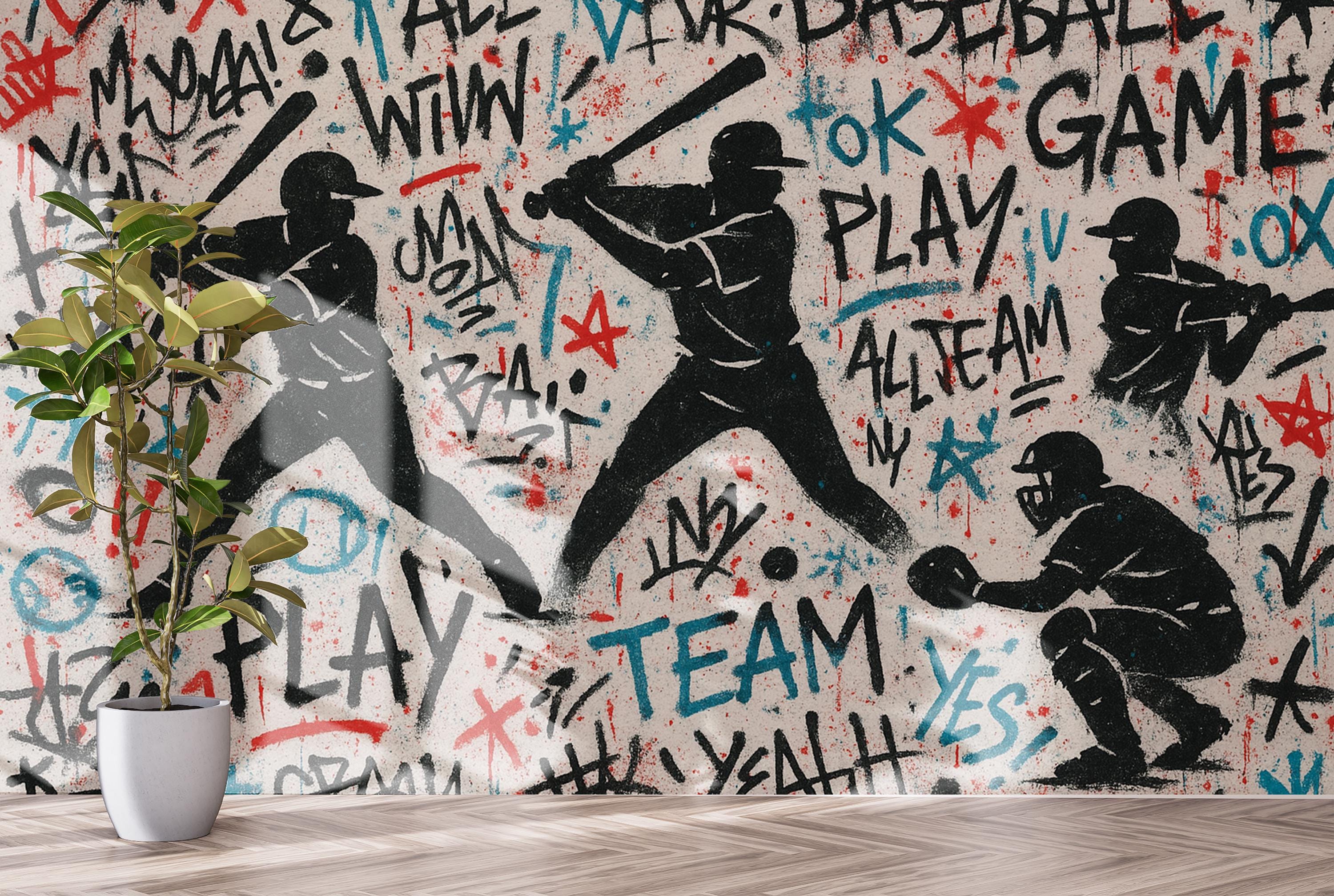 Bring the energy of the game indoors with this bold baseball graffiti wall mural ⚾🎨 Featuring dynamic silhouettes of baseball players and colorful street-art style typography, this wallpaper adds action, edge, and personality to any space. Perfect for boys’ bedrooms, home gyms, game rooms, or sports-themed interiors.