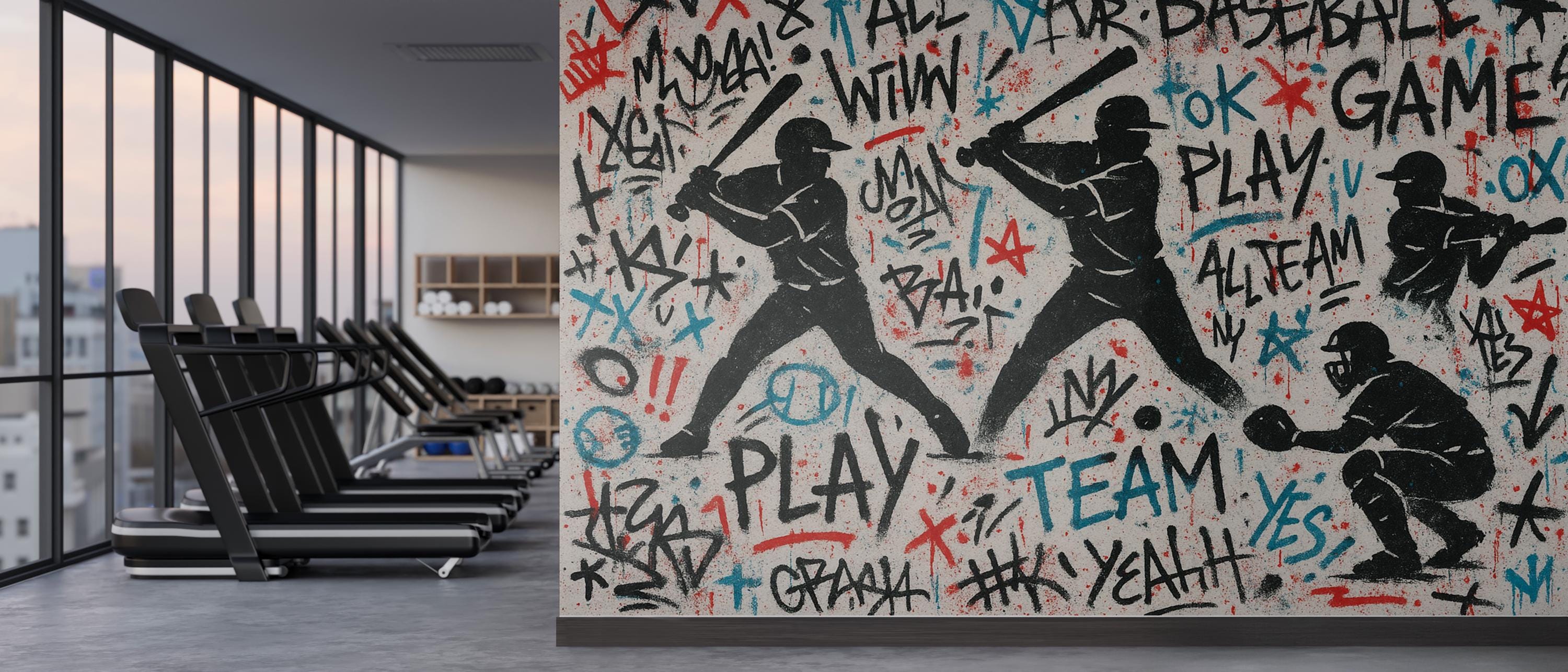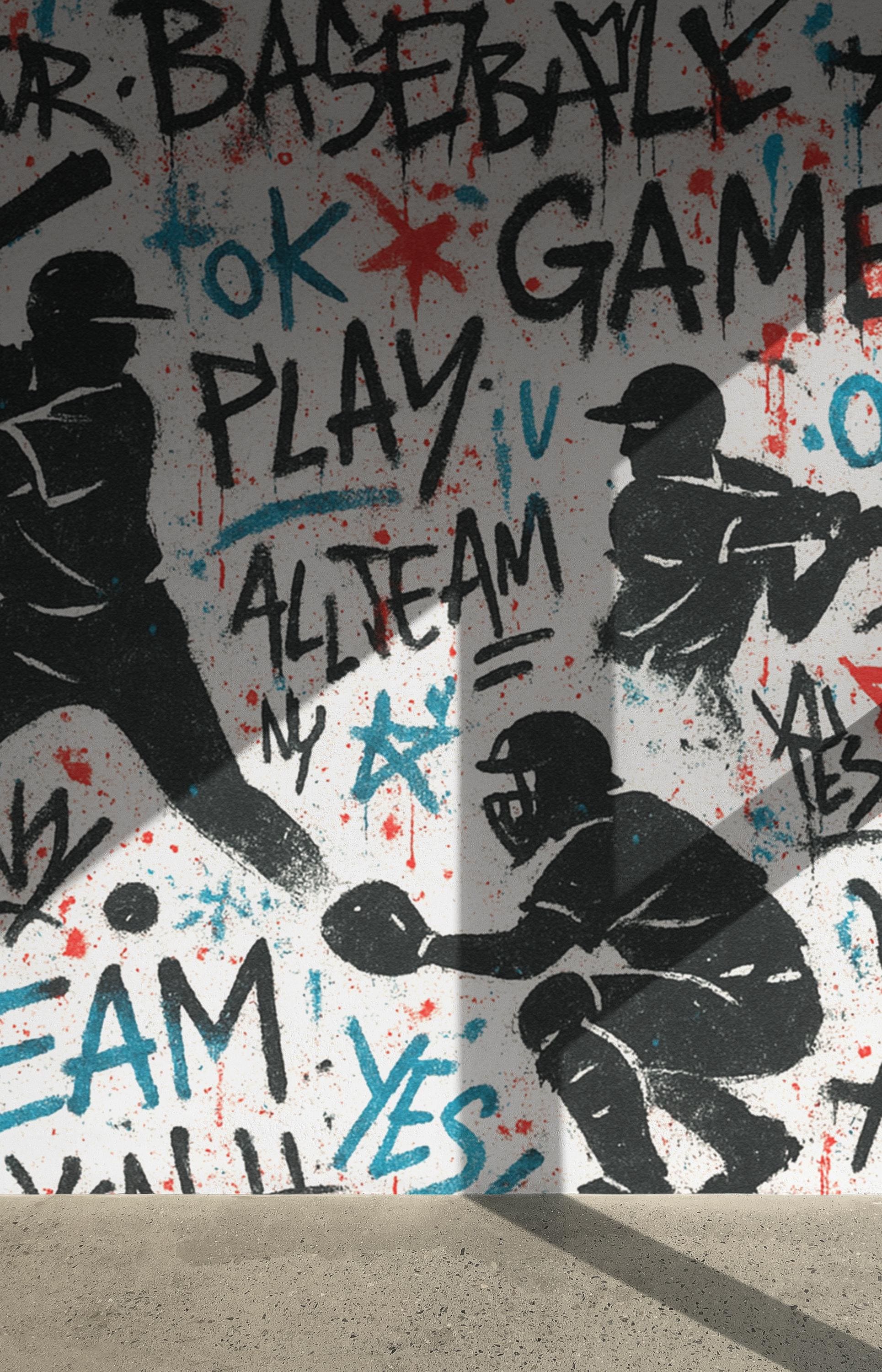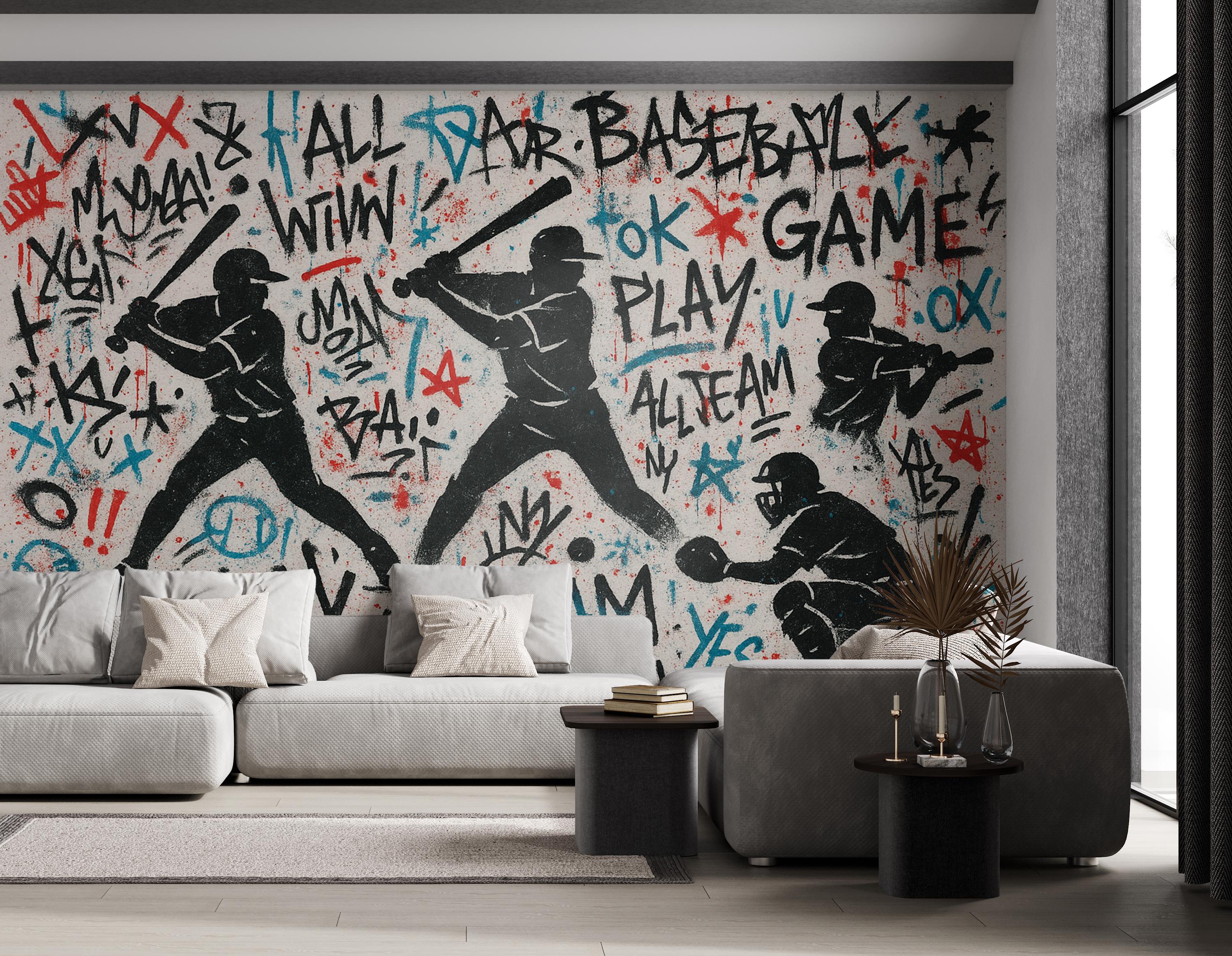 Bring the energy of the game indoors with this bold baseball graffiti wall mural ⚾🎨 Featuring dynamic silhouettes of baseball players and colorful street-art style typography, this wallpaper adds action, edge, and personality to any space. Perfect for boys’ bedrooms, home gyms, game rooms, or sports-themed interiors.
