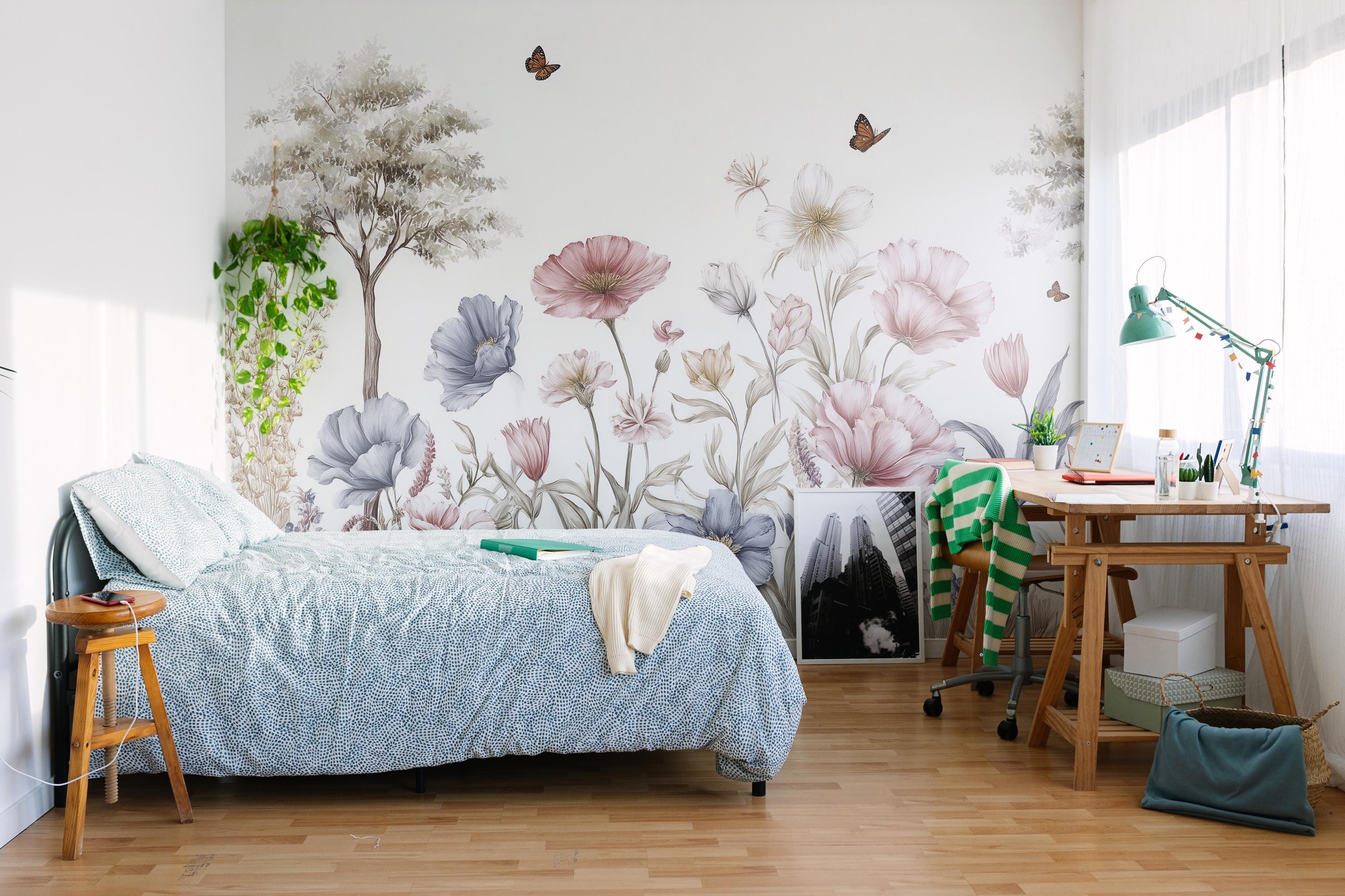 Floral Wall Mural, Watercolor Flower Wallpaper, Botanical Nursery Decor