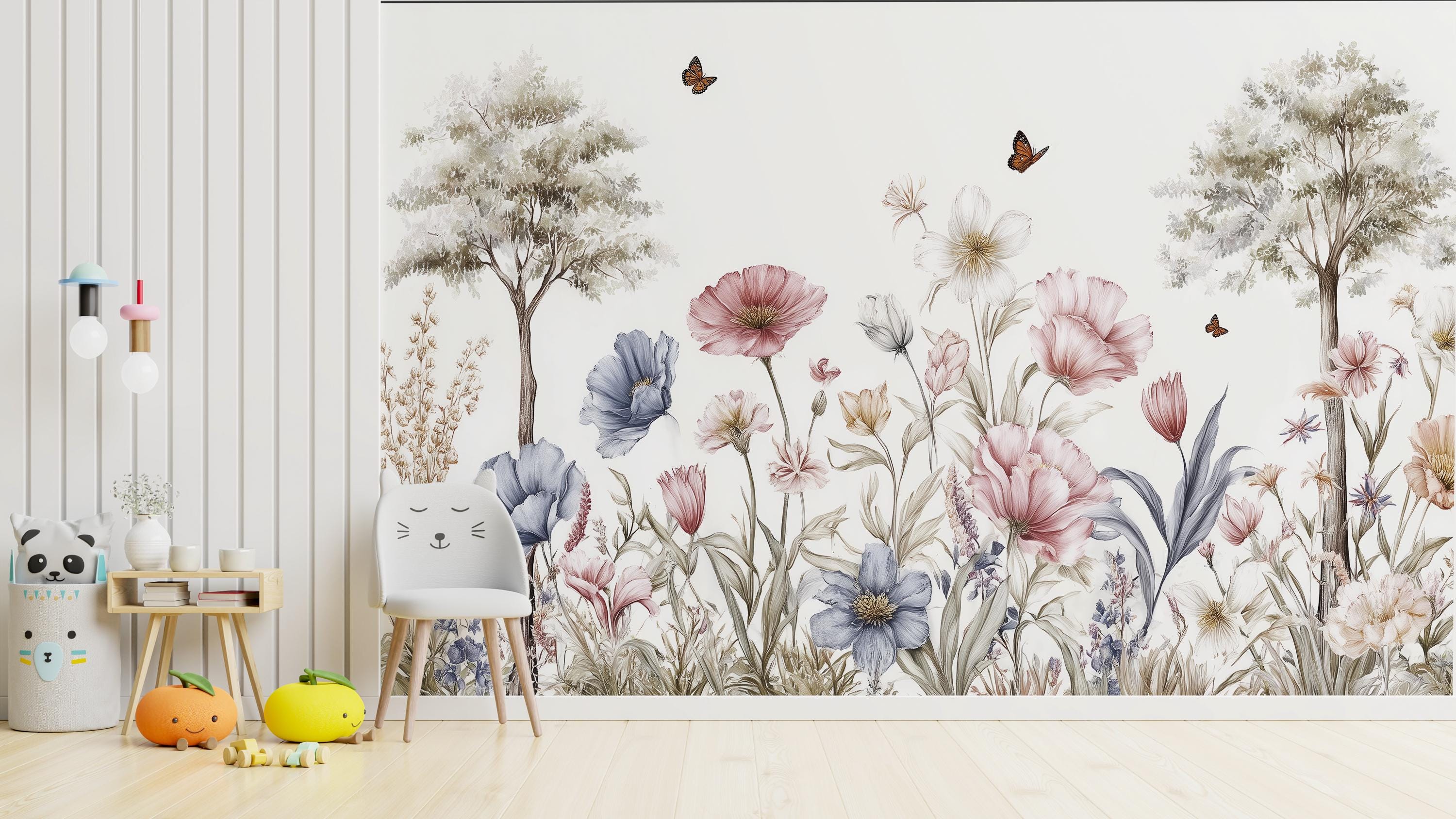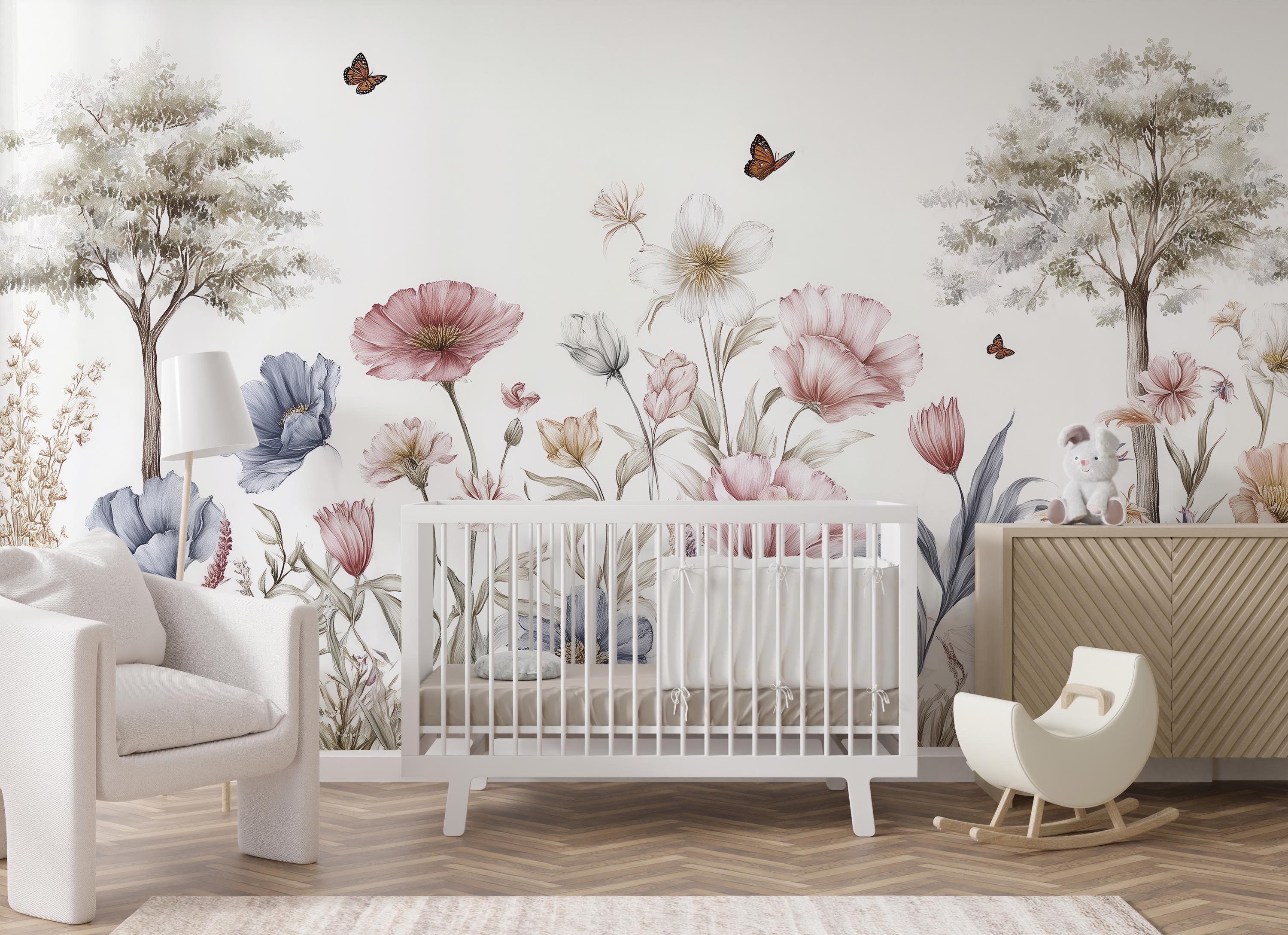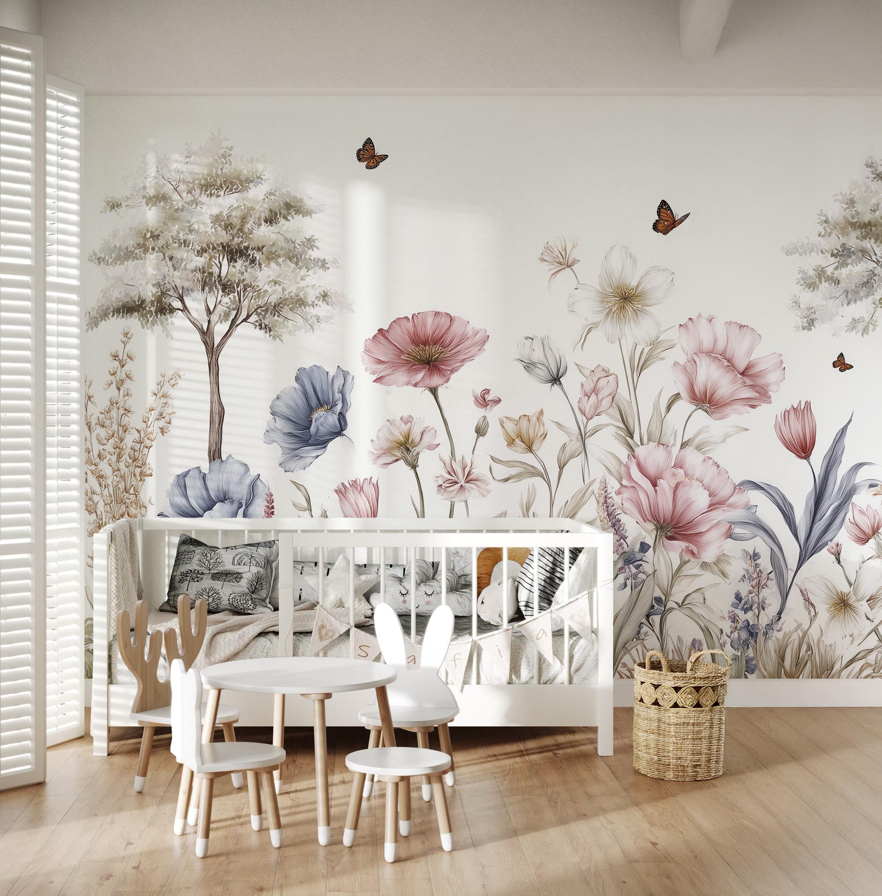 Create a dreamy sanctuary with our Soft Floral Nursery Wallpaper Mural. Featuring delicately illustrated watercolor flowers, gentle butterflies, and elegant trees, this peel and stick forest wall mural is perfect for baby girl rooms, kids’ bedrooms, or play spaces. The soothing pastel tones and nature-inspired design promote a calming atmosphere, while the removable adhesive makes it renter-friendly and easy to install or replace. Designed for both aesthetics and functionality, it’s an ideal solution for parents seeking elegance and ease.