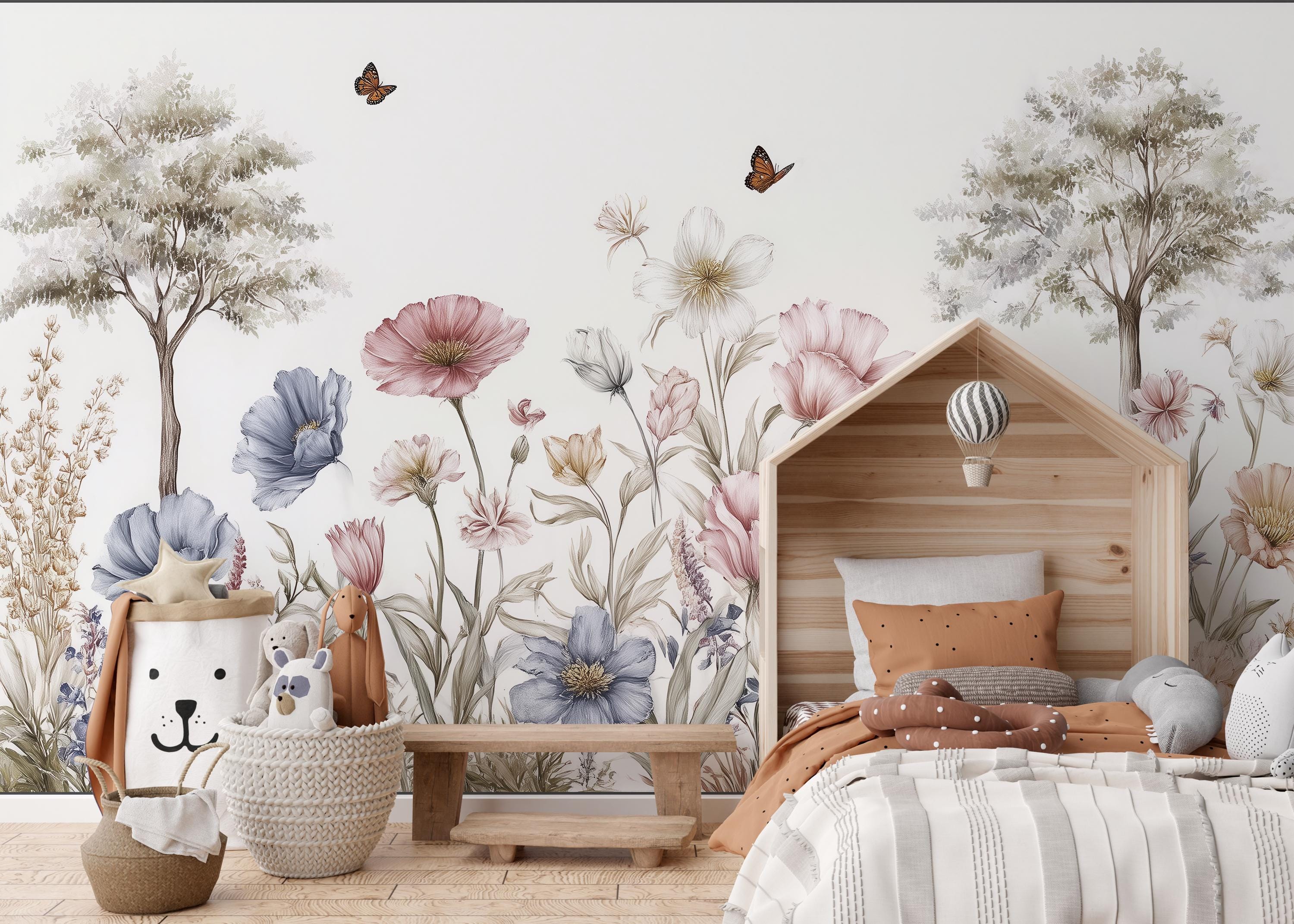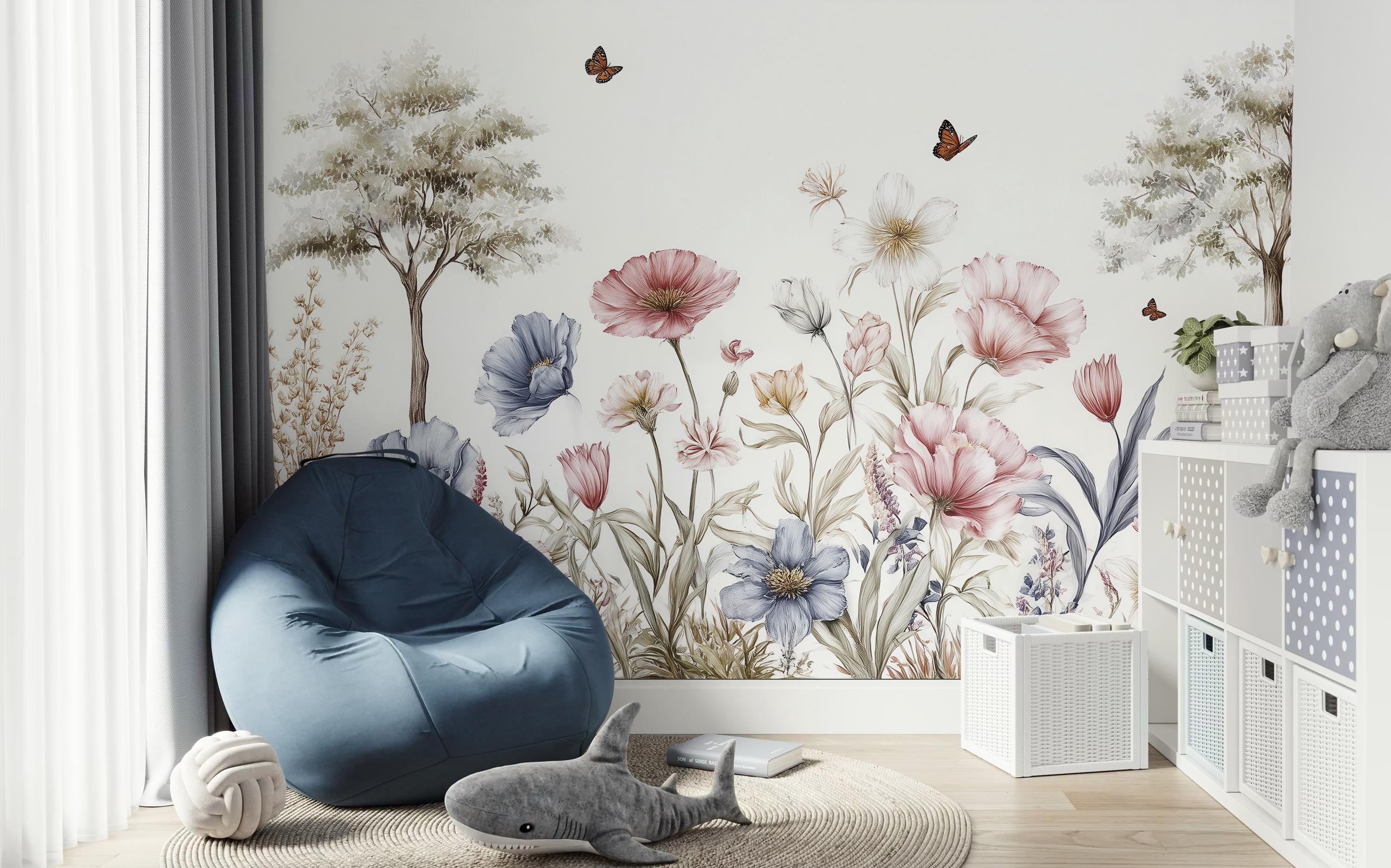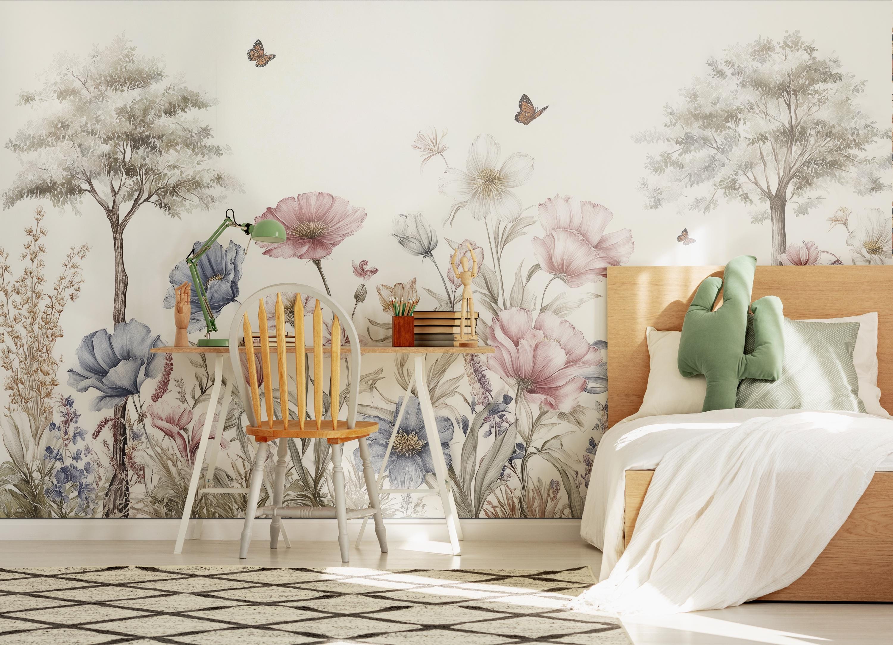 Create a dreamy sanctuary with our Soft Floral Nursery Wallpaper Mural. Featuring delicately illustrated watercolor flowers, gentle butterflies, and elegant trees, this peel and stick forest wall mural is perfect for baby girl rooms, kids’ bedrooms, or play spaces. The soothing pastel tones and nature-inspired design promote a calming atmosphere, while the removable adhesive makes it renter-friendly and easy to install or replace. Designed for both aesthetics and functionality, it’s an ideal solution for parents seeking elegance and ease.