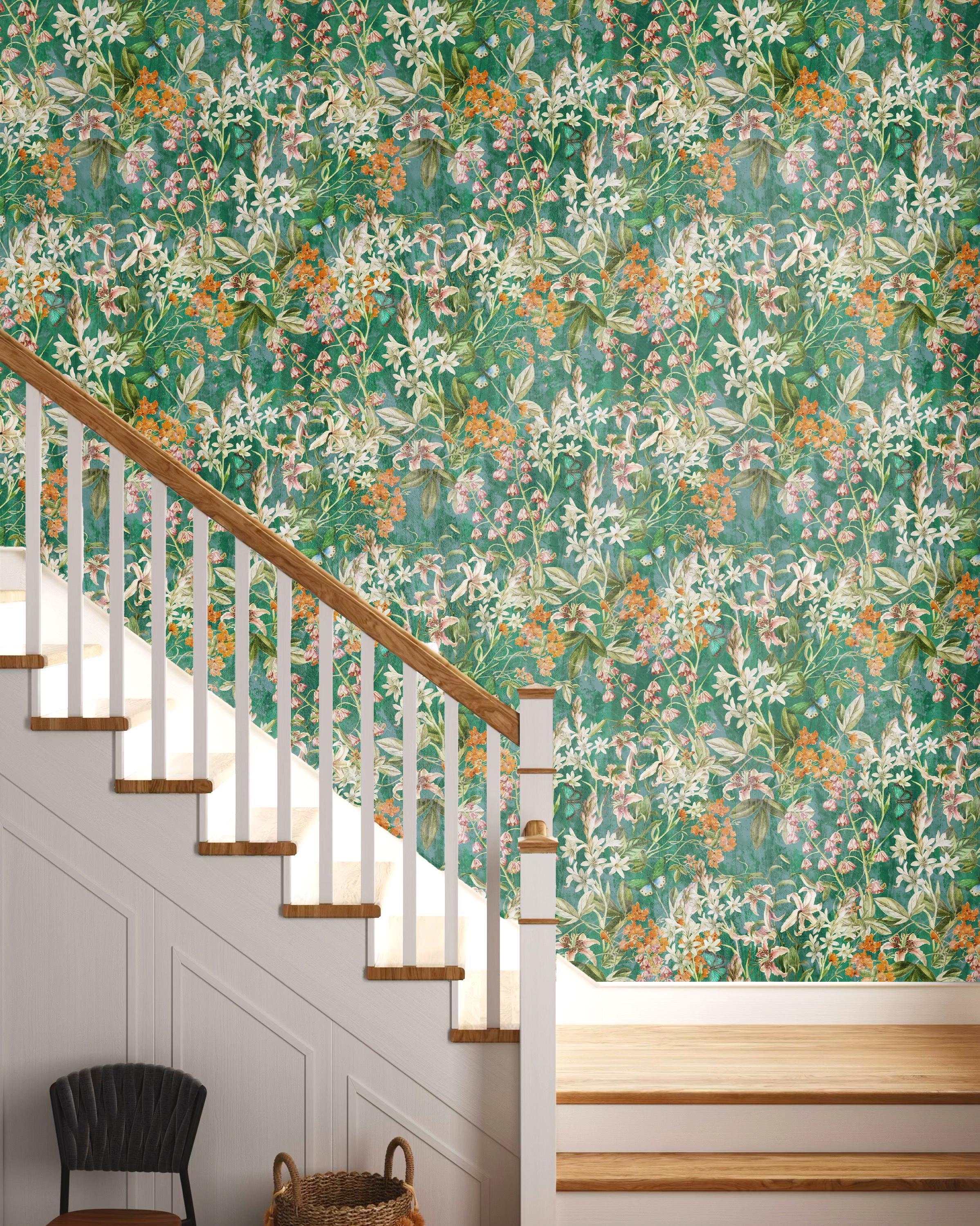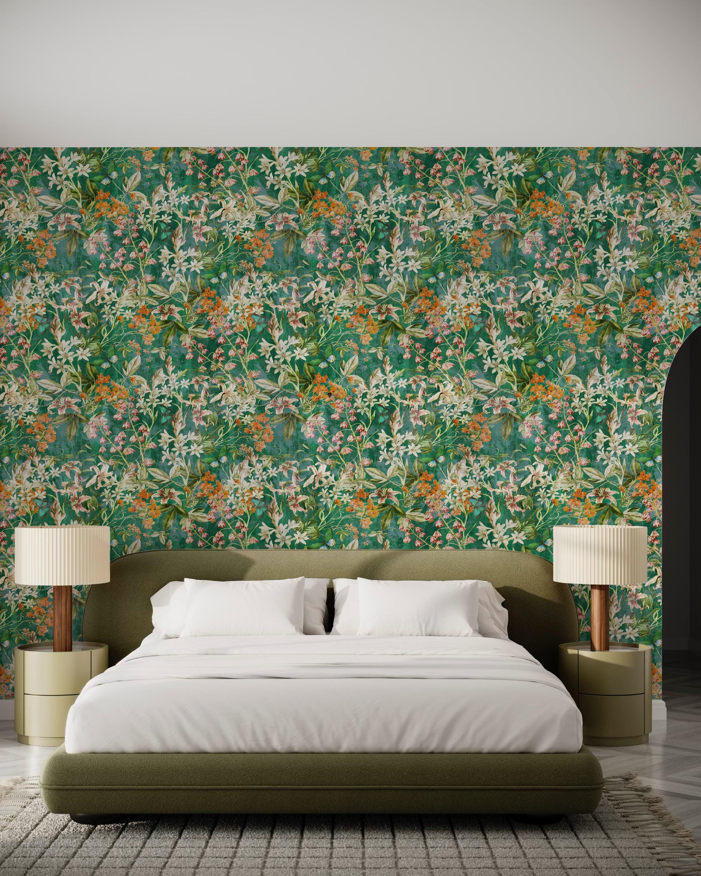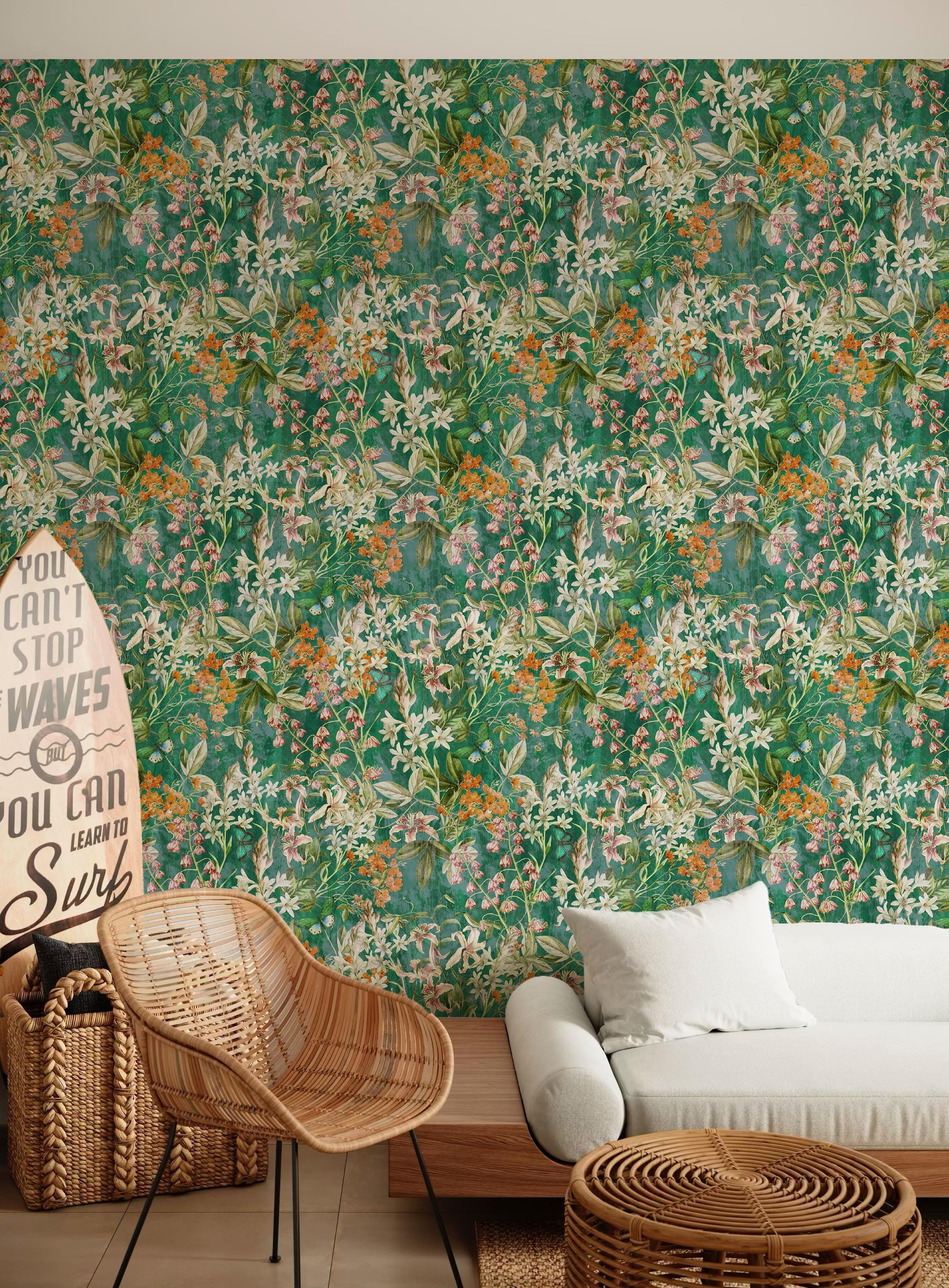 Bring a vibrant tropical flair to your space with our Bold Green Floral Wallpaper Mural. Featuring a lush jungle-inspired design with blooming orange, pink, and white flowers on a rich green background, this peel and stick wallpaper instantly transforms any room.