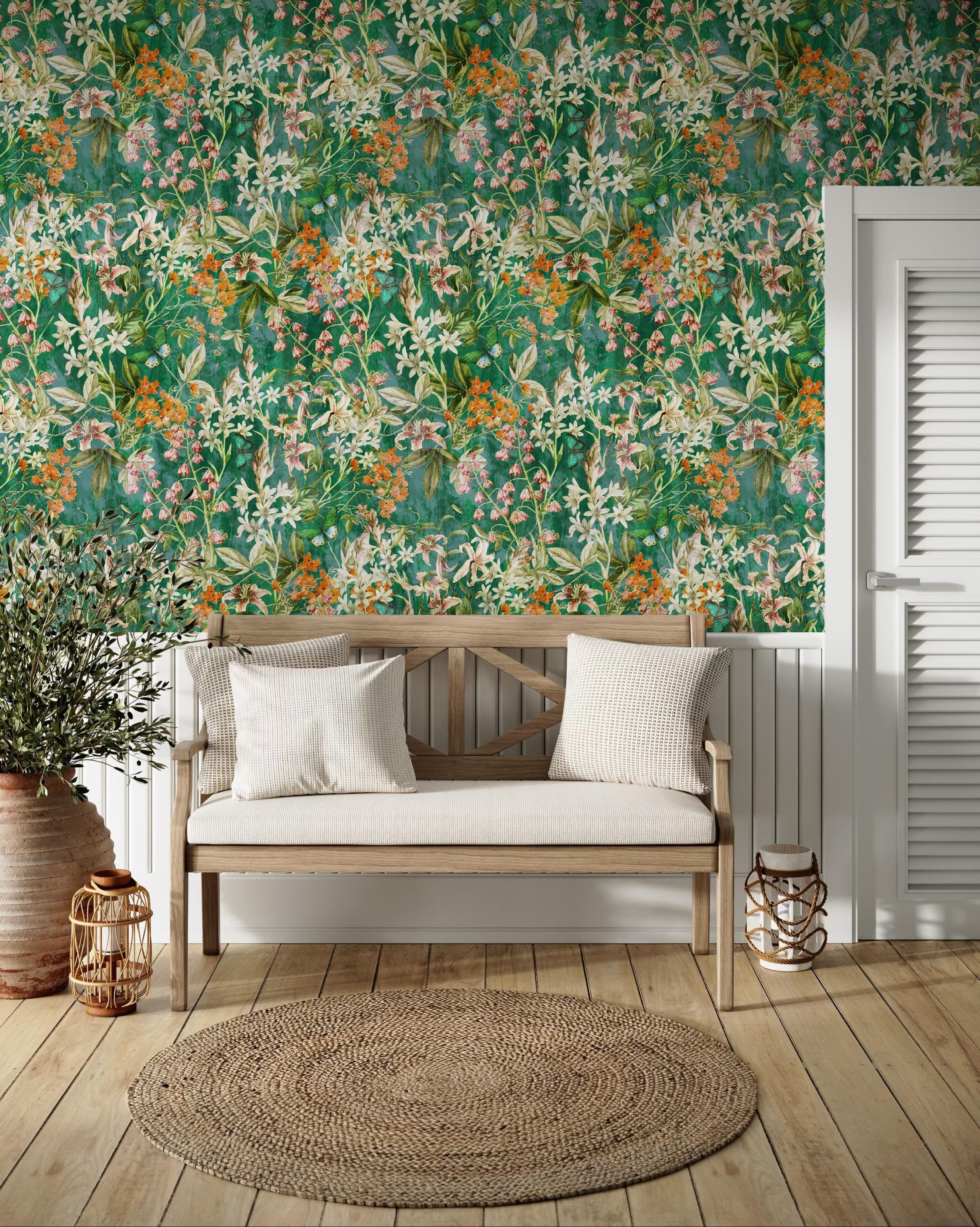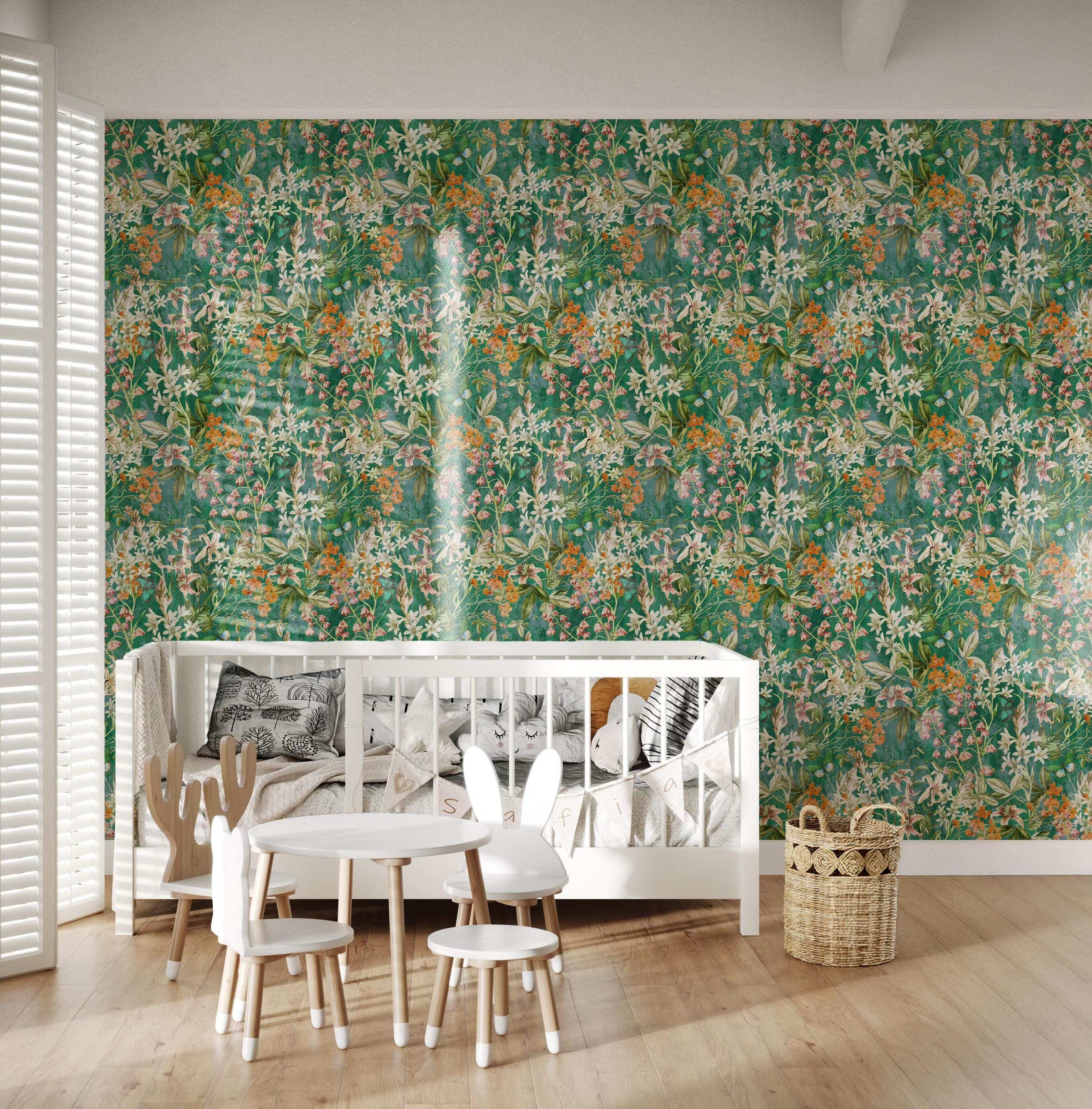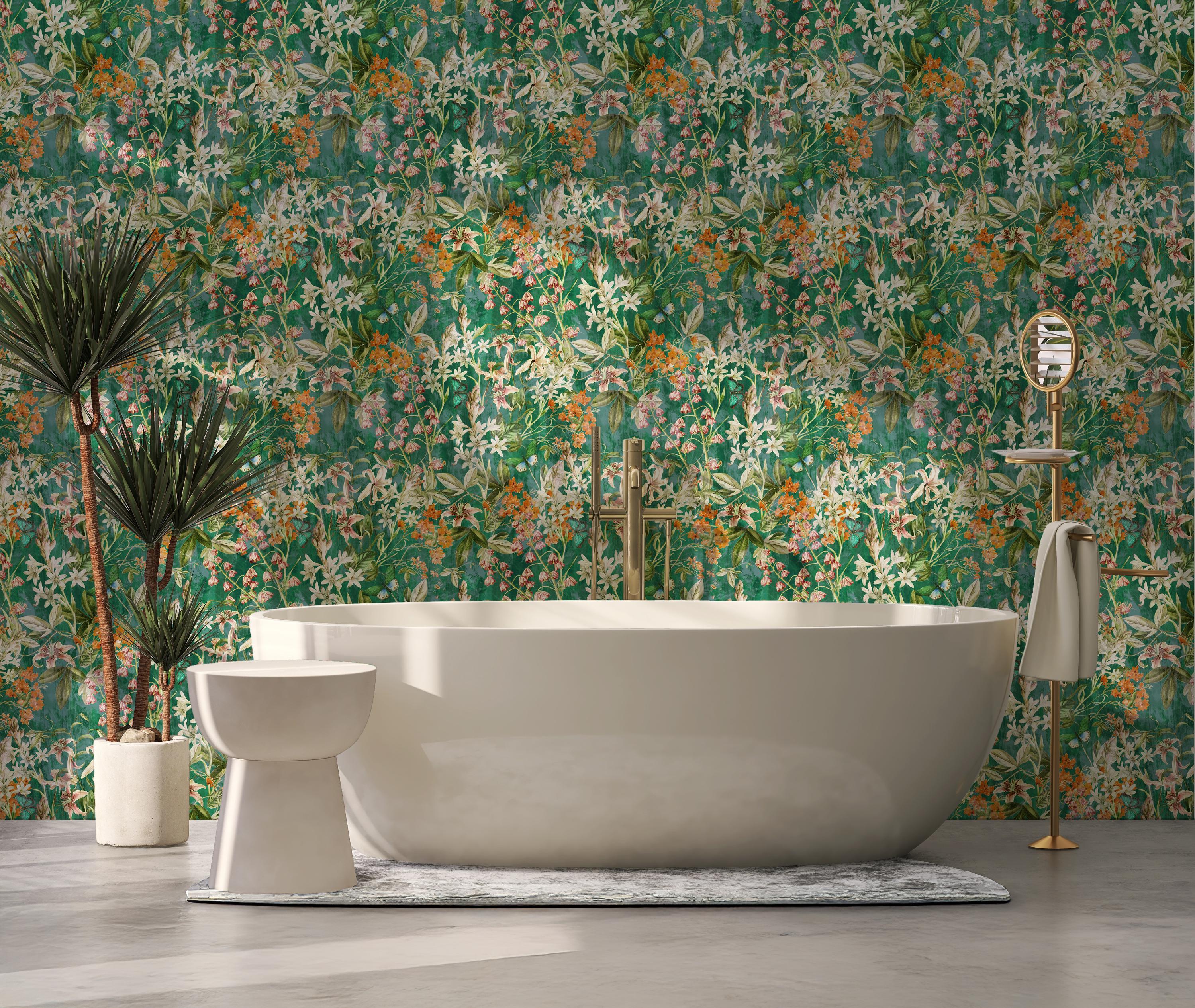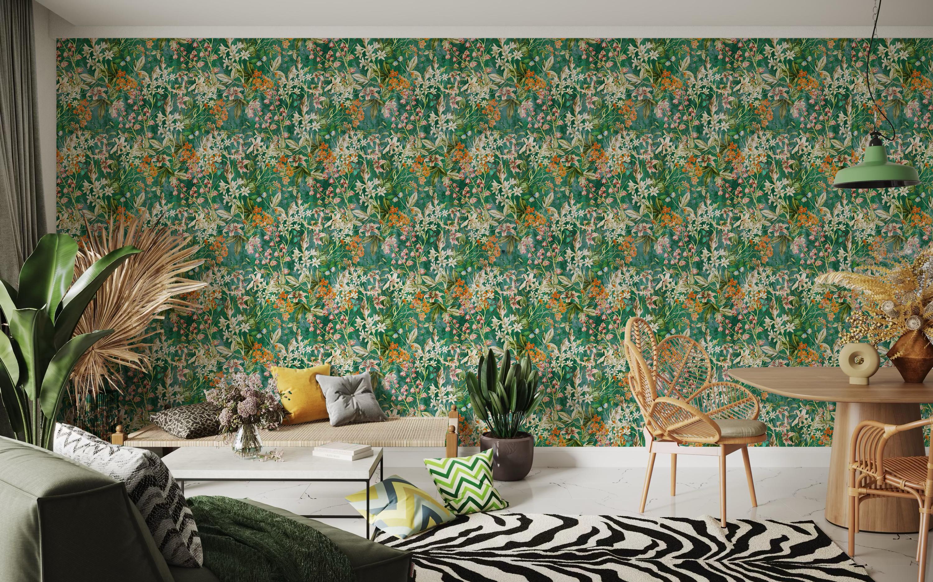 Bring a vibrant tropical flair to your space with our Bold Green Floral Wallpaper Mural. Featuring a lush jungle-inspired design with blooming orange, pink, and white flowers on a rich green background, this peel and stick wallpaper instantly transforms any room.