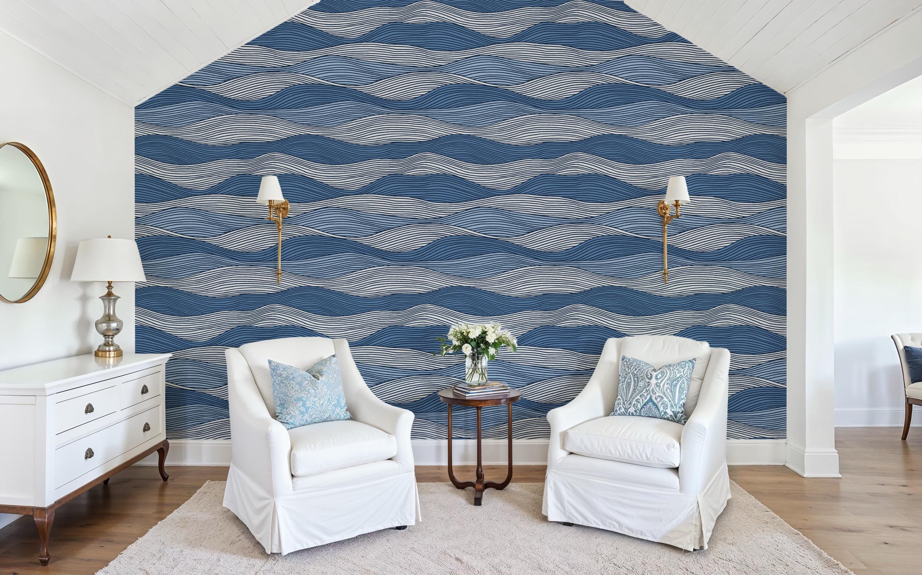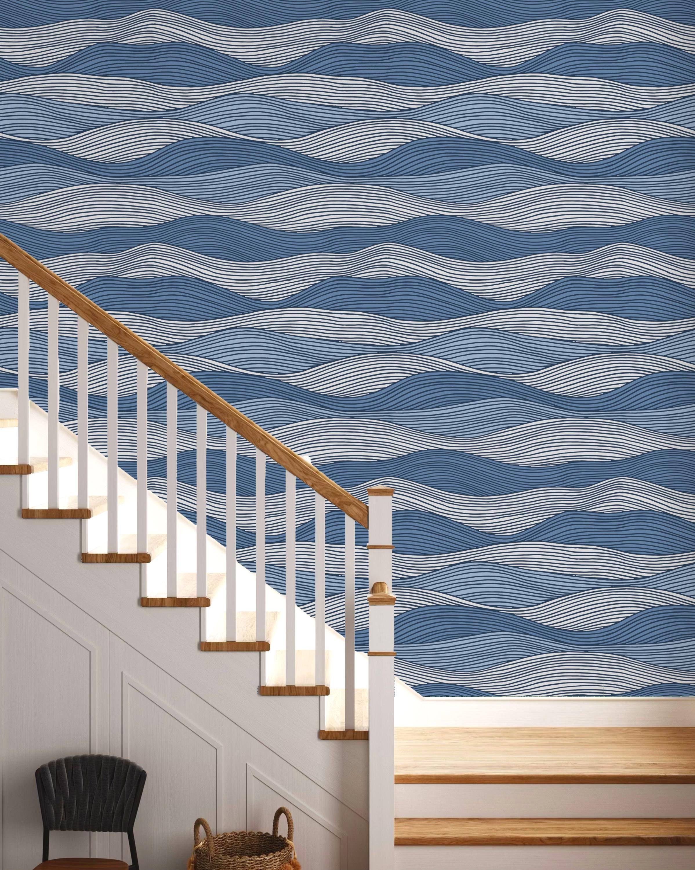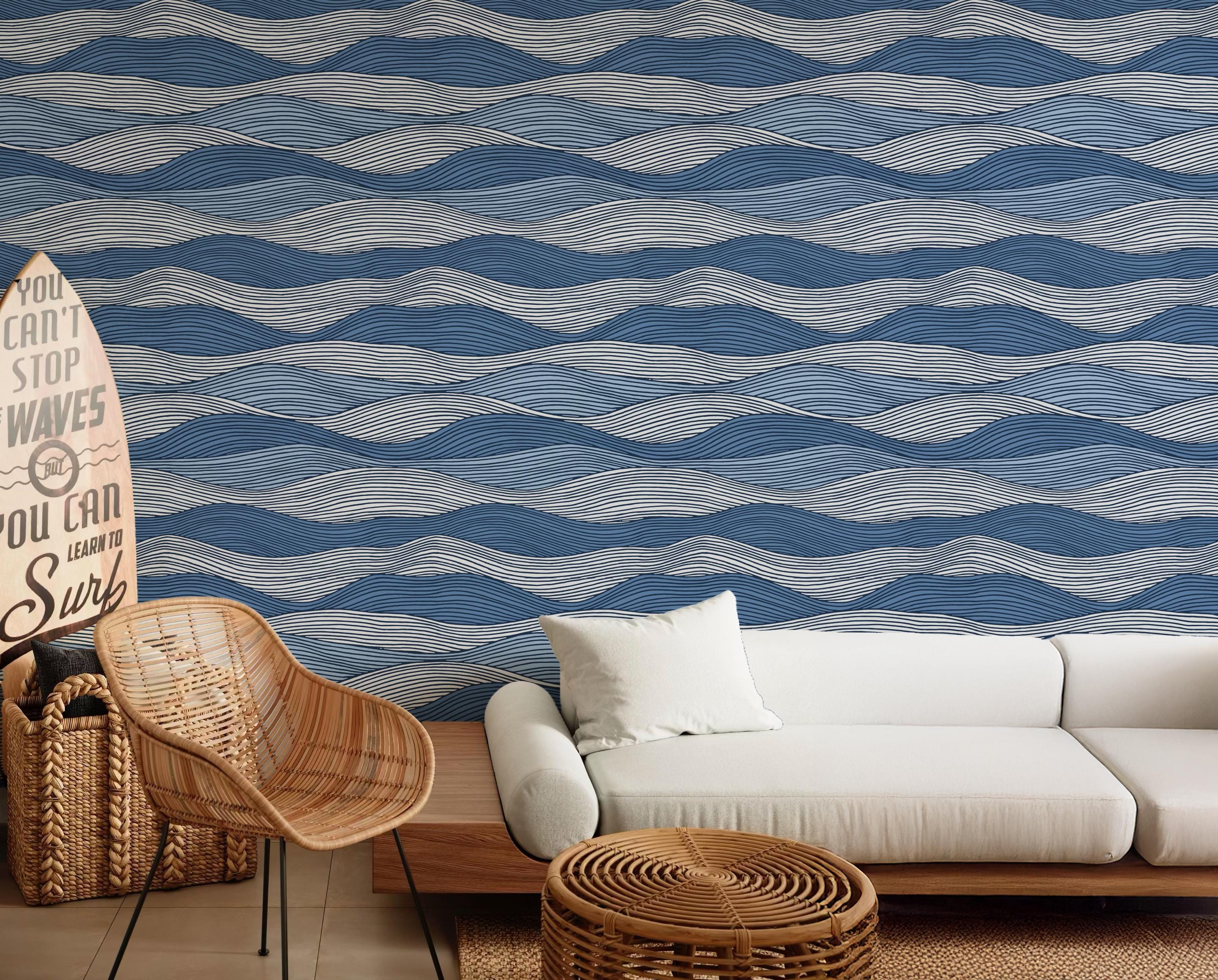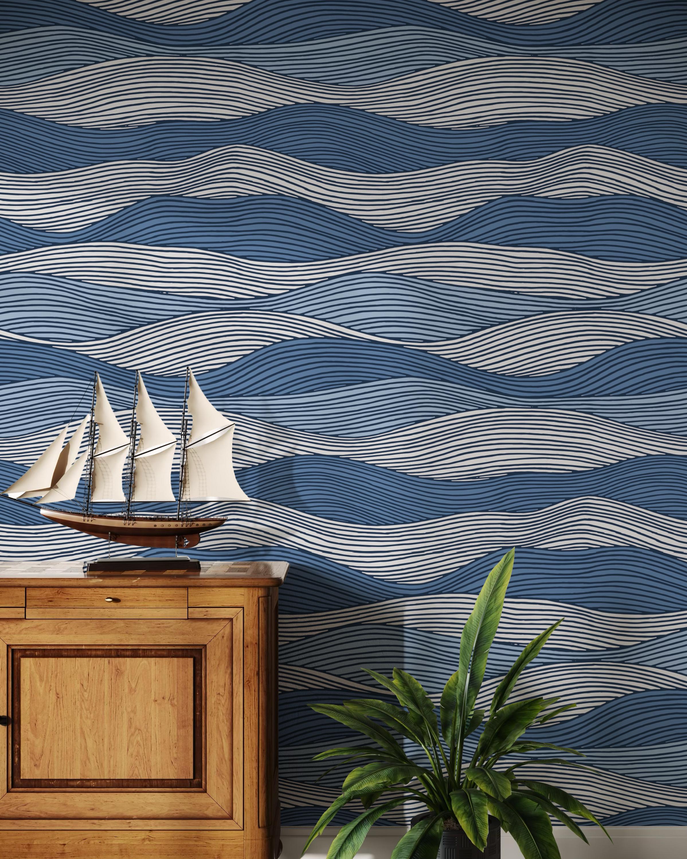 Blue Wave Removable Wallpaper, Coastal Line Art Peel and Stick Wall Decor