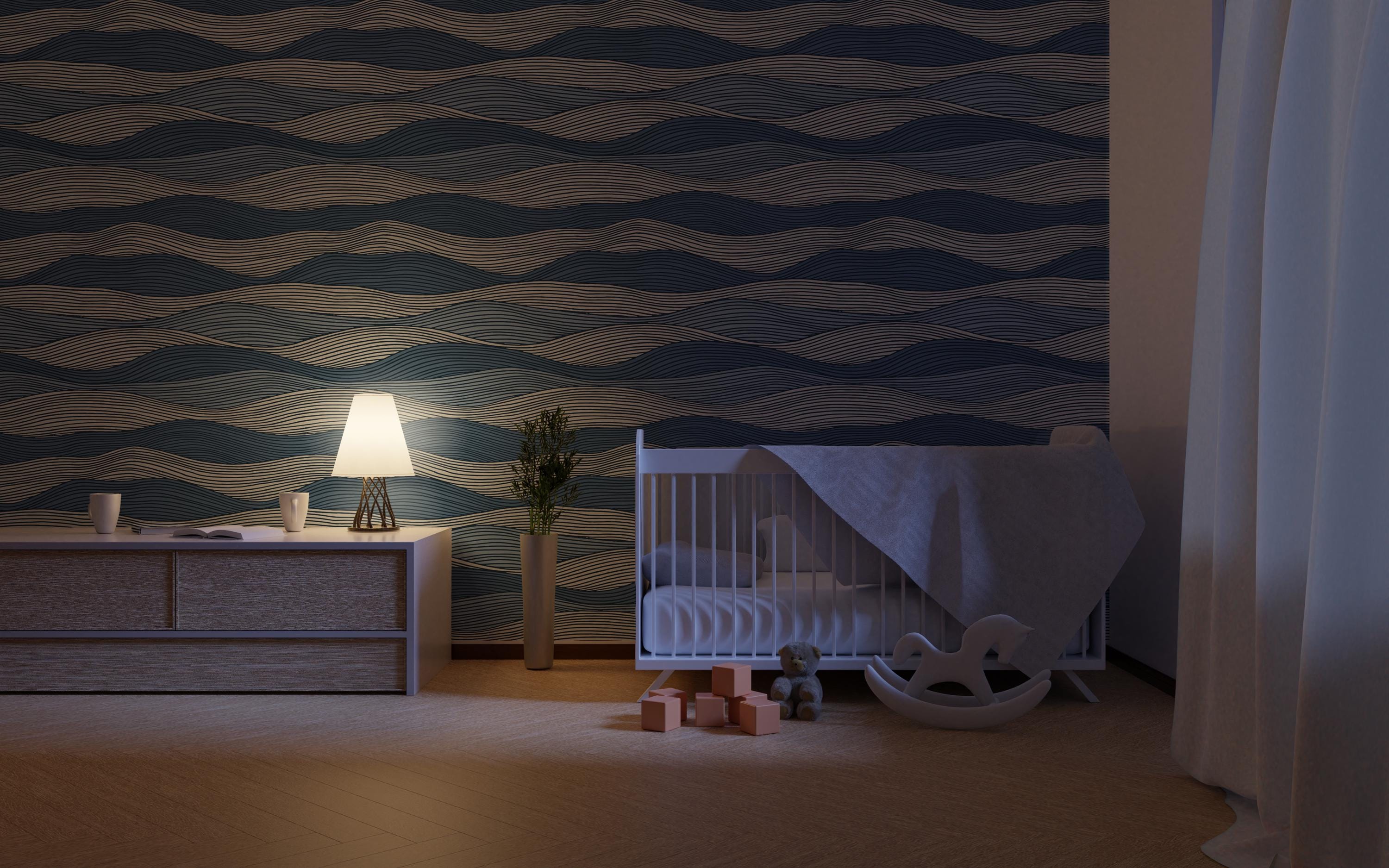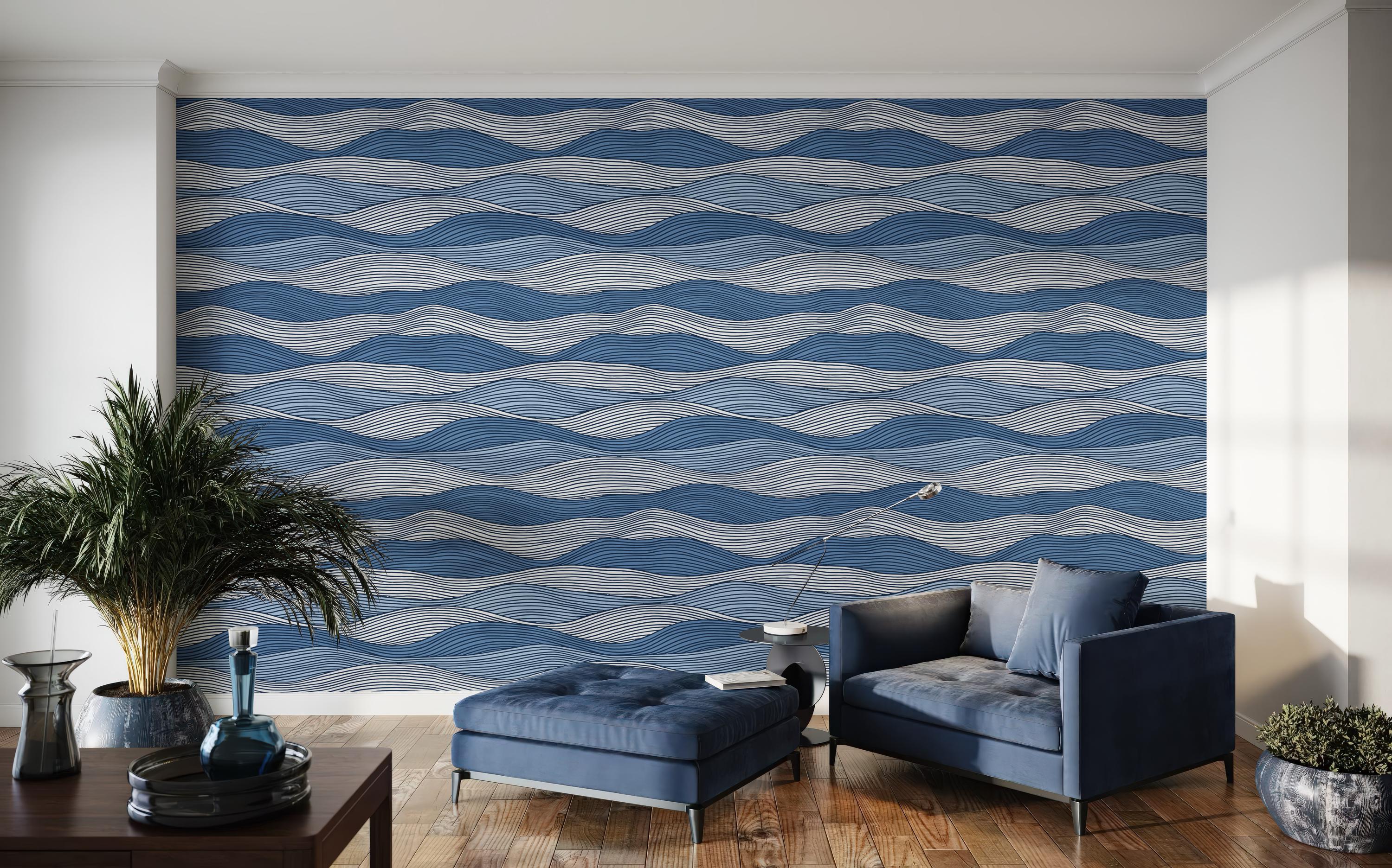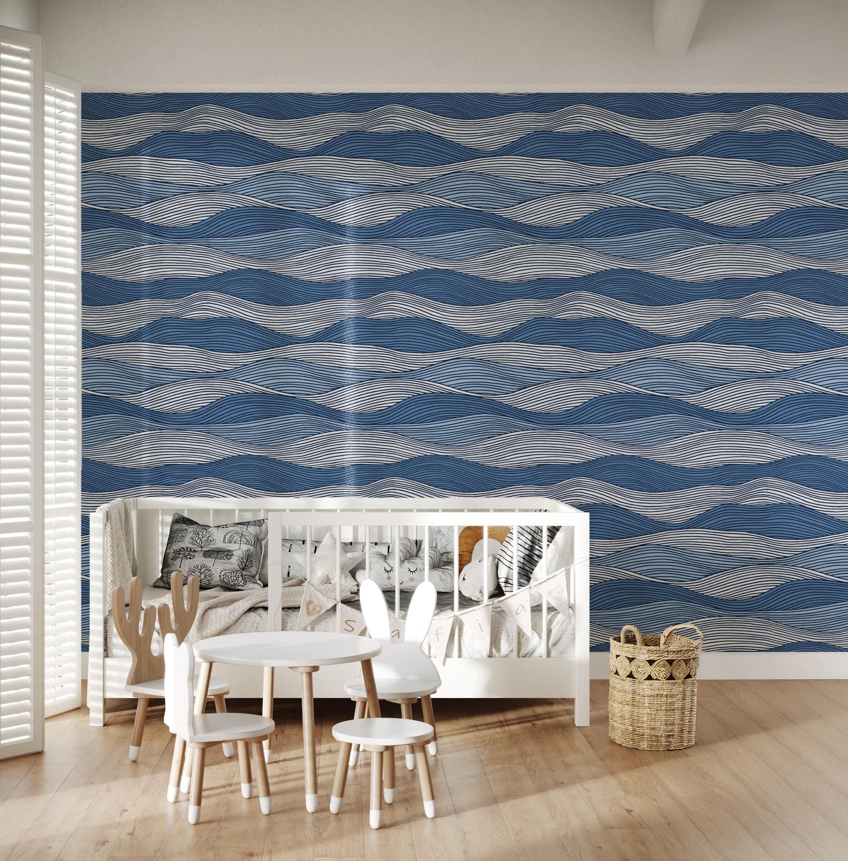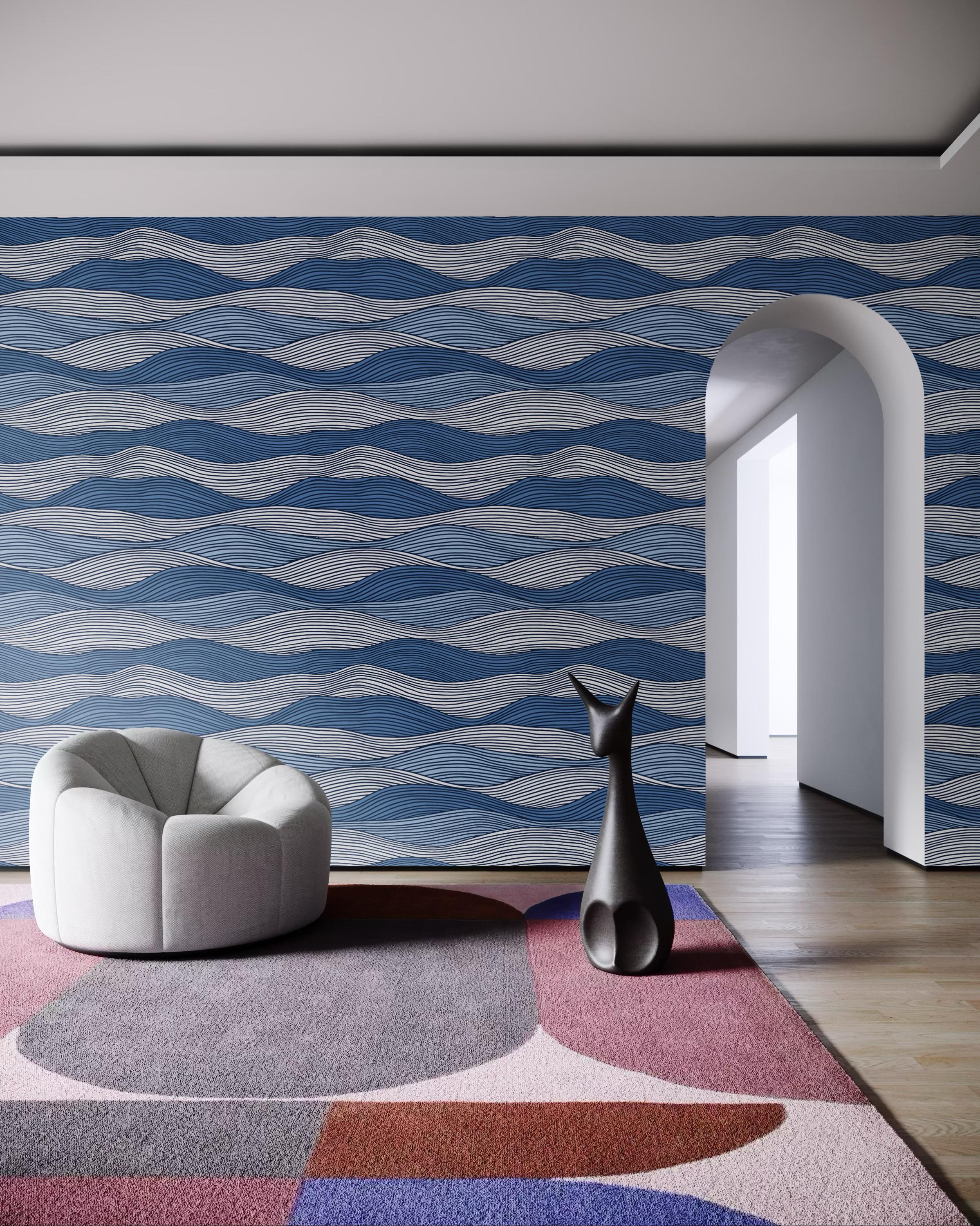 Navy Blue Wave Wallpaper – Modern Coastal Wall Mural, Ocean Inspired Wall Decor, Nautical Striped Removable Peel and Stick Wallpaper, Japandi or Mediterranean Living Room Accent Wall, Contemporary Bedroom Wall Art, Scandinavian Nursery Wallpaper, Boho Beach Style Interior Decor