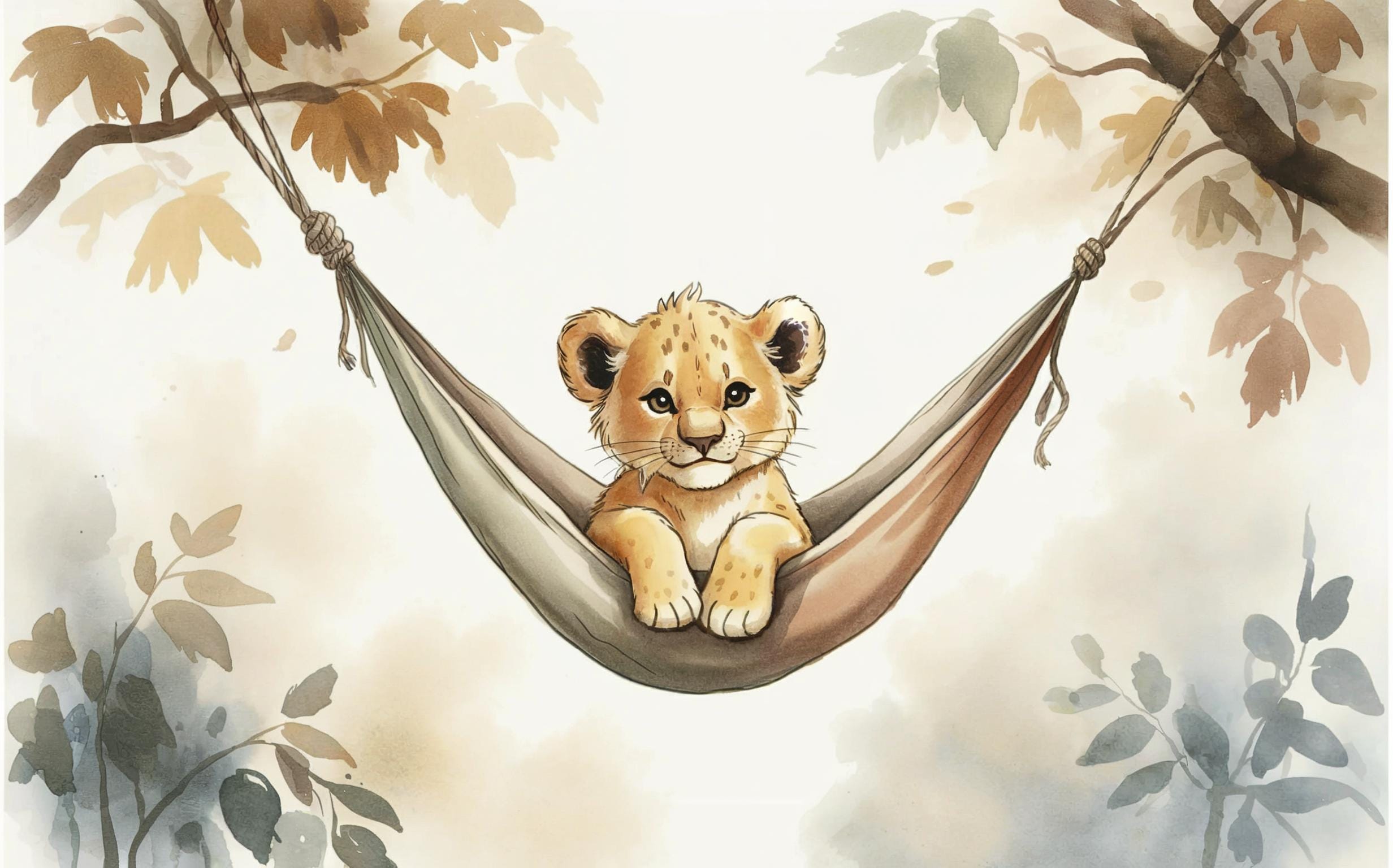 🦁 Charming baby lion design resting in a watercolor hammock scene