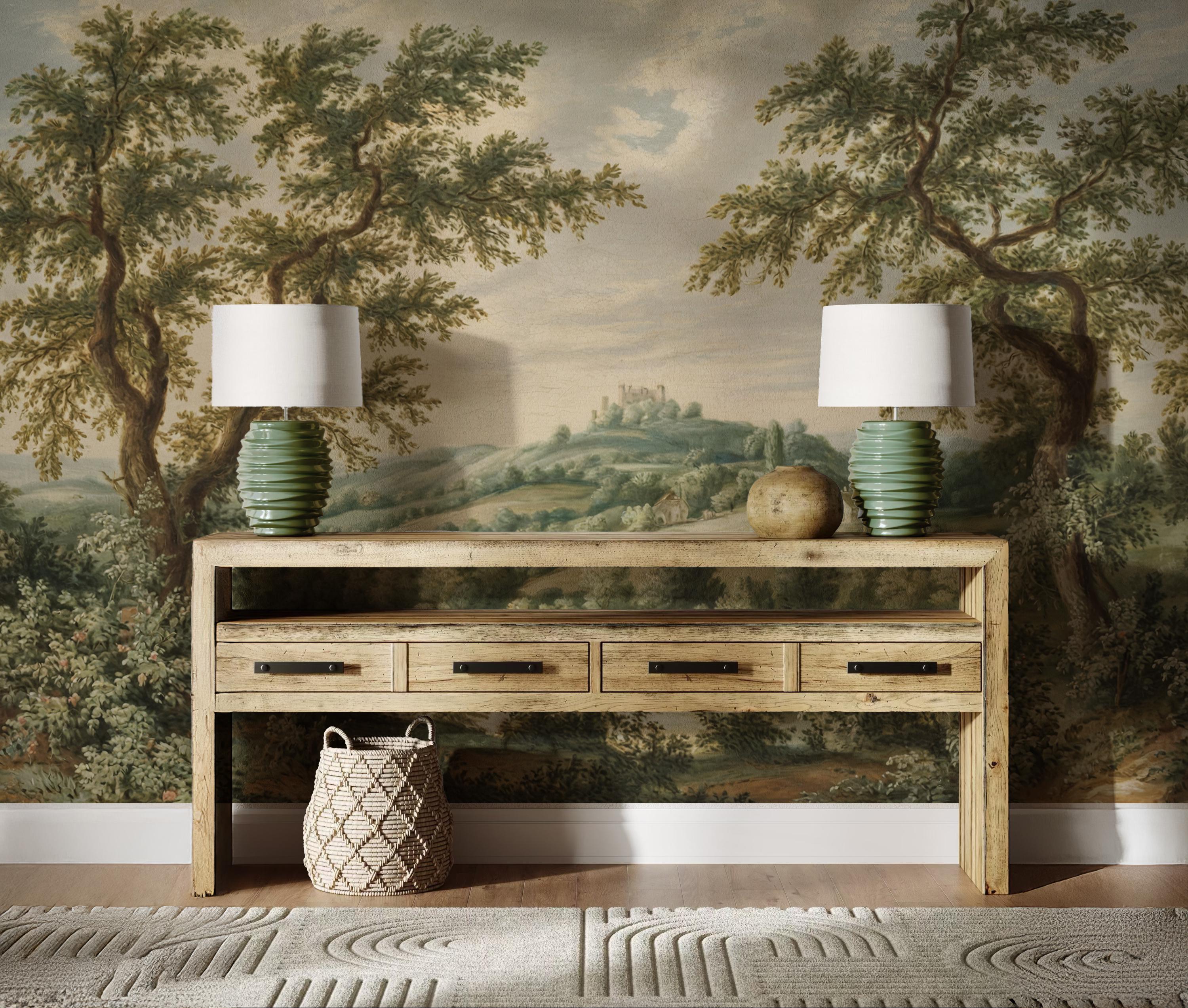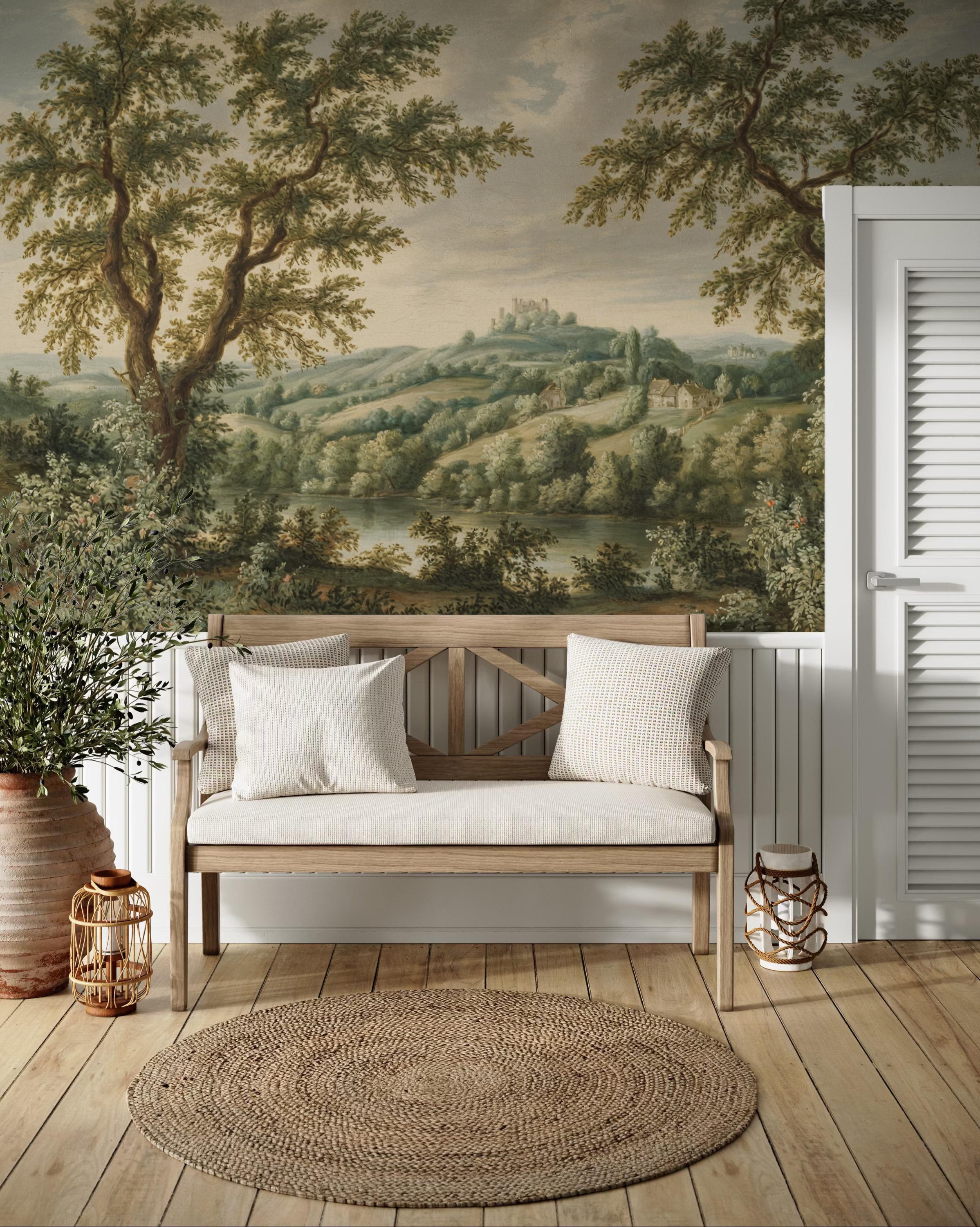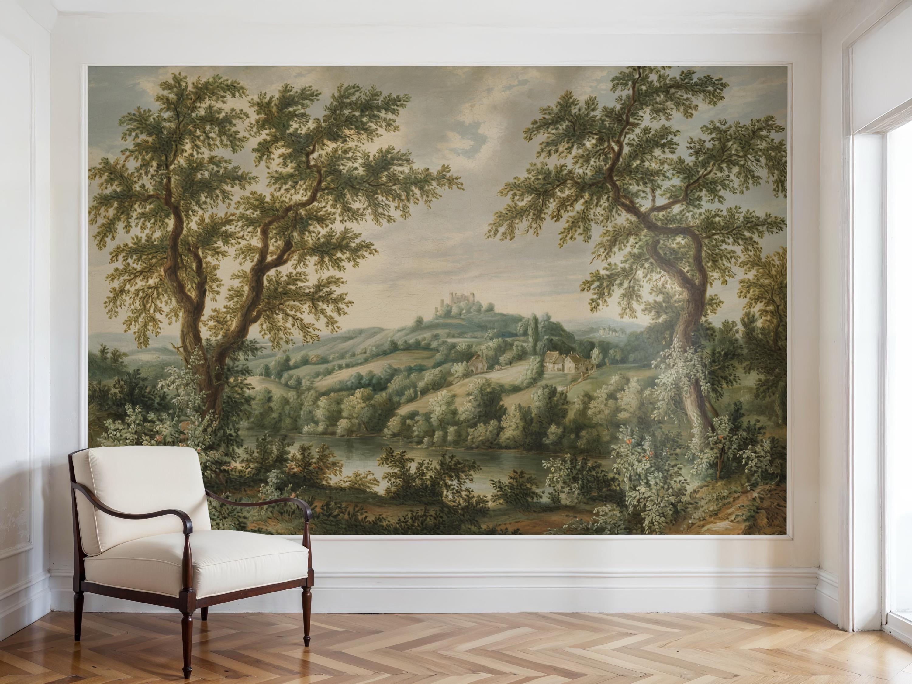 This vintage countryside scene wallpaper features a lush pastoral landscape with trees, hills, and cottages, perfect for adding classic charm to any space. The peel and stick wall mural is removable and self adhesive, making it renter friendly and easy to install. Ideal for vintage home decor, this timeless wall art transforms living rooms, bedrooms, and offices with nature-inspired elegance. The soft colors and historic style bring warmth, depth, and a tranquil countryside vibe to your interior.