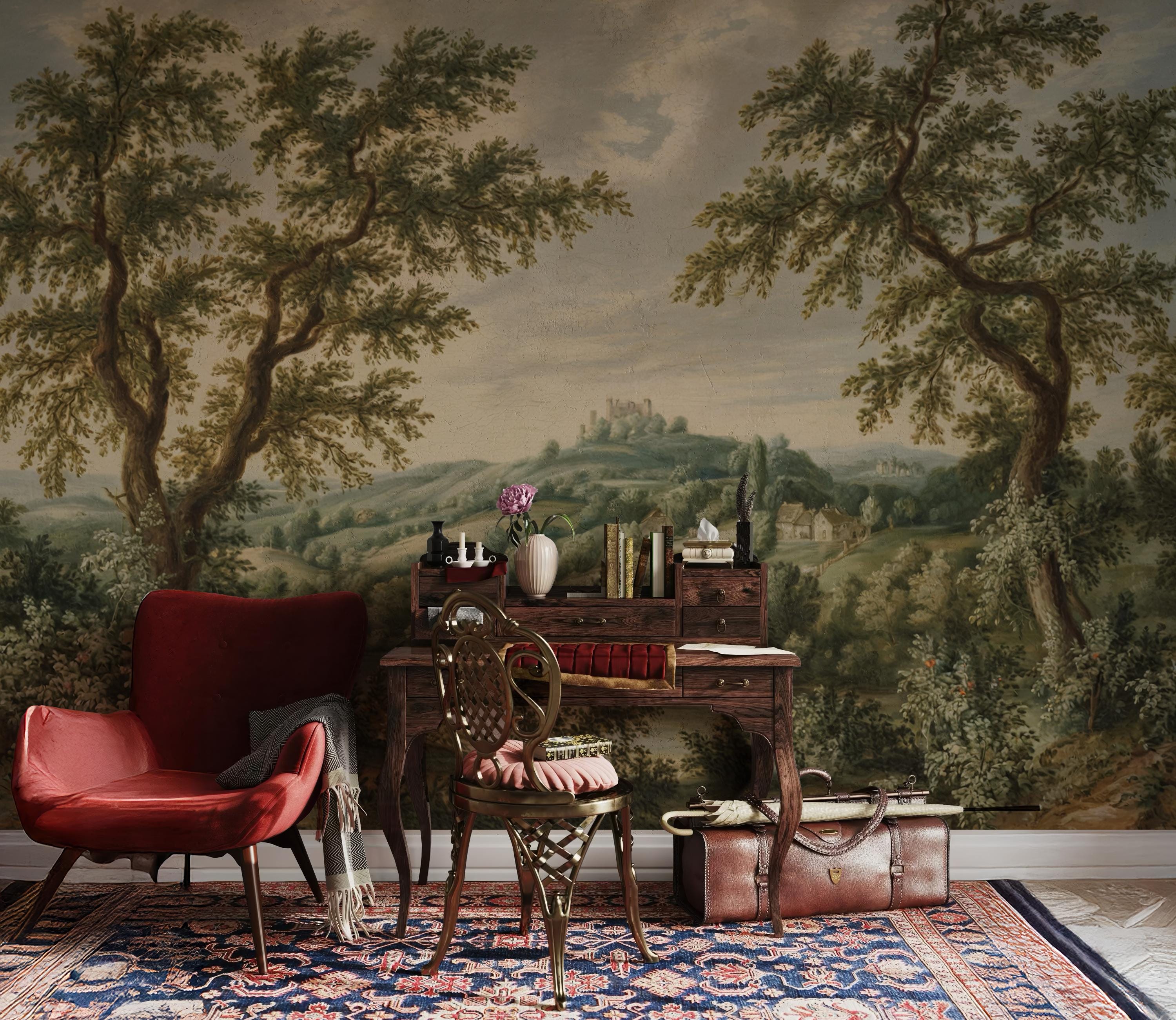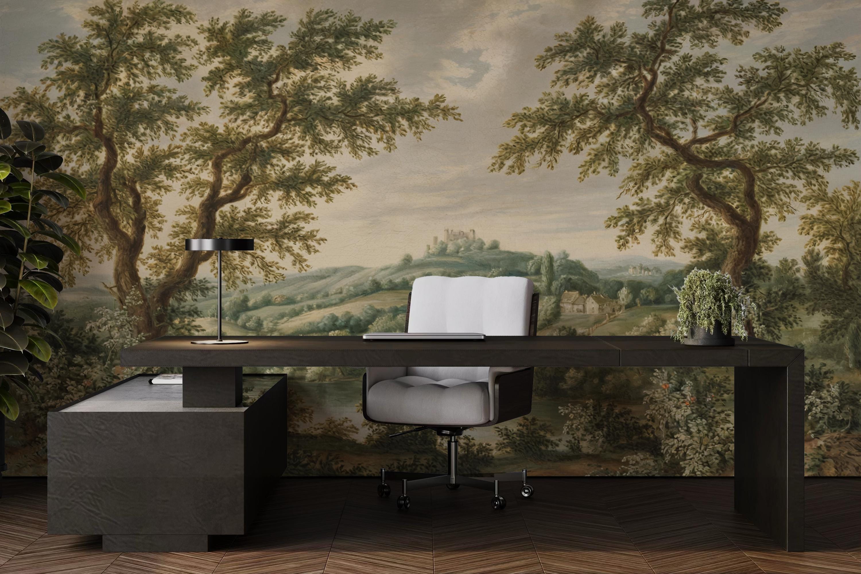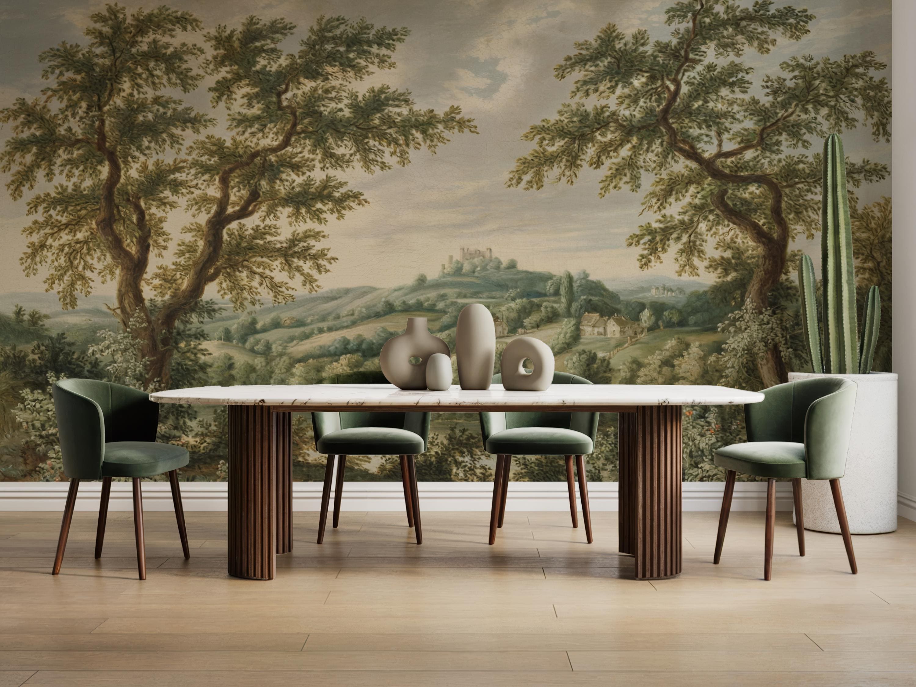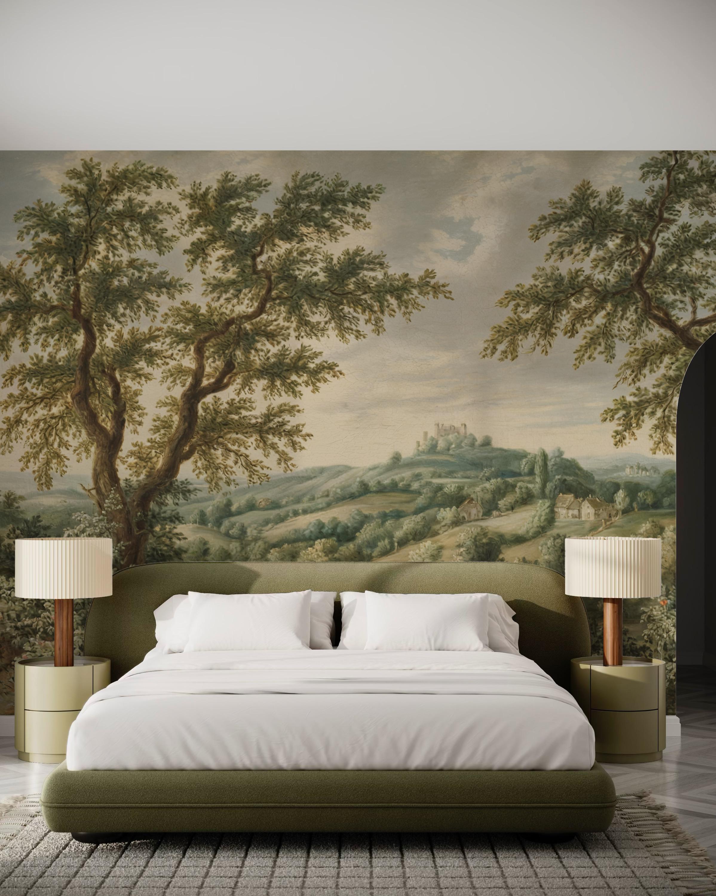 This vintage countryside scene wallpaper features a lush pastoral landscape with trees, hills, and cottages, perfect for adding classic charm to any space. The peel and stick wall mural is removable and self adhesive, making it renter friendly and easy to install. Ideal for vintage home decor, this timeless wall art transforms living rooms, bedrooms, and offices with nature-inspired elegance. The soft colors and historic style bring warmth, depth, and a tranquil countryside vibe to your interior.