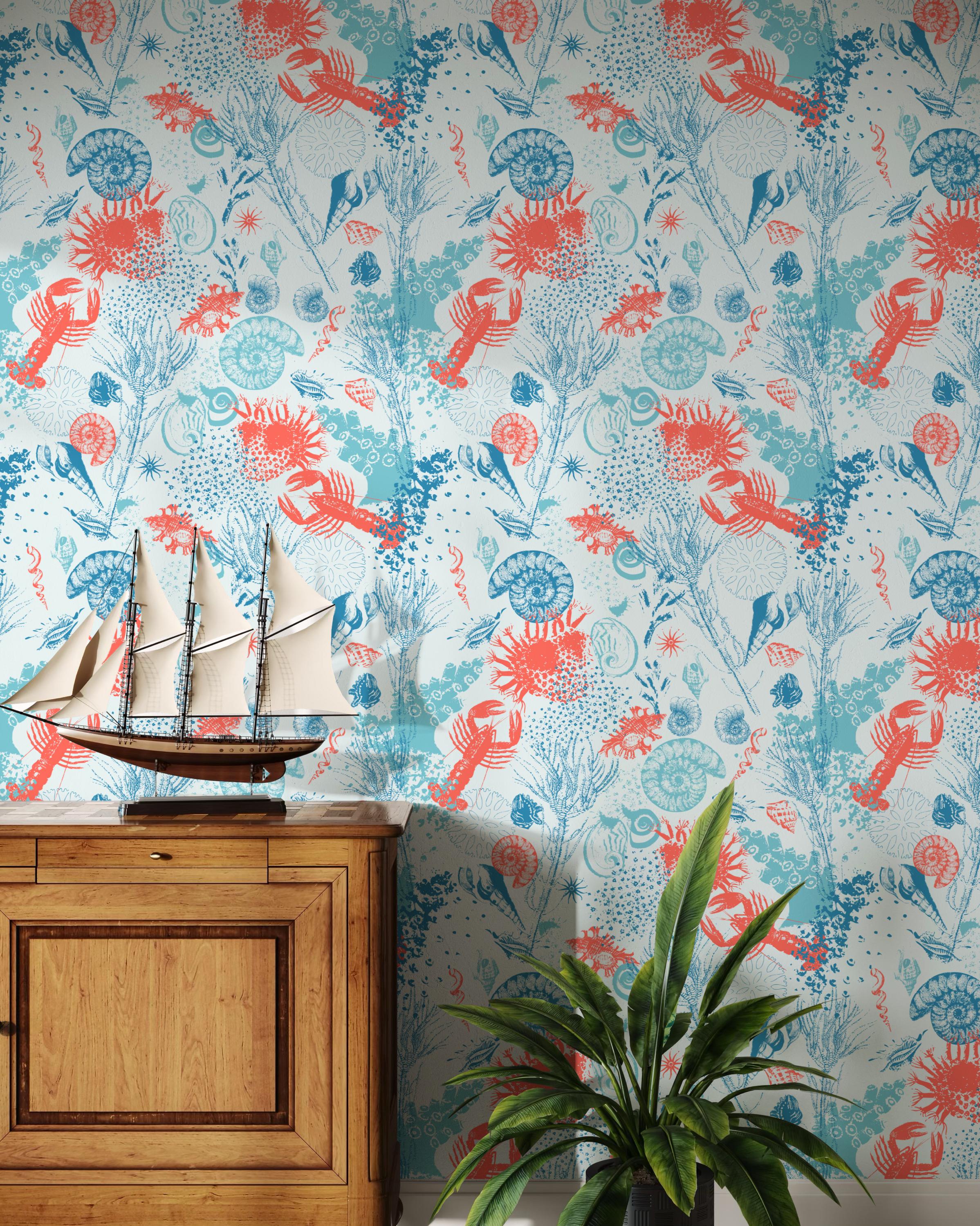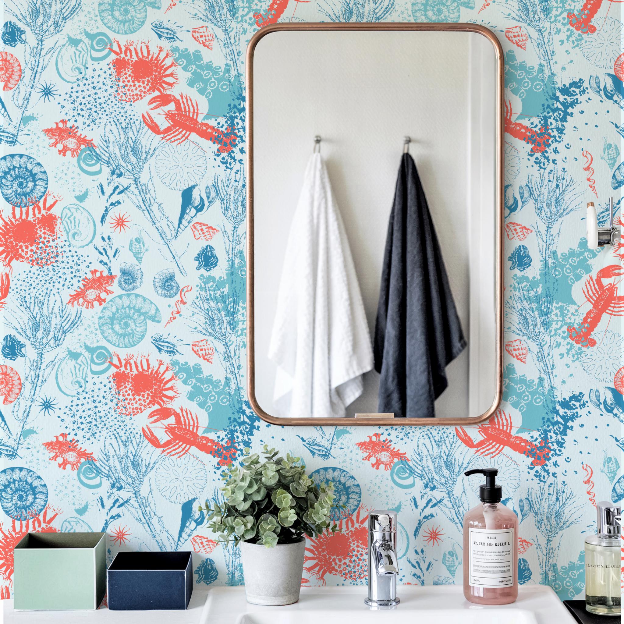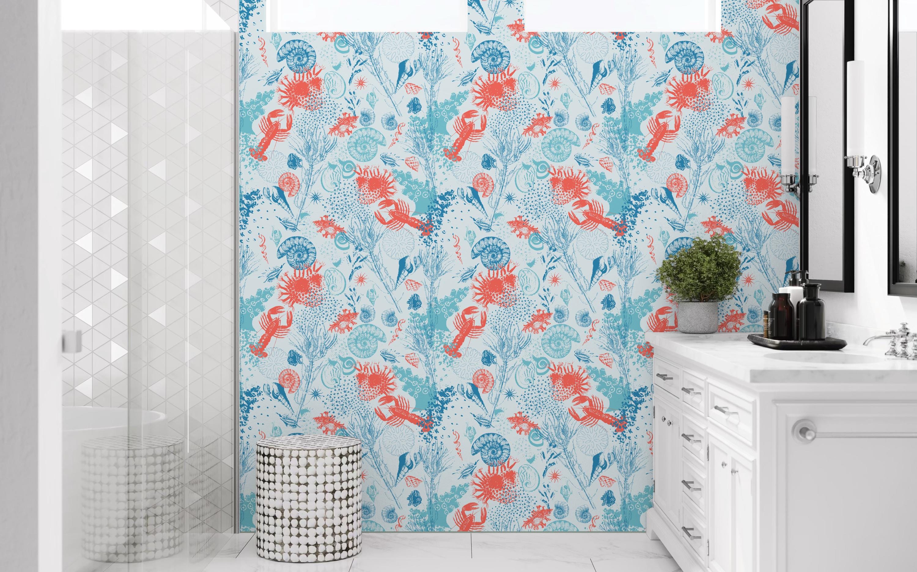 Transform your bathroom with this stunning coastal peel and stick wallpaper, featuring a vibrant underwater design with coral, crabs, ammonites, and oceanic plants. Perfect for a powder room, toilet, or vanity wall, this nautical wall mural adds a fresh beach vibe to any space. Our removable wallpaper is ideal for renters and easy to install on smooth surfaces. Whether you're updating a small guest bathroom or adding a splash of the sea to your washroom, this high-quality adhesive wallpaper delivers charm and personality without damage. Available in multiple sizes to suit your needs, it's the perfect sea-themed decor accent.