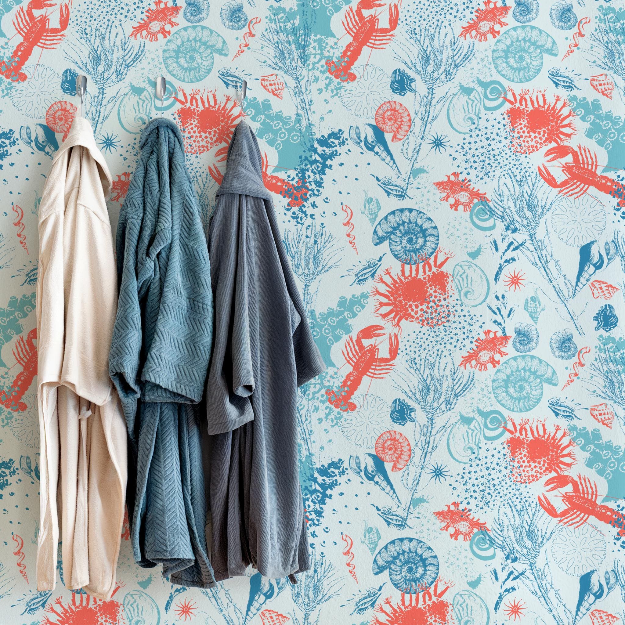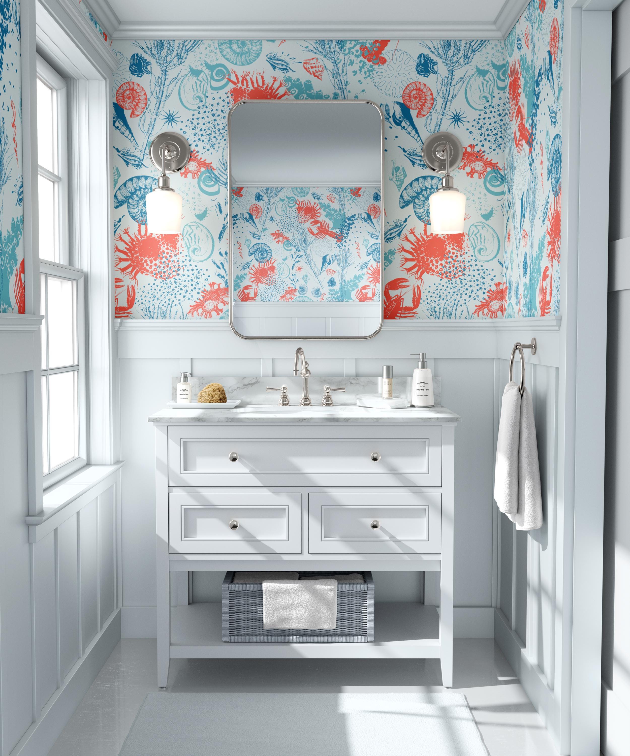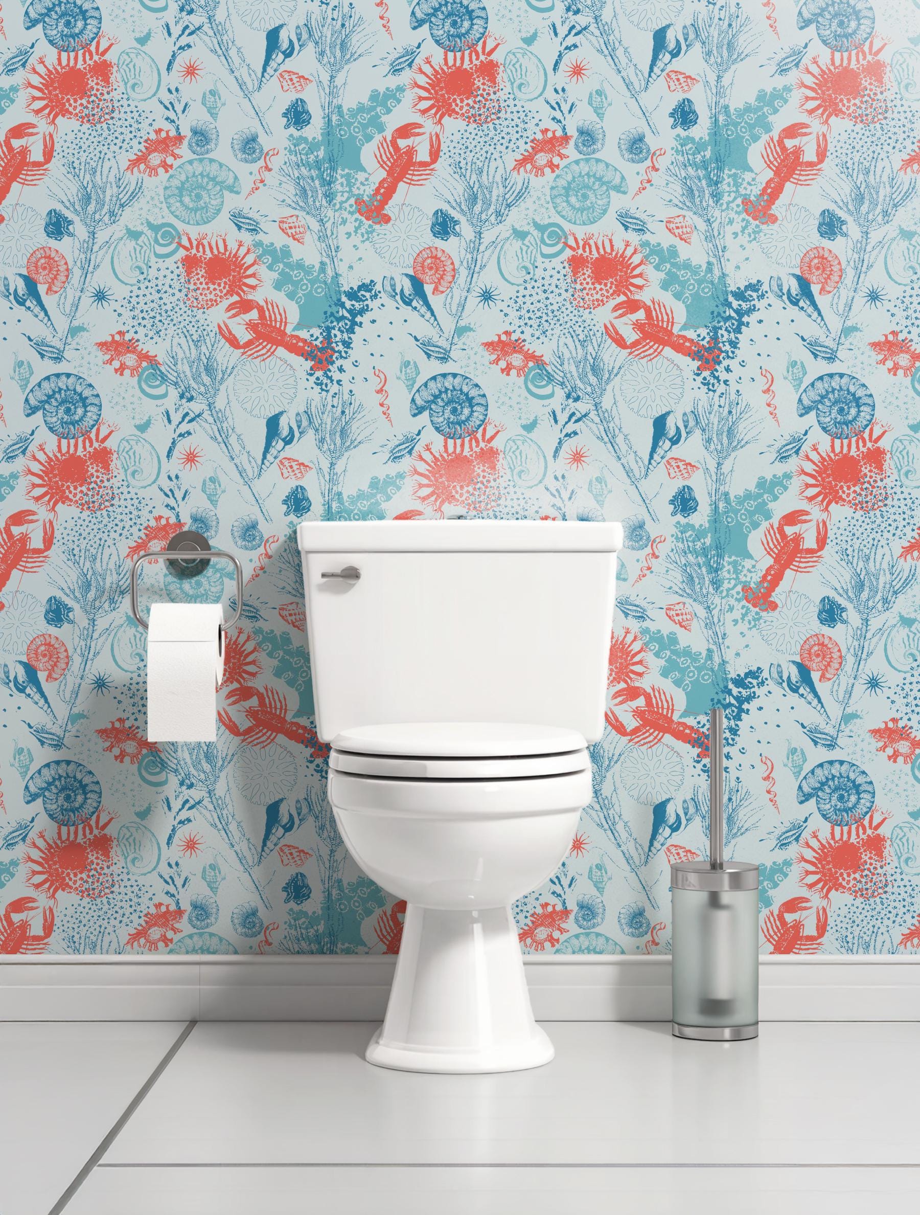 Transform your bathroom with this stunning coastal peel and stick wallpaper, featuring a vibrant underwater design with coral, crabs, ammonites, and oceanic plants. Perfect for a powder room, toilet, or vanity wall, this nautical wall mural adds a fresh beach vibe to any space. Our removable wallpaper is ideal for renters and easy to install on smooth surfaces. Whether you're updating a small guest bathroom or adding a splash of the sea to your washroom, this high-quality adhesive wallpaper delivers charm and personality without damage. Available in multiple sizes to suit your needs, it's the perfect sea-themed decor accent.