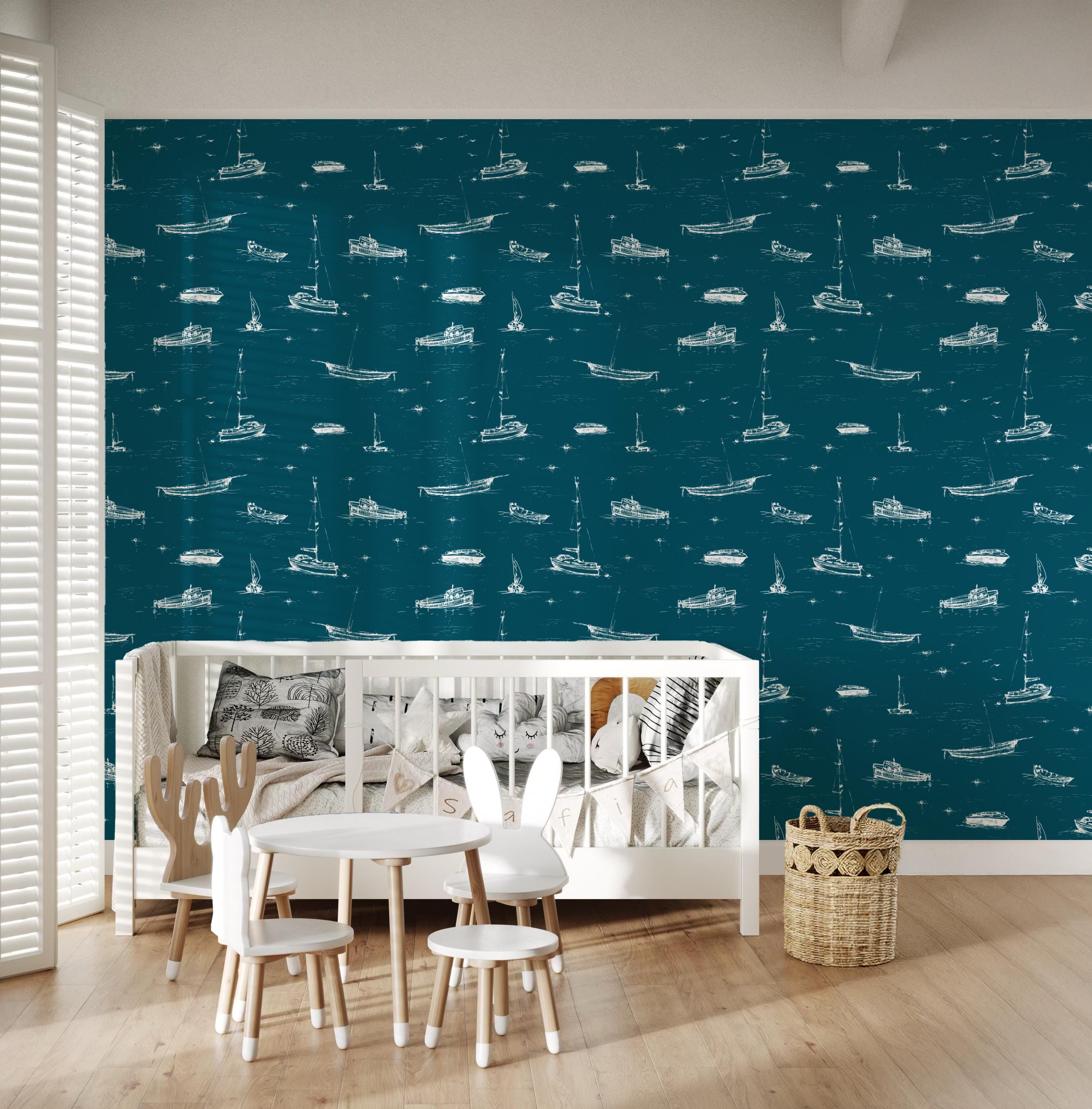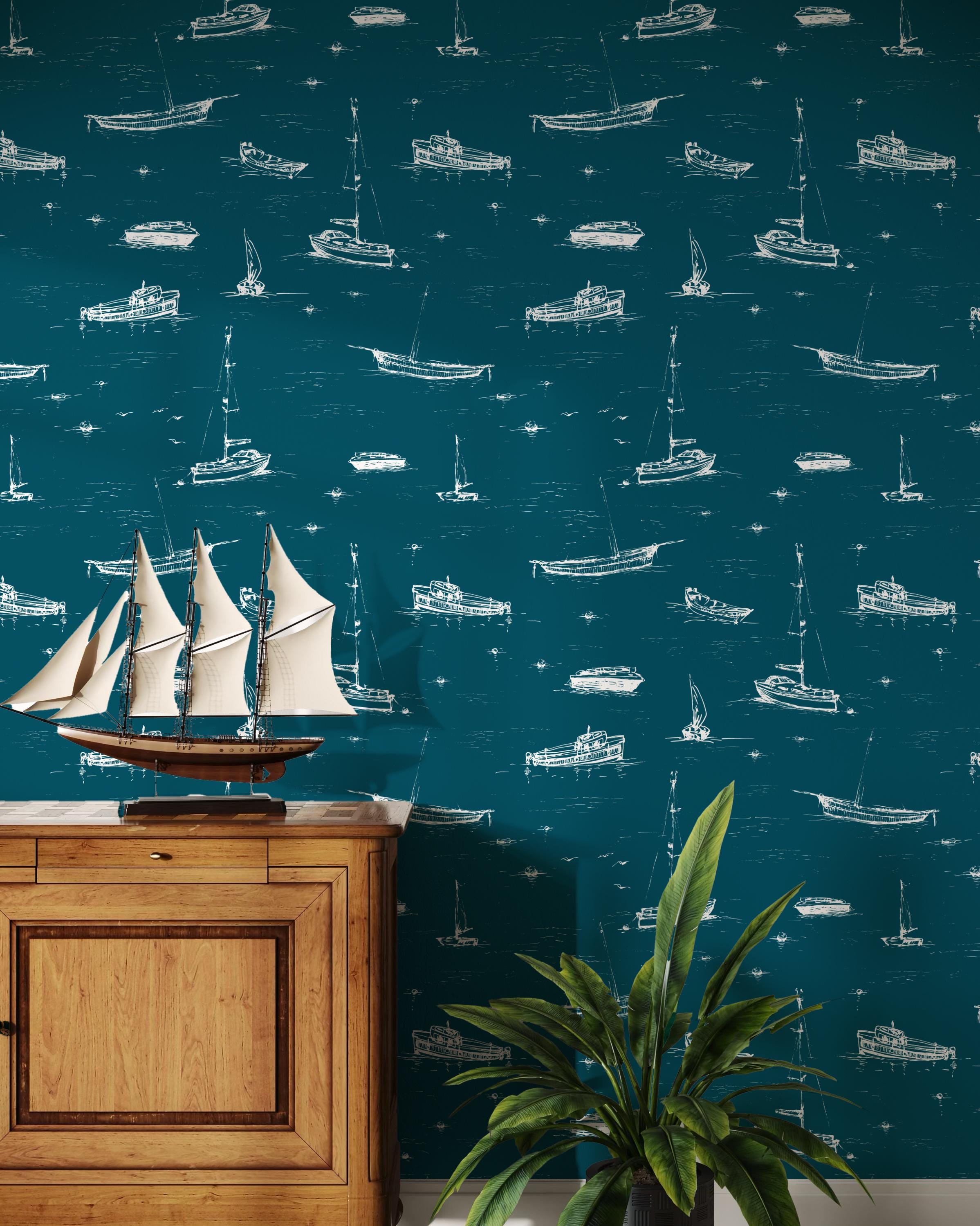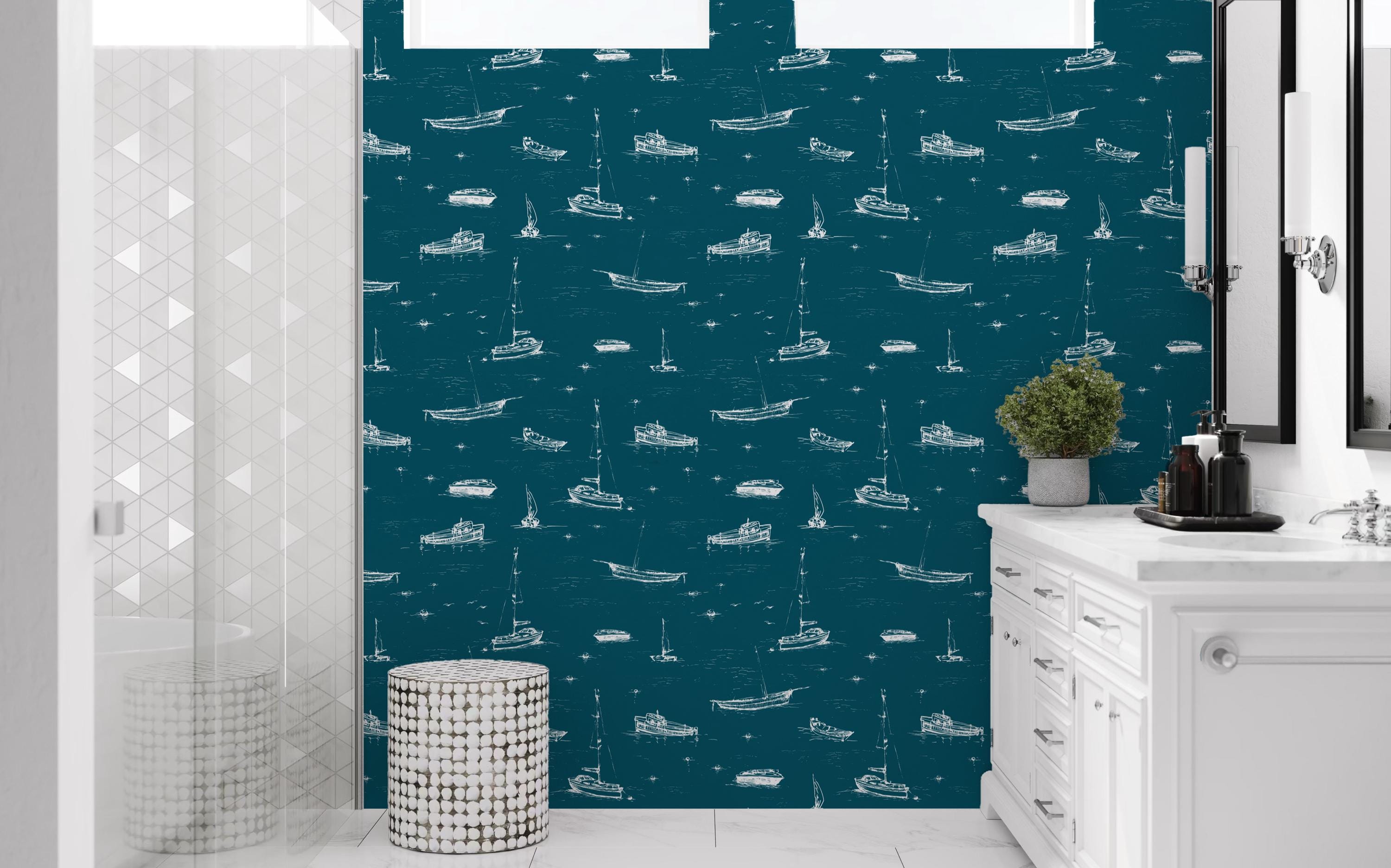 Add a breezy coastal charm to your space with this nautical wallpaper featuring hand-drawn boats, sailboats, and yachts drifting over deep teal waves. Ideal for a bathroom, boys’ nursery, powder room, or beach house living area, this versatile design is available in peel-and-stick or traditional wallpaper options. The crisp white illustrations pop against a rich ocean-blue background, creating a relaxing maritime atmosphere. Easy to apply and remove, this wall mural transforms any room into a stylish seaside retreat. Perfect for nautical interiors, kid-friendly themes, or modern coastal homes.