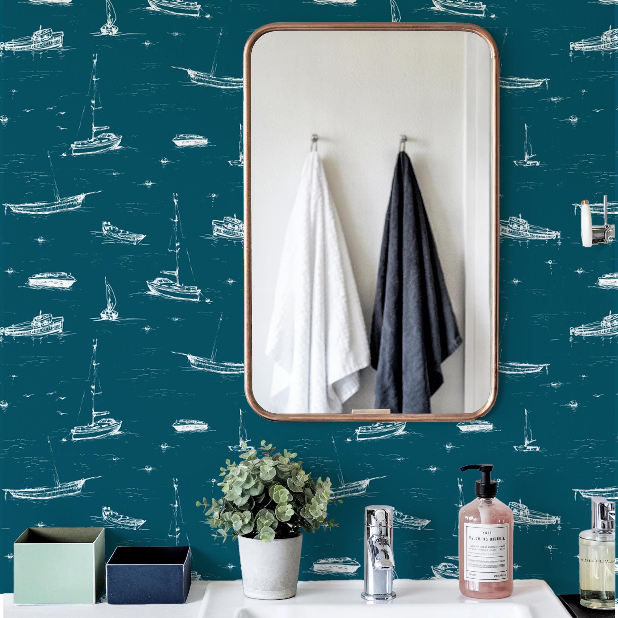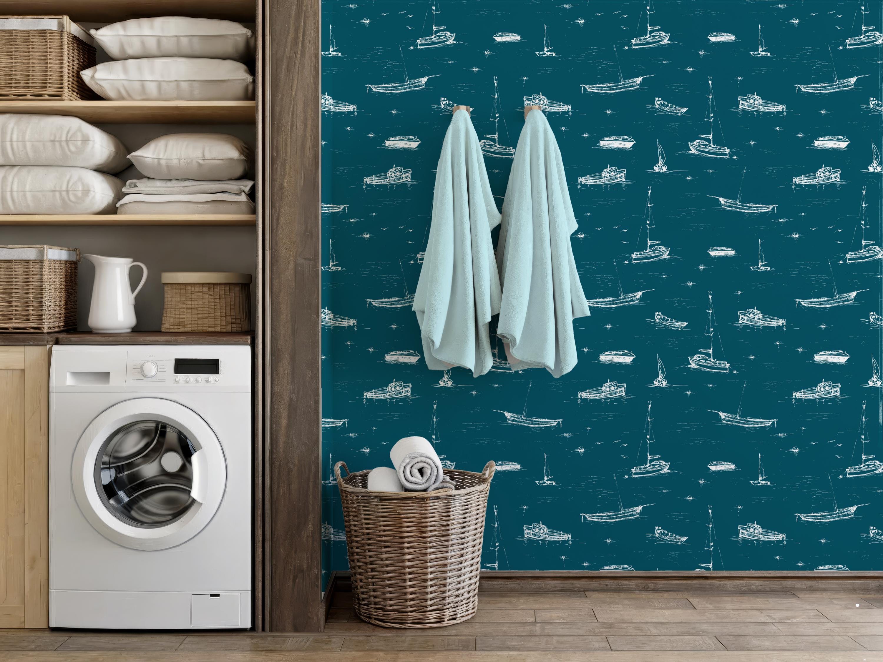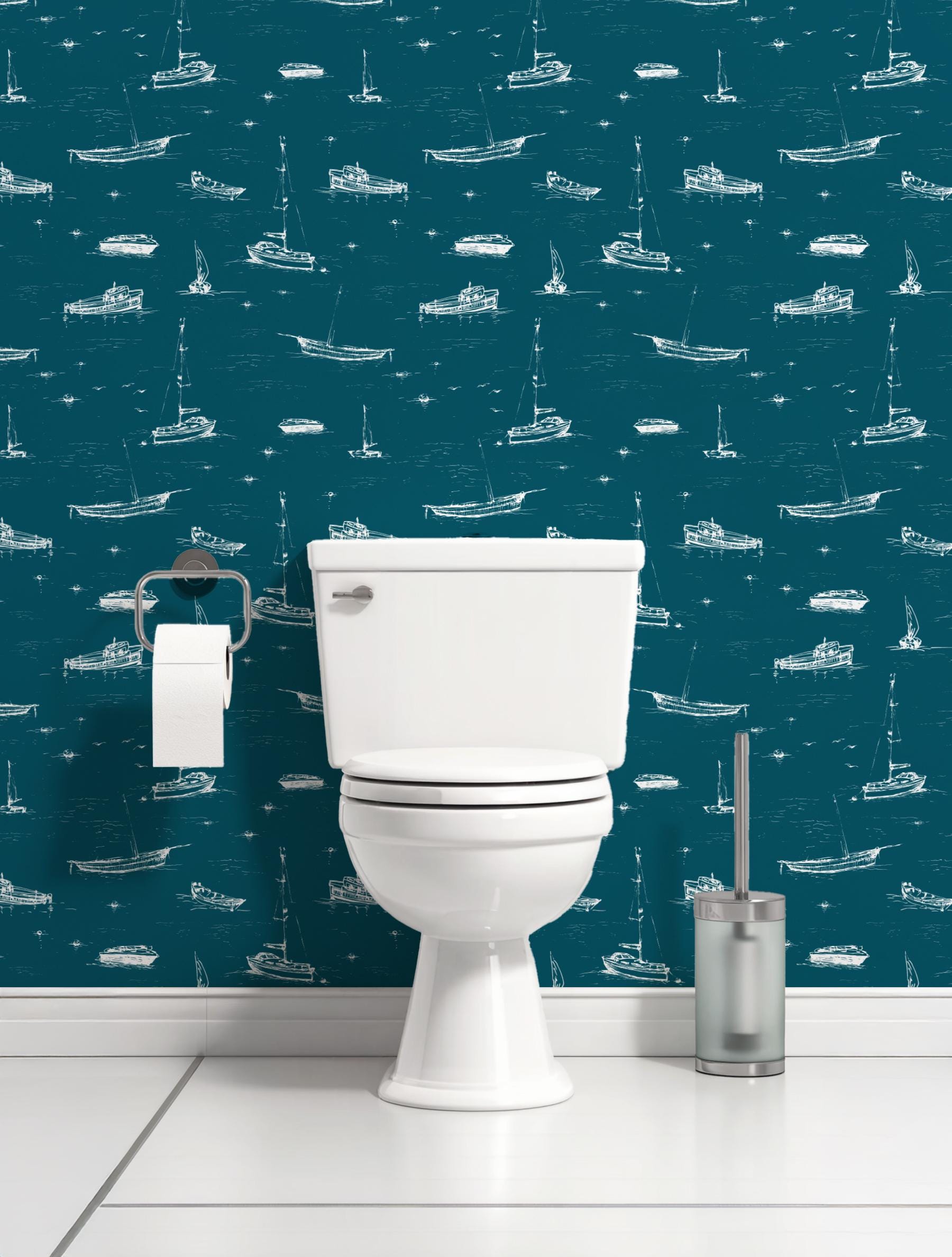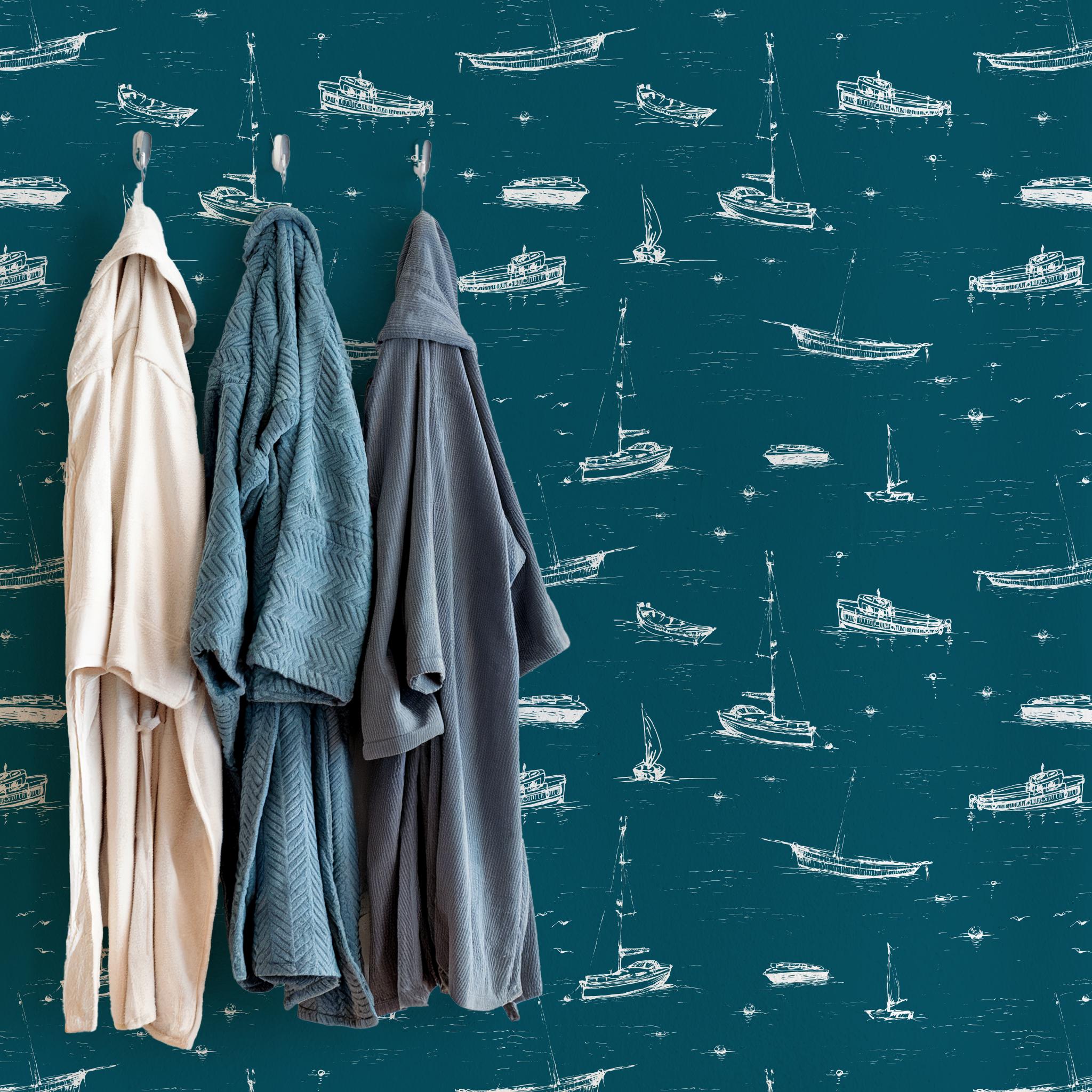 Add a breezy coastal charm to your space with this nautical wallpaper featuring hand-drawn boats, sailboats, and yachts drifting over deep teal waves. Ideal for a bathroom, boys’ nursery, powder room, or beach house living area, this versatile design is available in peel-and-stick or traditional wallpaper options. The crisp white illustrations pop against a rich ocean-blue background, creating a relaxing maritime atmosphere. Easy to apply and remove, this wall mural transforms any room into a stylish seaside retreat. Perfect for nautical interiors, kid-friendly themes, or modern coastal homes.