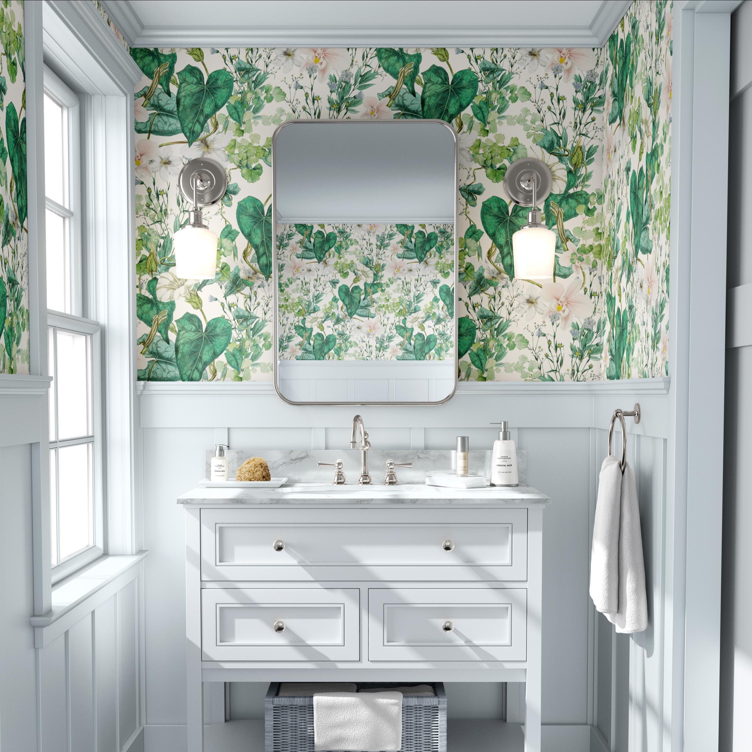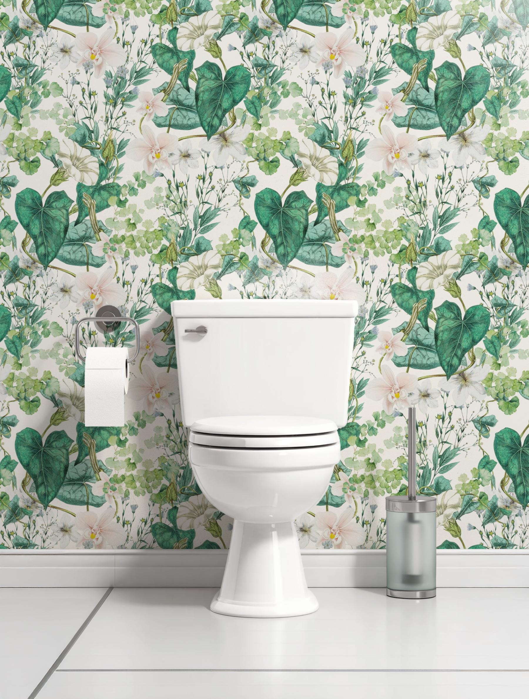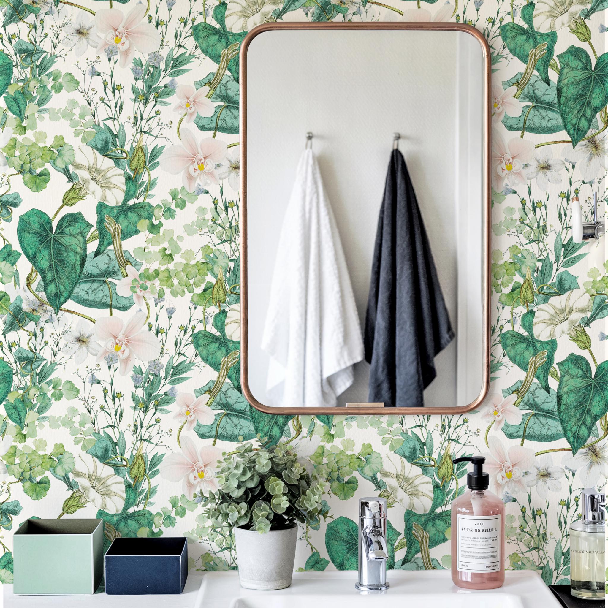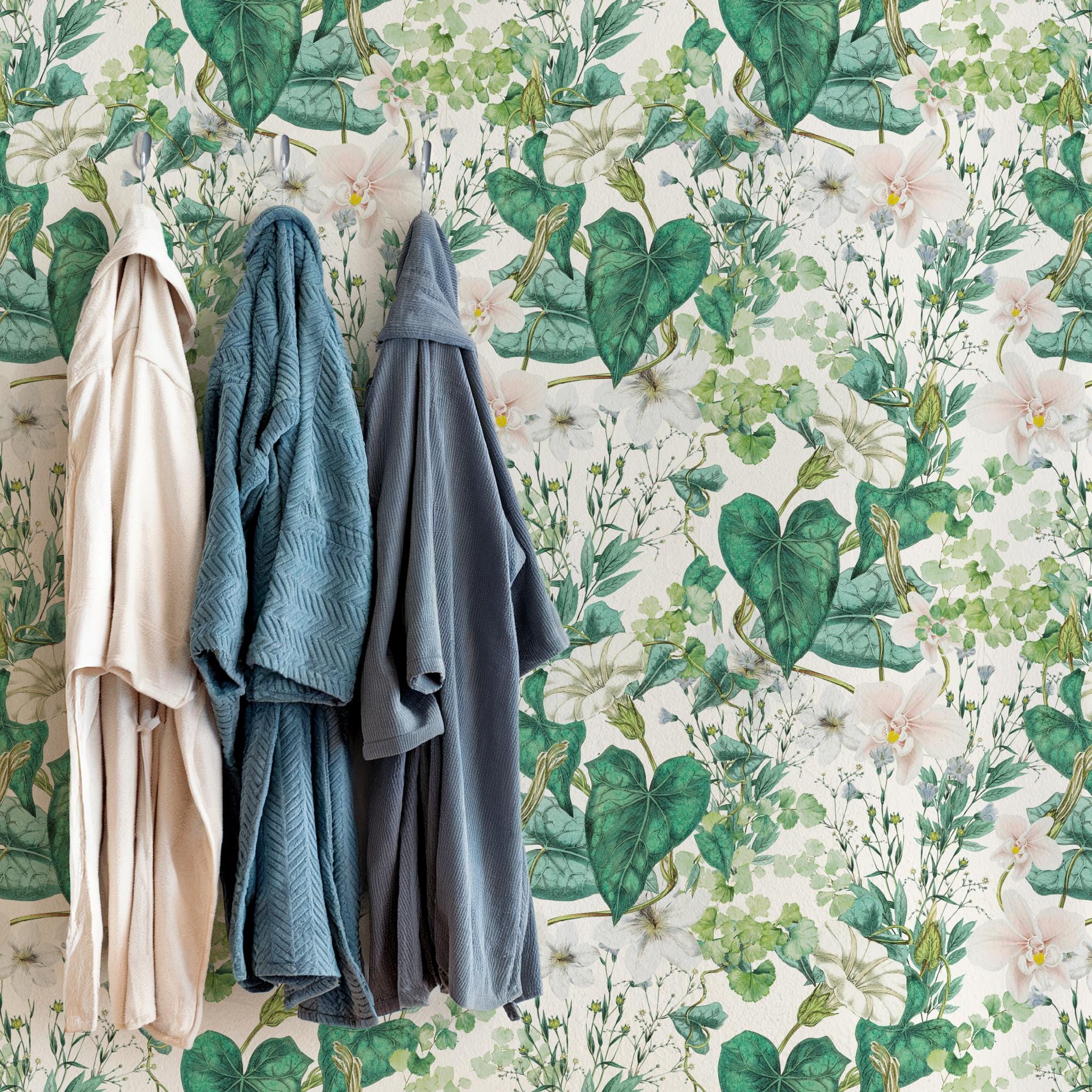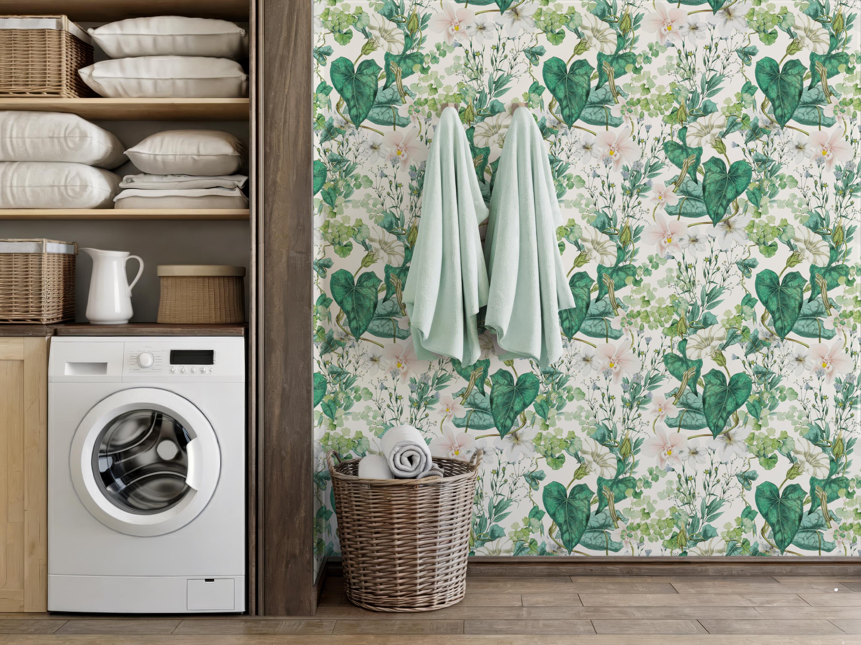 Bring the beauty of nature indoors with our botanical green floral wallpaper, featuring lush watercolor leaves, delicate white and blush pink flowers, and subtle greenery that adds a fresh, relaxing ambiance to any room.