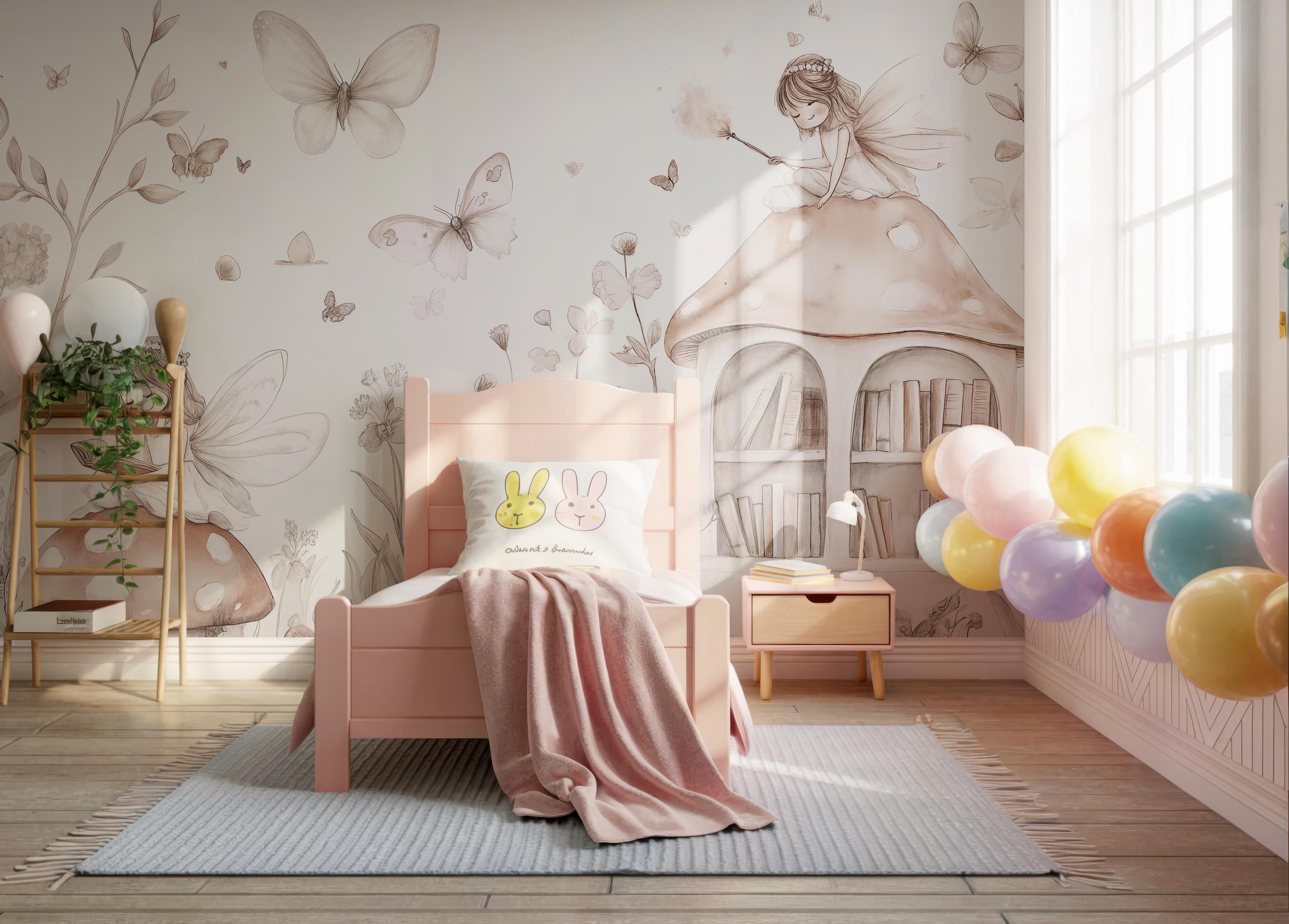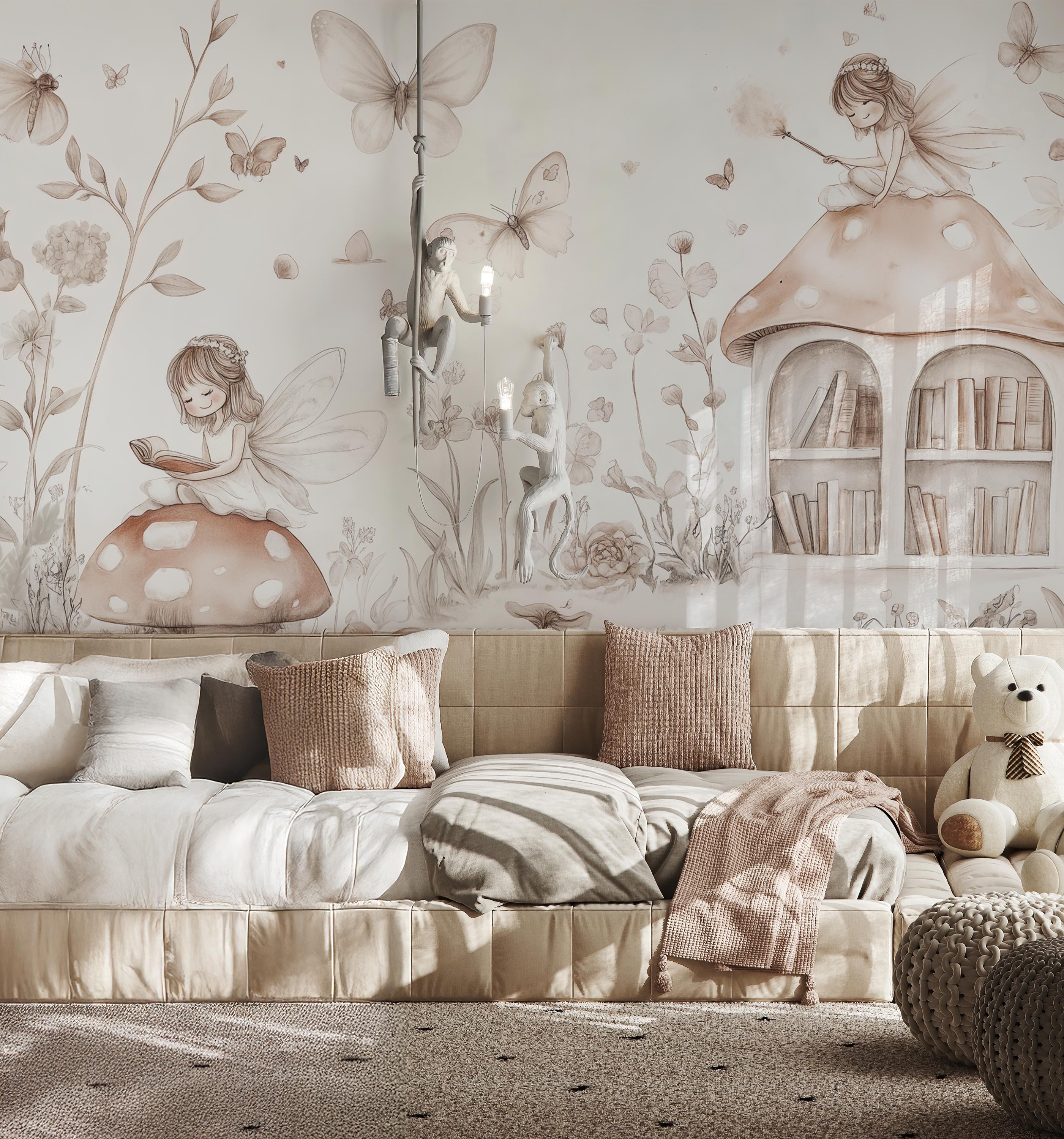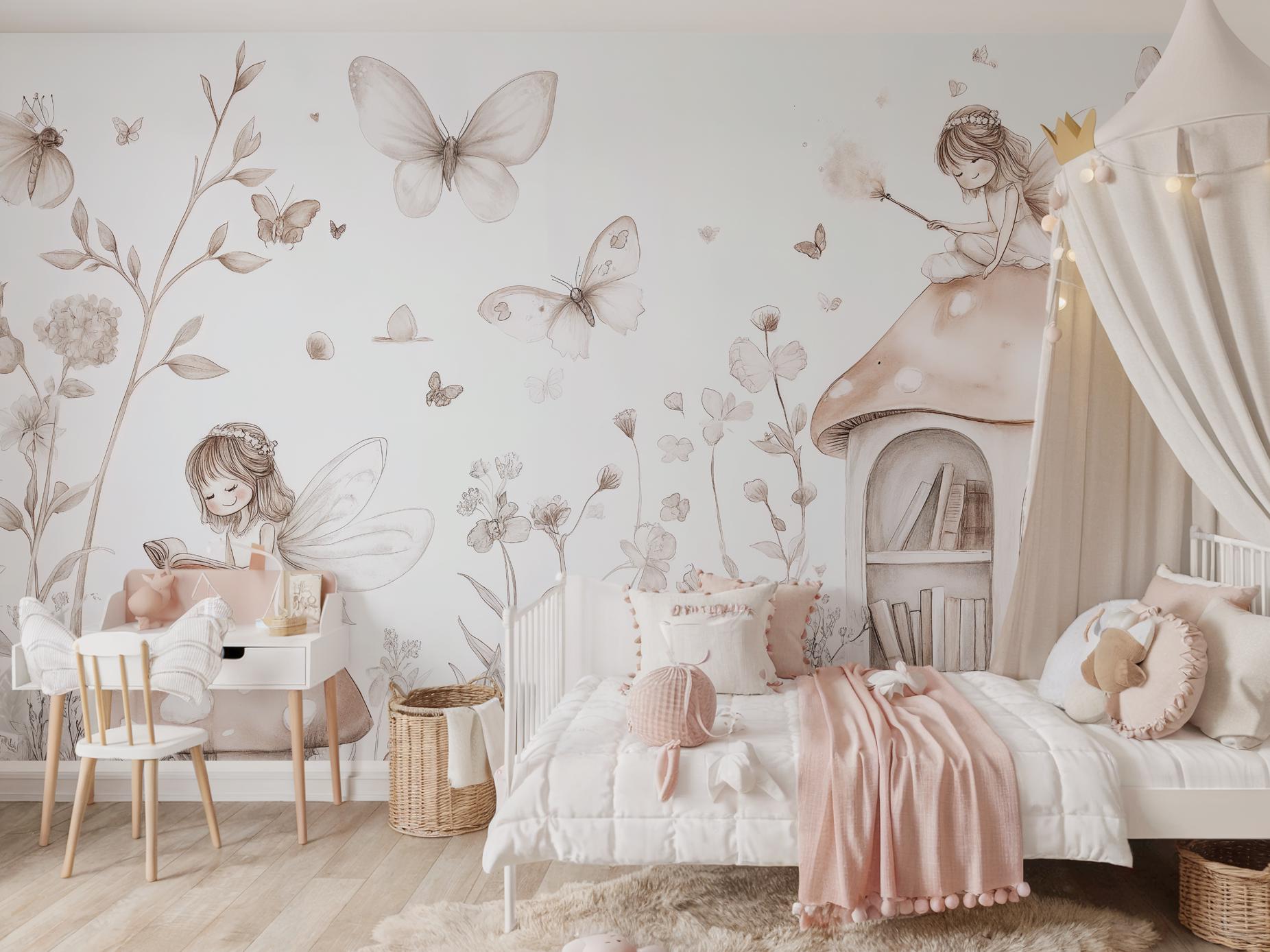 Create a whimsical, storybook atmosphere in your little girl's nursery or bedroom with this enchanting fairy-themed wallpaper. Designed in neutral tones, this mural features adorable fairies, butterflies, mushrooms, and nature elements that inspire imagination and calmness. Perfect for parents seeking a soft, magical aesthetic for a child’s space. Available in peel and stick or traditional application styles for your convenience.