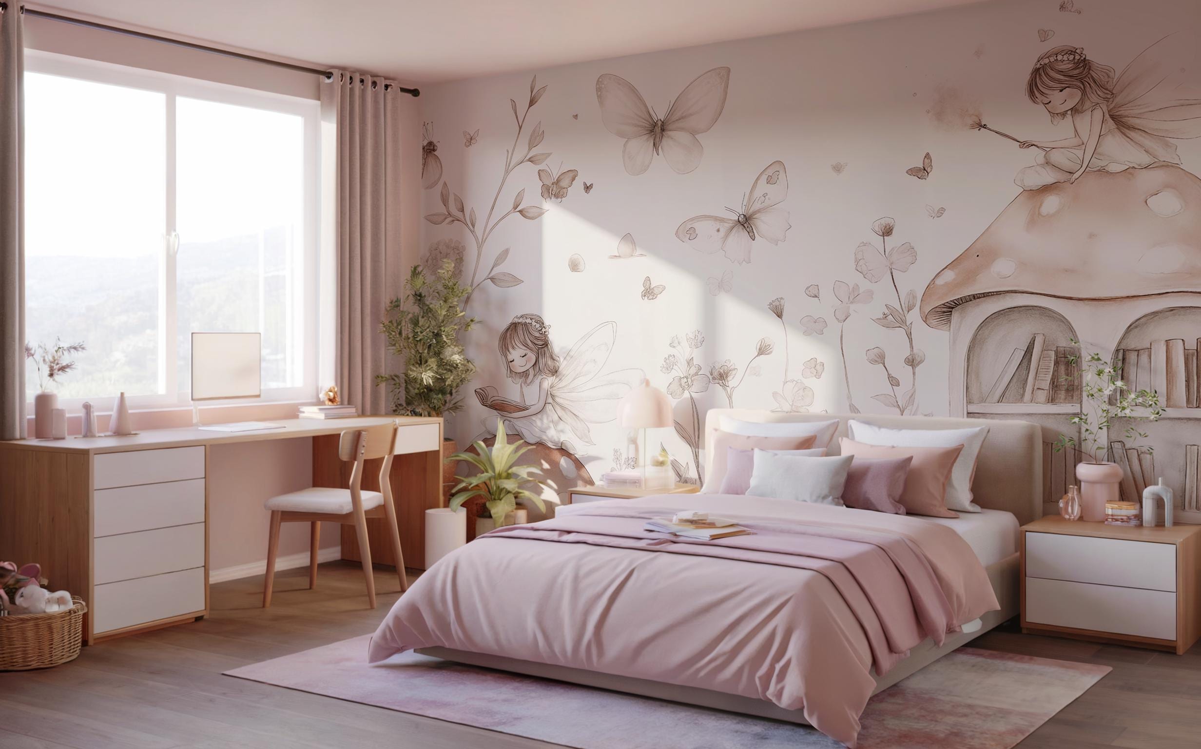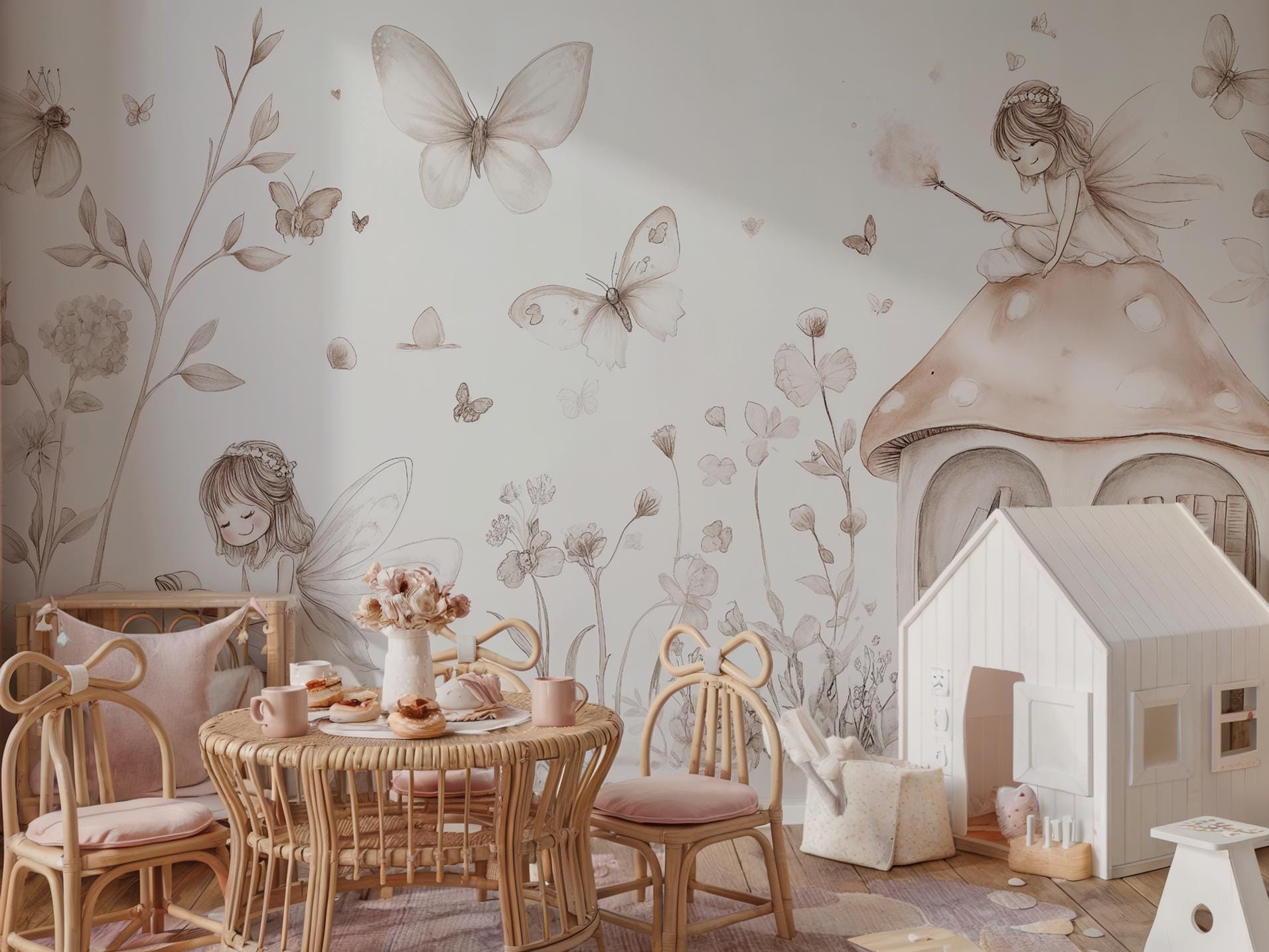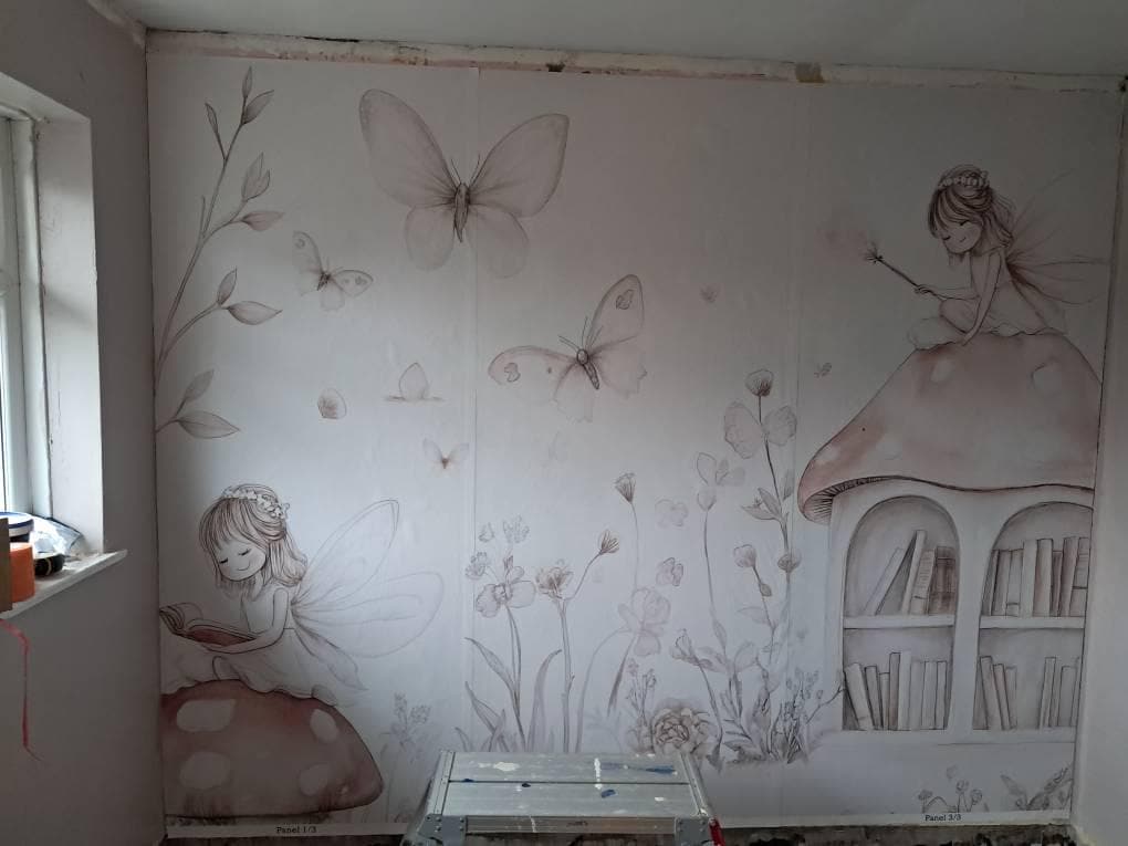 Create a whimsical, storybook atmosphere in your little girl's nursery or bedroom with this enchanting fairy-themed wallpaper. Designed in neutral tones, this mural features adorable fairies, butterflies, mushrooms, and nature elements that inspire imagination and calmness. Perfect for parents seeking a soft, magical aesthetic for a child’s space. Available in peel and stick or traditional application styles for your convenience.