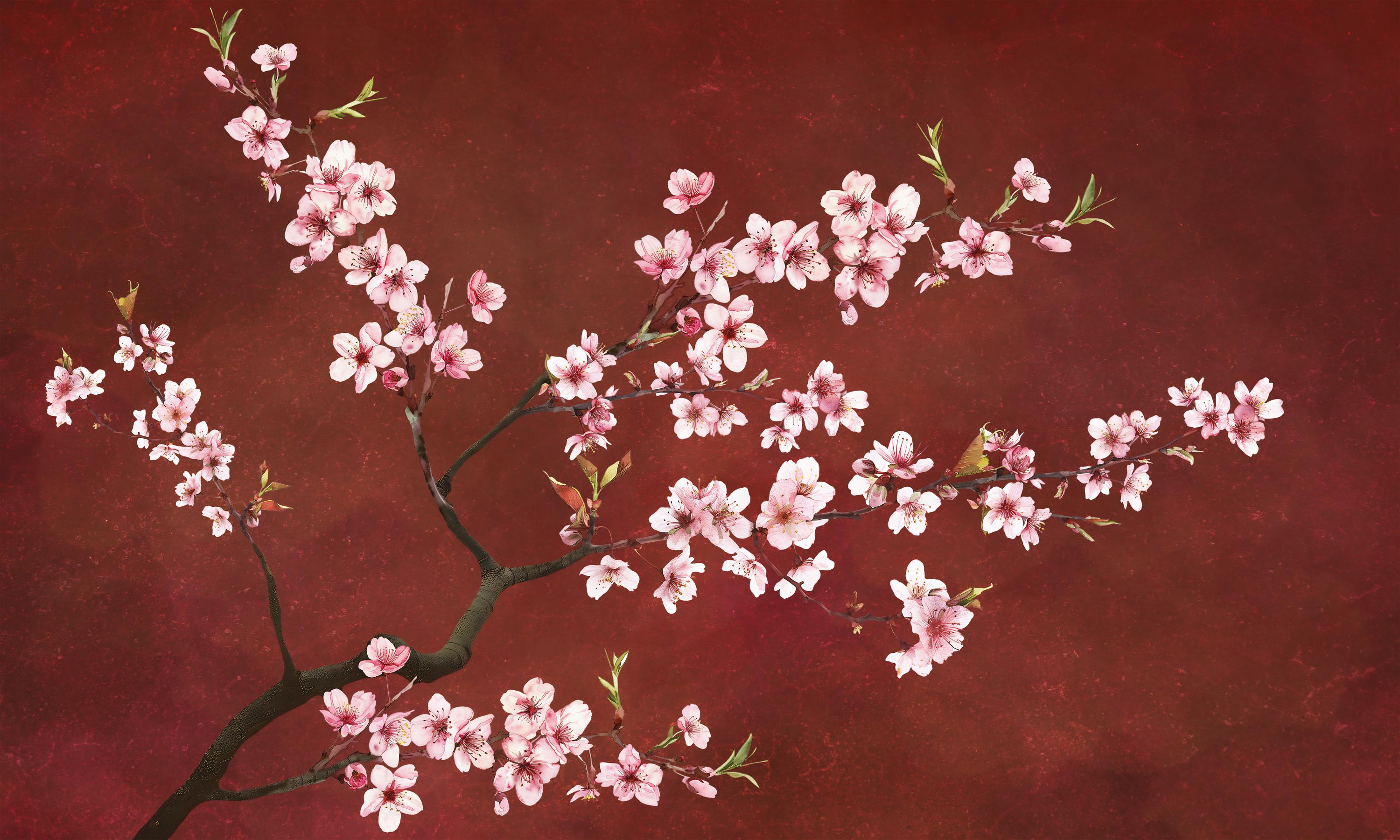 Red Cherry Blossom Wall Mural: Japanese Sakura Floral Wallpaper (Peel and Stick or Traditional )
