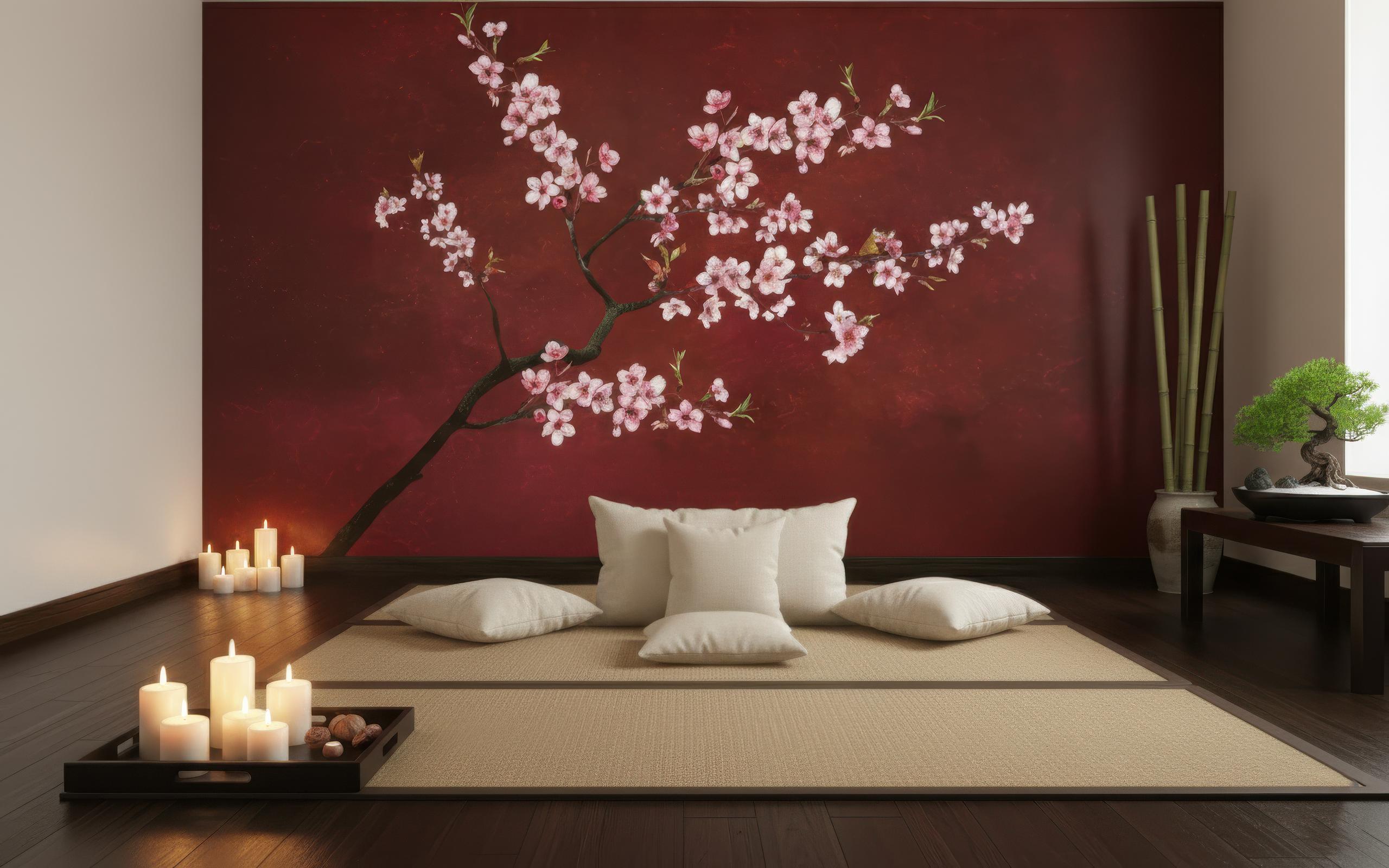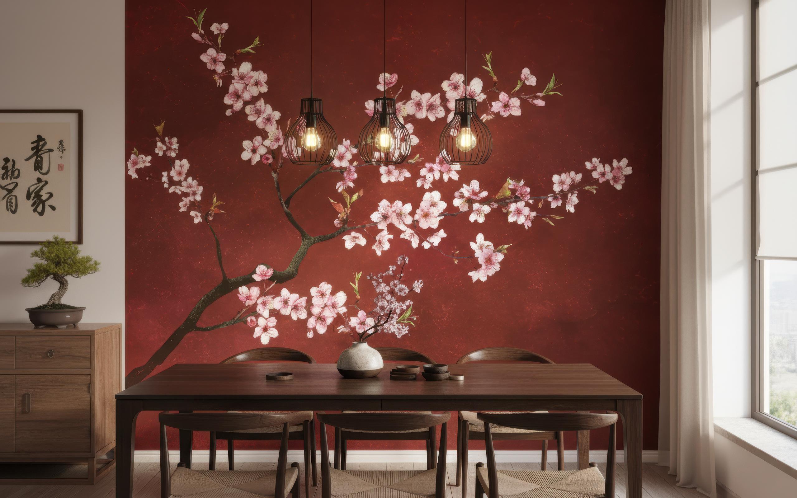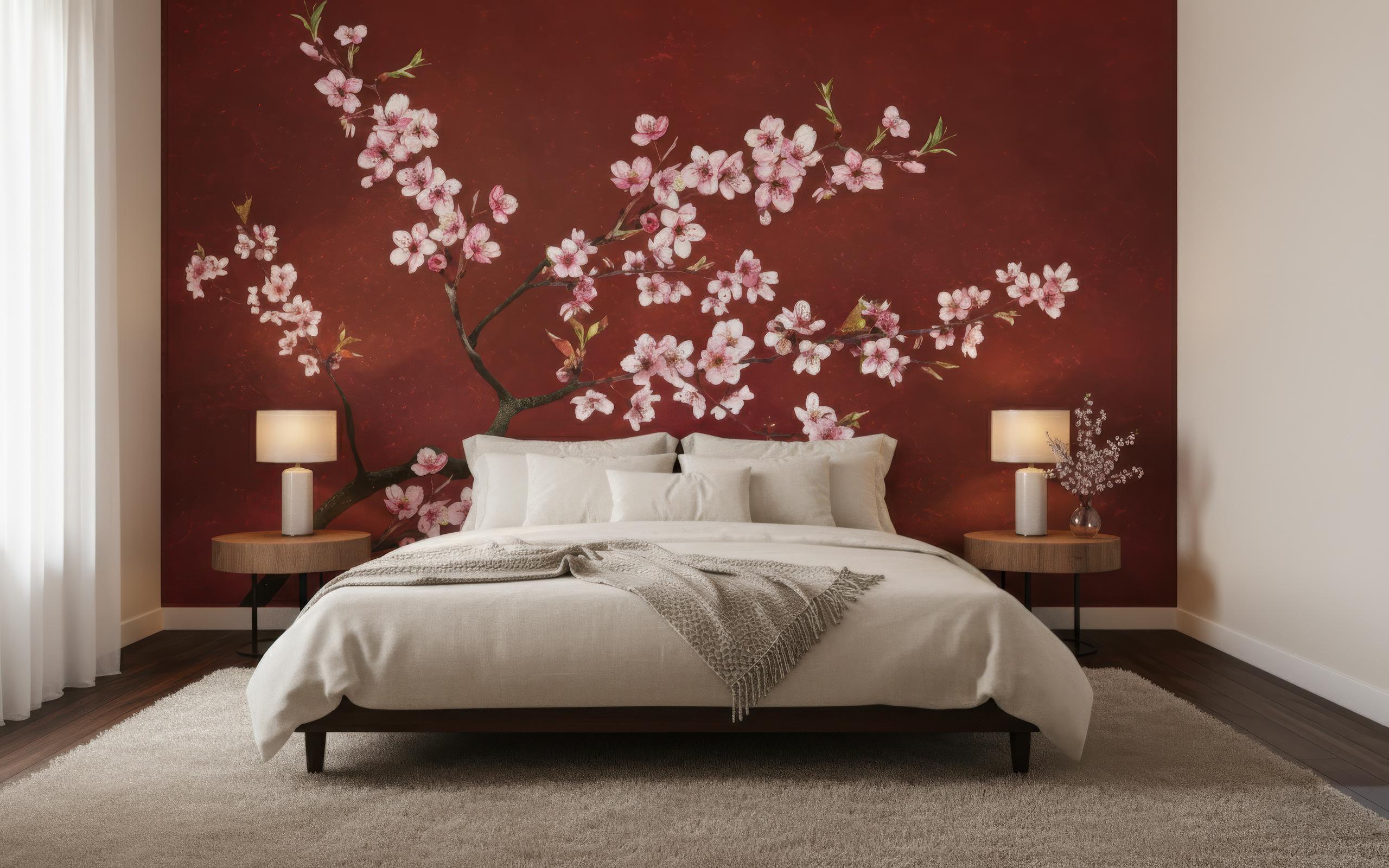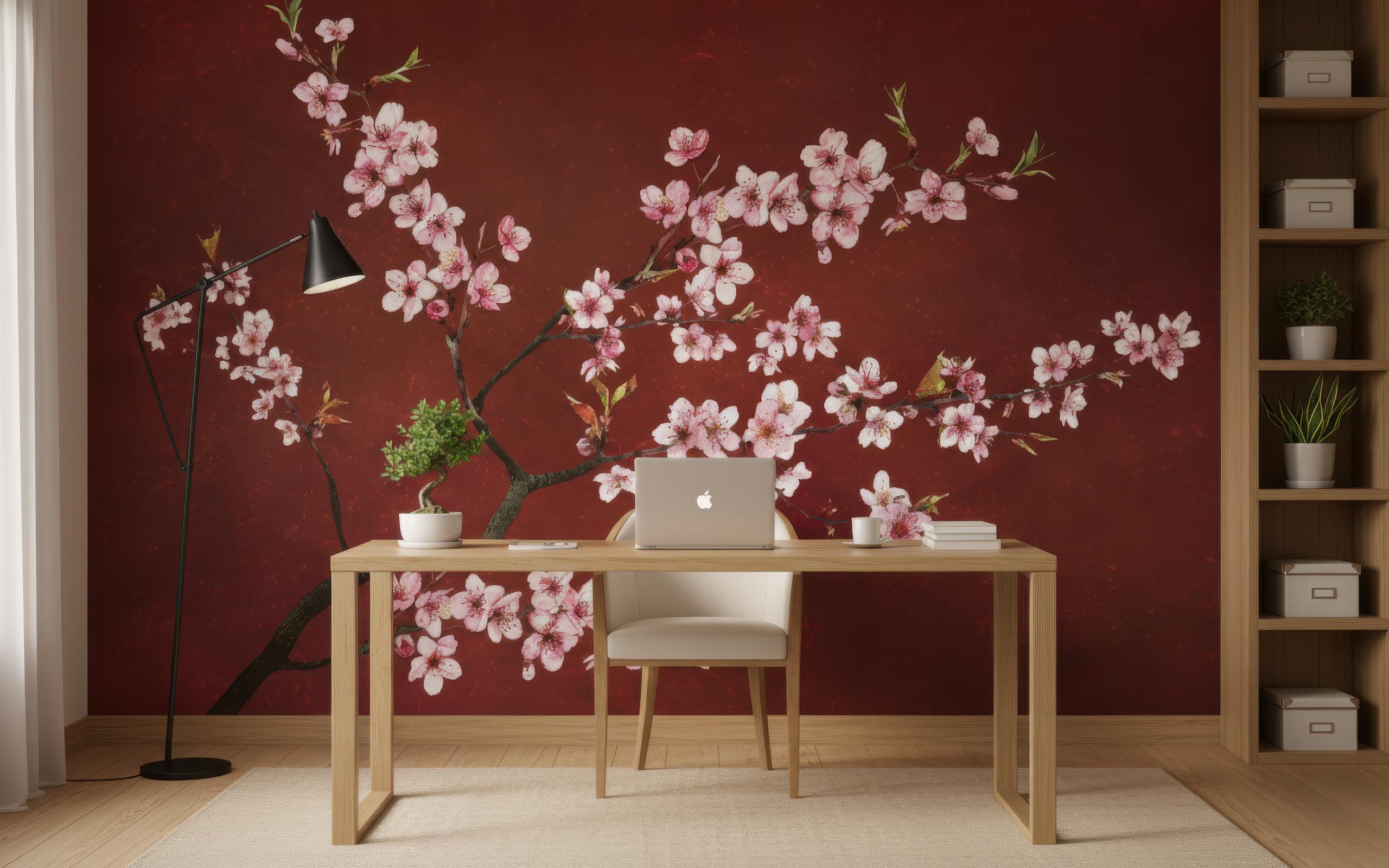 Transform any space into a serene sanctuary with this elegant Japanese cherry blossom wall mural. Featuring delicate pink sakura flowers on a rich red background, this mural brings an instant sense of calm and sophistication to your décor 🌸✨ Perfect for living rooms, bedrooms, offices, meditation areas, or entryways, this mural blends art and nature in stunning harmony.