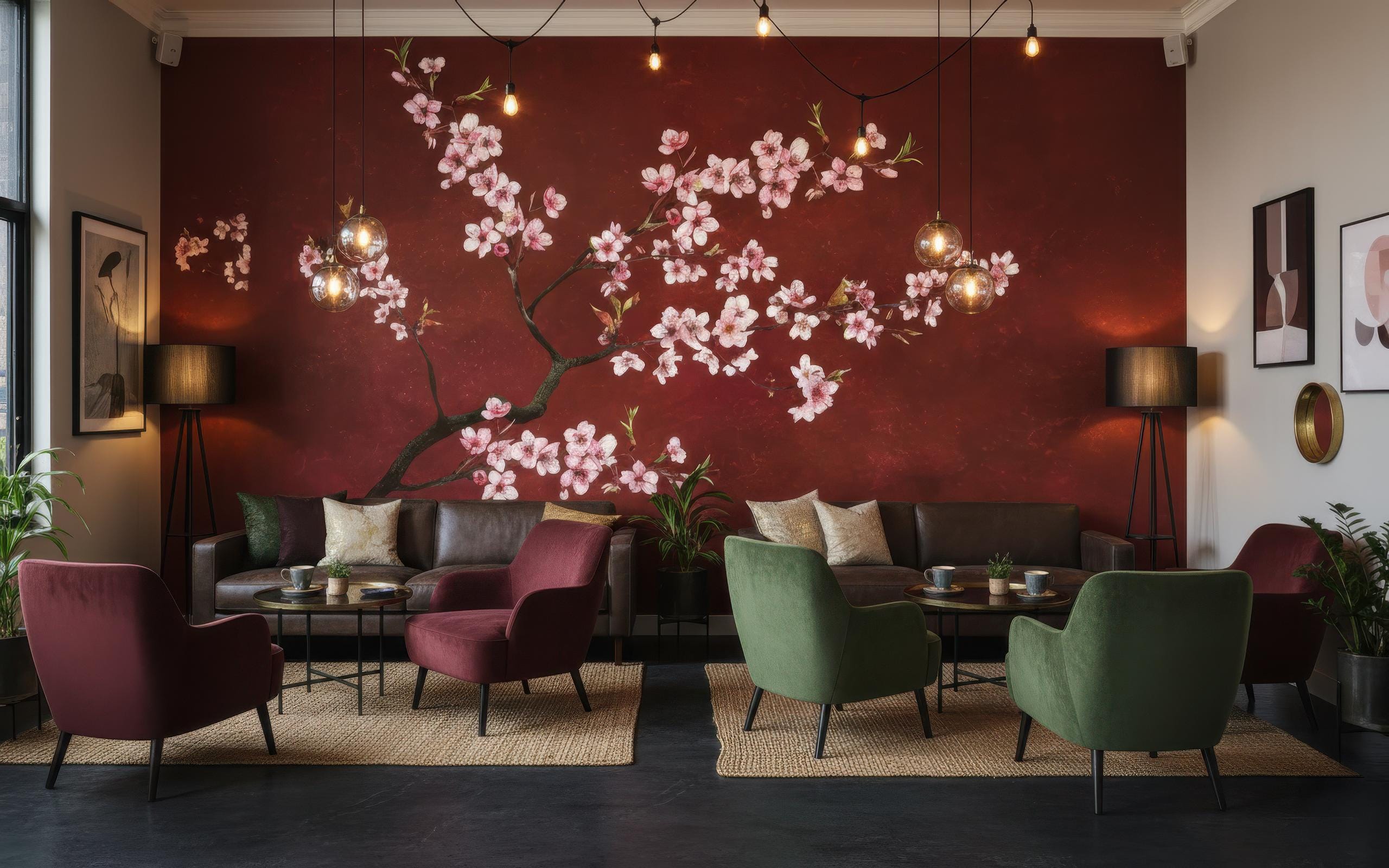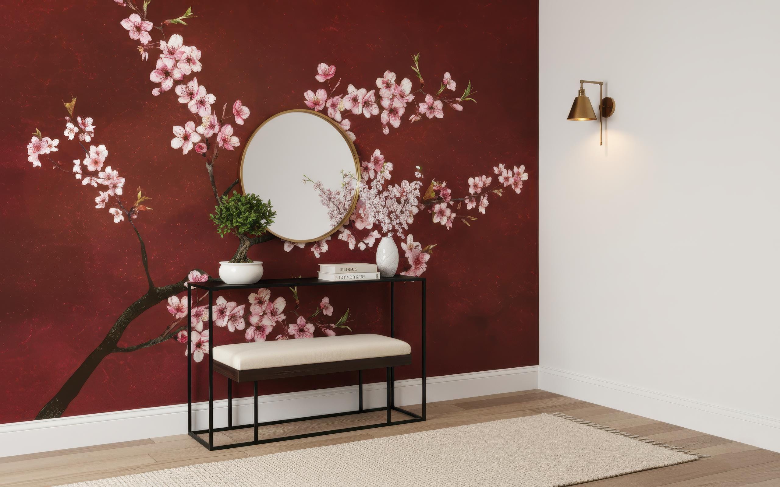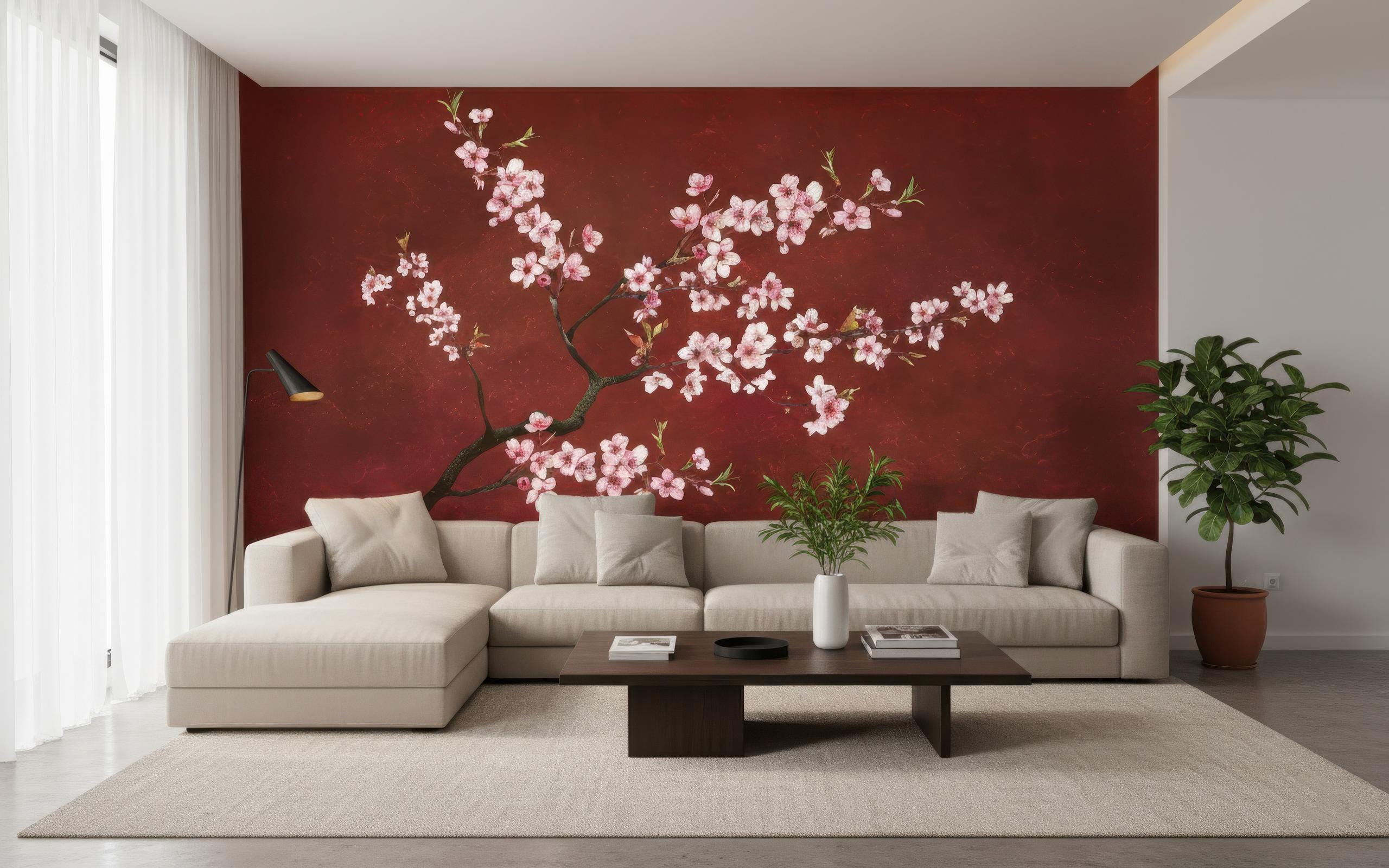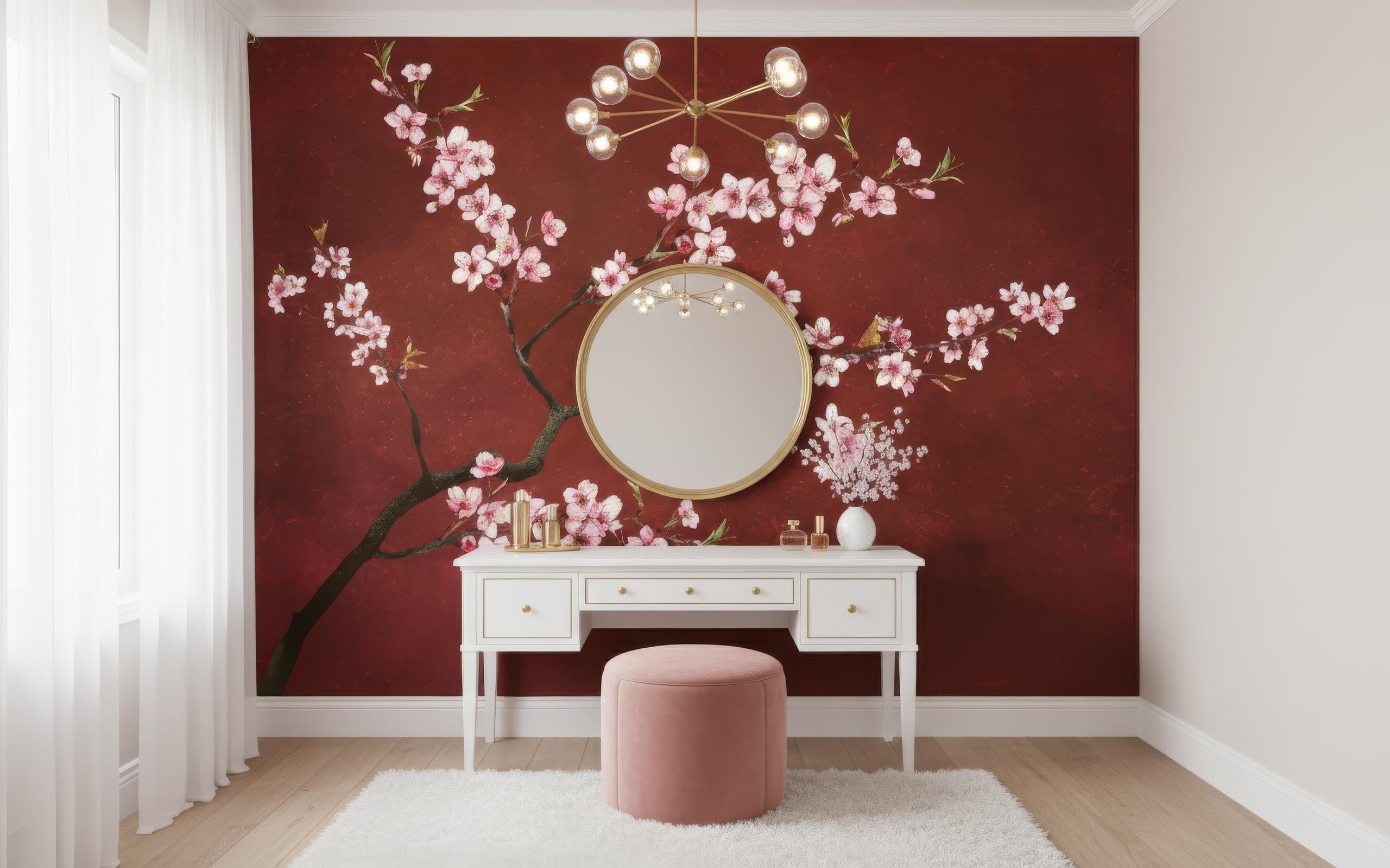Transform any space into a serene sanctuary with this elegant Japanese cherry blossom wall mural. Featuring delicate pink sakura flowers on a rich red background, this mural brings an instant sense of calm and sophistication to your décor 🌸✨ Perfect for living rooms, bedrooms, offices, meditation areas, or entryways, this mural blends art and nature in stunning harmony.