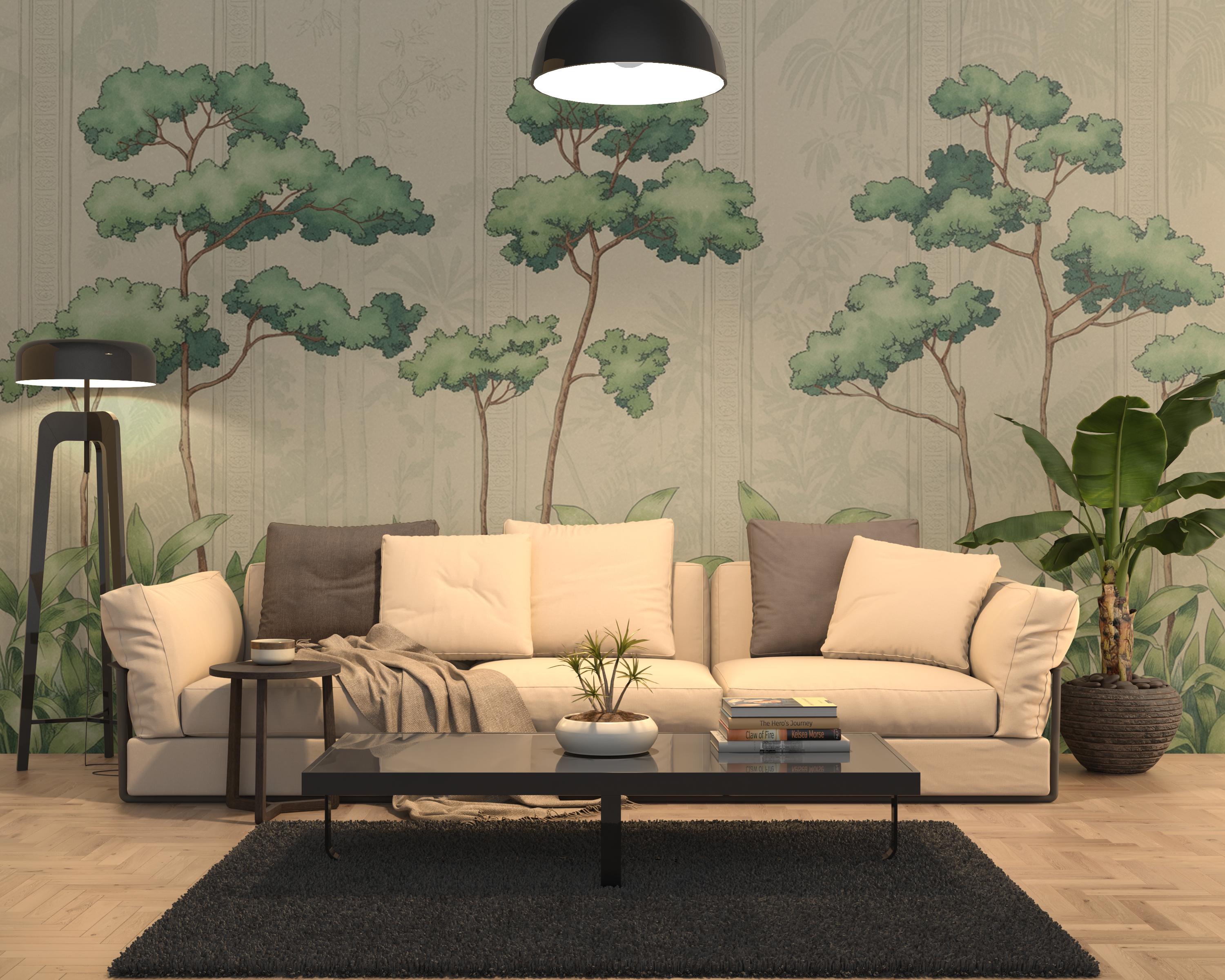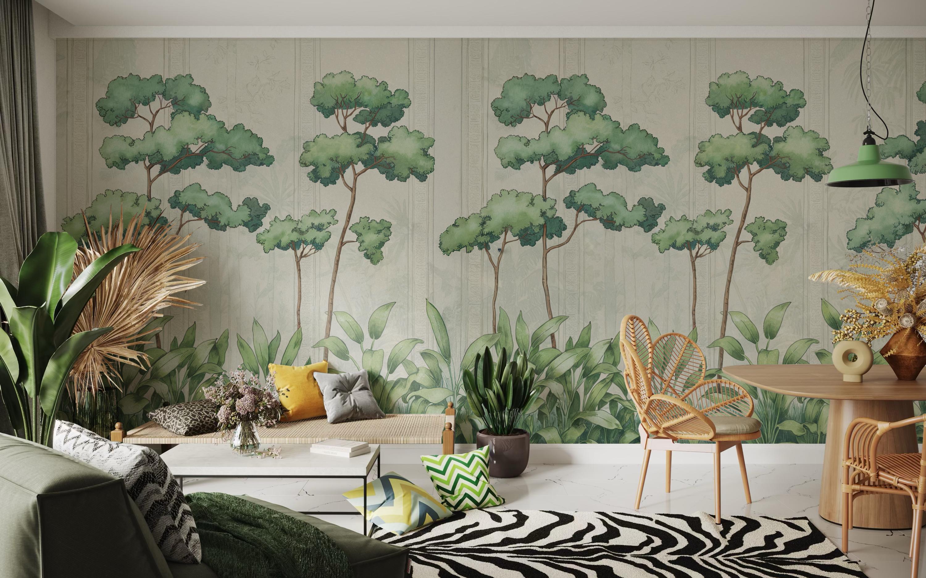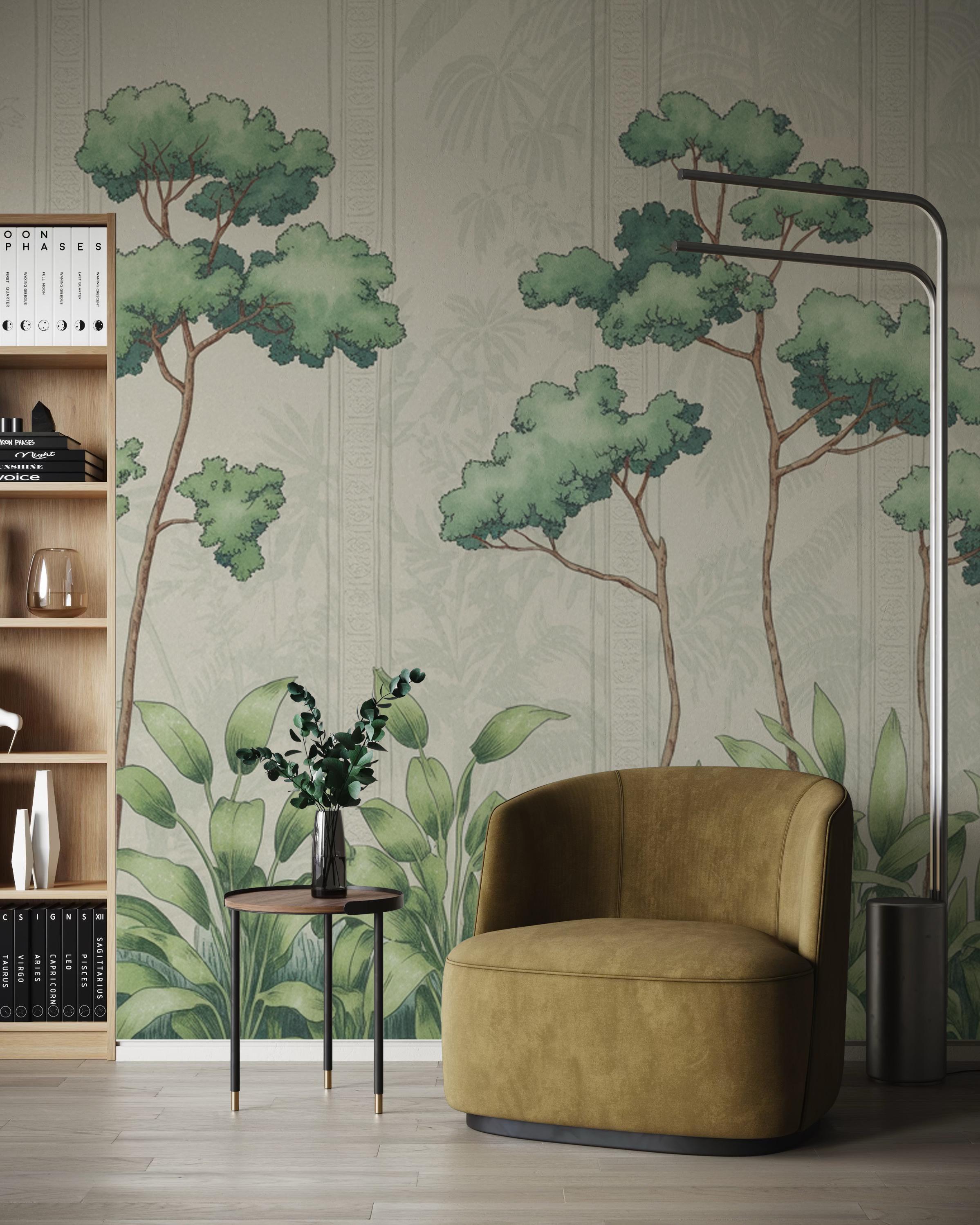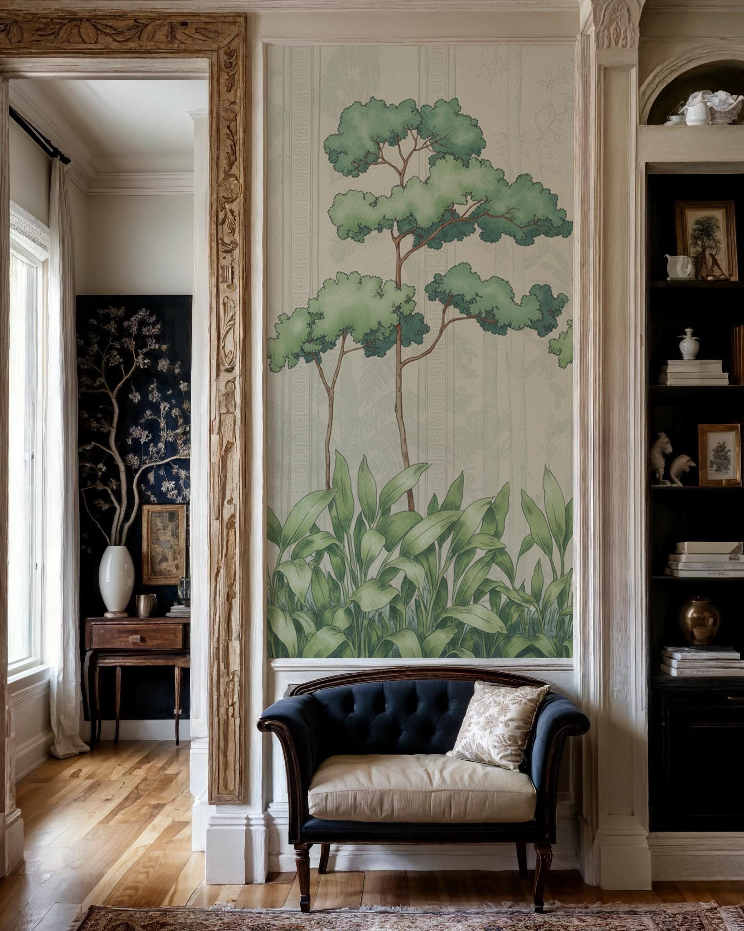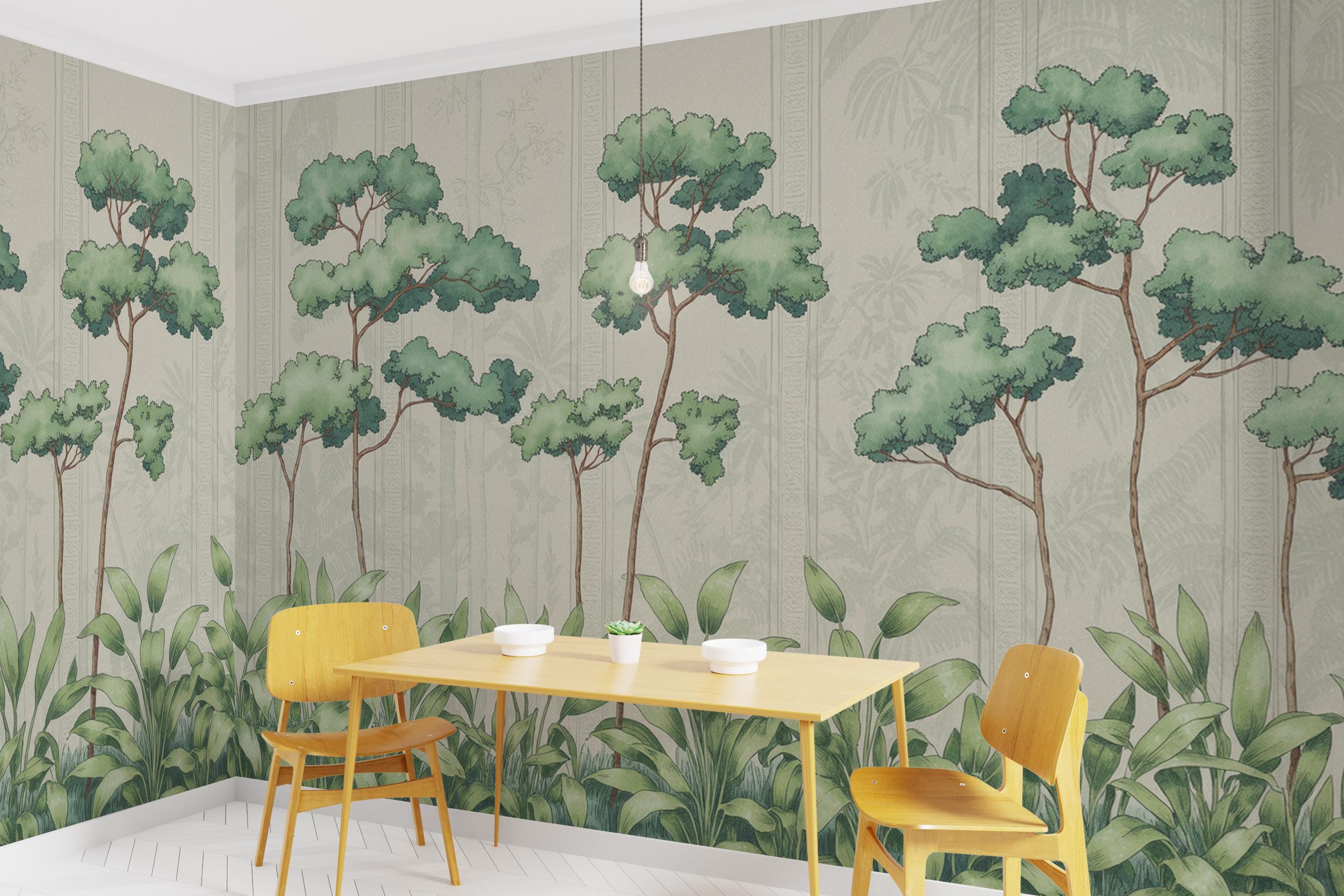 Vintage Botanical Forest Landscape Mural Wallpaper Nature Inspired Tree Scene Wall Art for Living Room Bedroom Dining Room Office Rustic Modern Boho Minimalist Interior Decor Custom Size Eco Friendly High Quality Durable Elegant Botanical Forest Design Luxury Nature Wall Covering Timeless Home Decoration