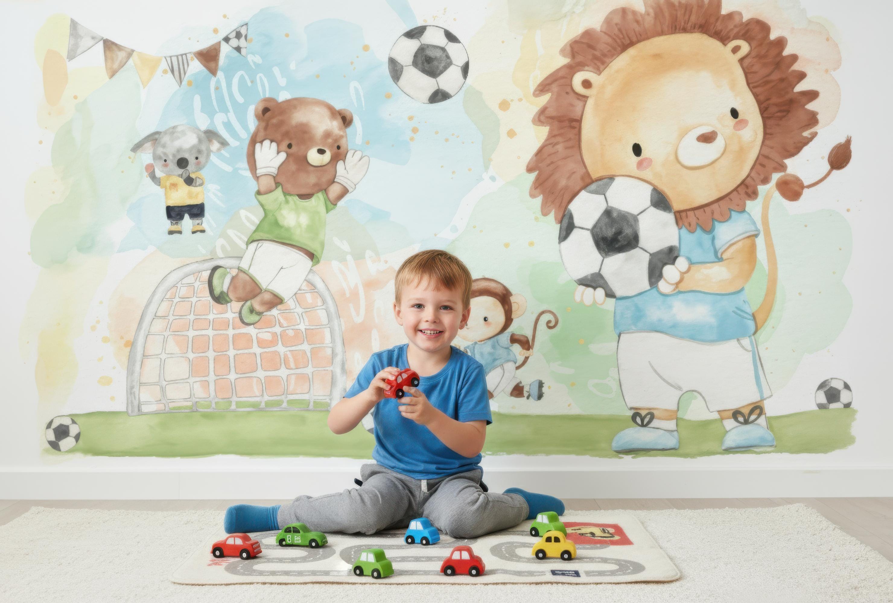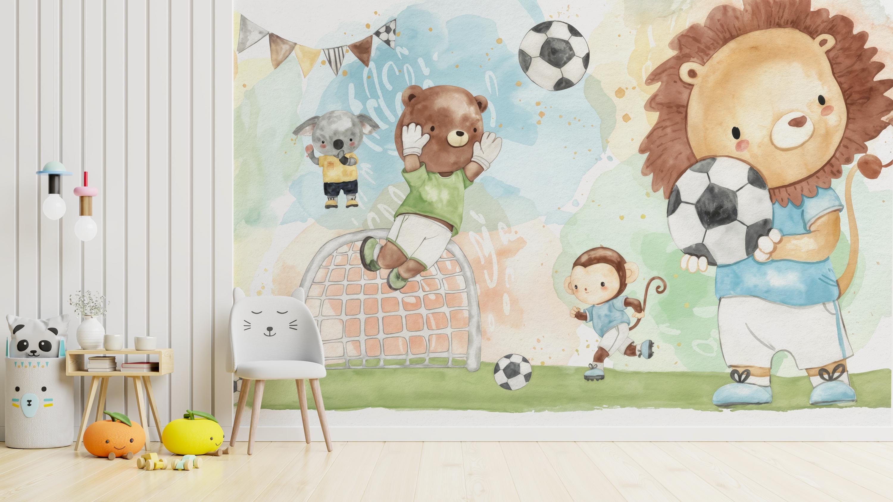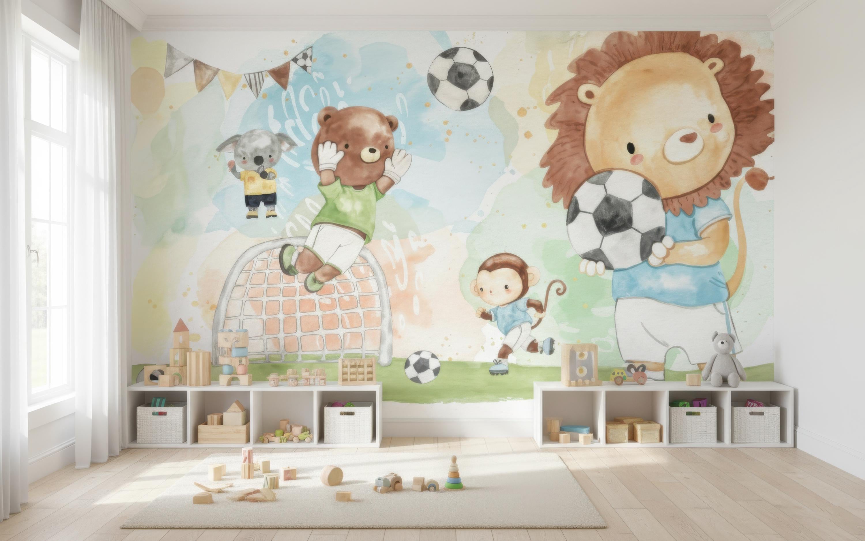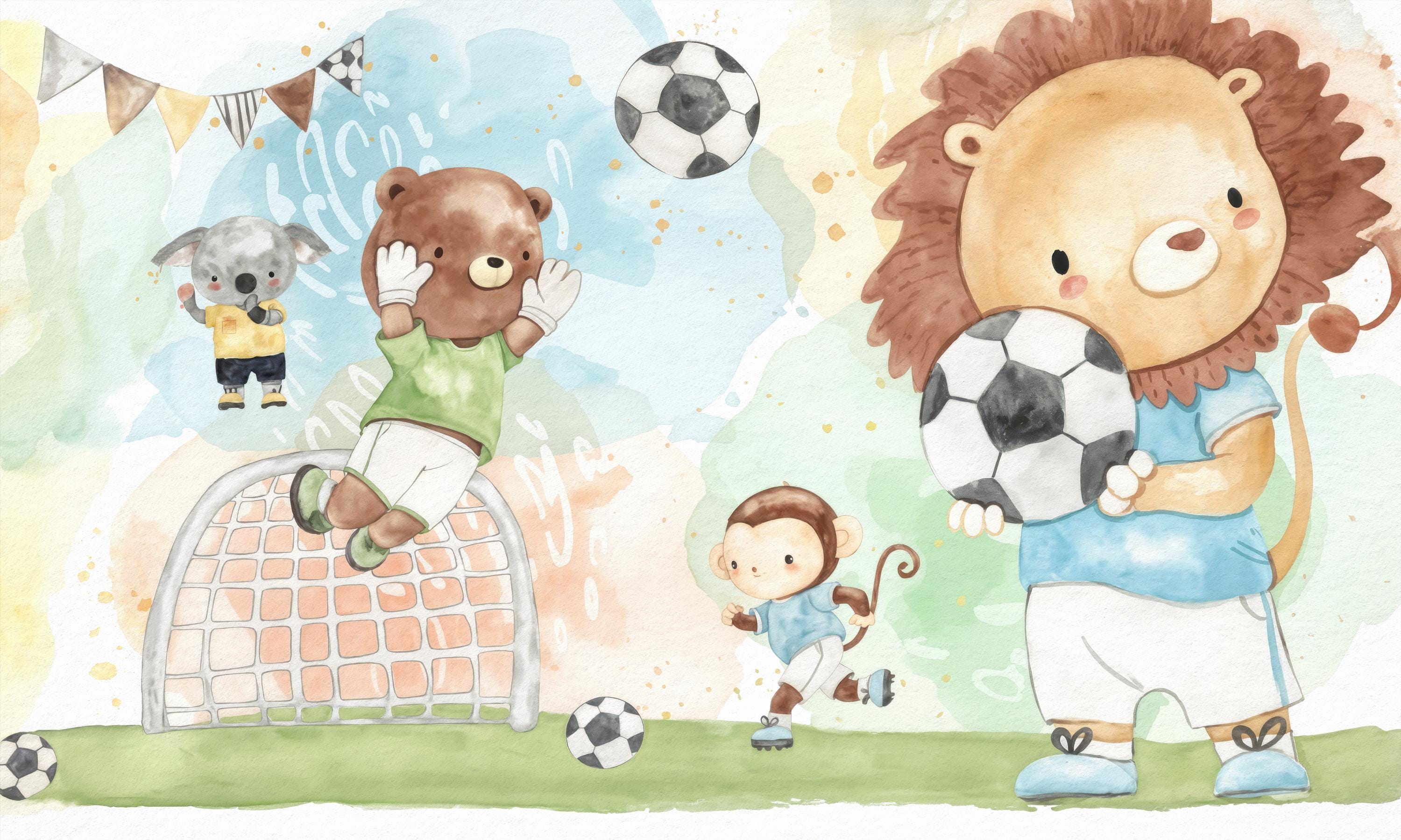Watercolor Soccer Animals Boys Room Wall Mural , Kids Sports Wallpaper