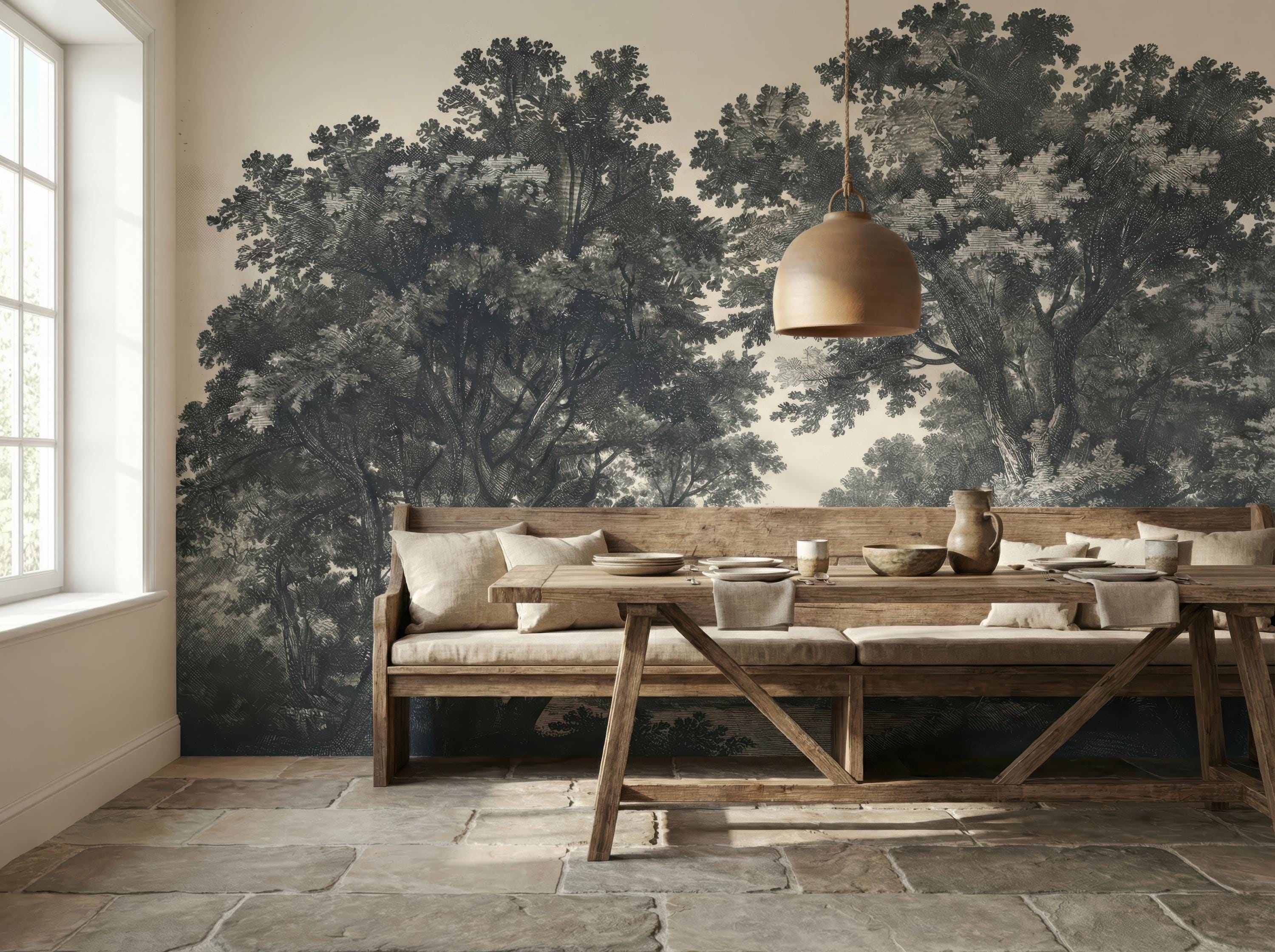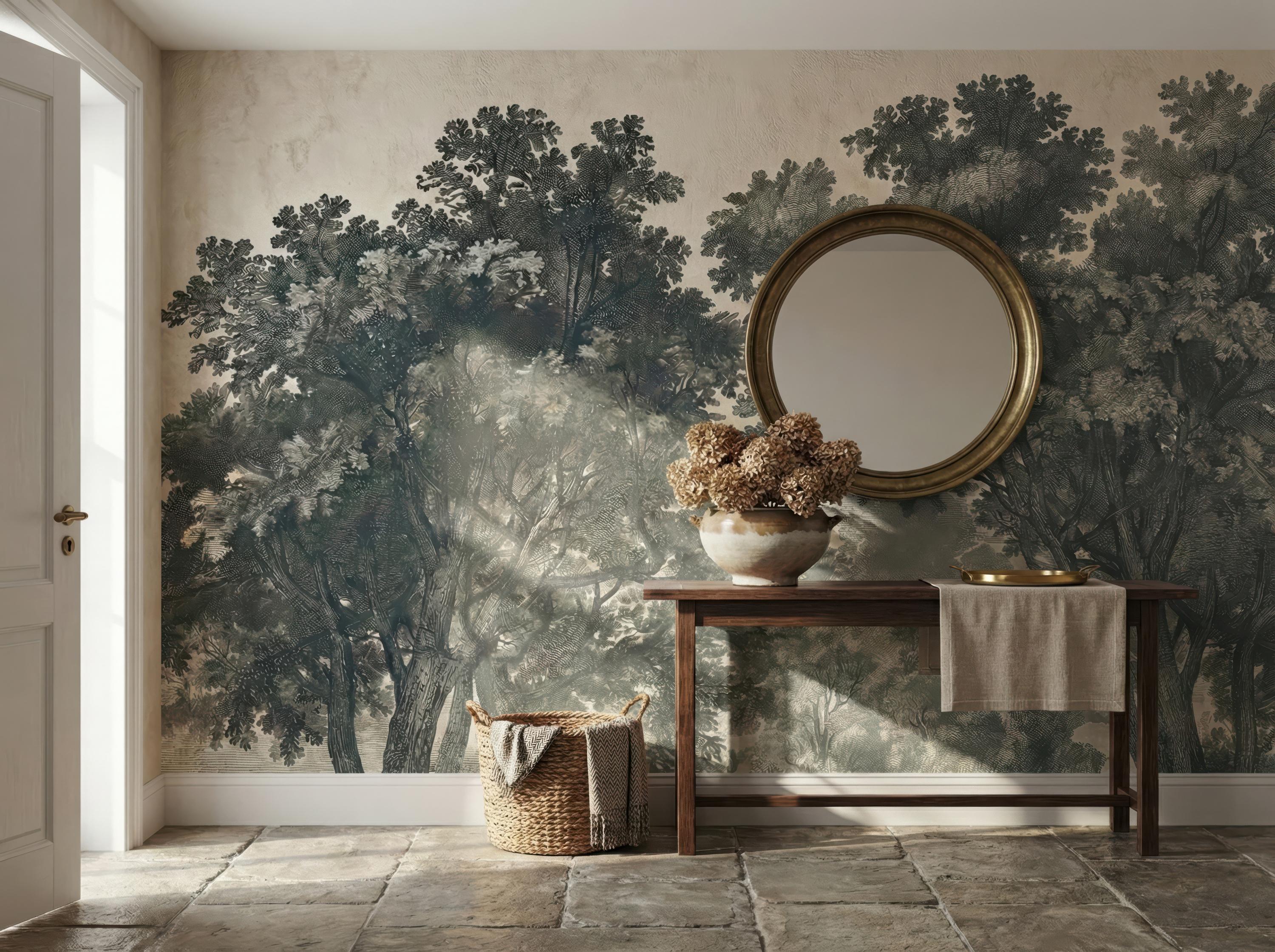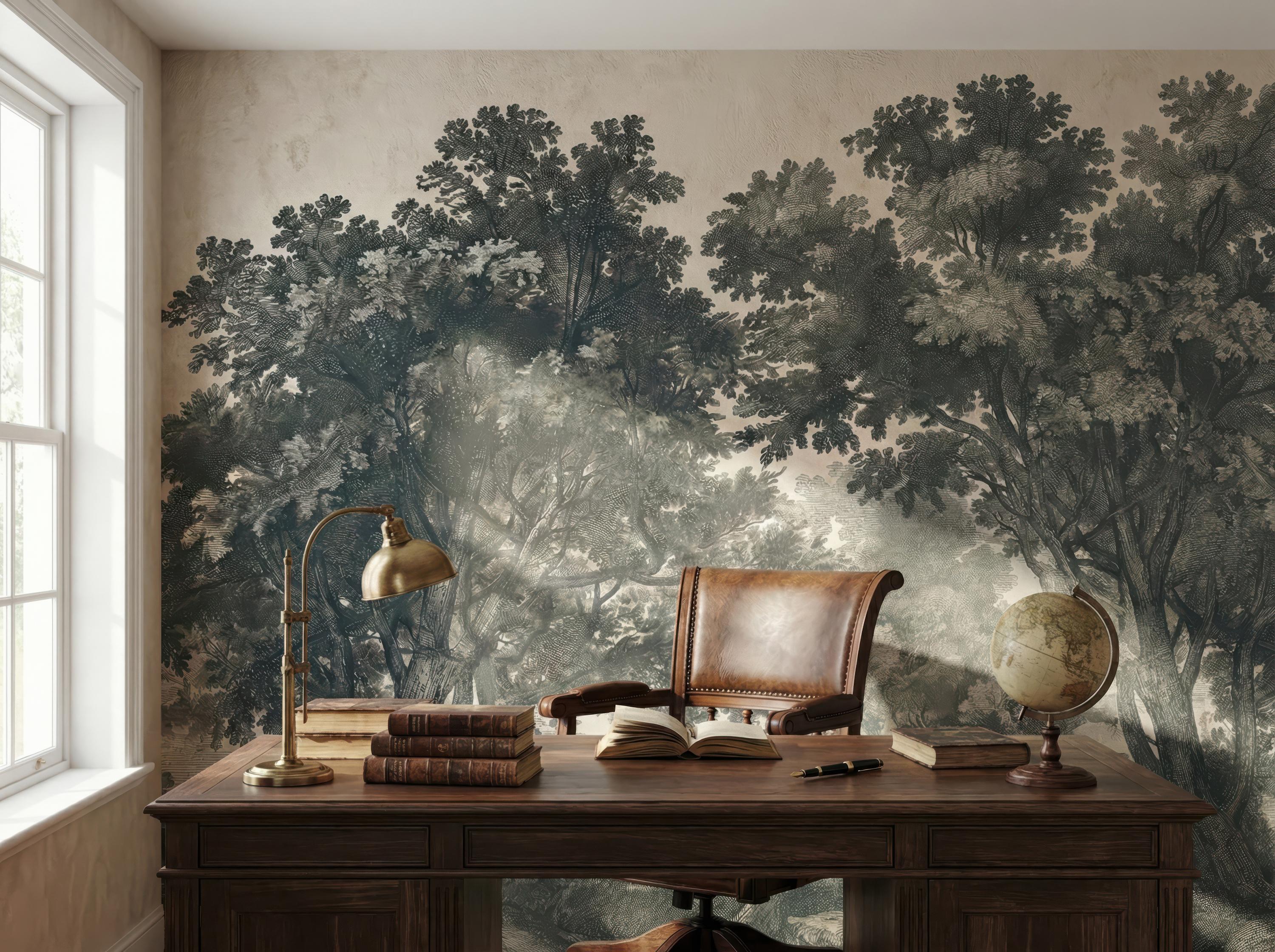 Moody Landscape Wallpaper, Vintage Forest Mural, Peel and Stick Rustic Tree