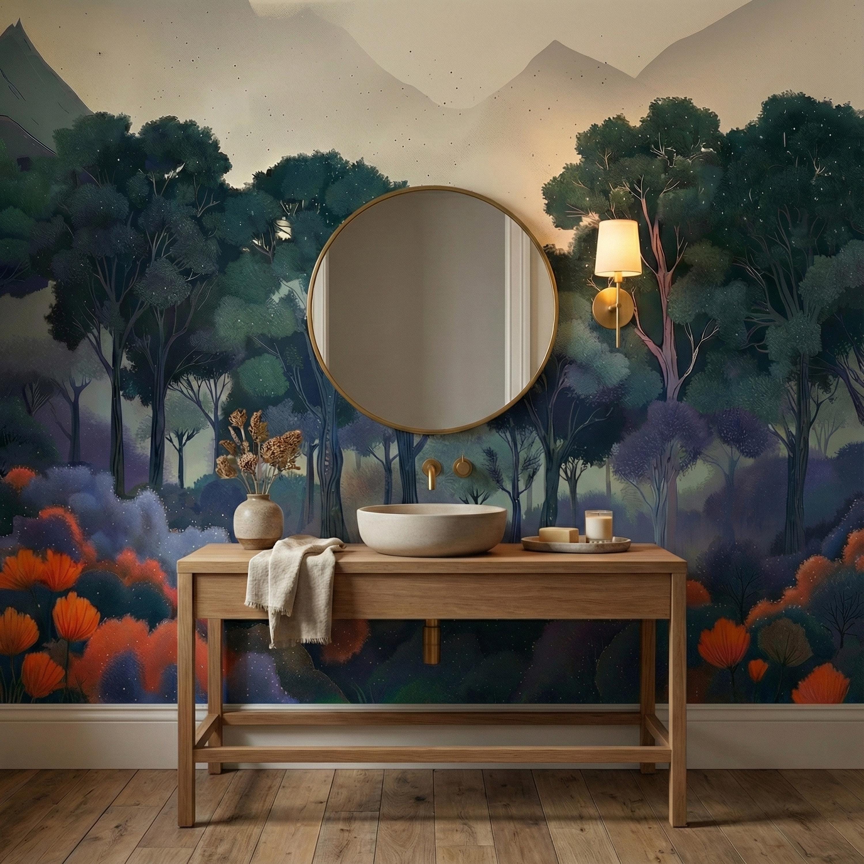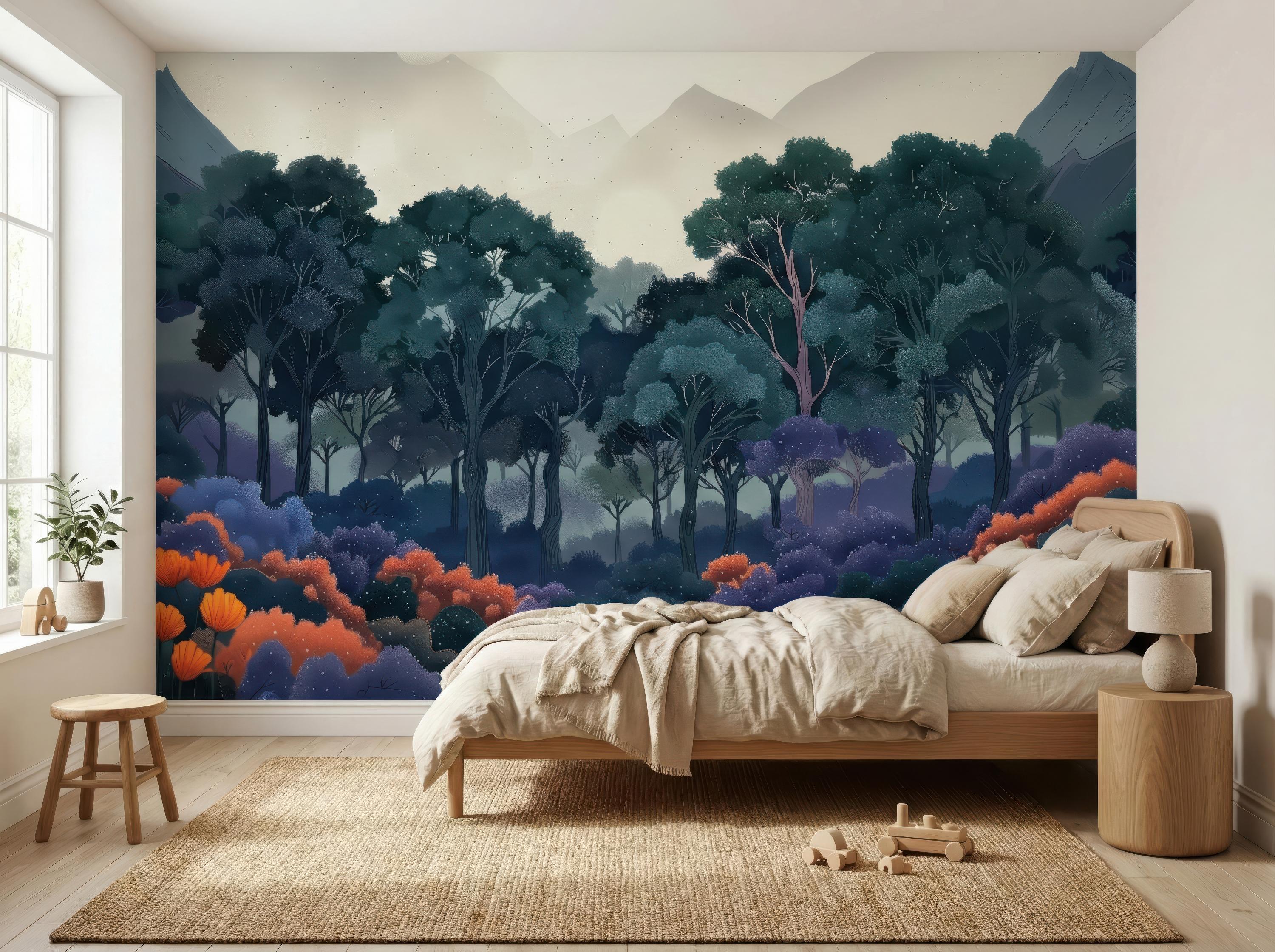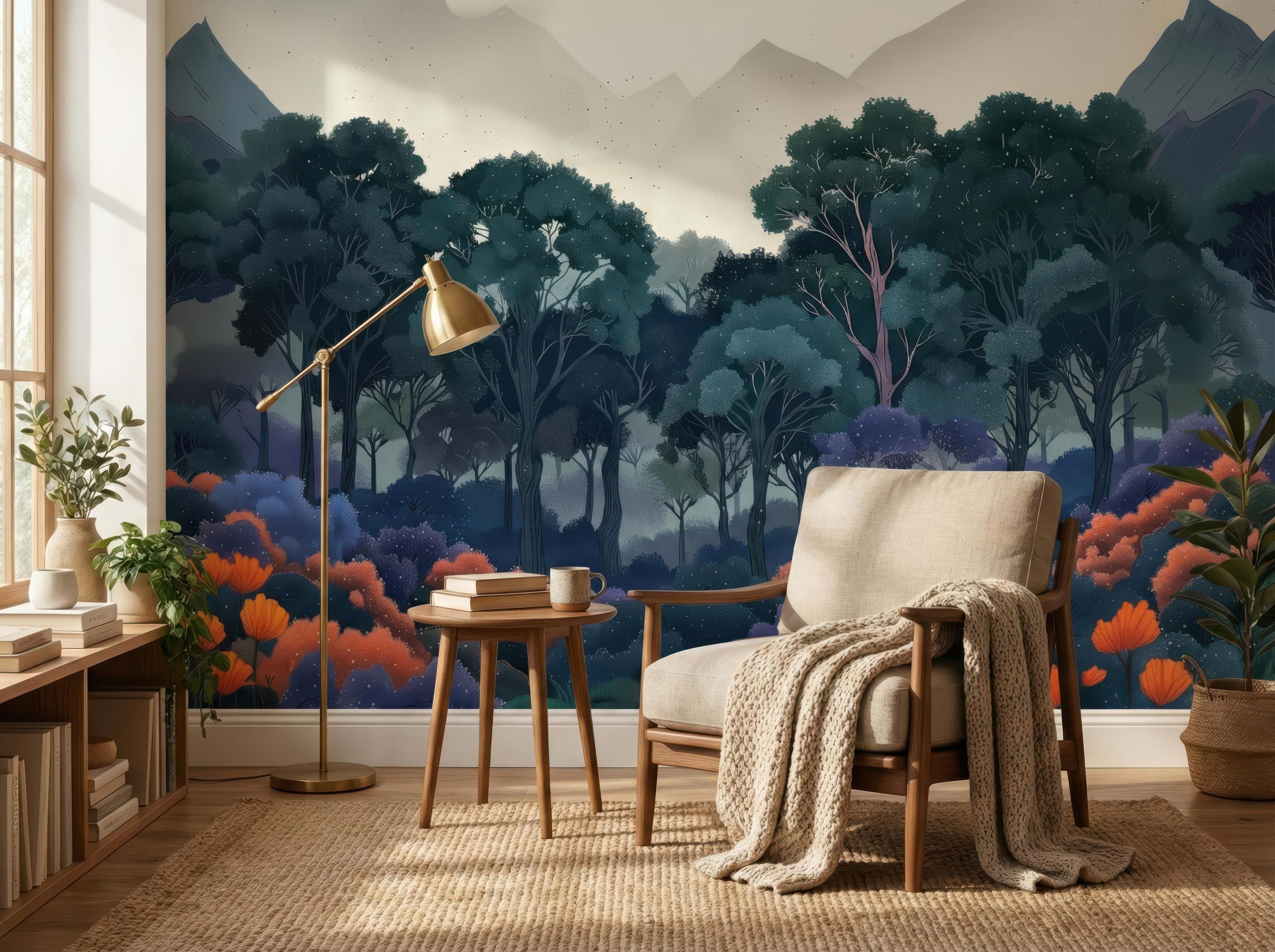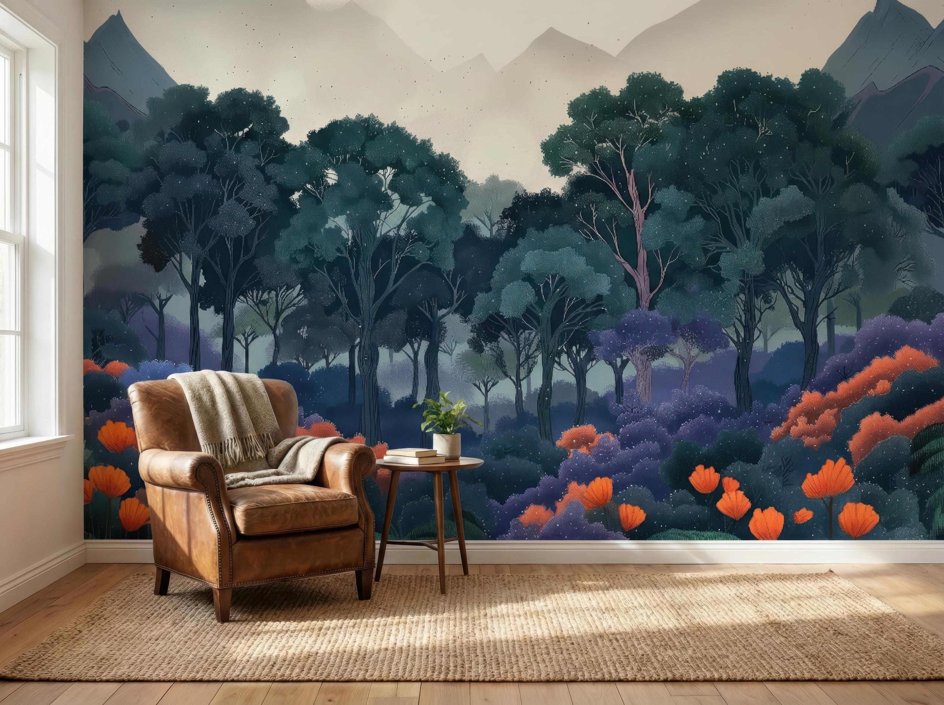 Transform your space into a mystical sanctuary with our 'Midnight Enchanted Forest' mural. Featuring deep emerald greens, misty mountains, and touches of warm rust wildflowers, this design brings the calm of nature right into your home.