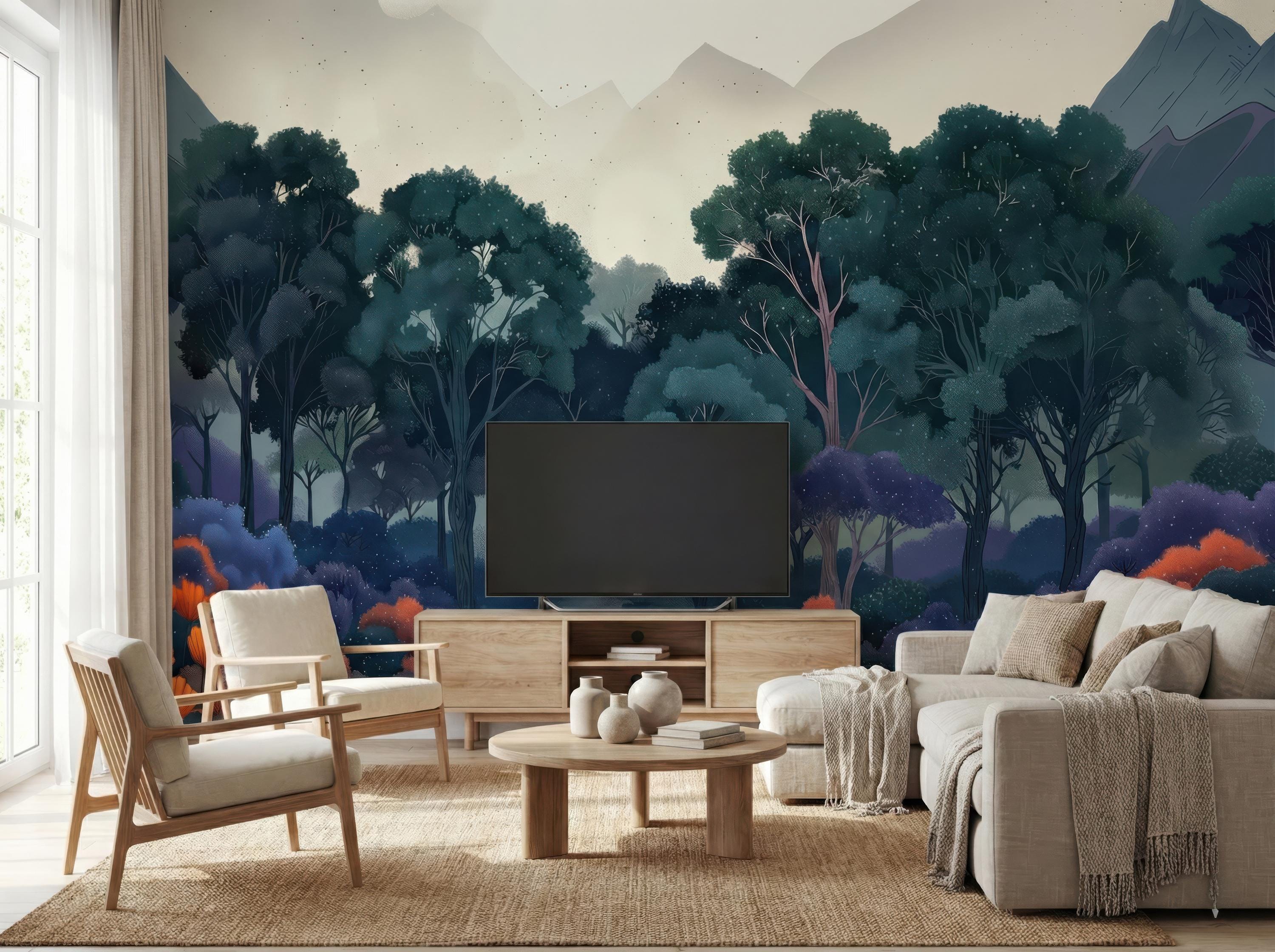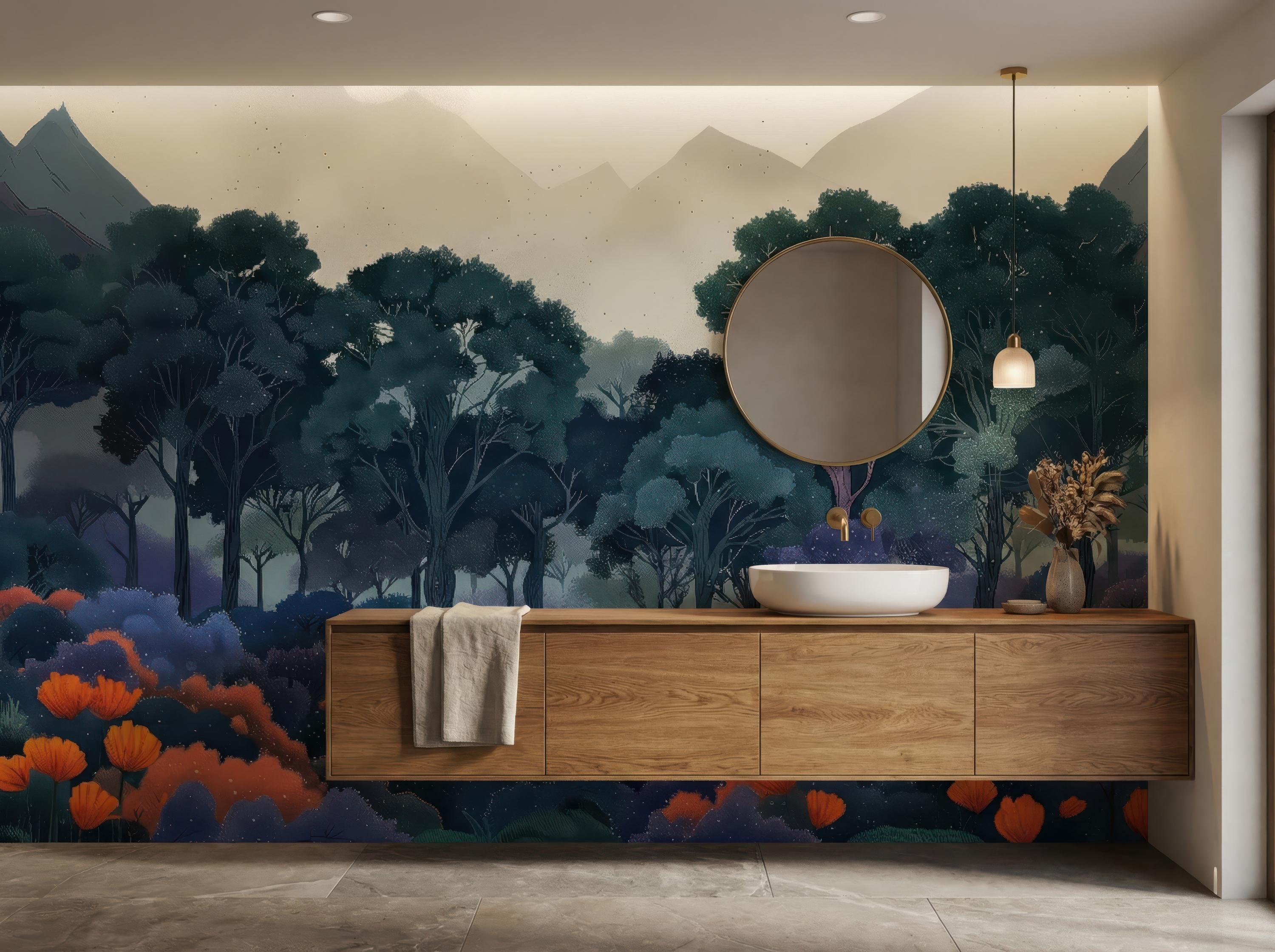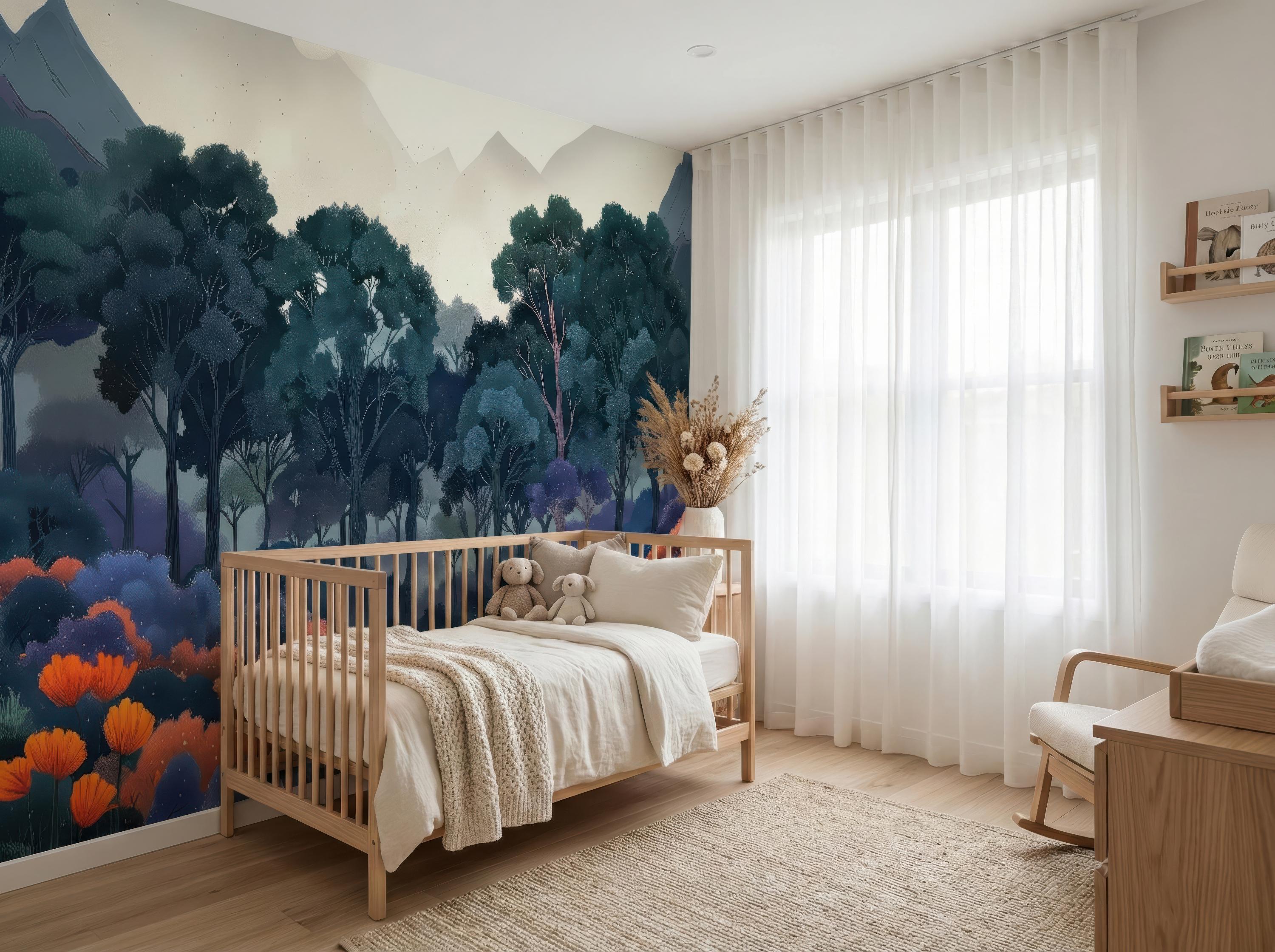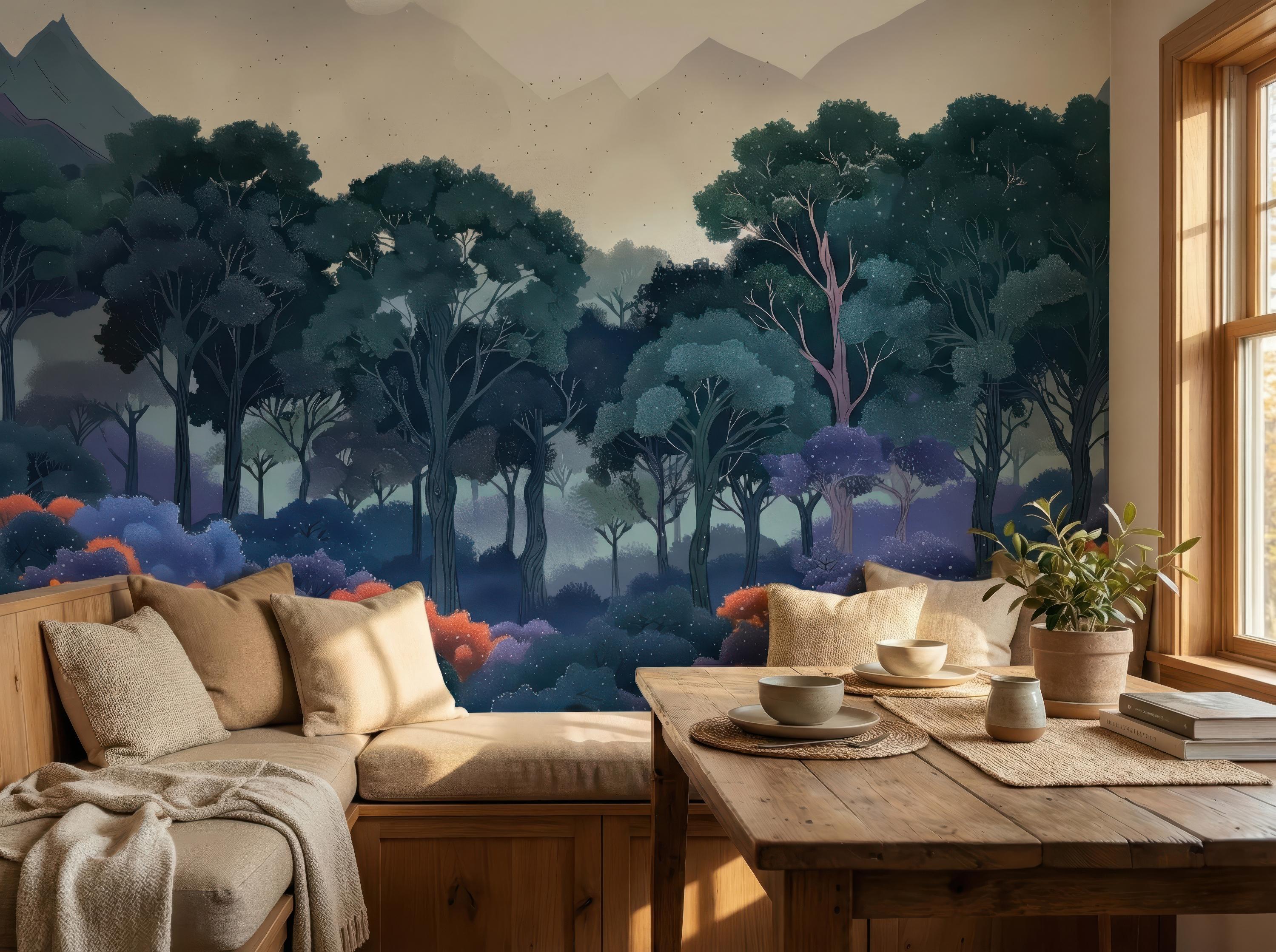 Transform your space into a mystical sanctuary with our 'Midnight Enchanted Forest' mural. Featuring deep emerald greens, misty mountains, and touches of warm rust wildflowers, this design brings the calm of nature right into your home.