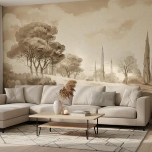 Vintage Landscape Wallpaper, Sepia Etching Wall Mural, French Country Wall Decor, Neutral Tree Peel and Stick, Antique Scenic Bedroom Mural