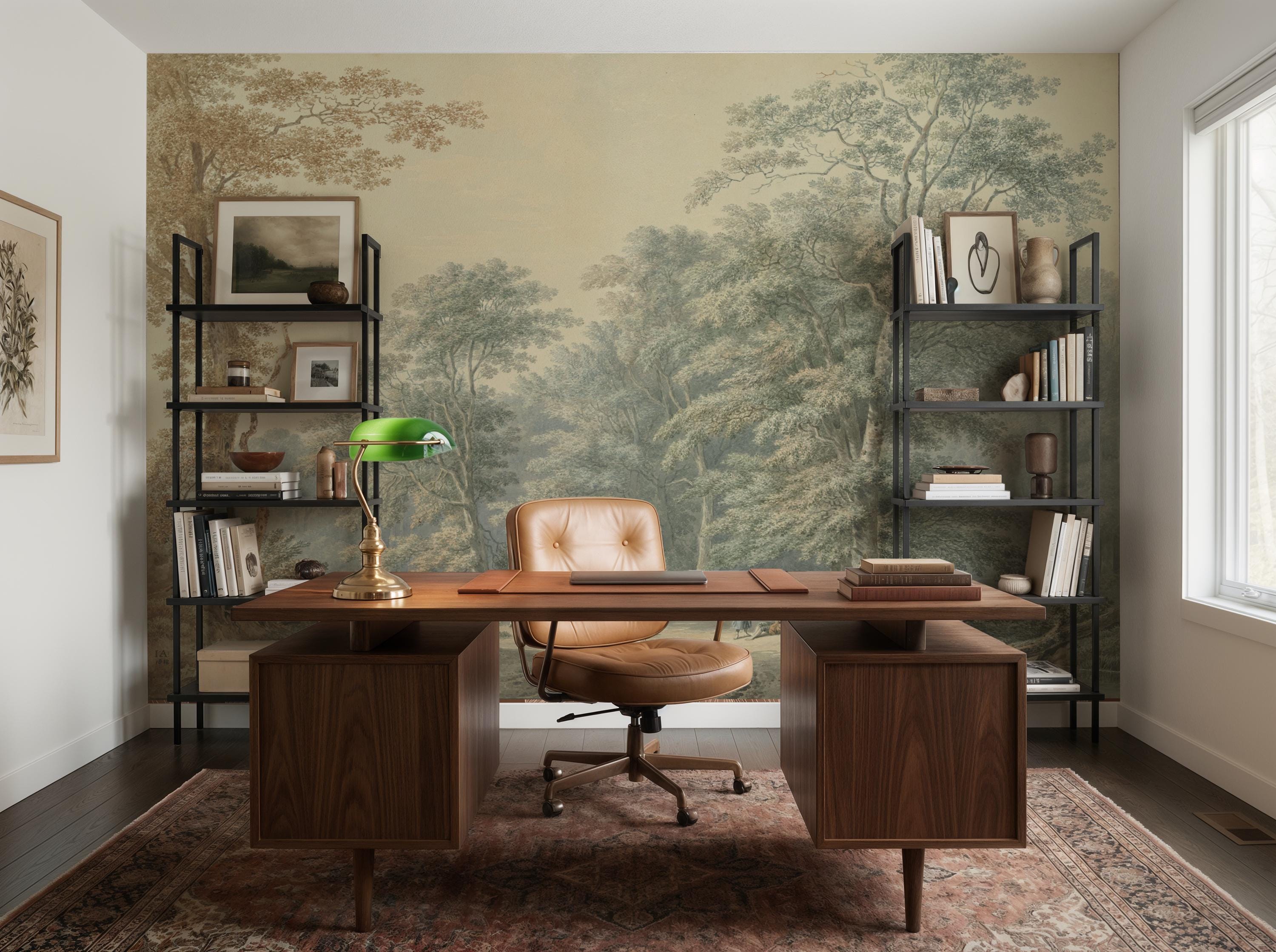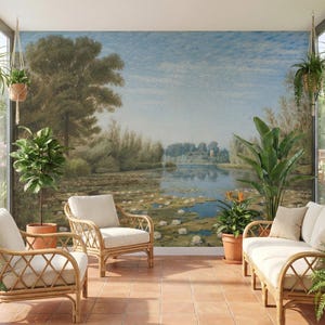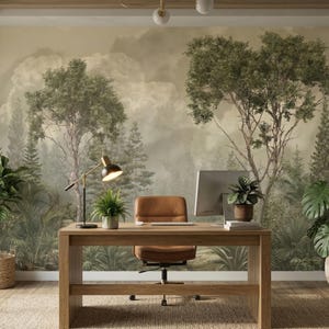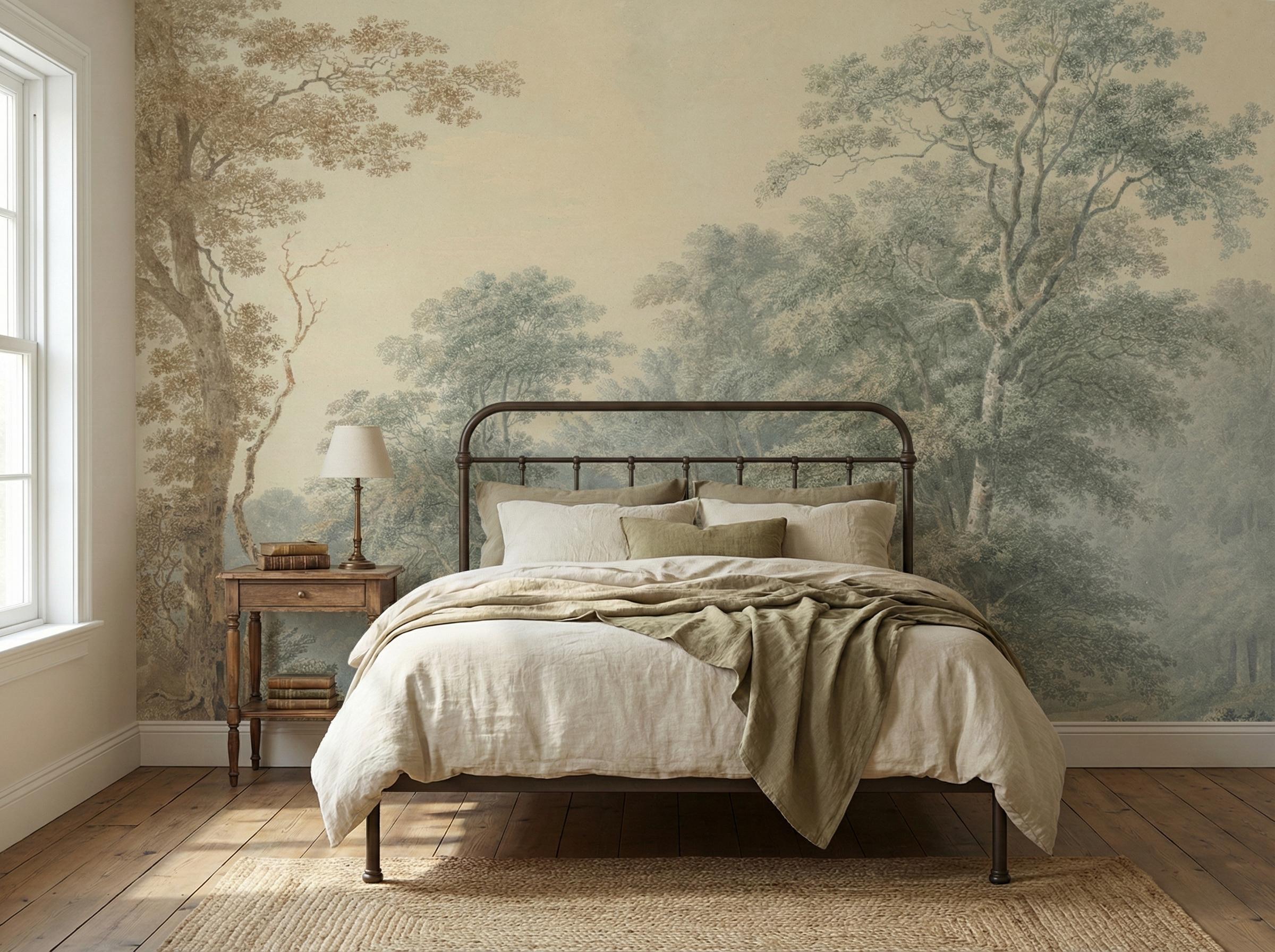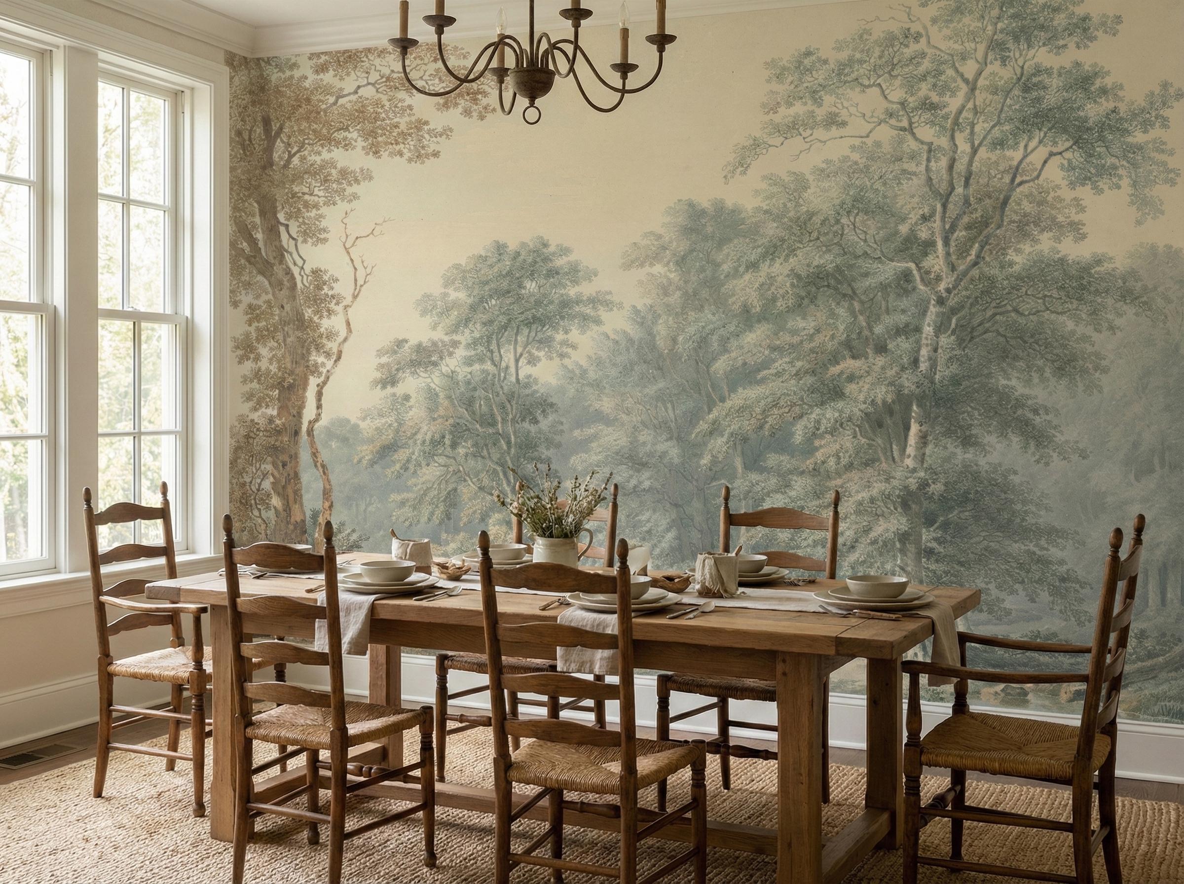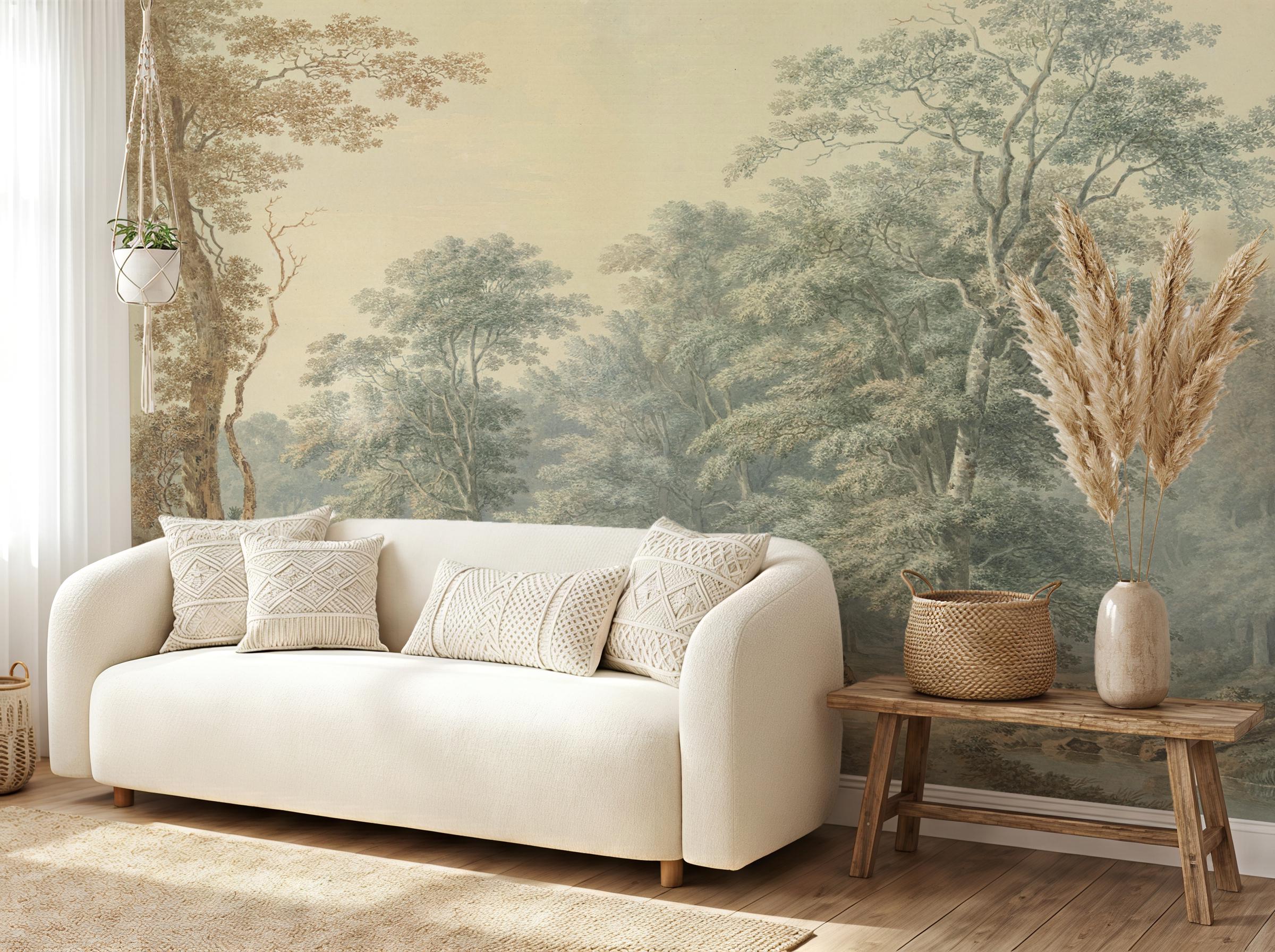 Elegant French countryside wallpaper mural featuring a soft scenic forest landscape.