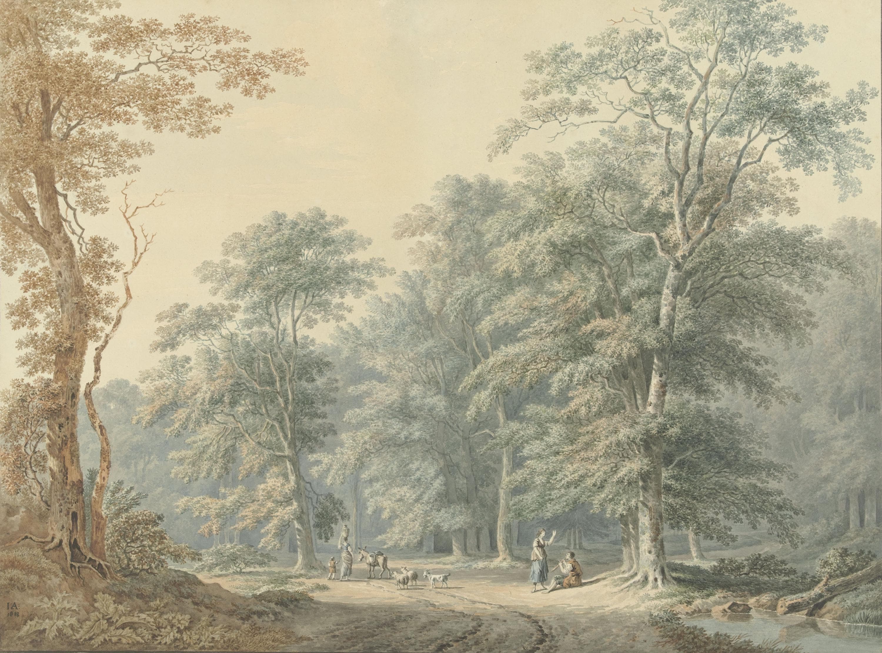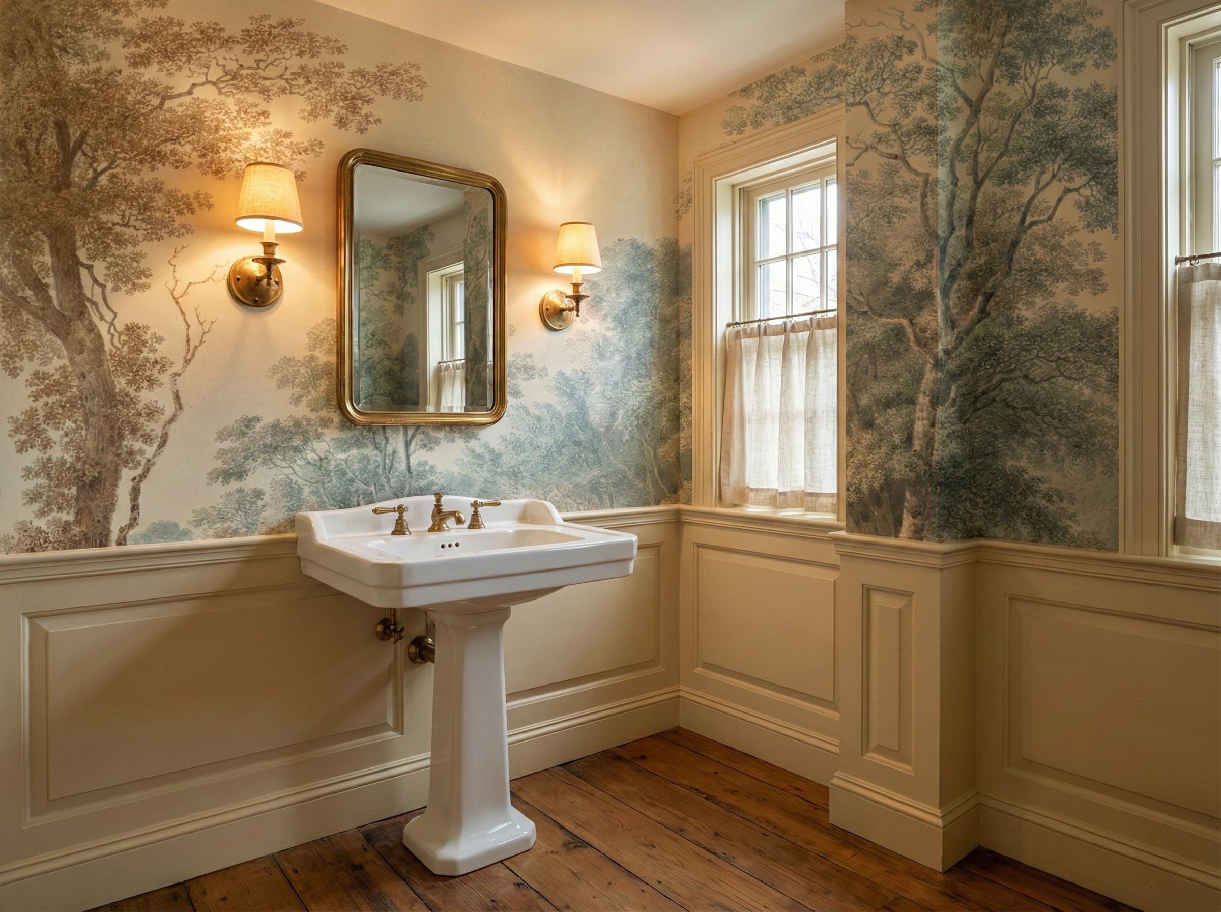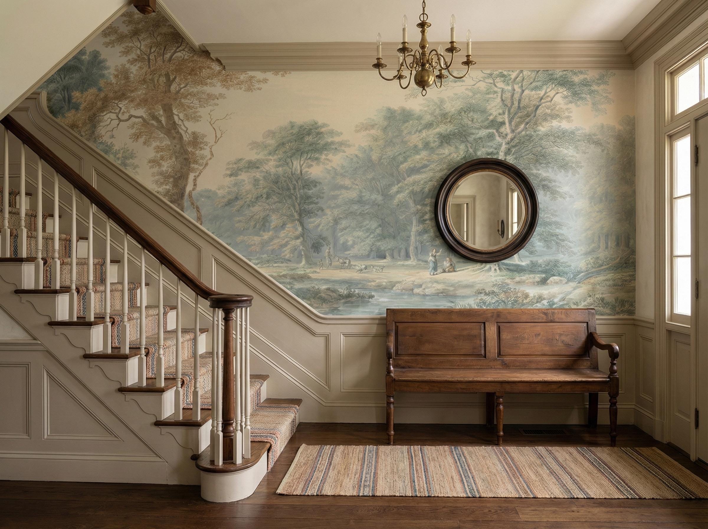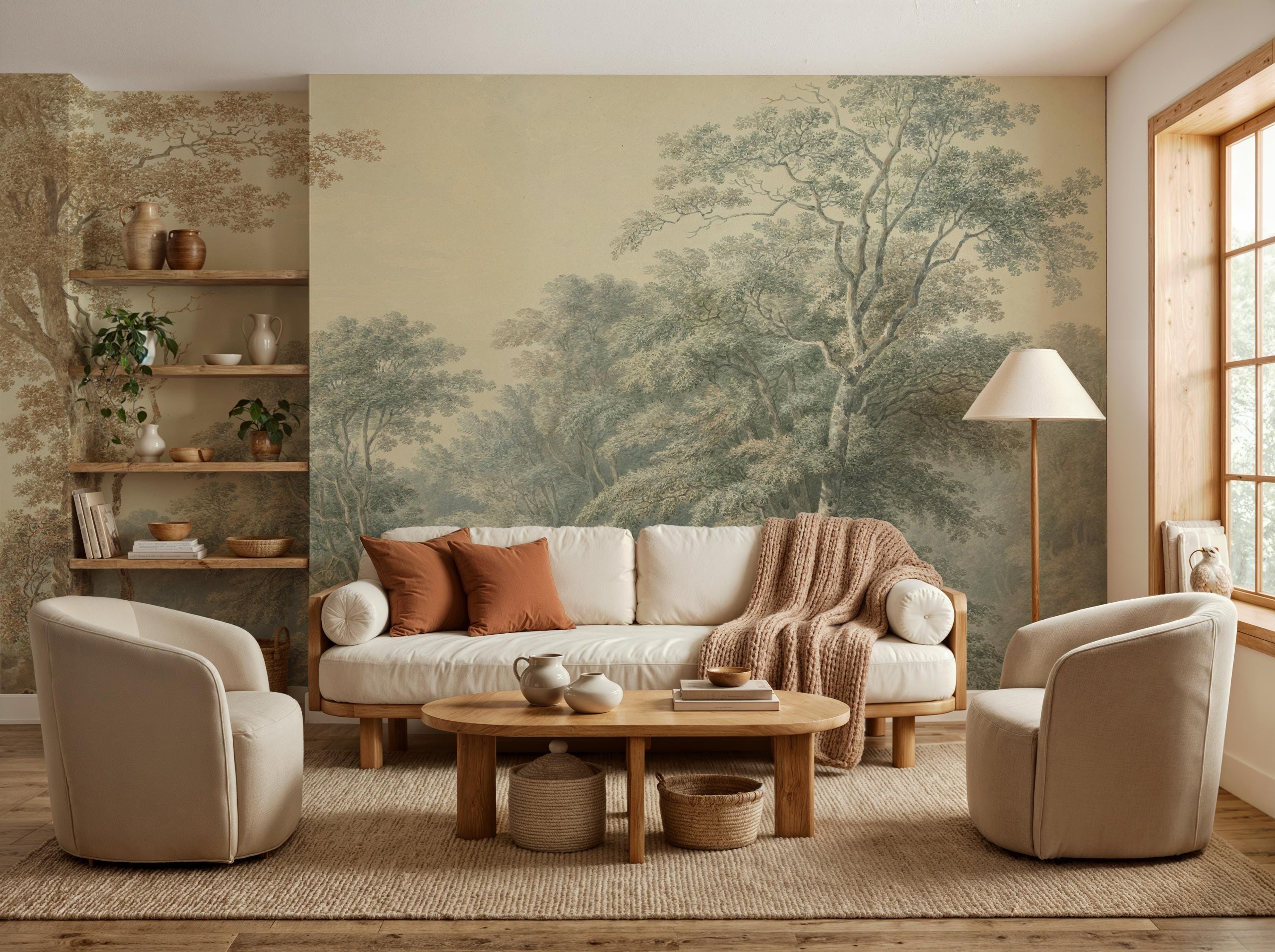 Elegant French countryside wallpaper mural featuring a soft scenic forest landscape.