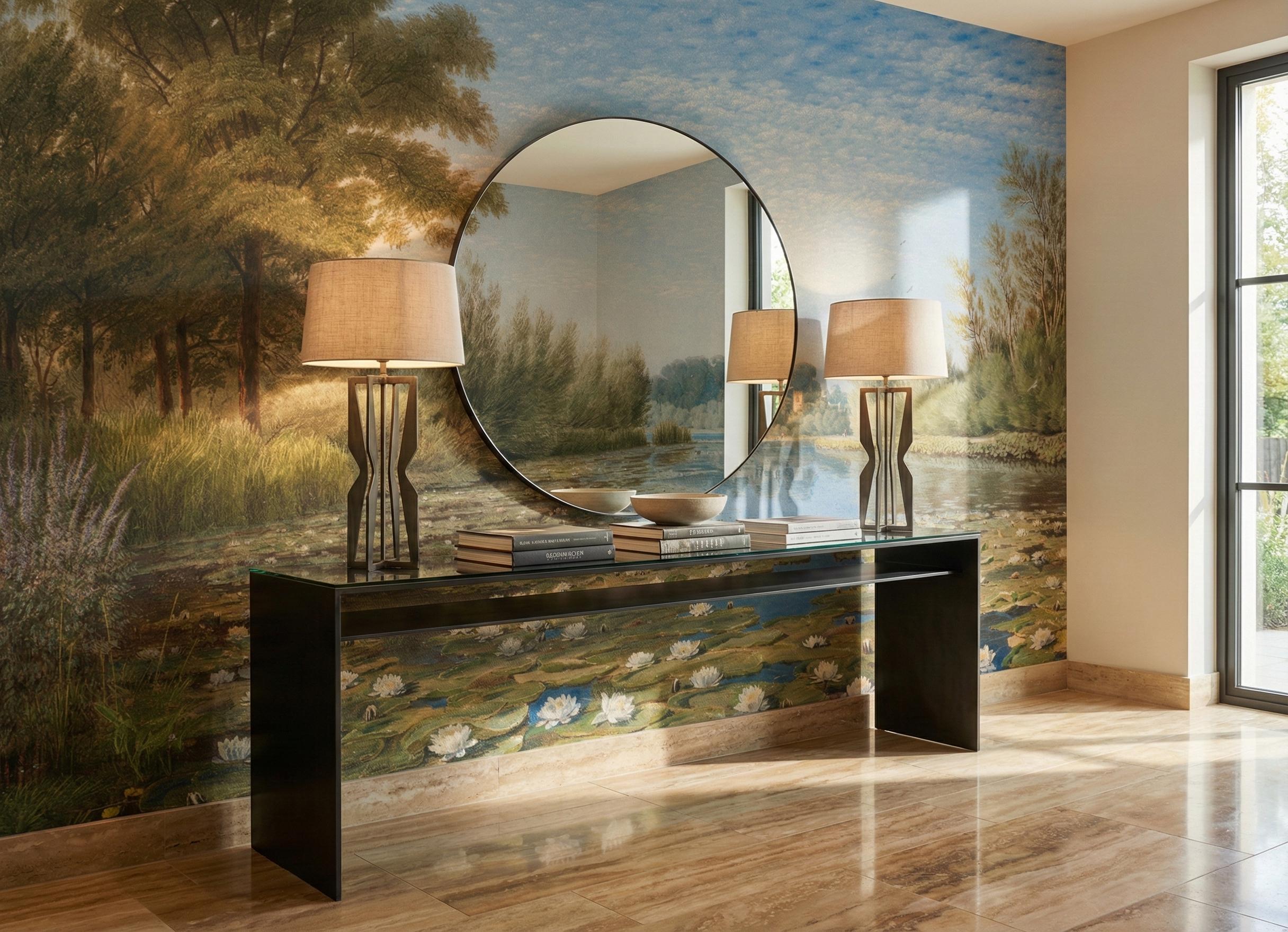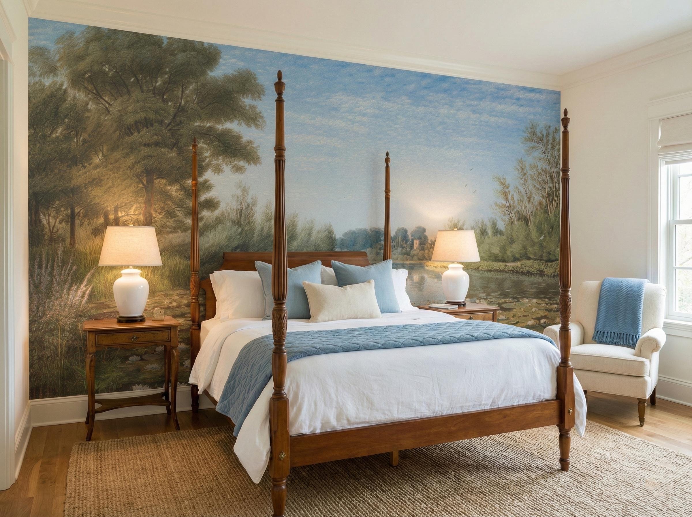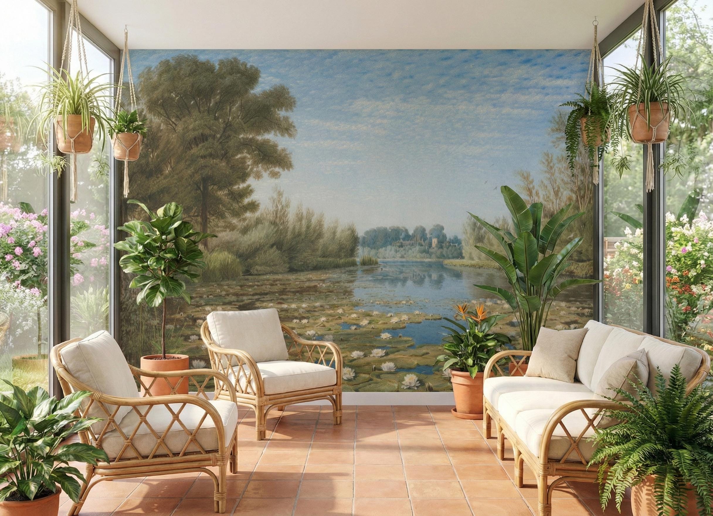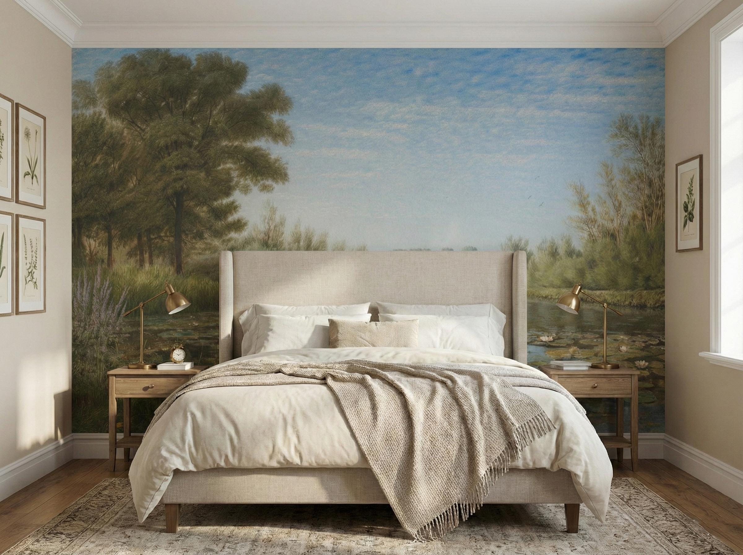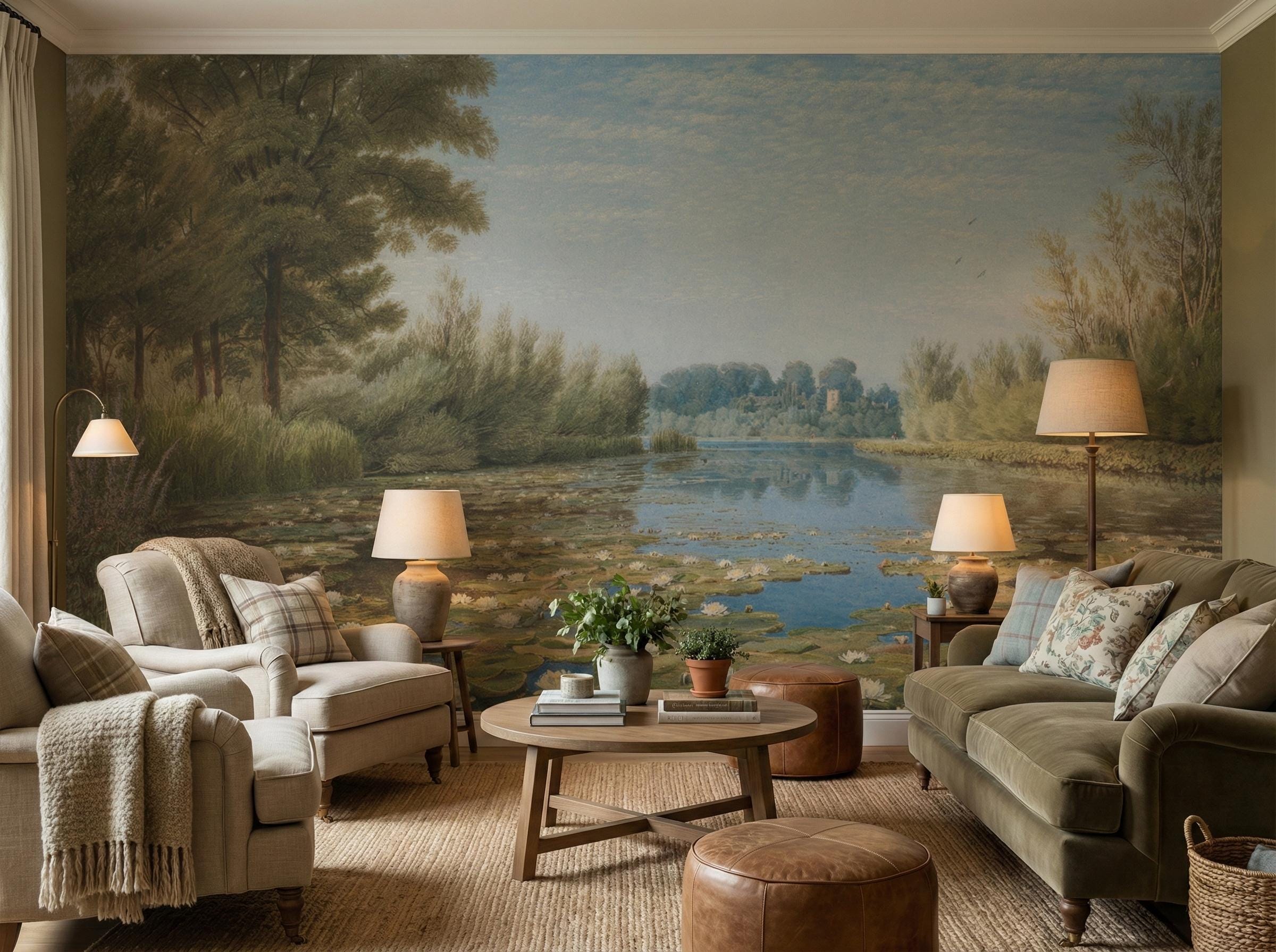 Vintage Landscape Mural, Water Lilies, Lake Scenery, Peel and Stick Wallpaper