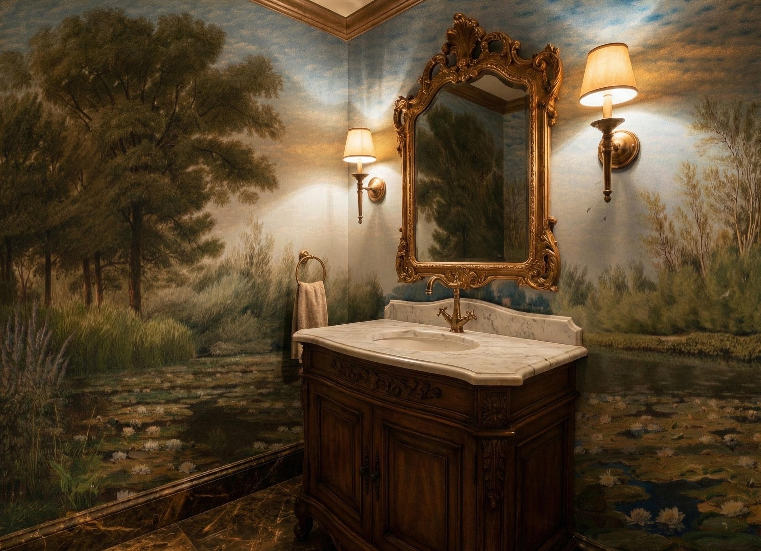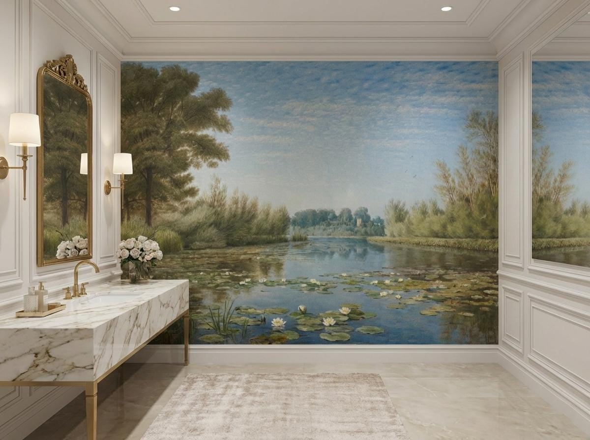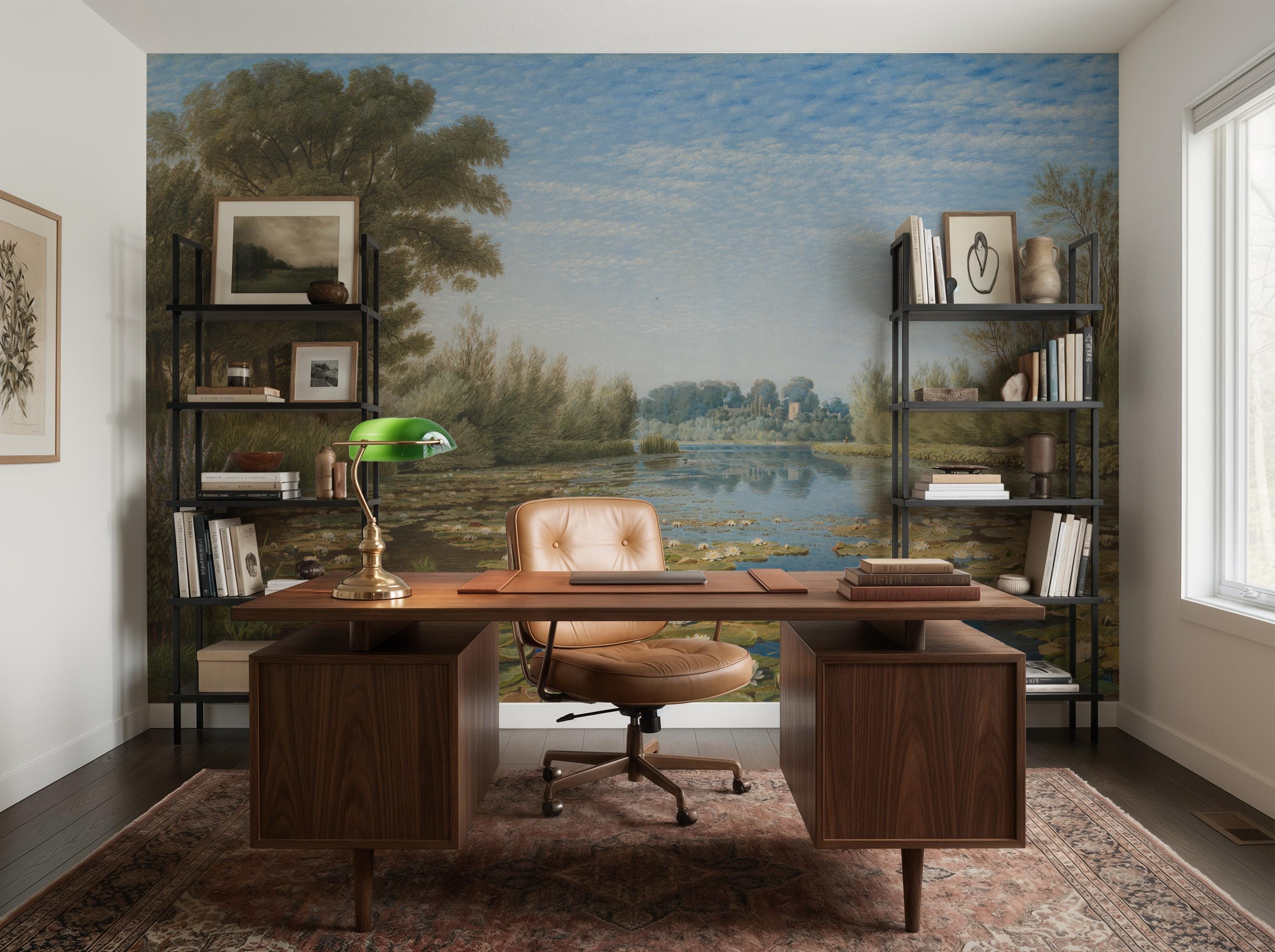 Transform your space into a timeless sanctuary with our Green Vintage Landscape Mural. Inspired by classic oil paintings, this design features a serene river and pond scenery filled with delicate water lilies, lush marsh vegetation, and the romantic silhouette of castle ruins in the distance.