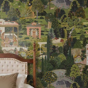 Transform your space into a serene royal sanctuary with our Lush Jaipur Garden Wallpaper. Inspired by traditional Mughal art and Indian miniature paintings, this design brings the timeless beauty of an Indian countryside palace right into your home.