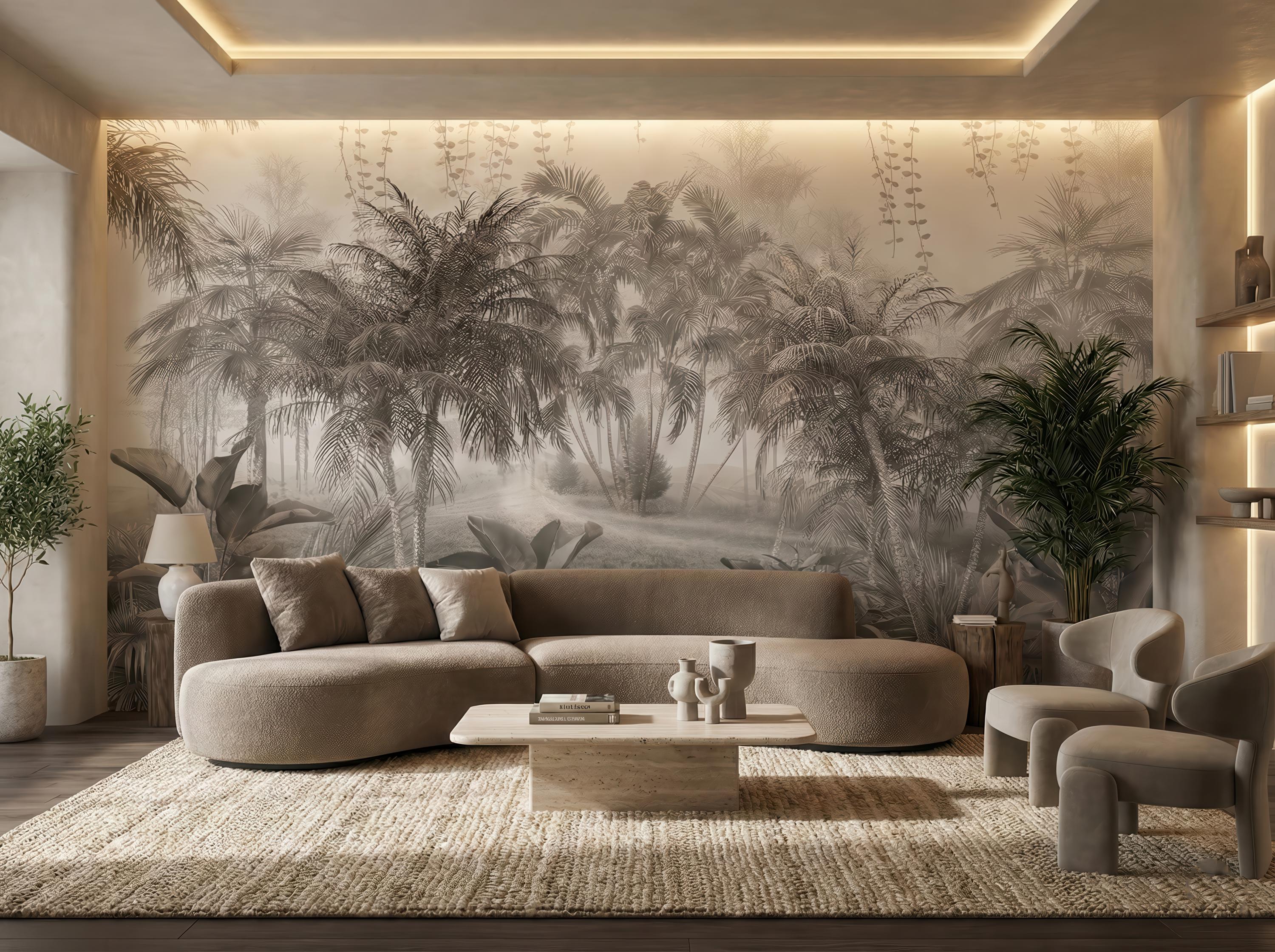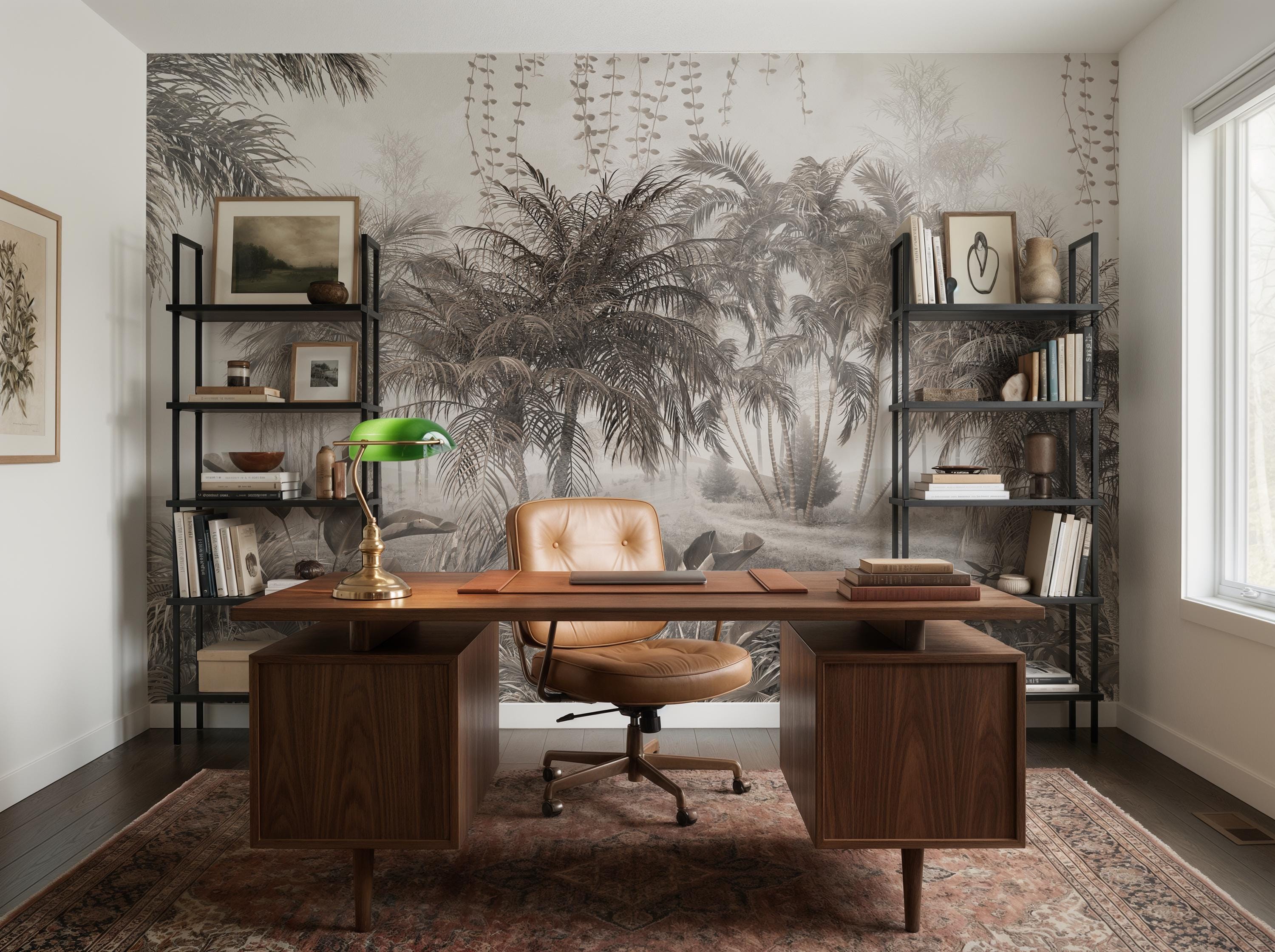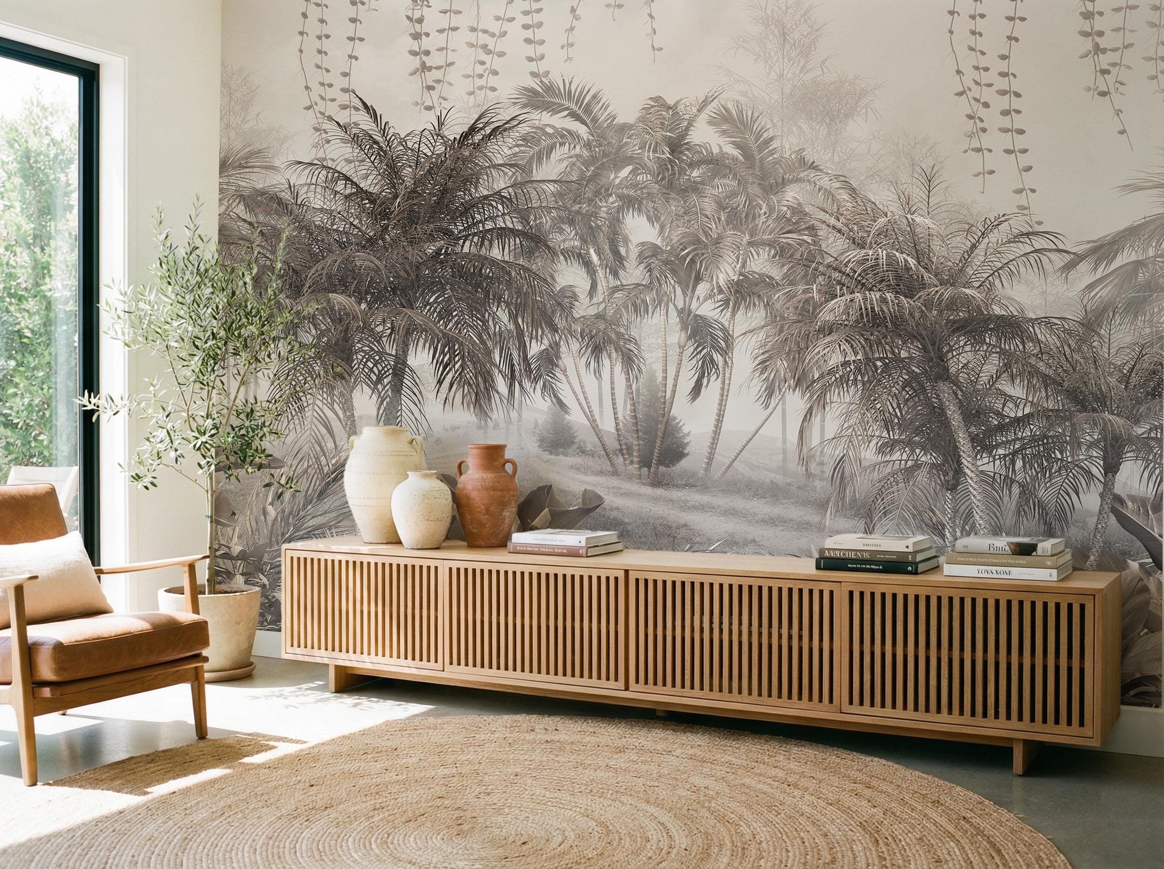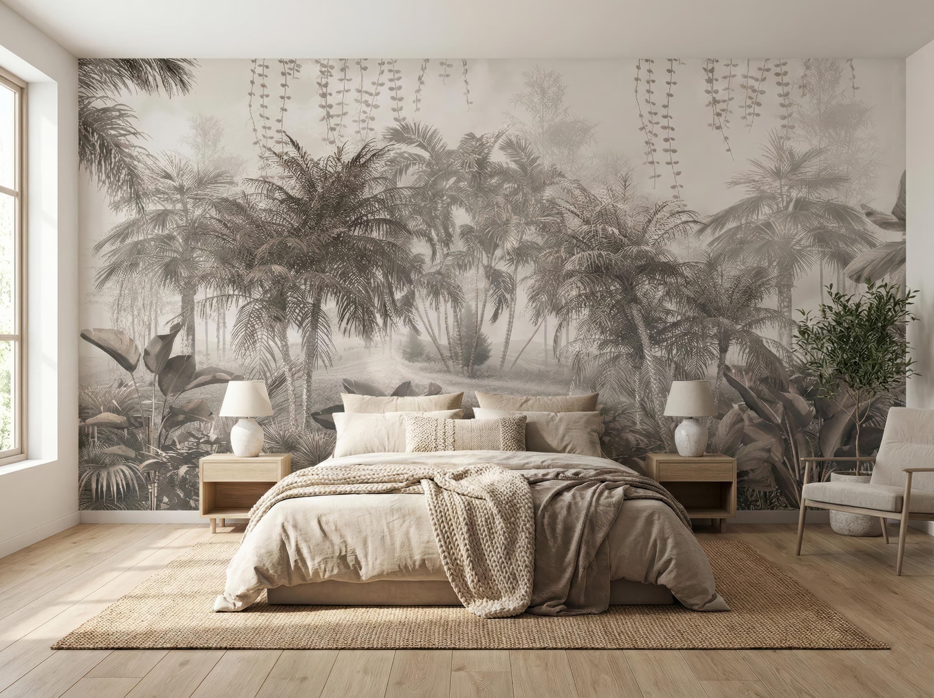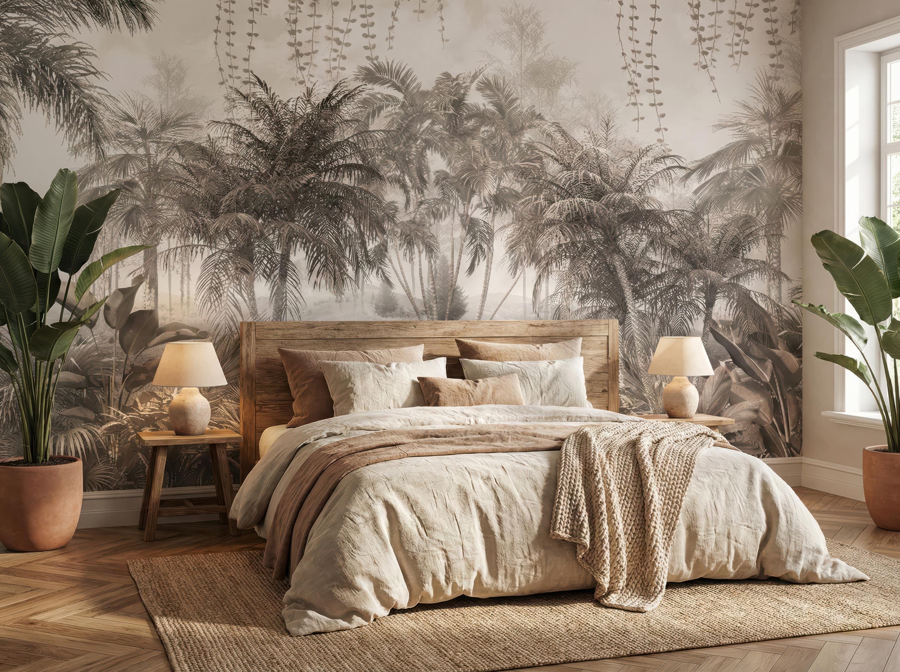 Transform your space with this stunning vintage tropical jungle wall mural. Featuring a sophisticated sepia-toned palm tree design, this peel and stick wallpaper creates a serene accent wall in any bedroom, nursery, or home office. High-quality, removable, and perfect for renters looking for a botanical aesthetic upgrade.