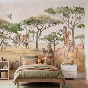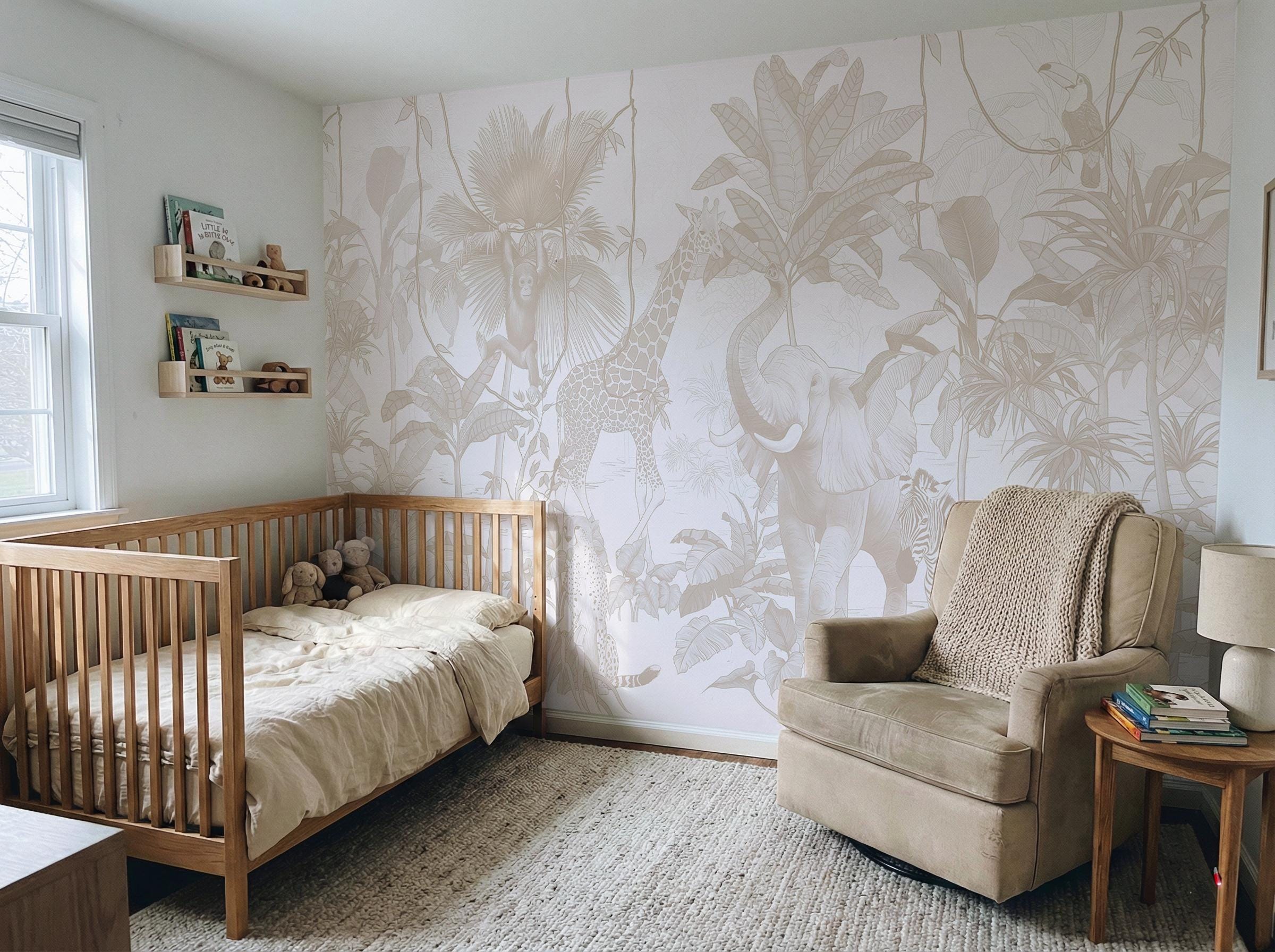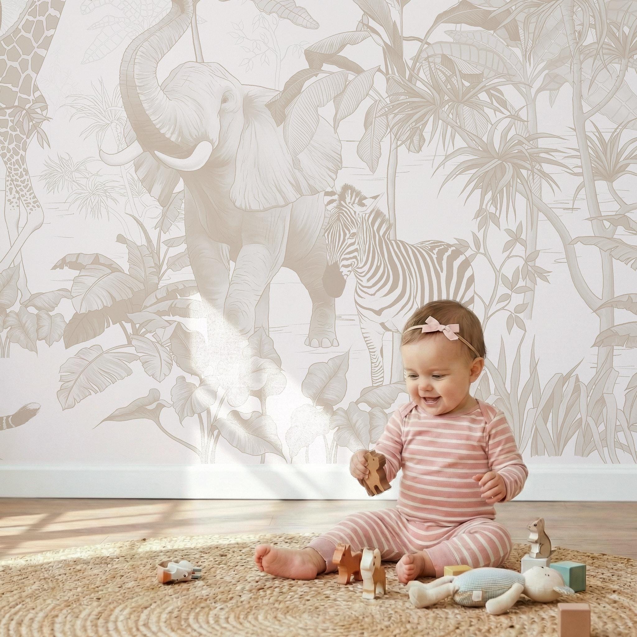 Neutral Safari Animals Nursery Wallpaper, Baby Room Wall Mural, Peel and Stick
