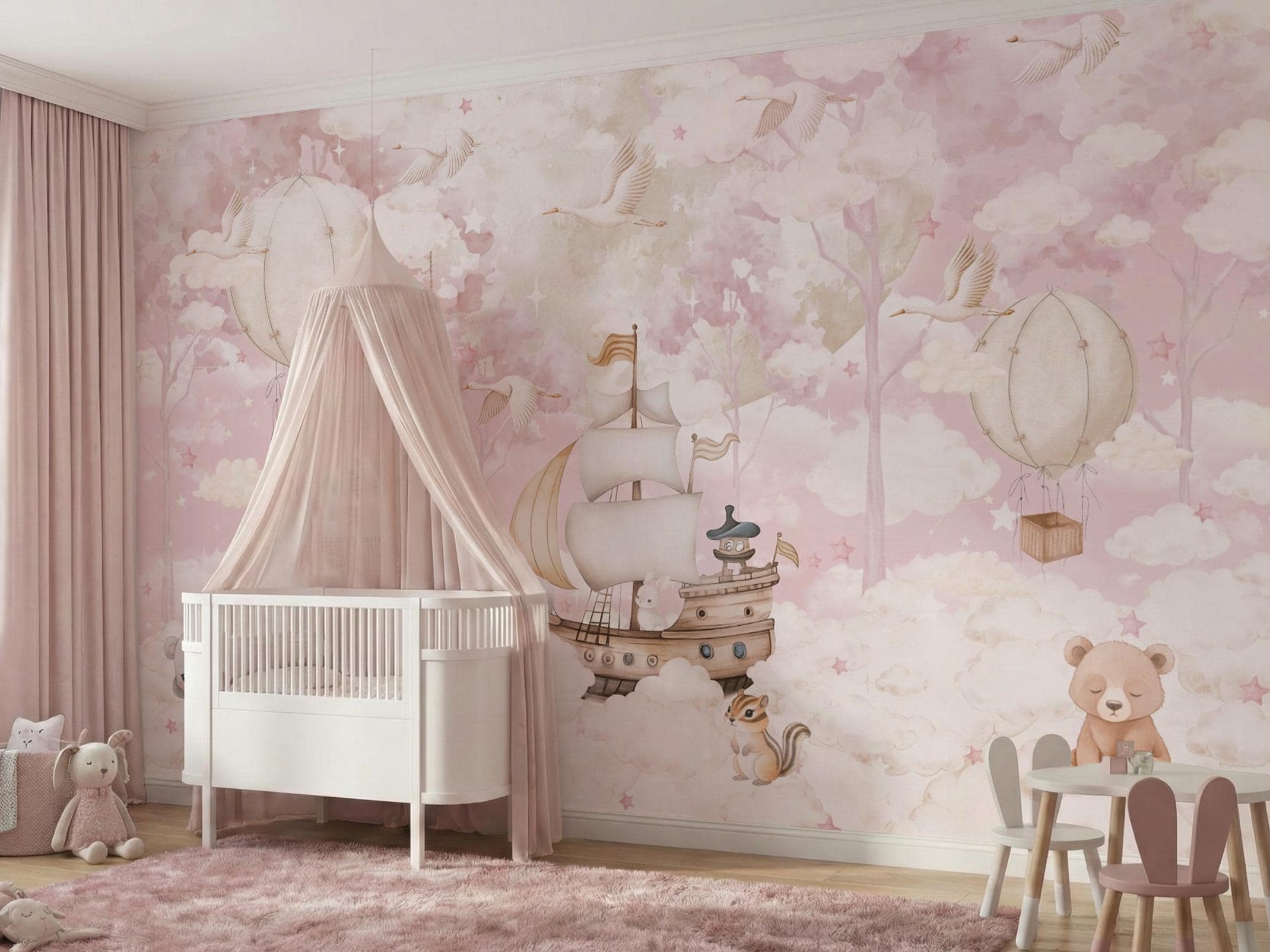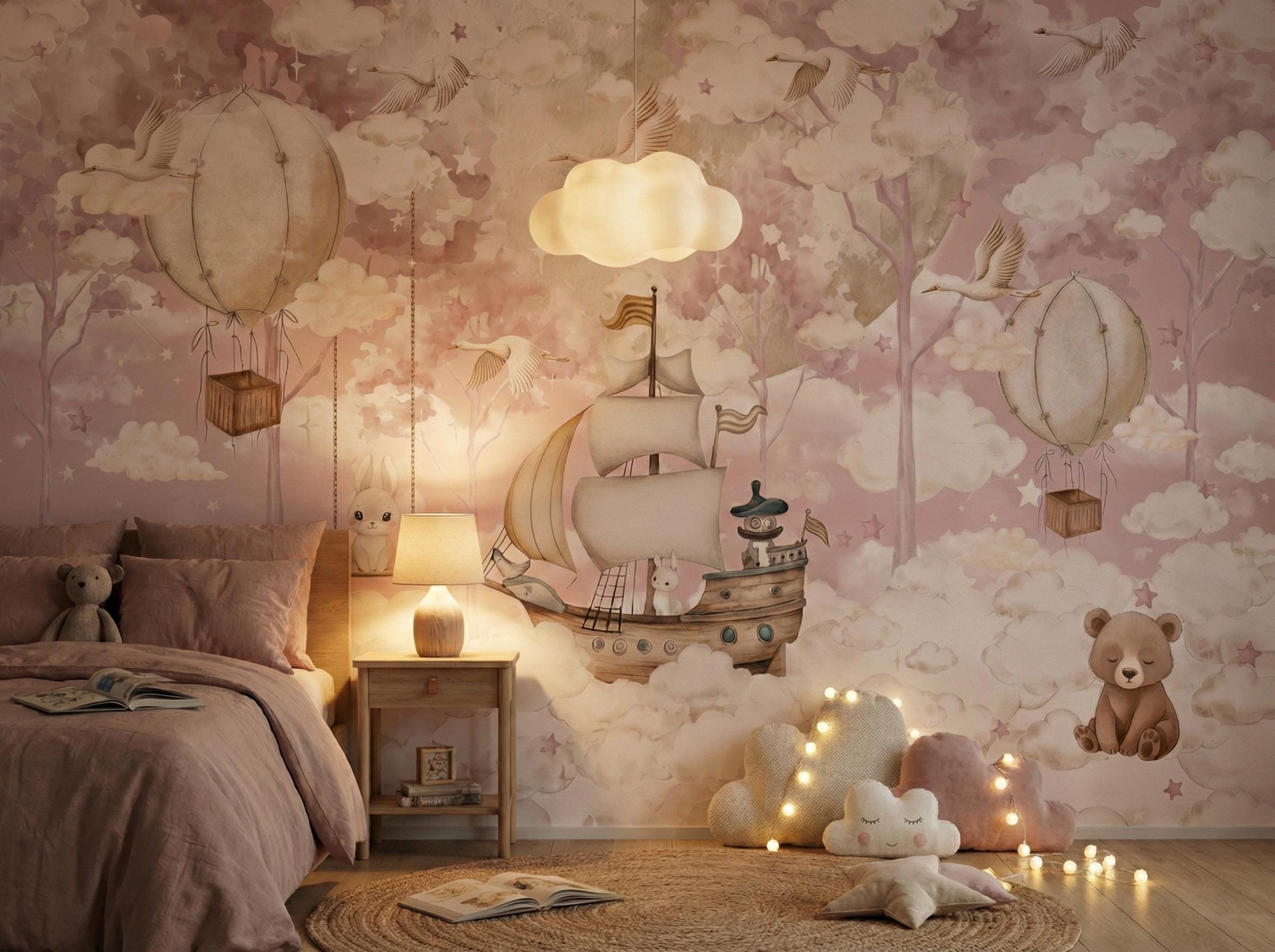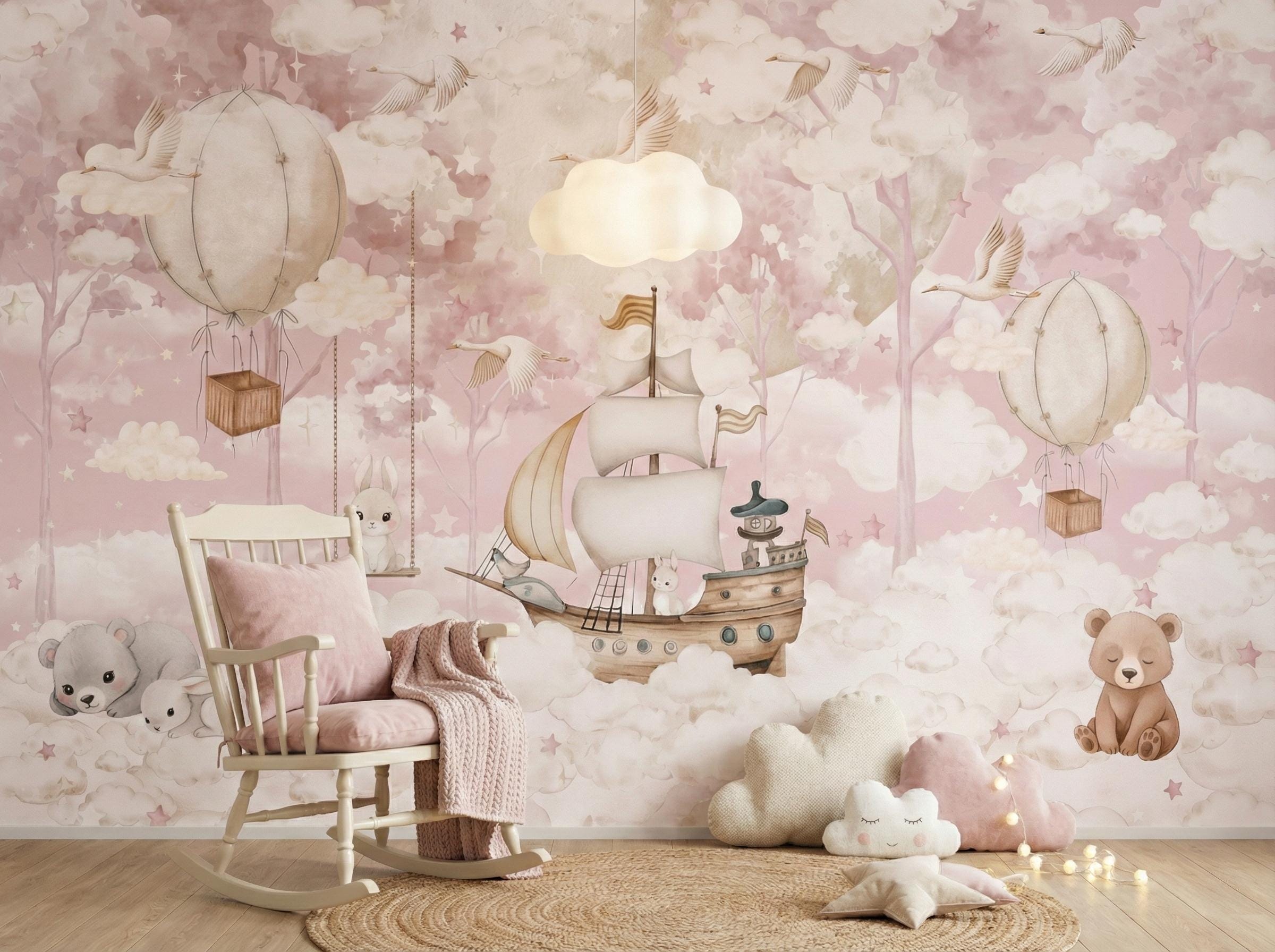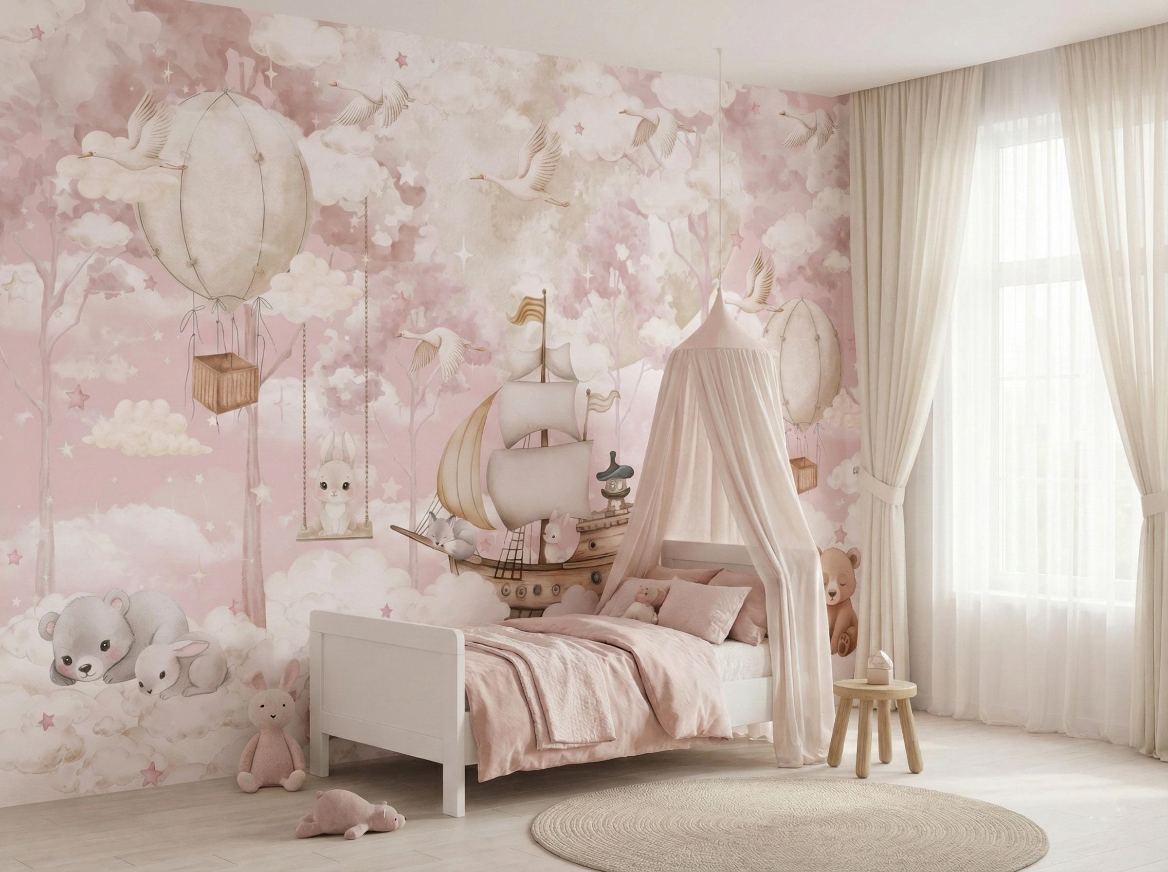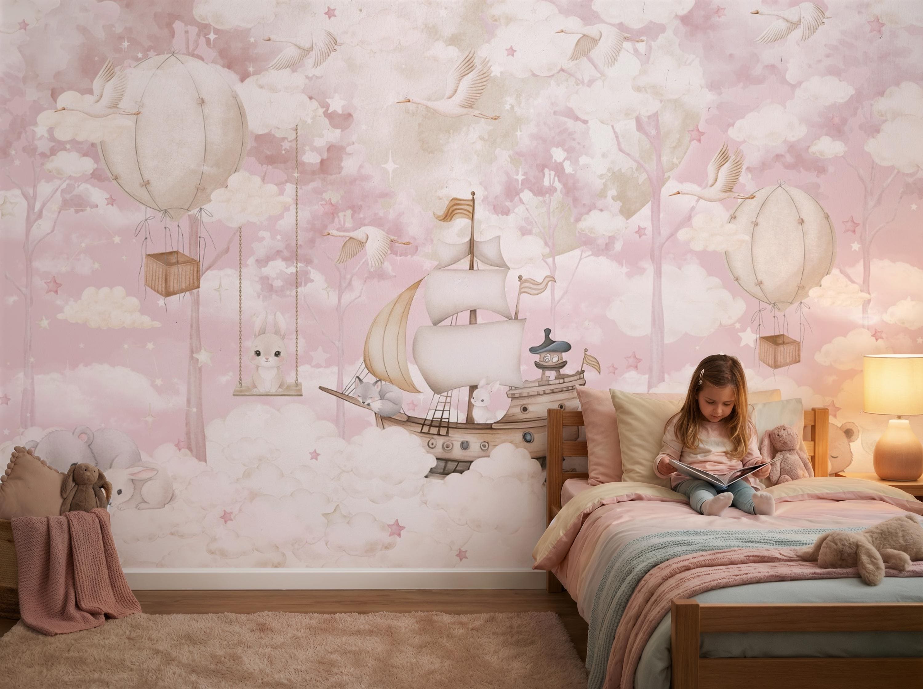 Pink Whimsical Nursery Wallpaper, Watercolor Hot Air Balloon Mural for Baby Girl Room