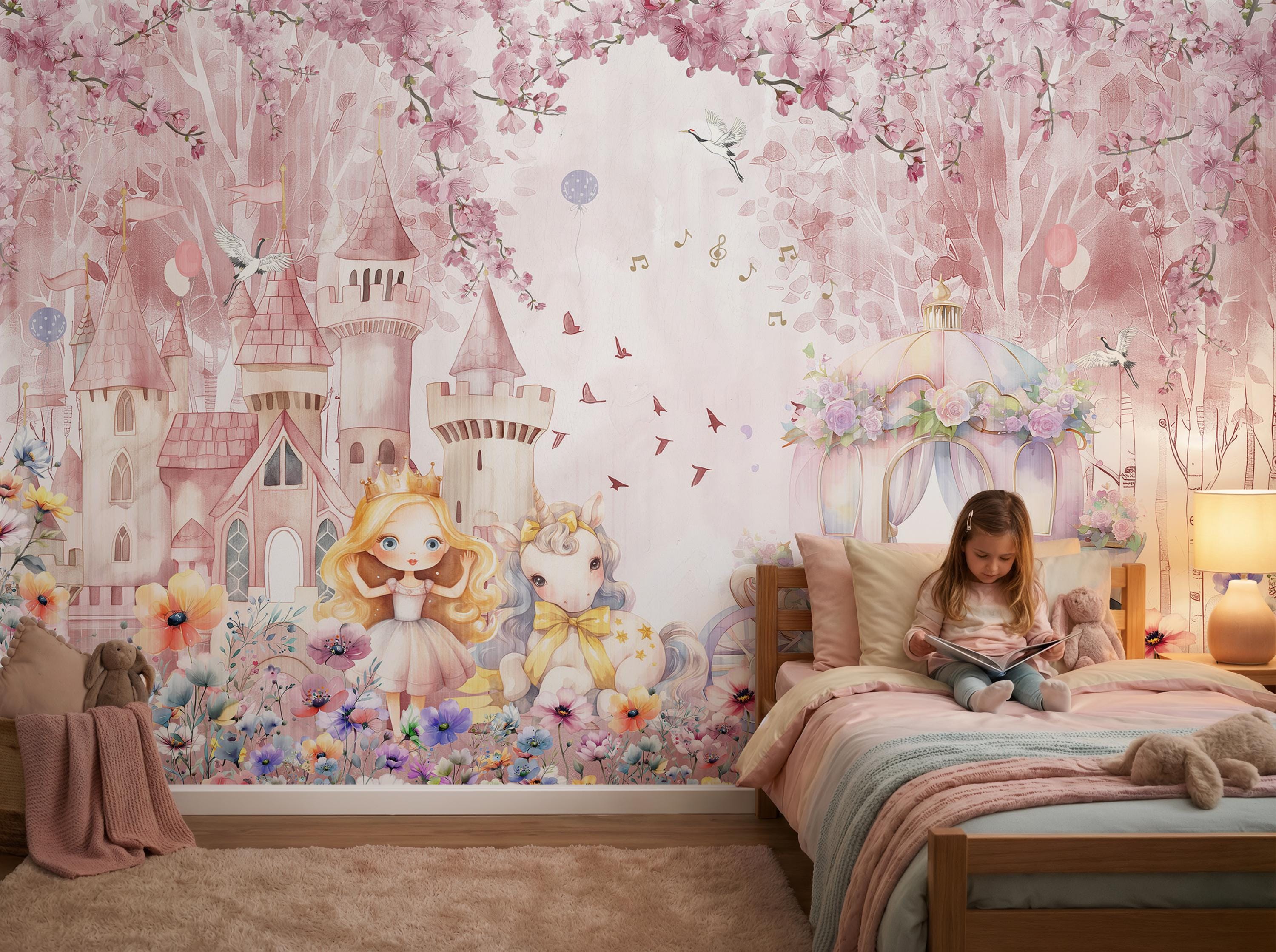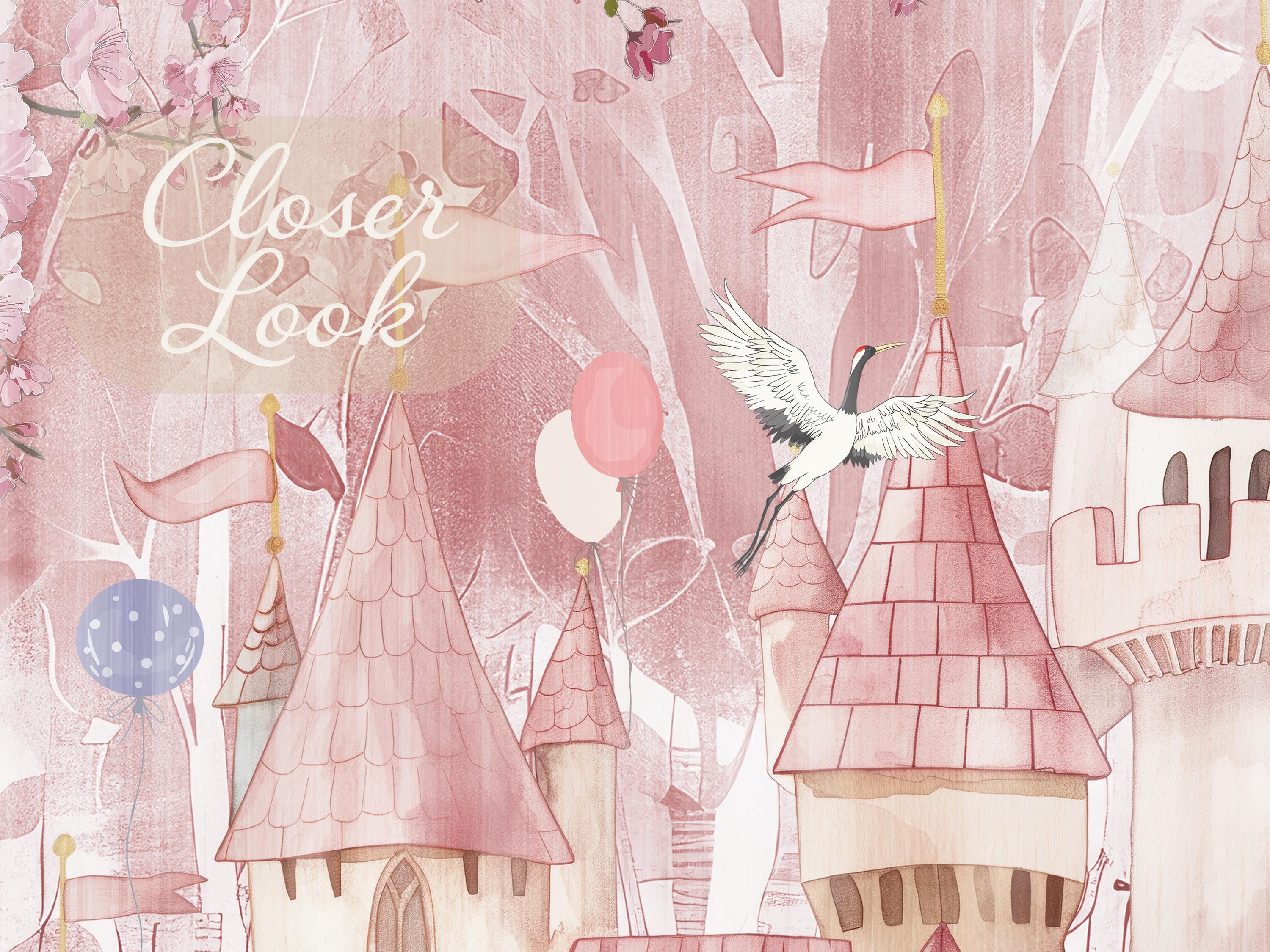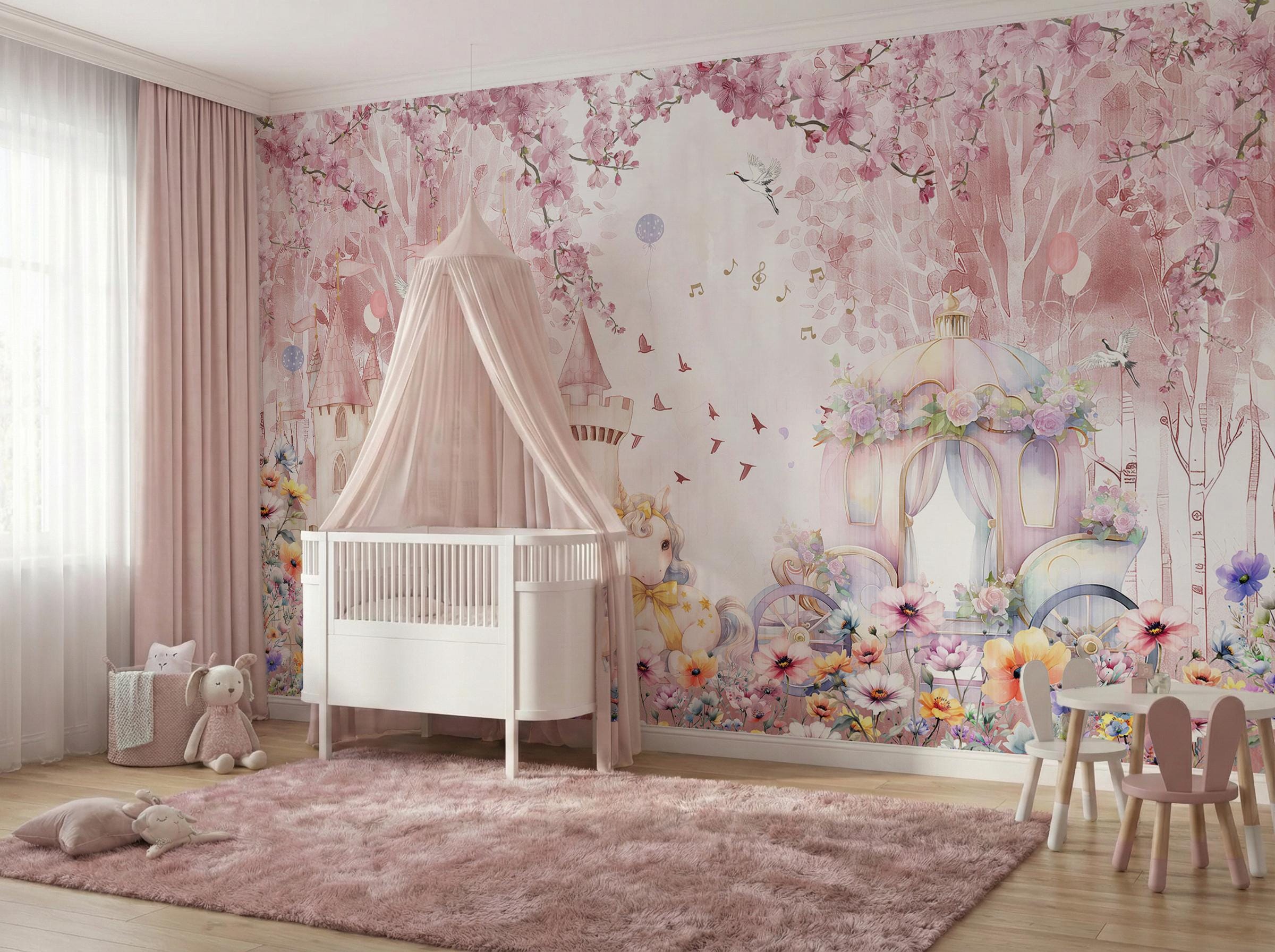 Princess Castle Wallpaper Peel and Stick, Pink Unicorn Nursery Mural, Removable Fairy Tale Wall Art, Kids Room Decor, Floral Carriage Mural, Watercolor Girl Room Wallpaper, Large Wall Mural Custom Size