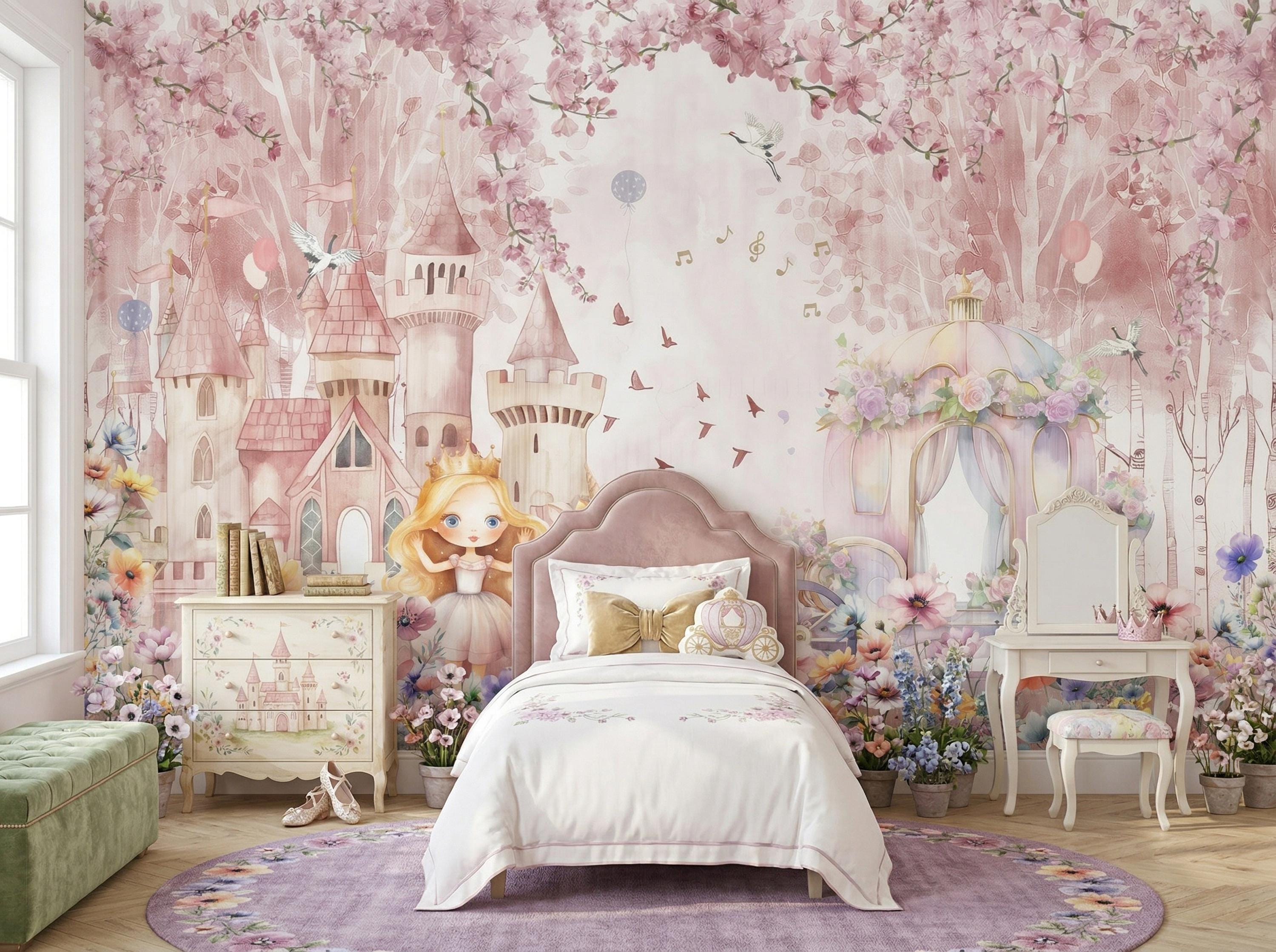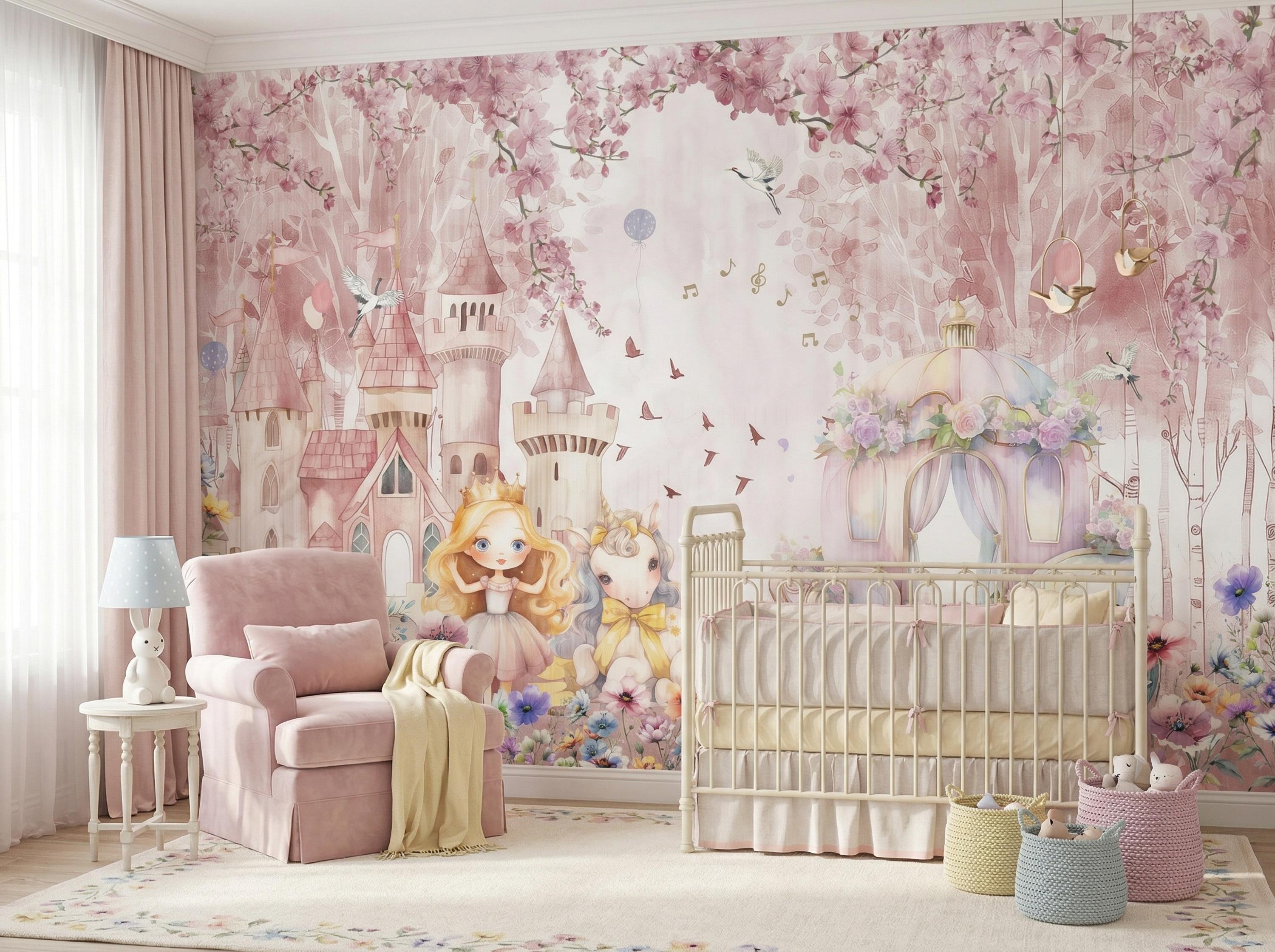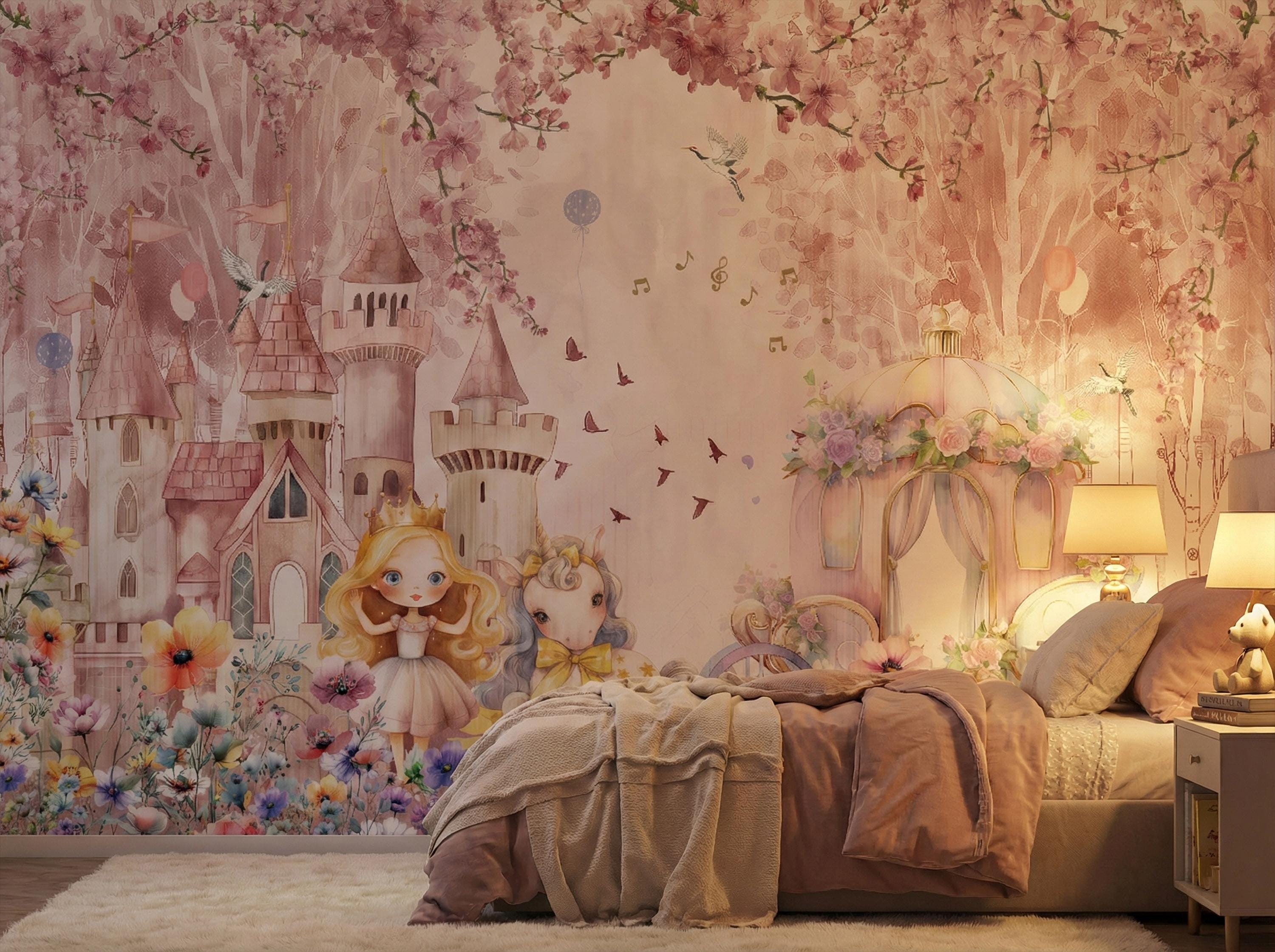 Princess Castle Wallpaper Peel and Stick, Pink Unicorn Nursery Mural, Removable Fairy Tale Wall Art, Kids Room Decor, Floral Carriage Mural, Watercolor Girl Room Wallpaper, Large Wall Mural Custom Size
