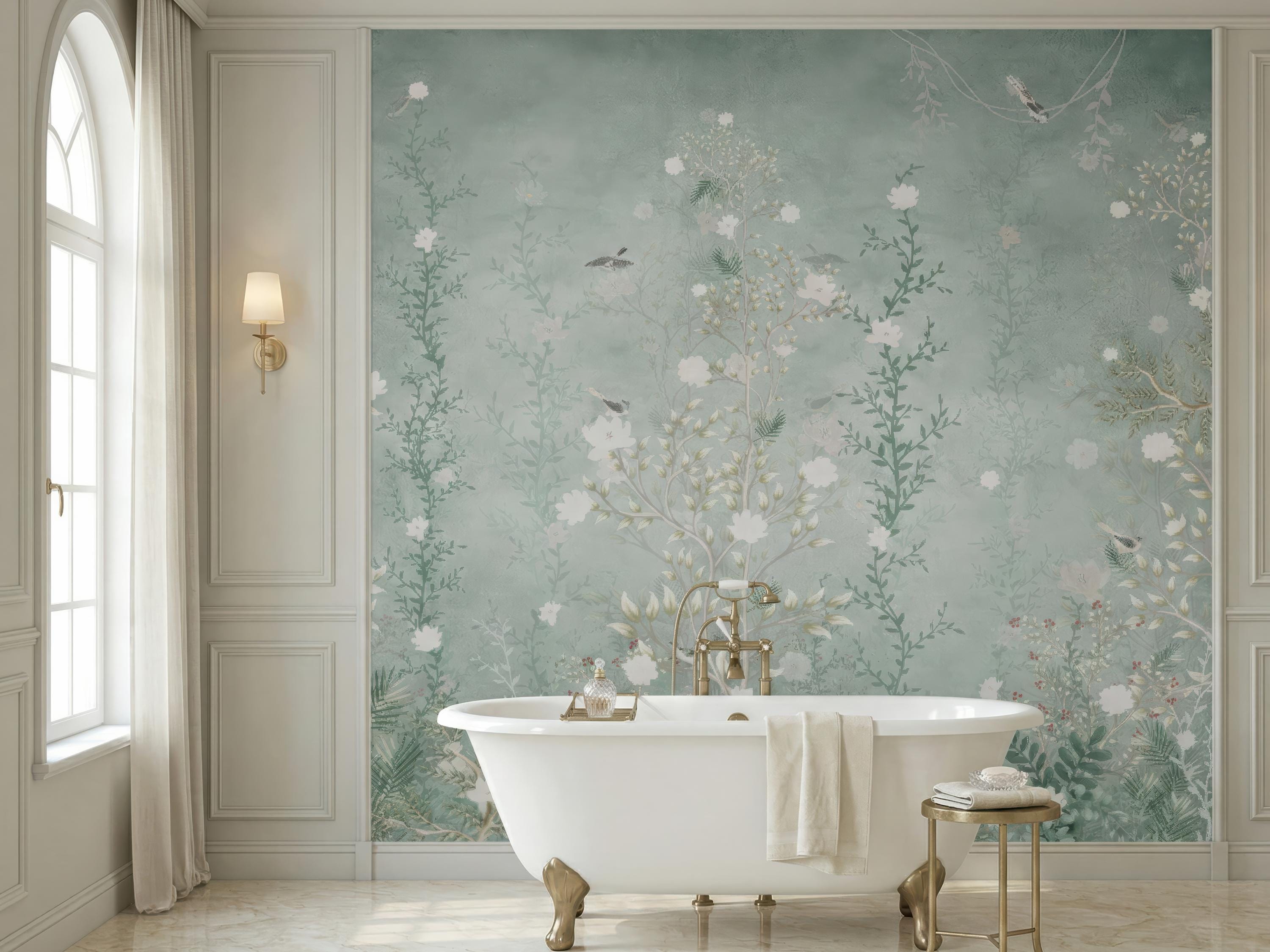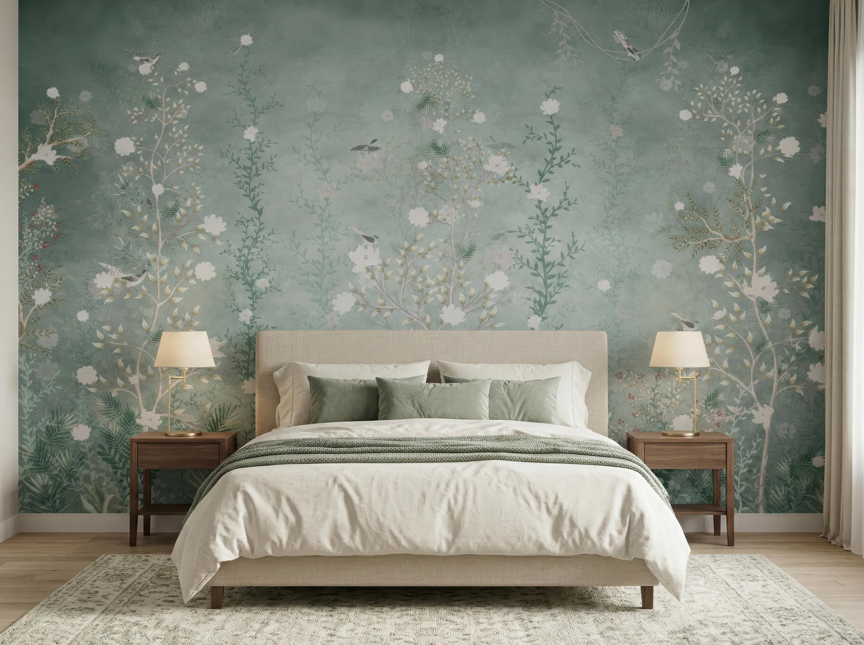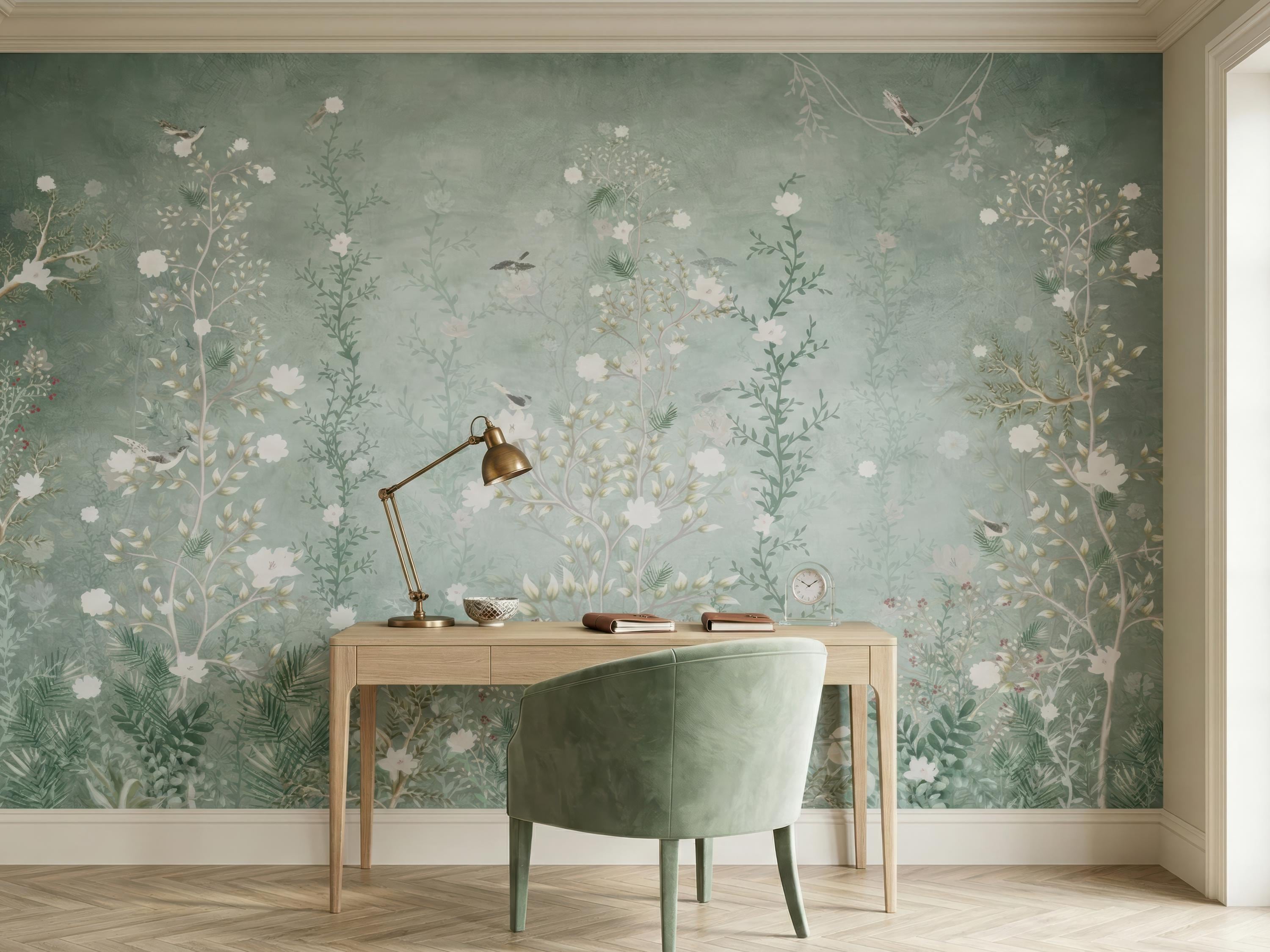 Transform your space into a serene, nature-inspired retreat with our Sage Green Floral Botanical Wallpaper. Featuring delicate white flowers, trailing vines, and subtle vintage birds, this watercolor-style wall mural adds an elegant, calming aesthetic to any room.