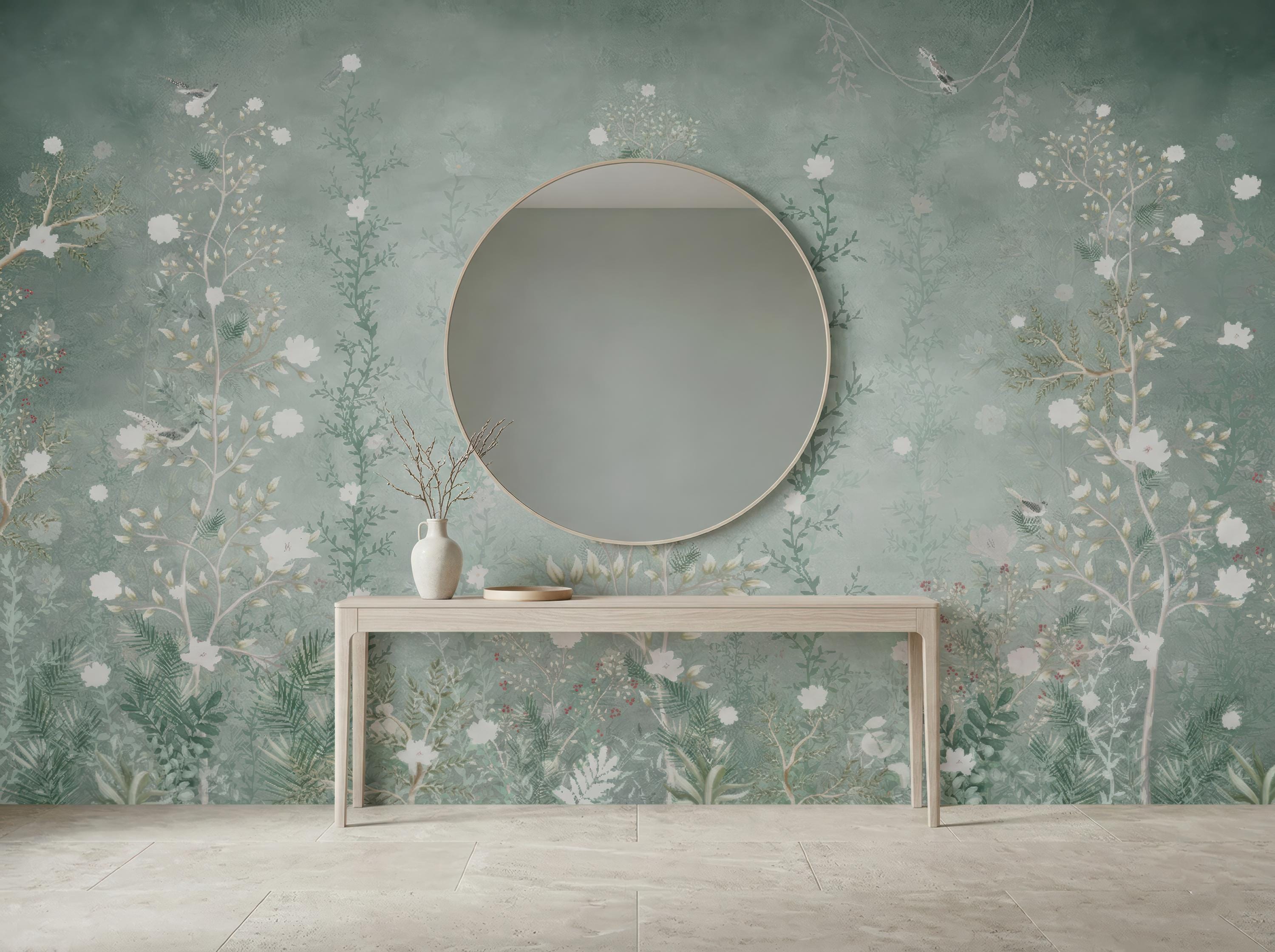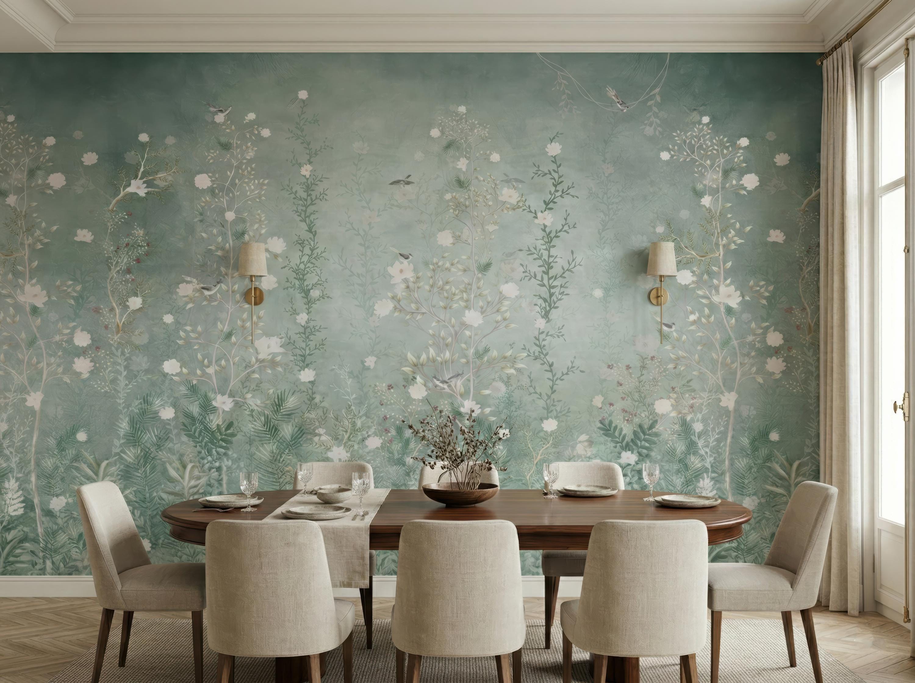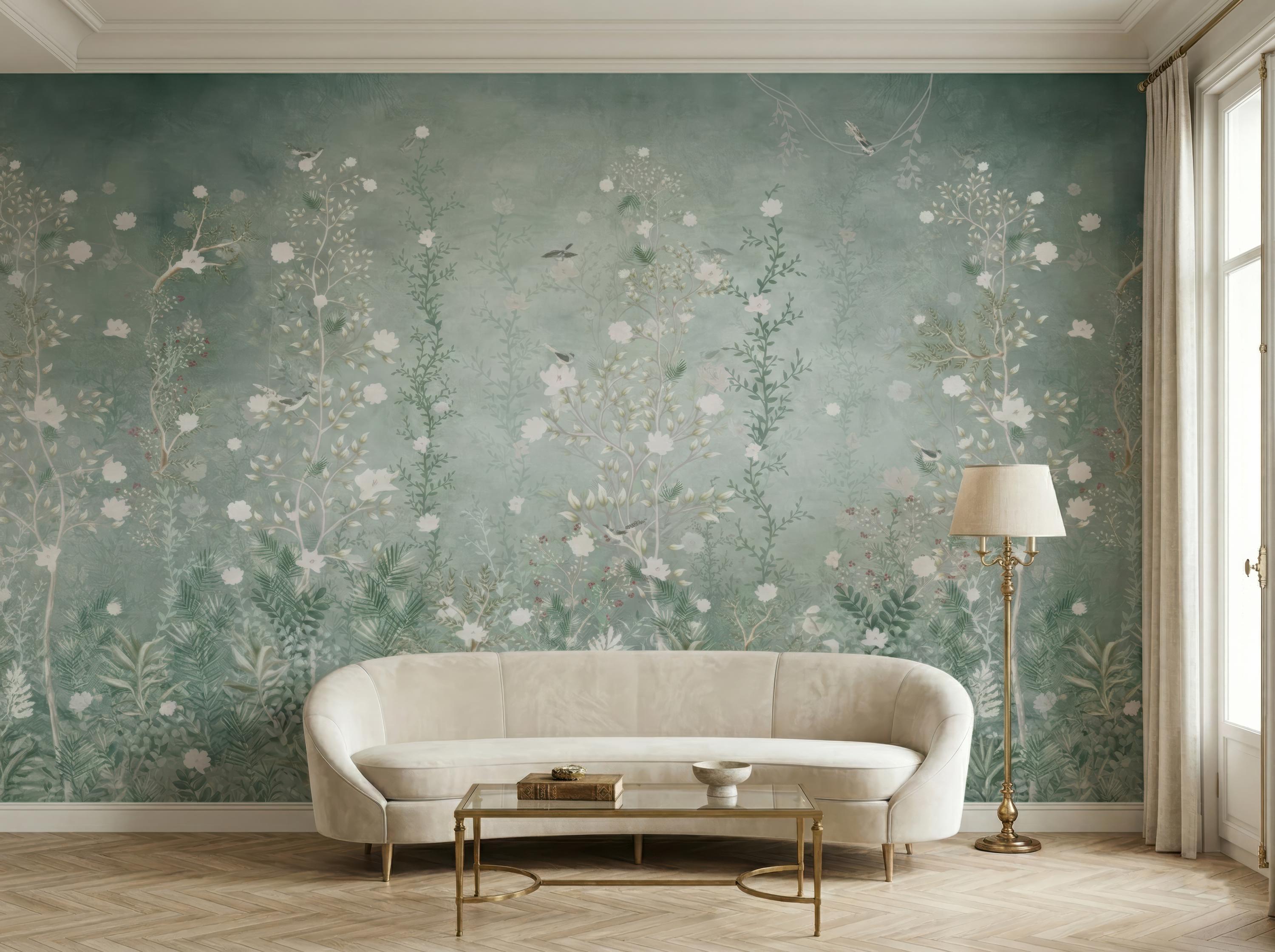 Transform your space into a serene, nature-inspired retreat with our Sage Green Floral Botanical Wallpaper. Featuring delicate white flowers, trailing vines, and subtle vintage birds, this watercolor-style wall mural adds an elegant, calming aesthetic to any room.