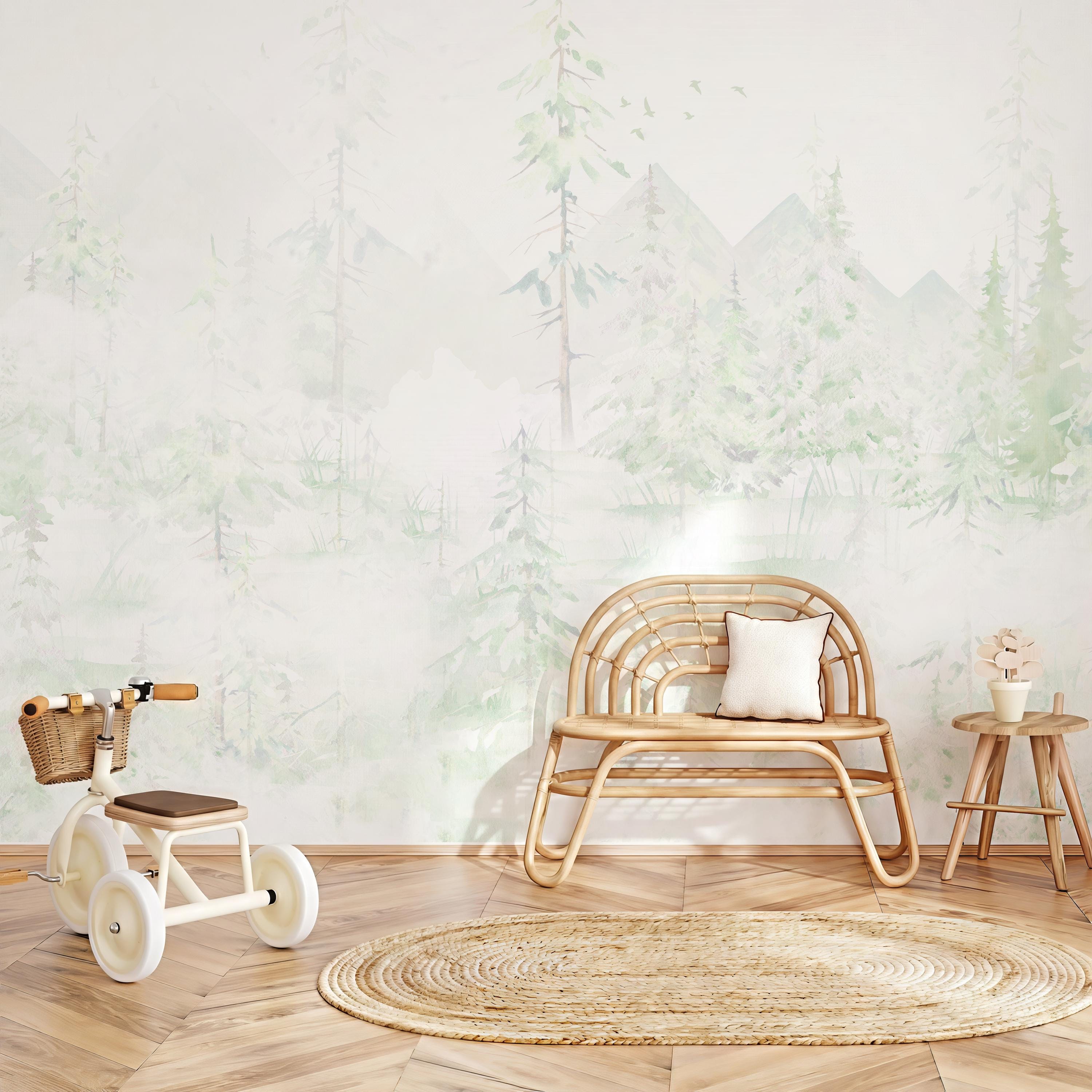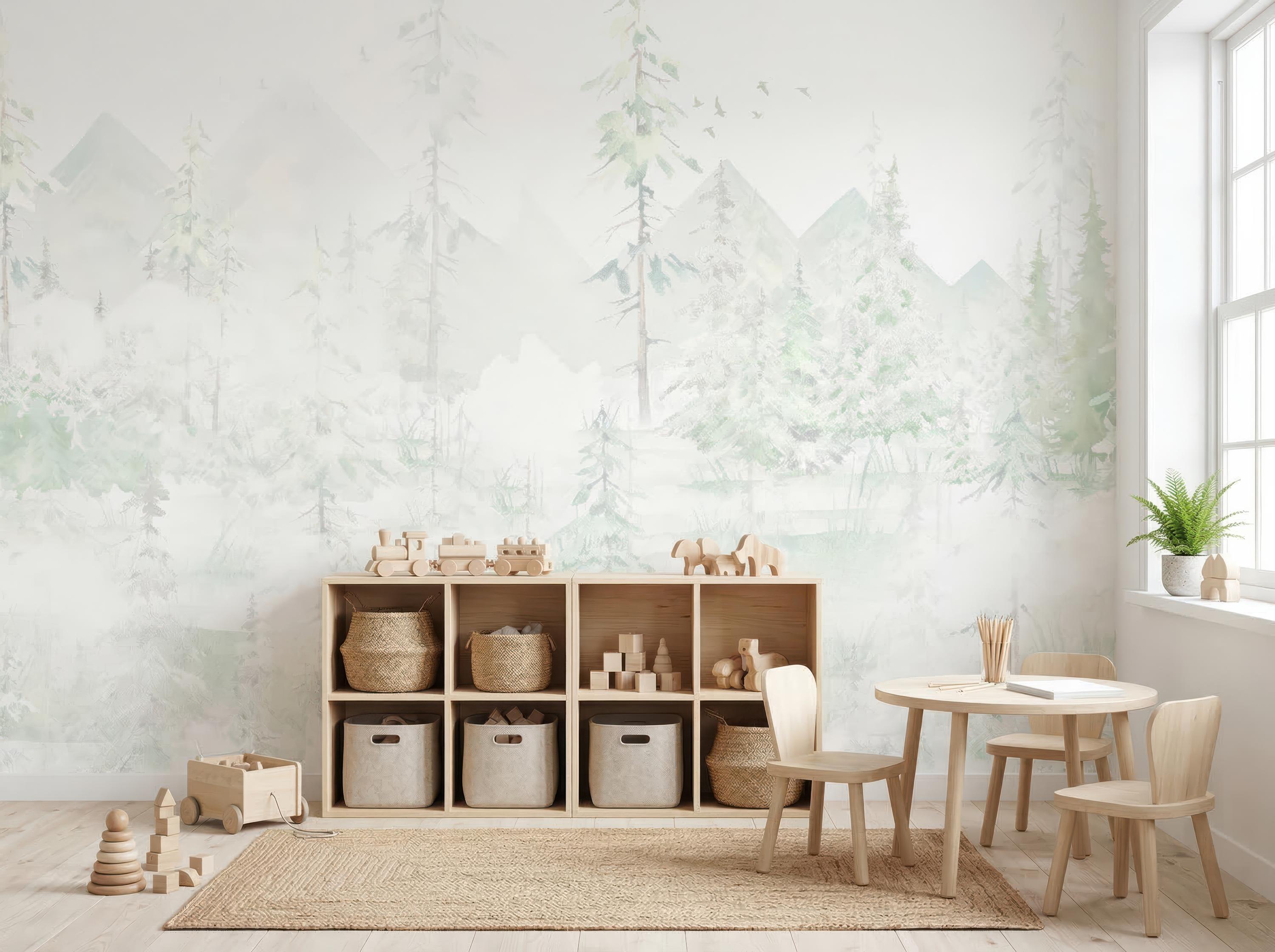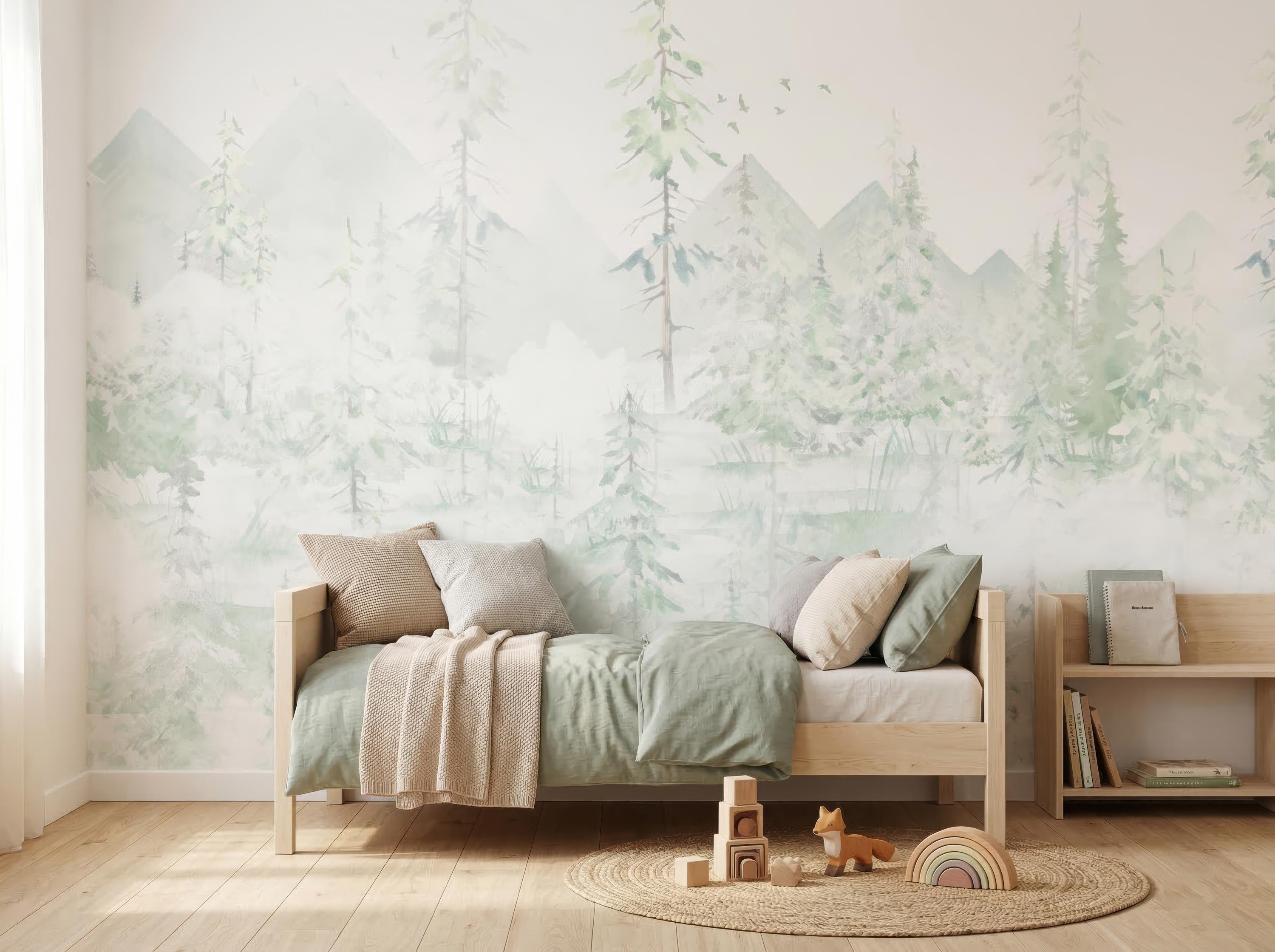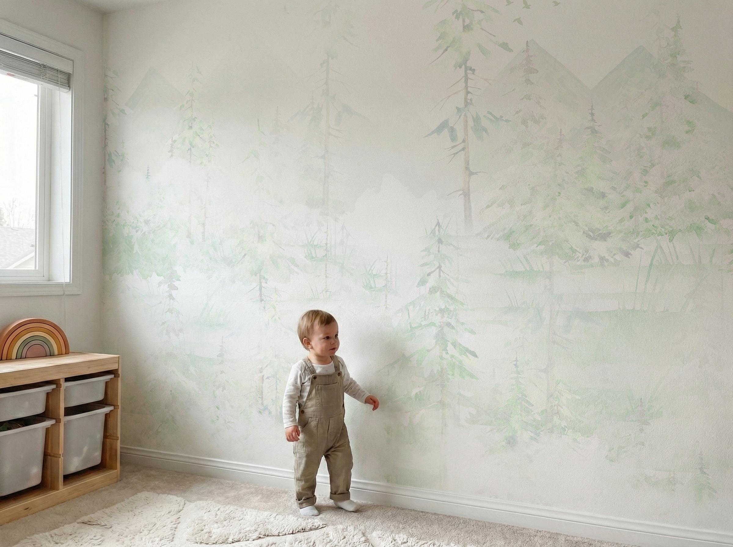 Create a peaceful and enchanting space for your little one with this soft watercolor woodland forest wall mural. Perfect for a gender-neutral nursery, toddler bedroom, or playroom, this gentle mountain and pine tree landscape brings the calming beauty of nature indoors. The muted sage green and earthy pastel tones provide a soothing backdrop that complements modern minimalist and boho kids' decor. Our premium self adhesive fabric wall decor is incredibly easy to install. The durable, textured peel and stick material is fully removable and leaves no sticky residue behind, making it a stress-free temporary or long-term design choice. Whether you are decorating a baby room or updating a play area, this high-quality nature wallpaper offers a seamless, beautiful finish that grows with your child.