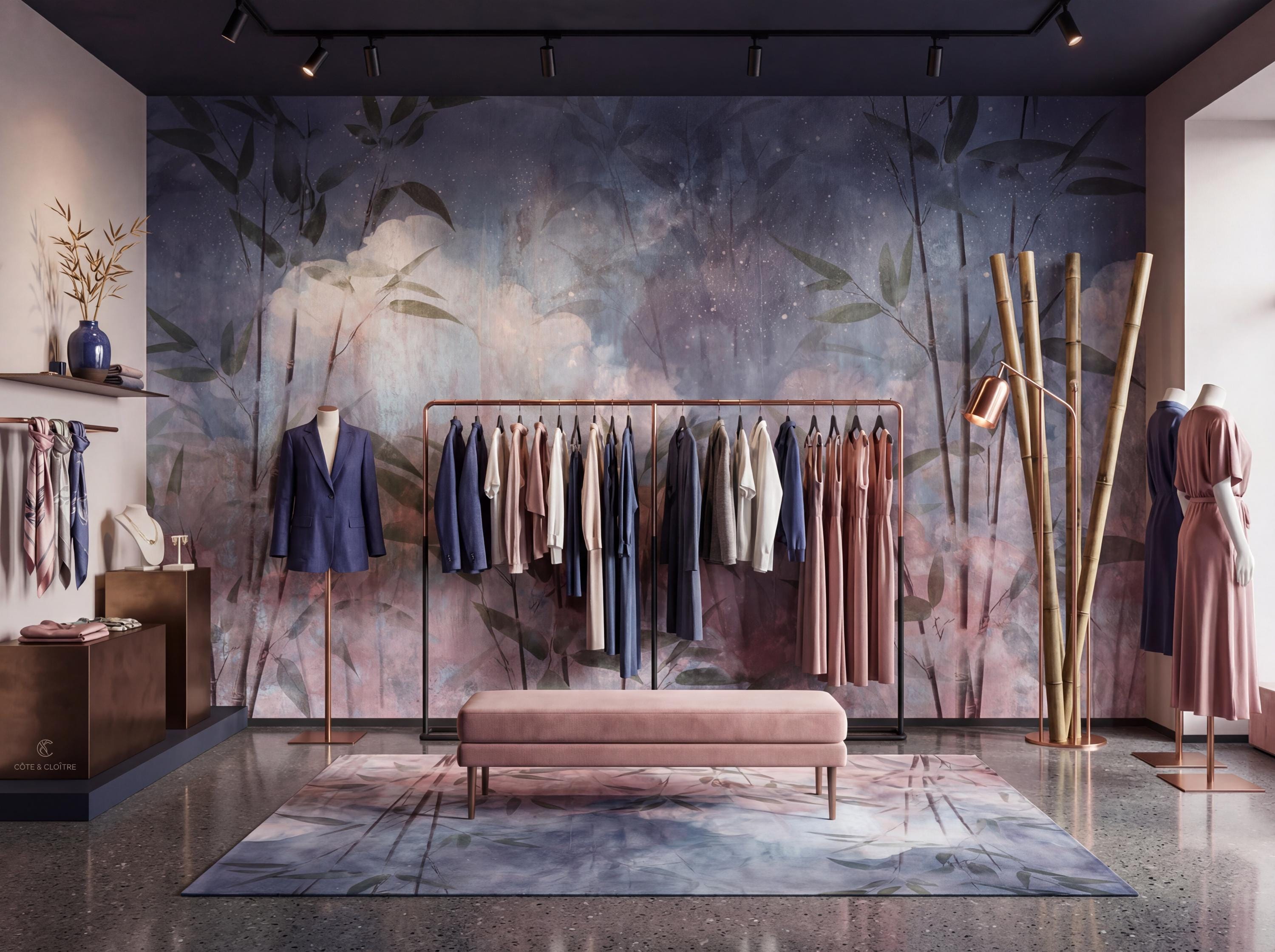 Transform your space with this dreamy botanical wall mural wallpaper featuring soft pastel skies, delicate clouds, and elegant floral elements. Perfect for boutique interiors, retail spaces, or stylish homes, this artistic wall design creates a luxurious and calming atmosphere while enhancing modern décor aesthetics.