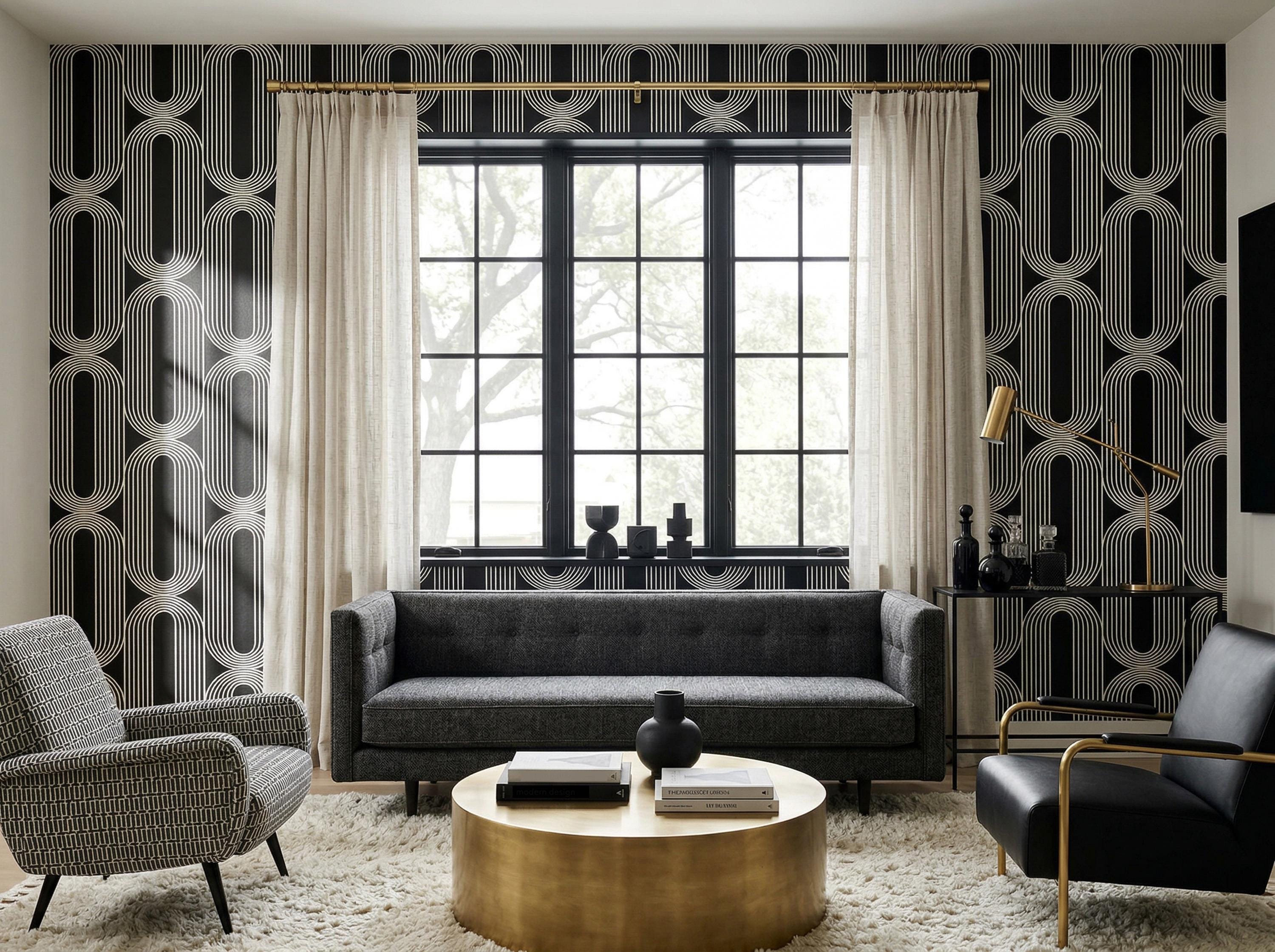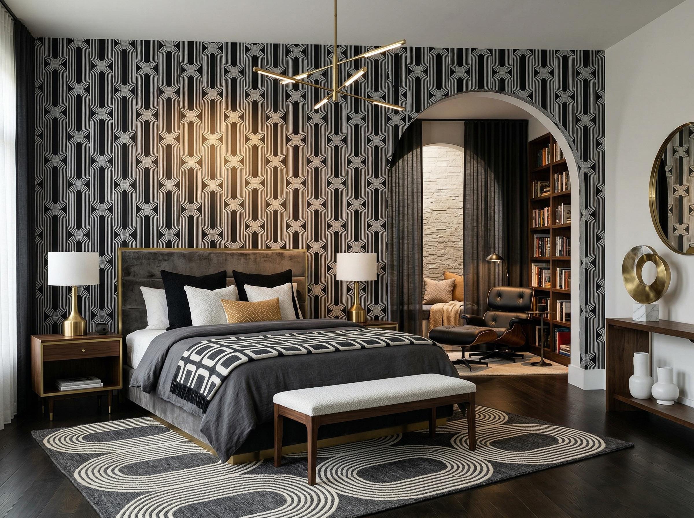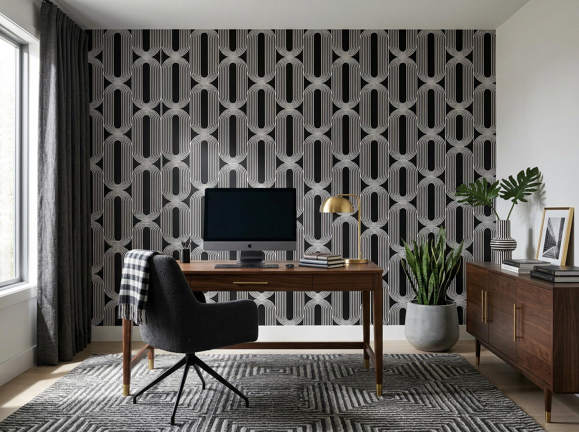 Black and White Geometric Wallpaper - Retro Art Deco Modern Abstract Decor ( Peel Stick & Traditional )