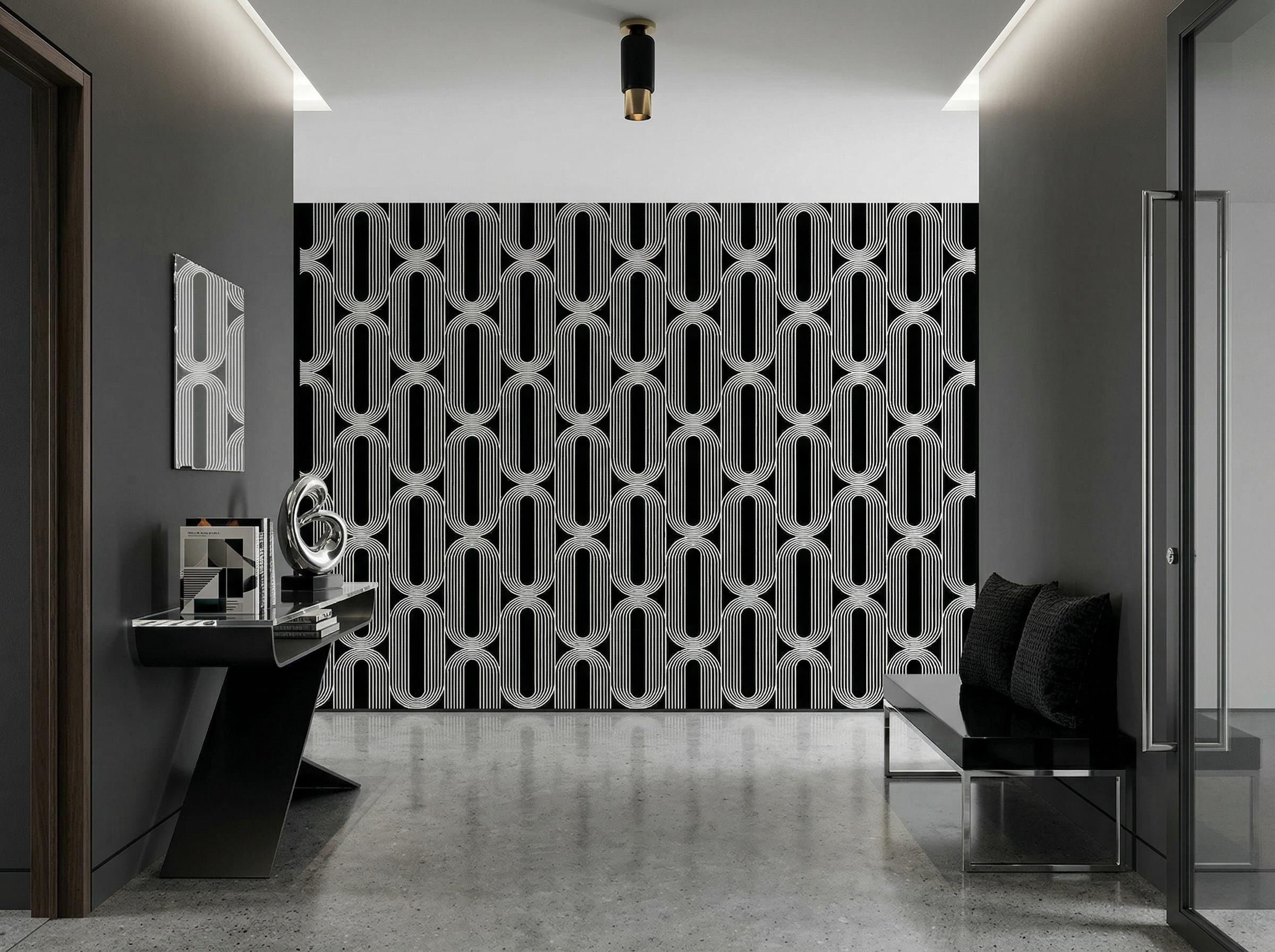 Make a bold statement with this black and white geometric wallpaper, featuring a striking retro-inspired art deco pattern with flowing linear shapes. Perfect for modern interiors, this high-contrast design adds depth, sophistication, and a dramatic focal point to any room.