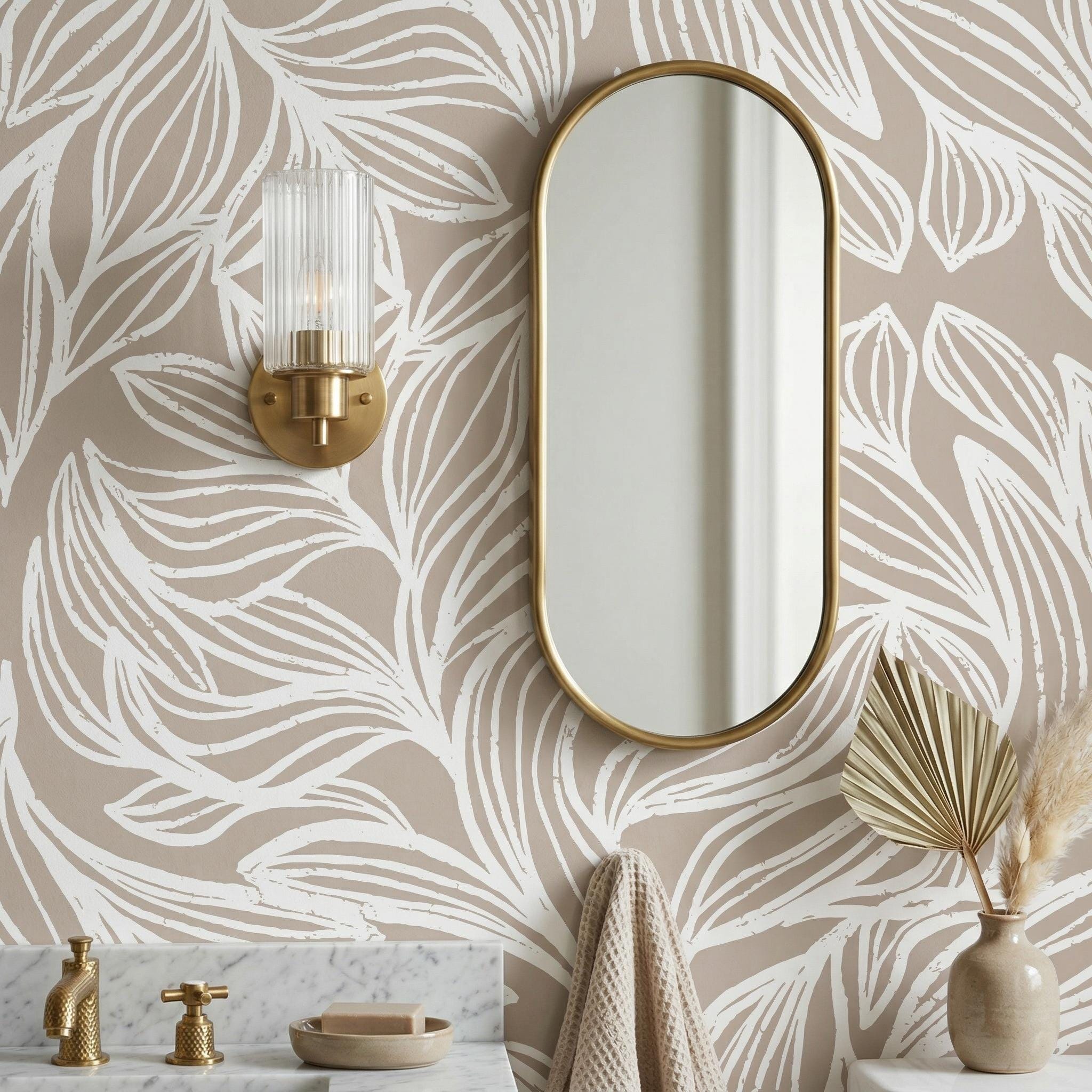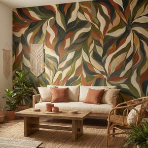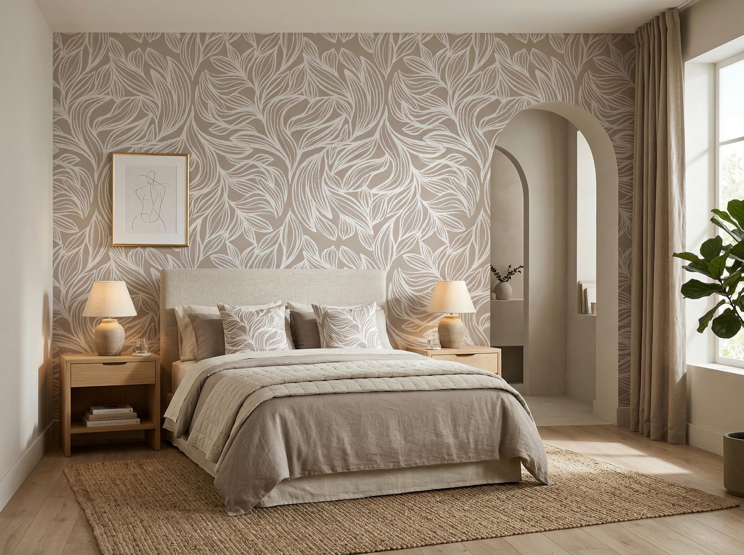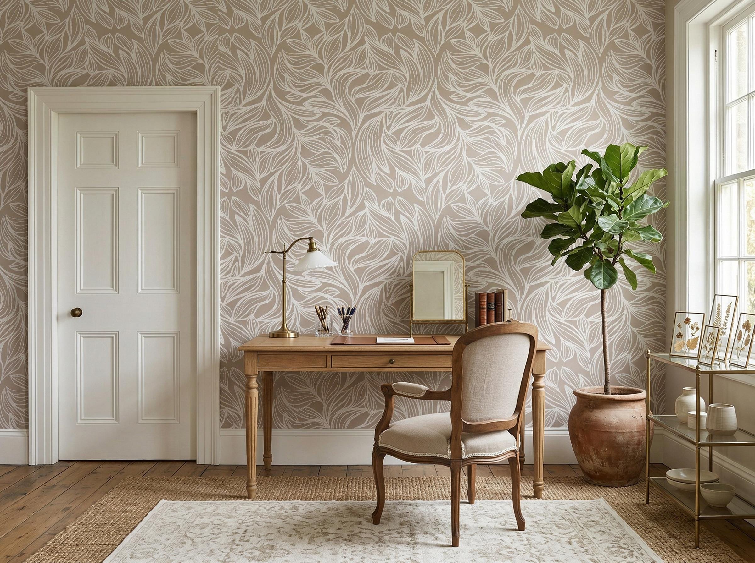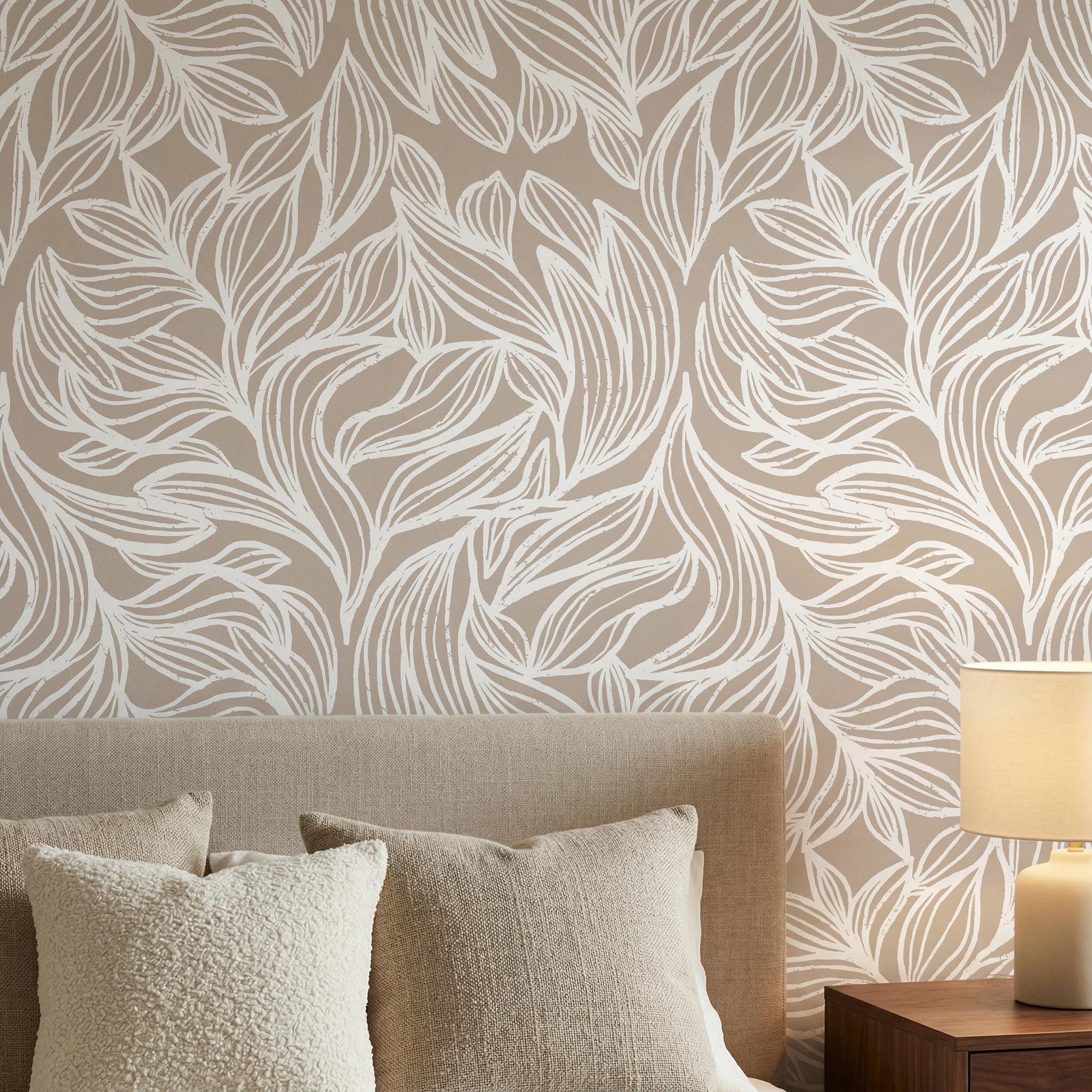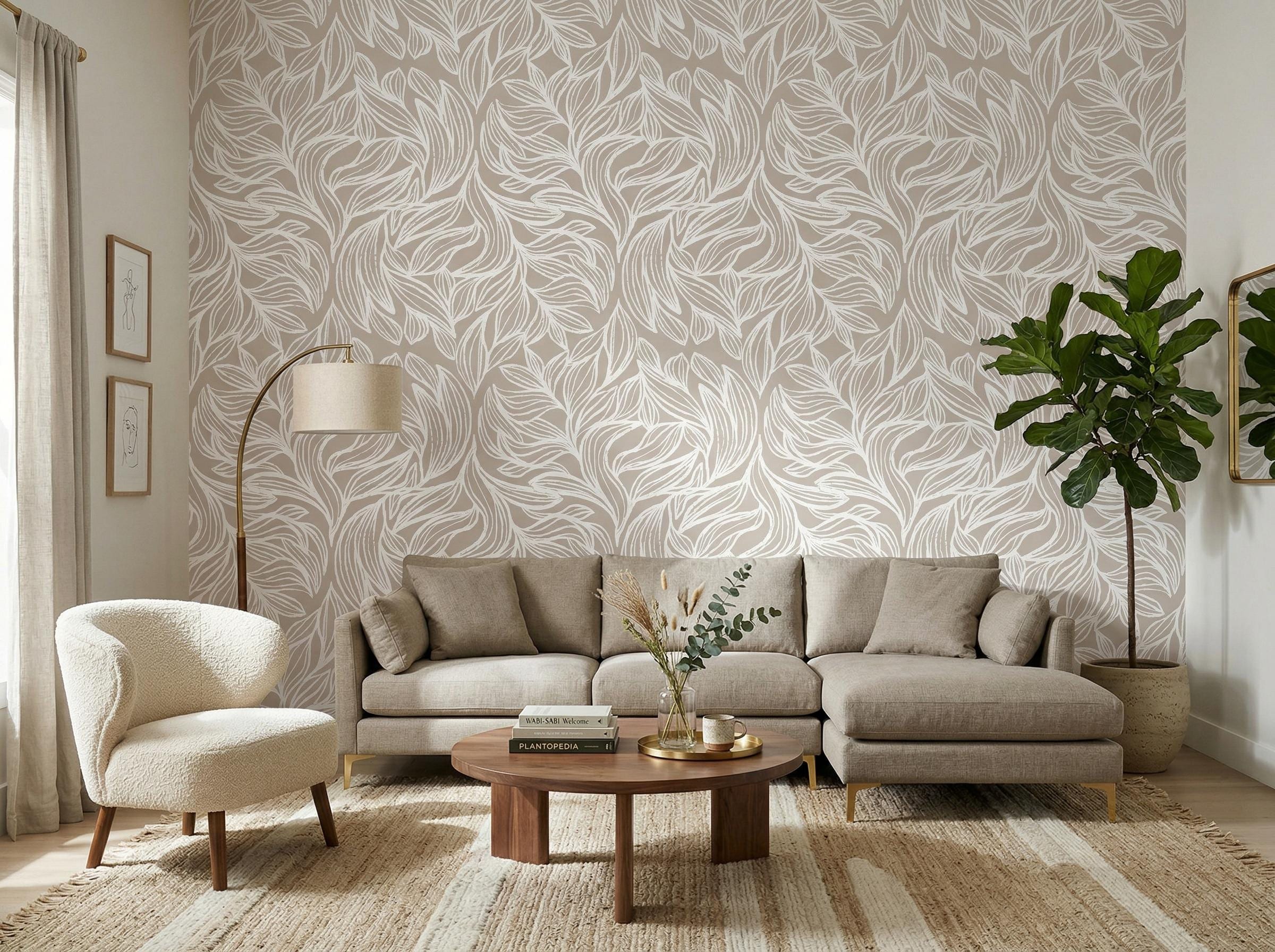 Transform your space with this elegant neutral botanical wallpaper featuring flowing leaf patterns in soft beige tones. Perfect for creating a calm, organic atmosphere, this design blends modern minimalism with natural inspiration, making it ideal for any stylish interior.